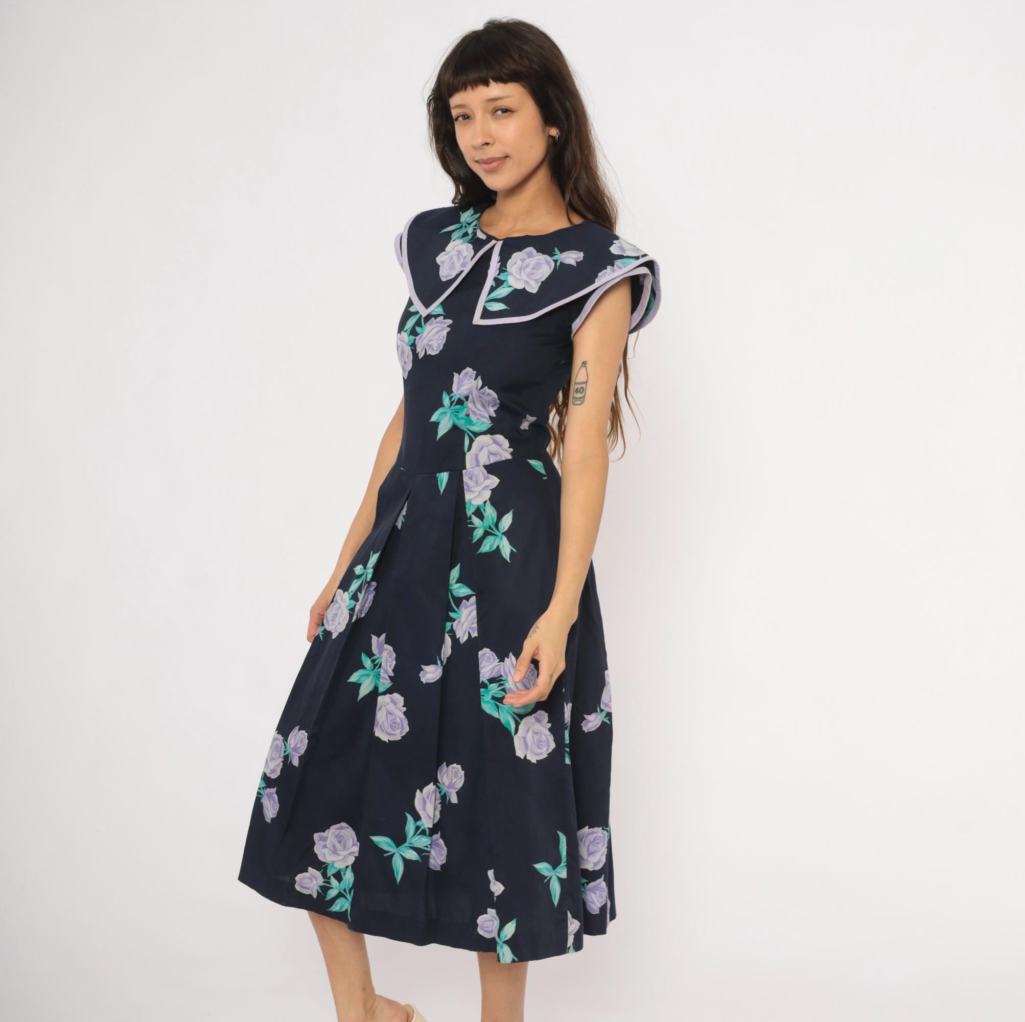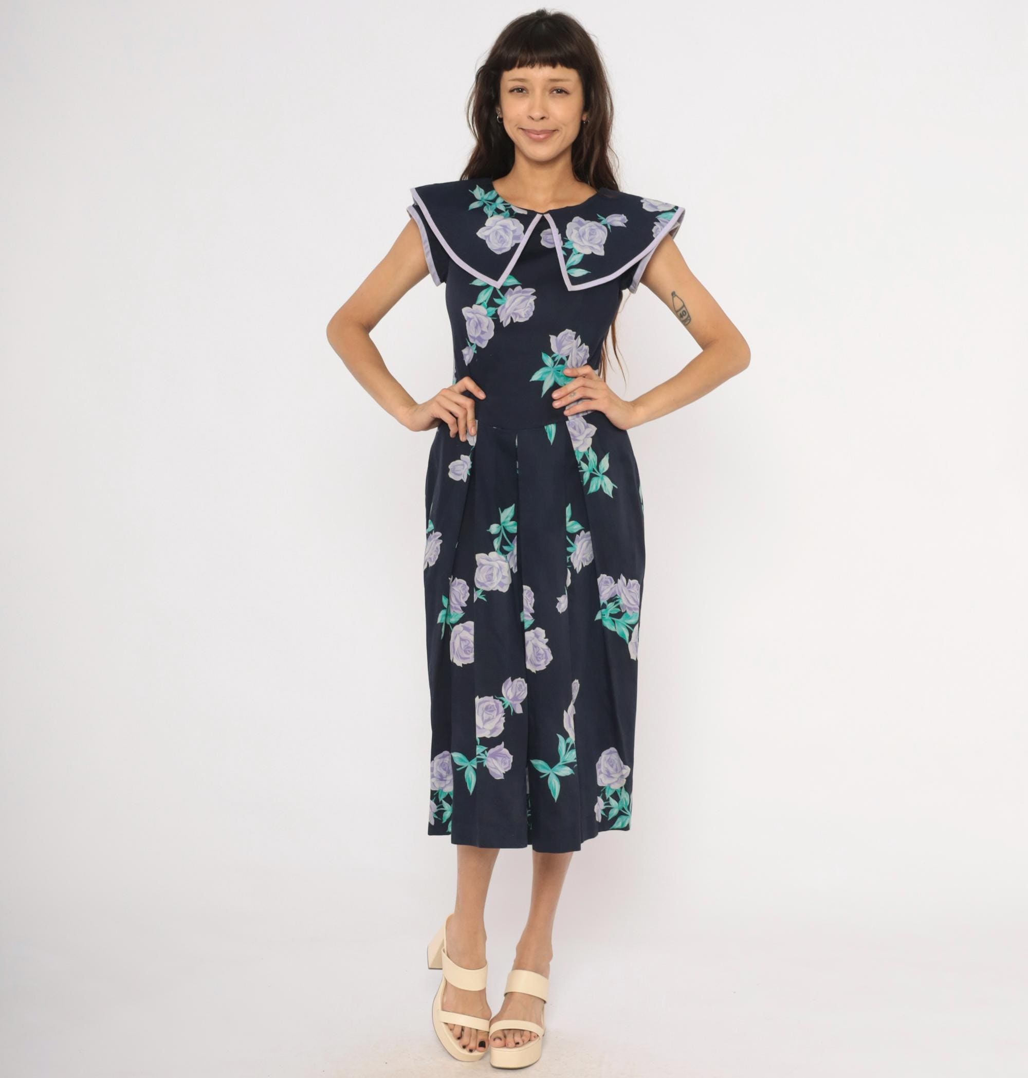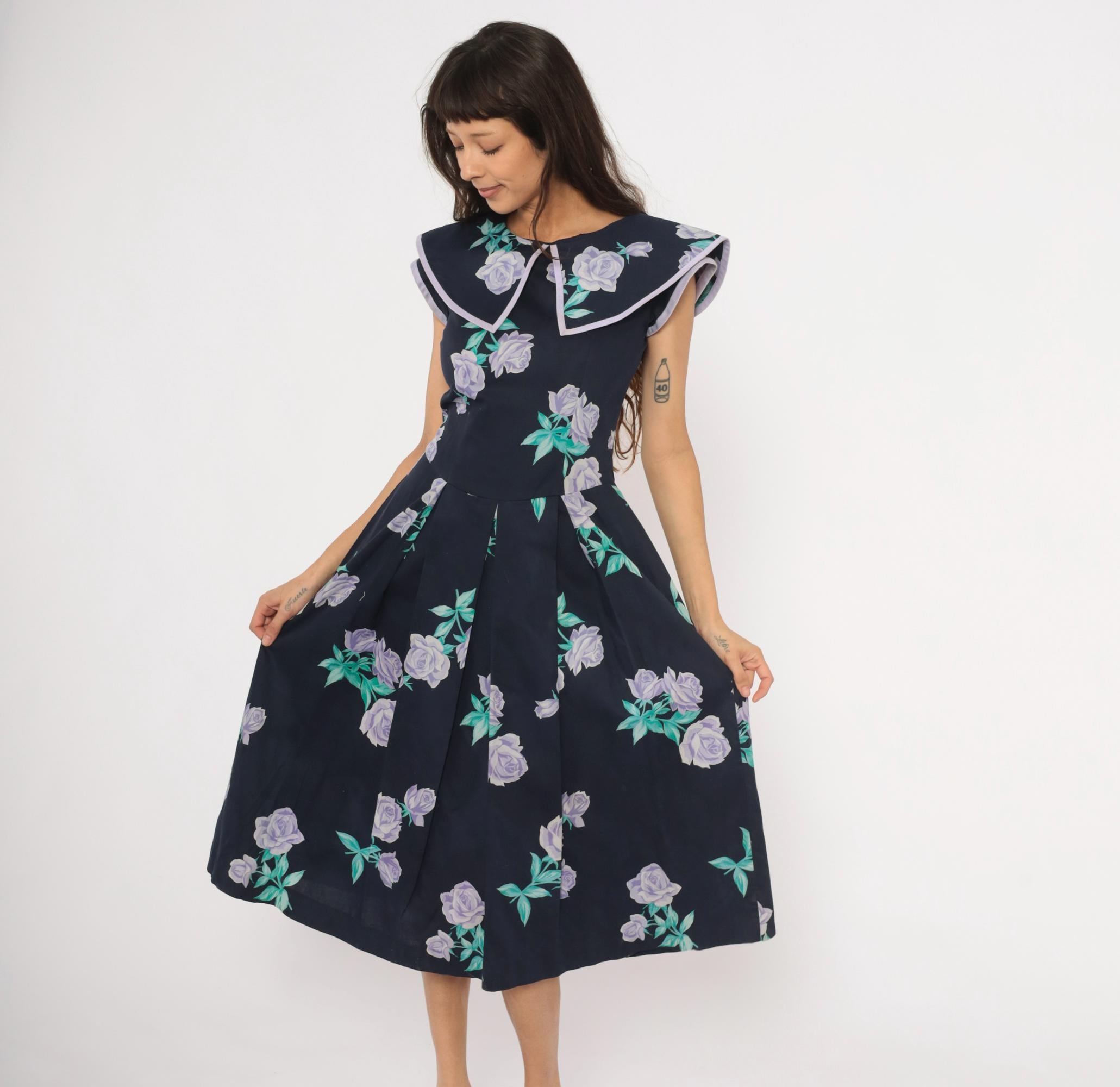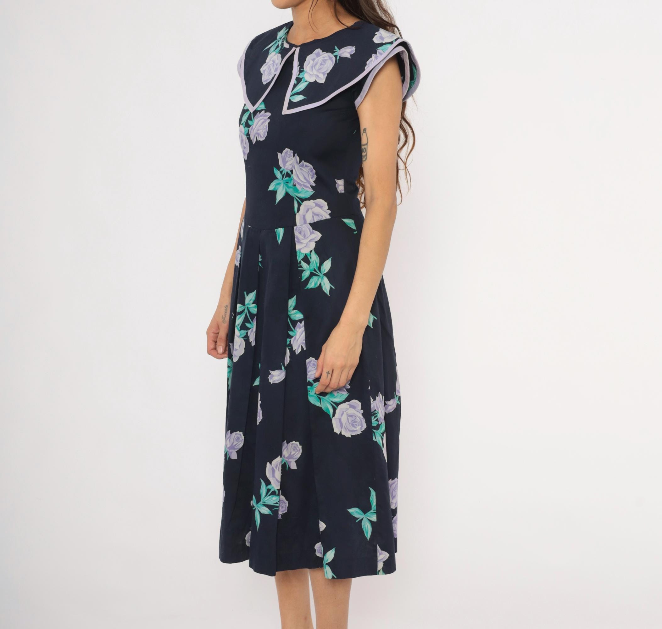 80s navy cotton dress from Kathryn Conover with lavender and purple rose print scattered across the fabric, accented by teal-green leaves. Wide sailor-style collar with pointed front and lilac piping trim extends over the shoulders. Fitted bodice with a natural waist seam, pleated A-line skirt falling to mid-calf, and back zipper closure. Sleeveless cut with cap-like coverage from the oversized collar.