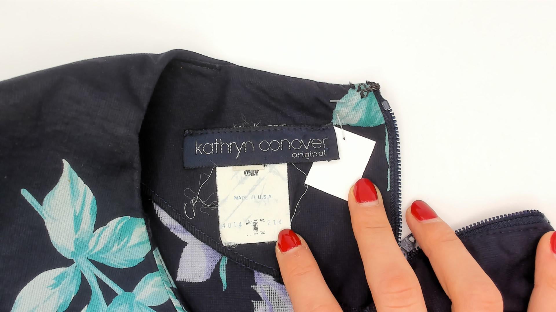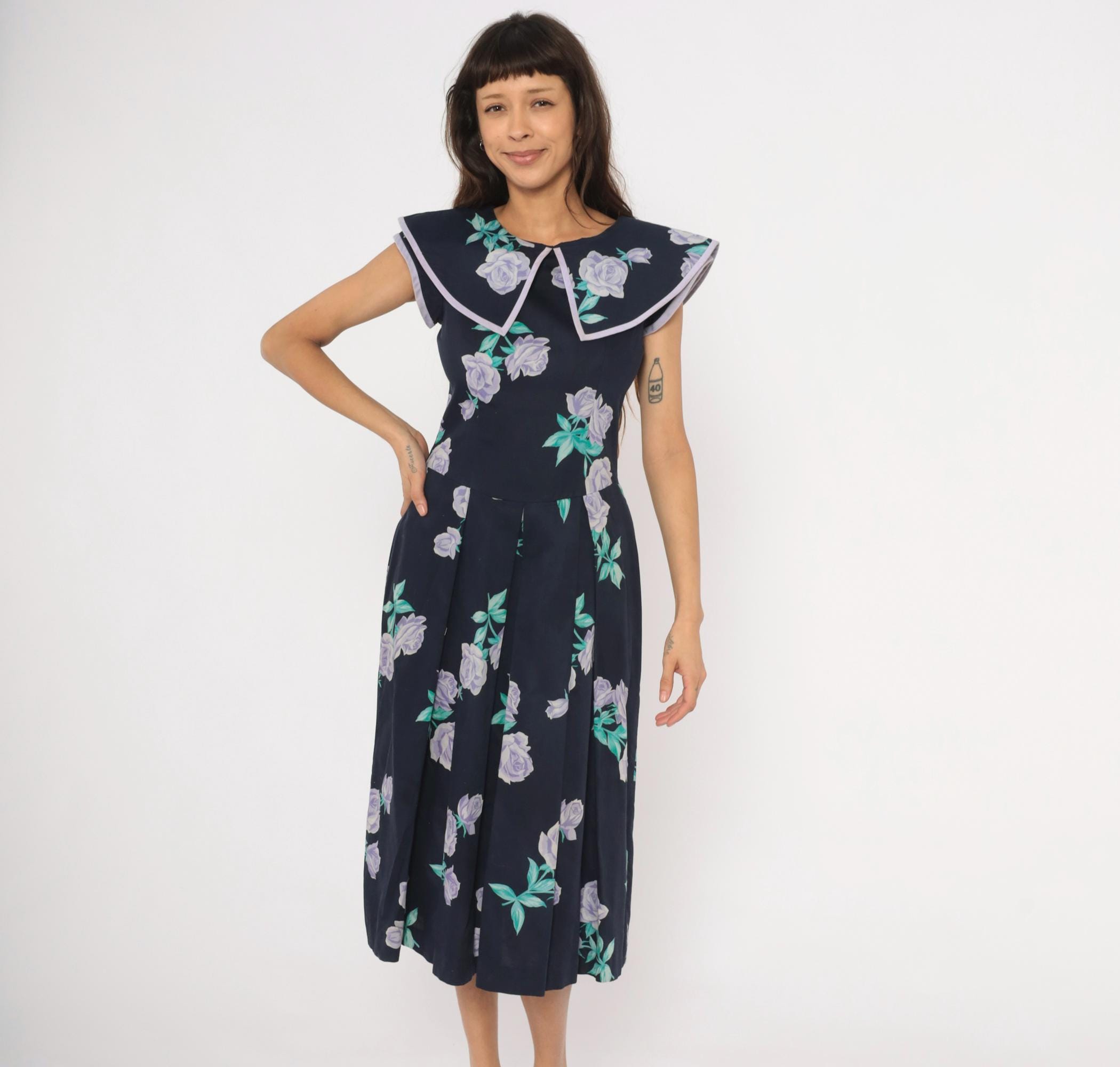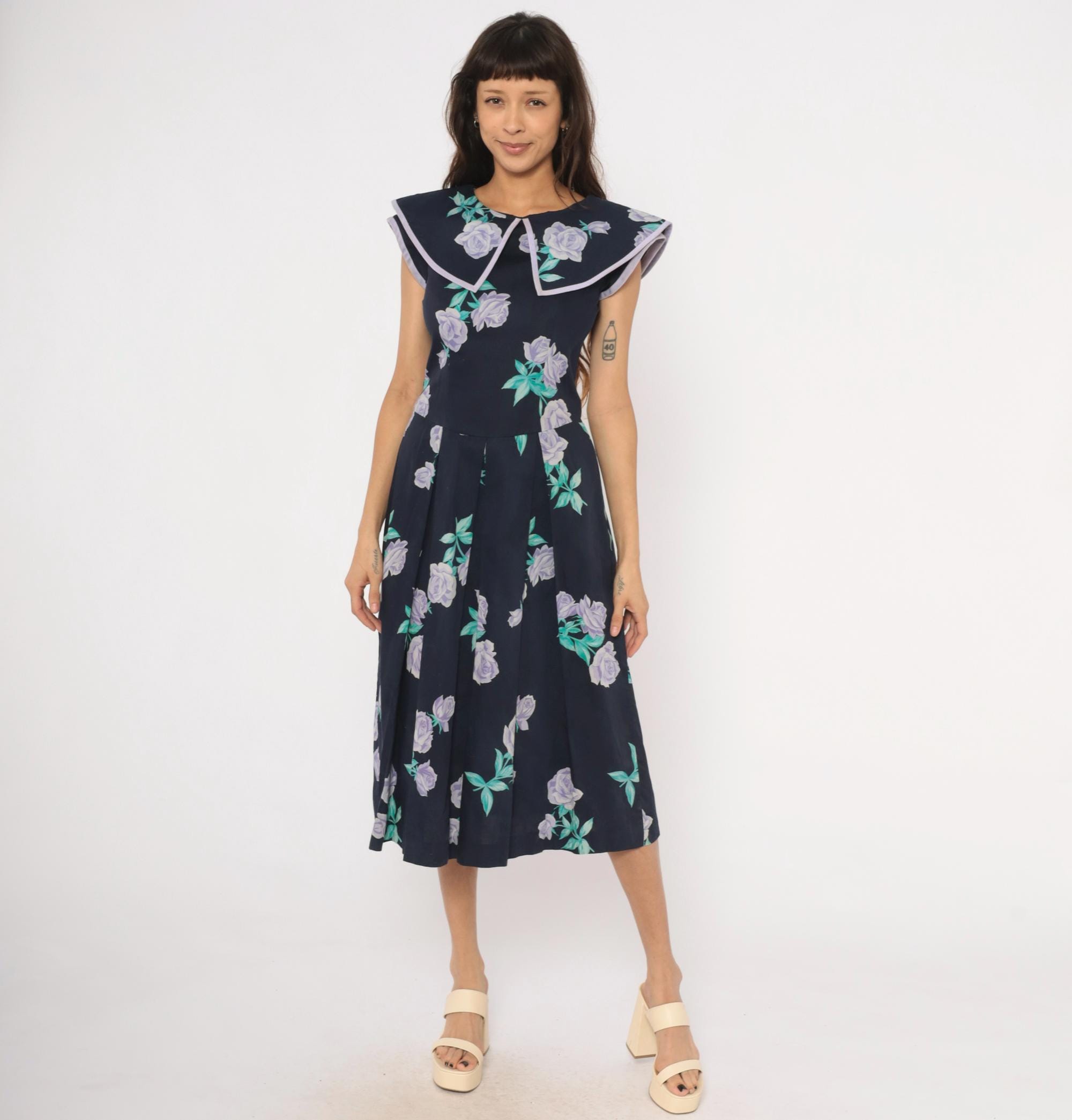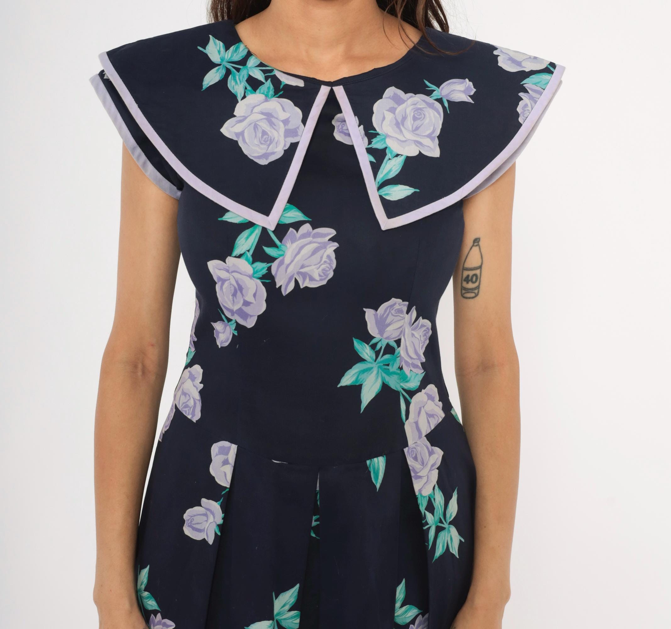 80s navy cotton dress from Kathryn Conover with lavender and purple rose print scattered across the fabric, accented by teal-green leaves. Wide sailor-style collar with pointed front and lilac piping trim extends over the shoulders. Fitted bodice with a natural waist seam, pleated A-line skirt falling to mid-calf, and back zipper closure. Sleeveless cut with cap-like coverage from the oversized collar.