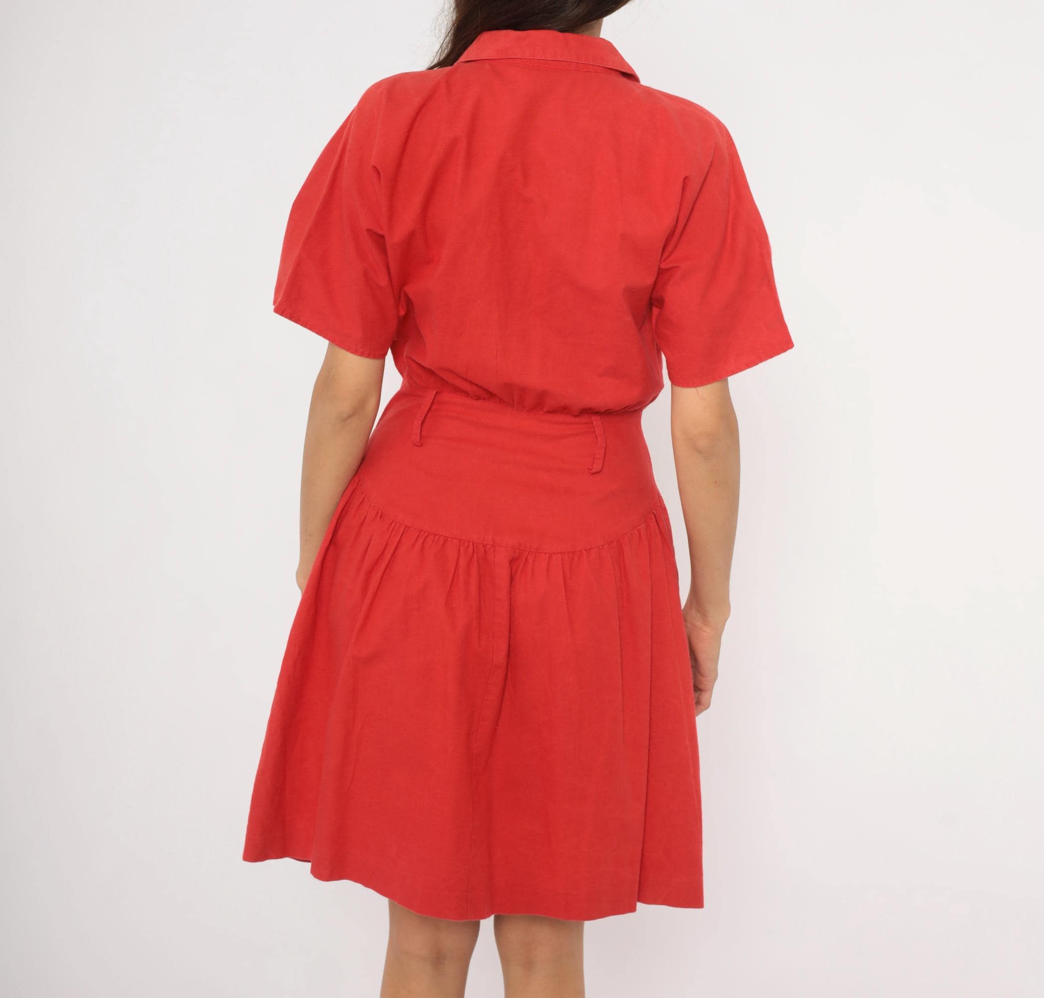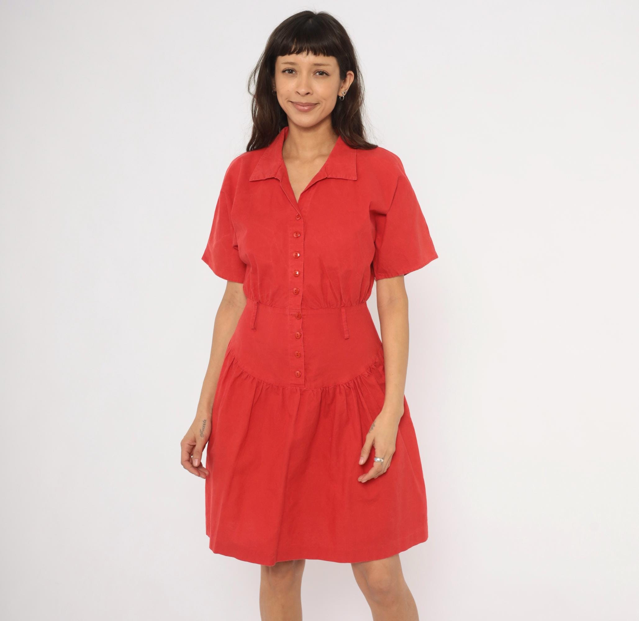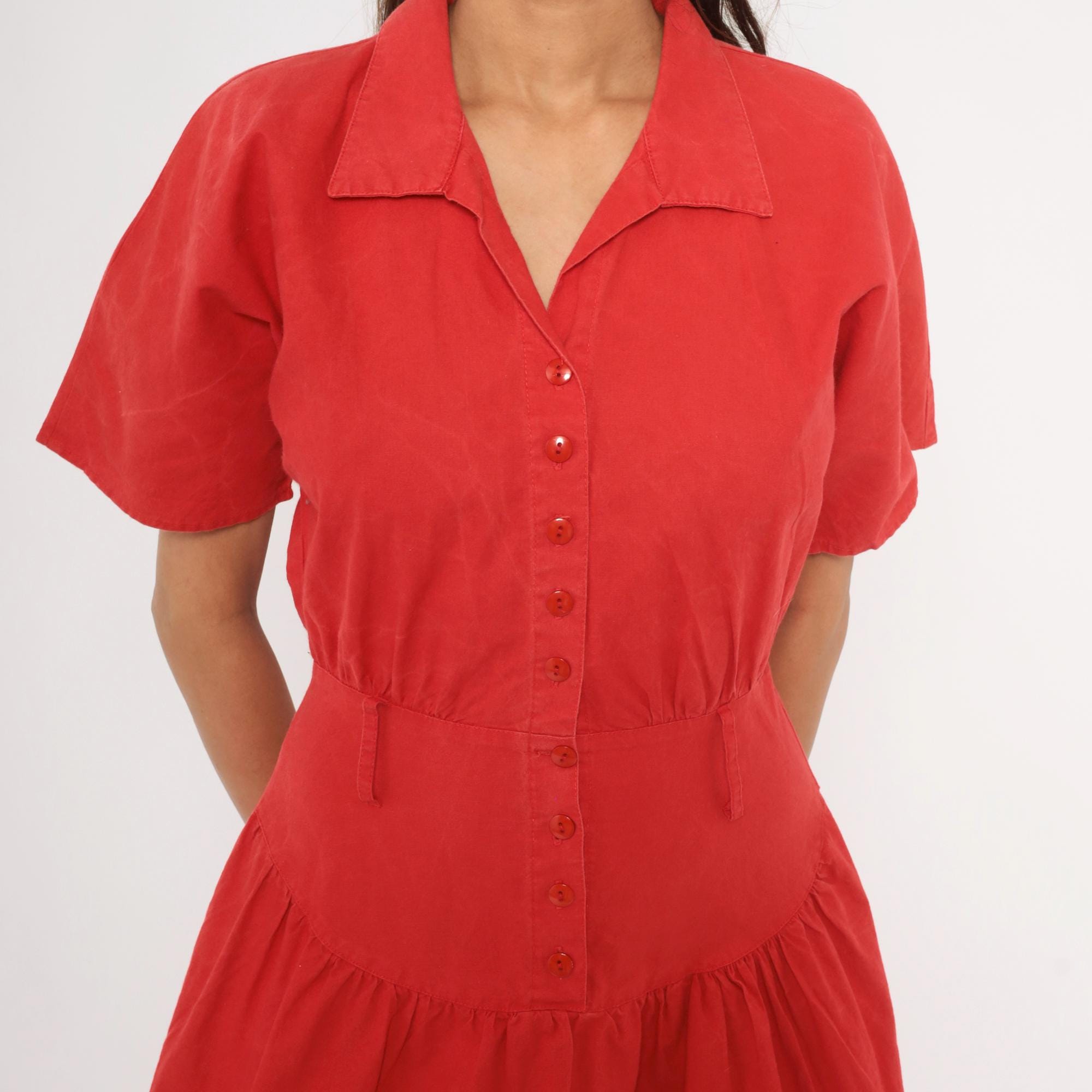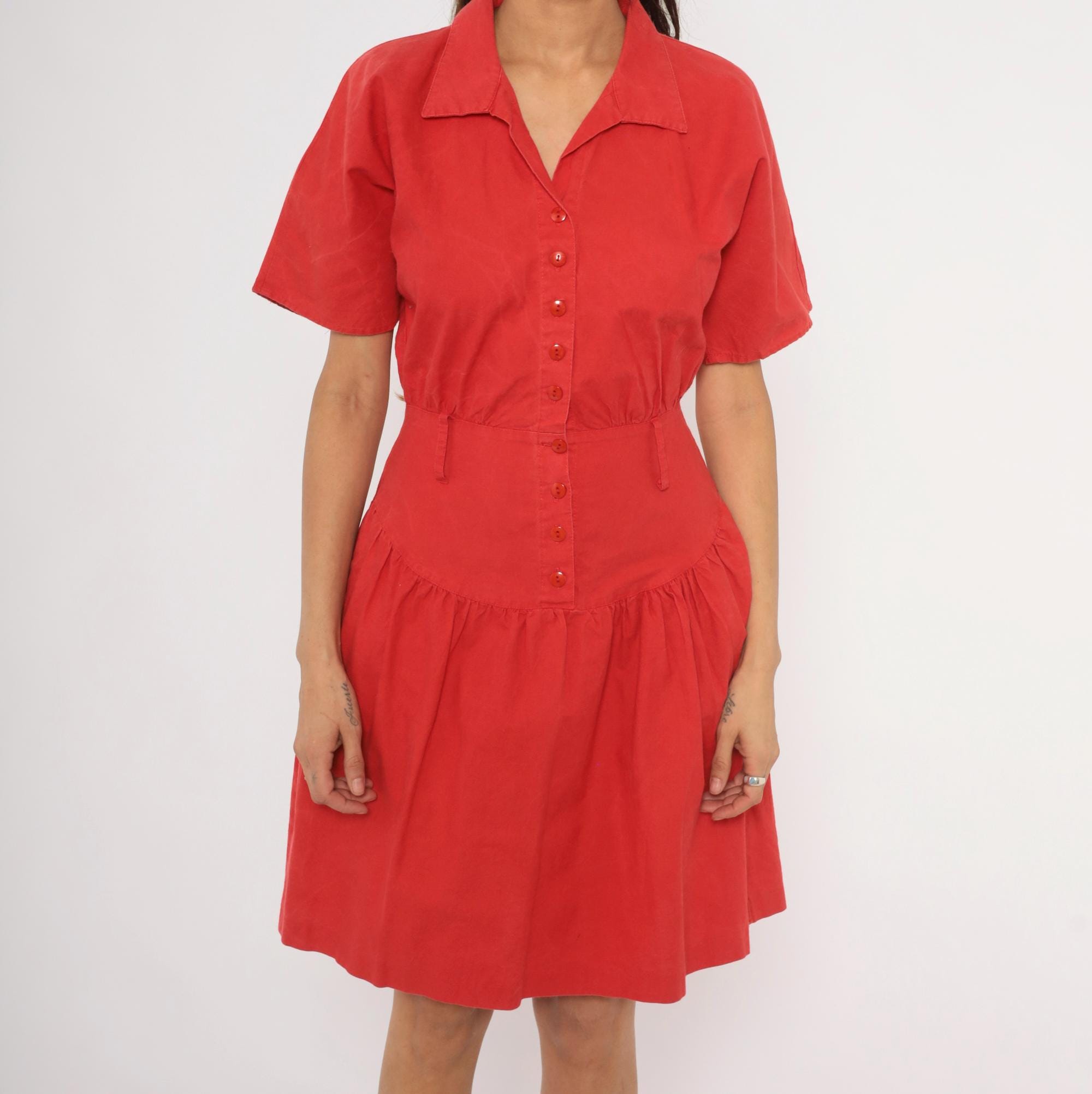 Red cotton shirtdress from the 1990s by Wild Dress with a notched collar, V neckline, and full button front closure. Short cuffed sleeves, a fitted bodice with belt loops at the waist, and a drop-waist seam with a gathered full skirt. Knee-length hem with a cherry red, slightly washed tone throughout.