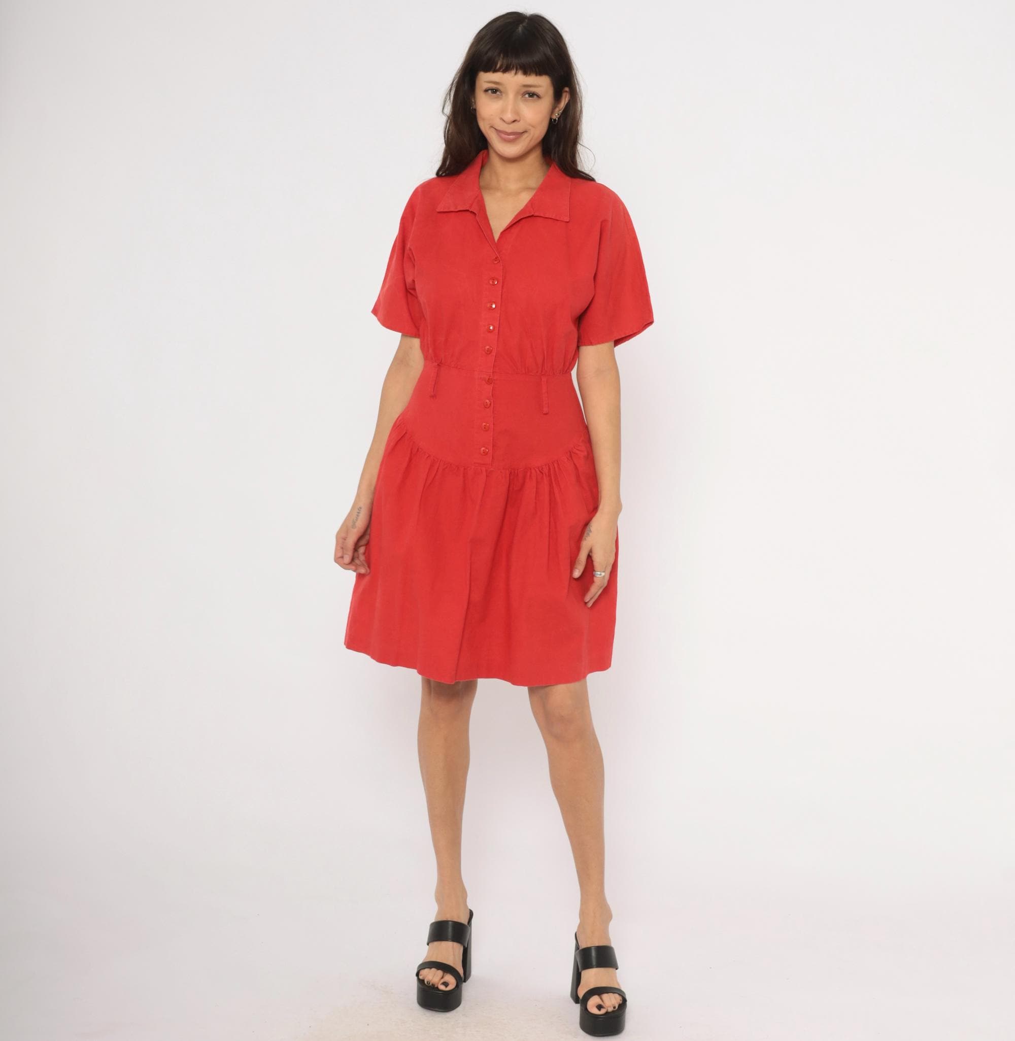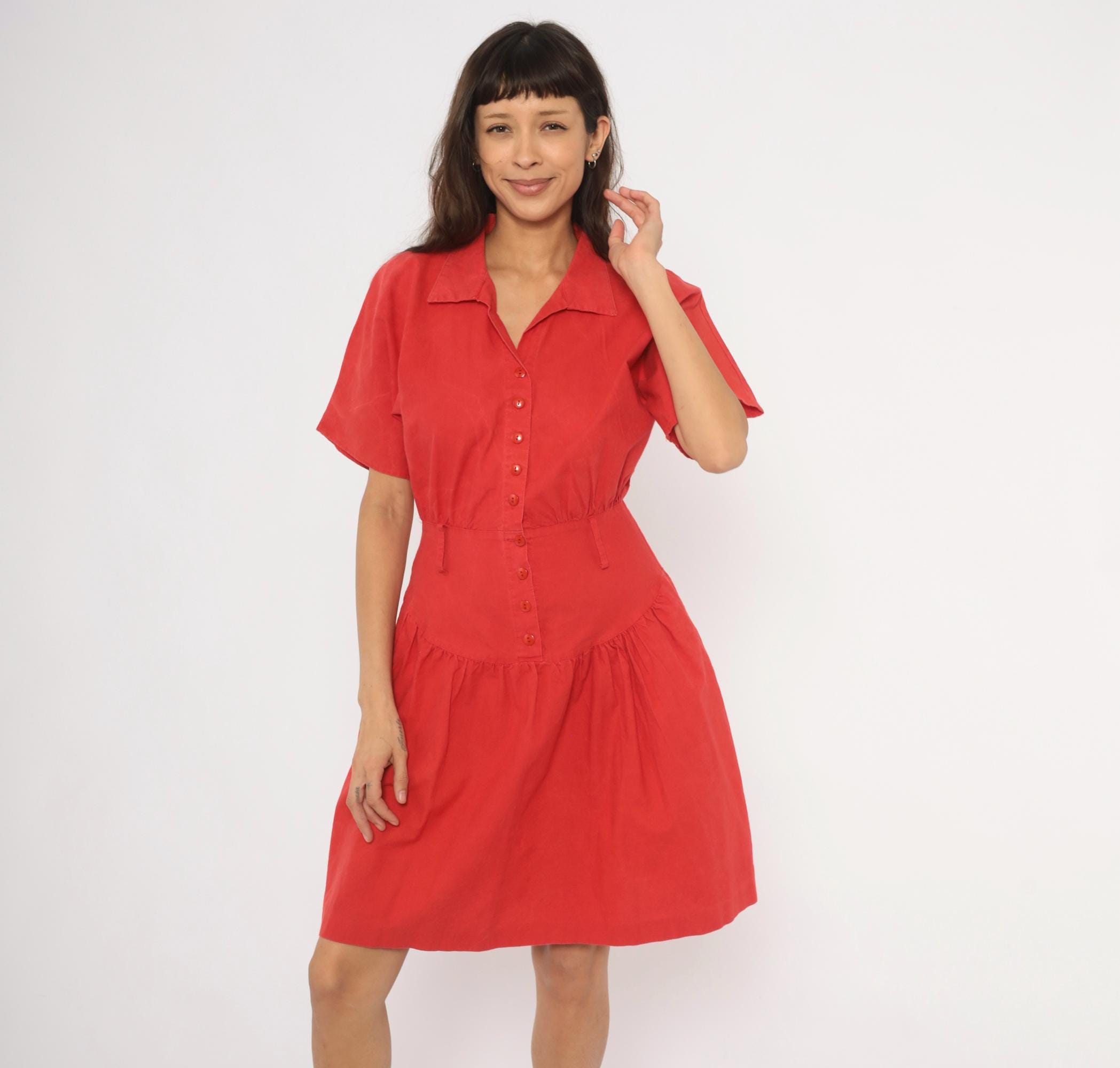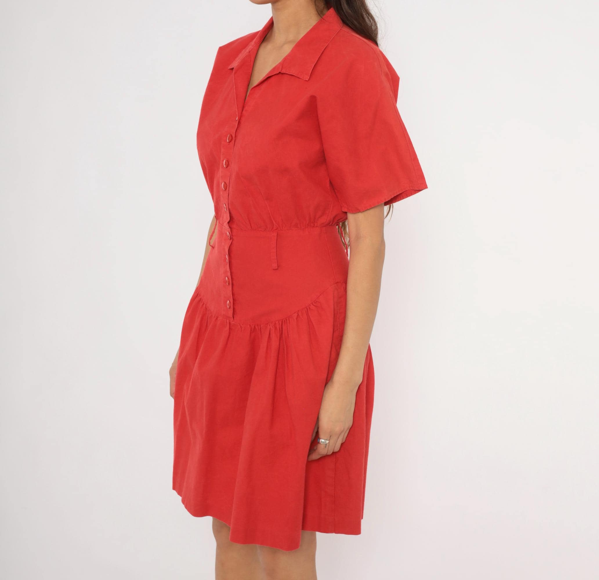 Red cotton shirtdress from the 1990s by Wild Dress with a notched collar, V neckline, and full button front closure. Short cuffed sleeves, a fitted bodice with belt loops at the waist, and a drop-waist seam with a gathered full skirt. Knee-length hem with a cherry red, slightly washed tone throughout.