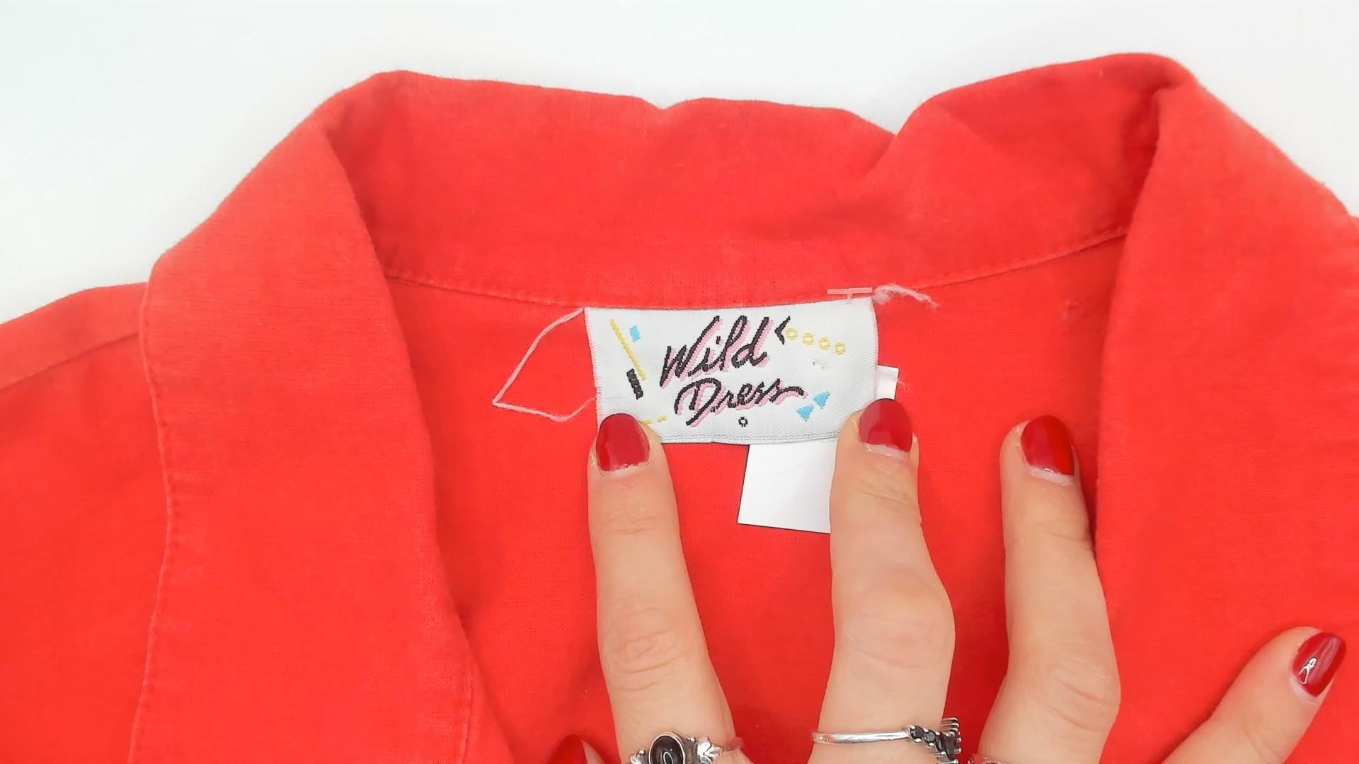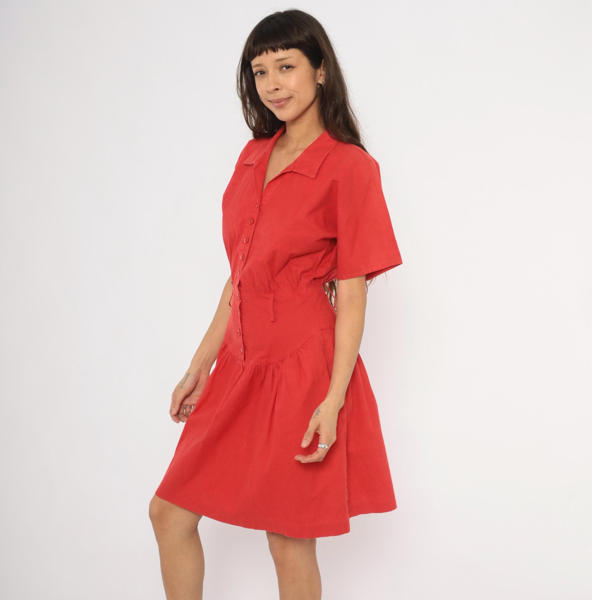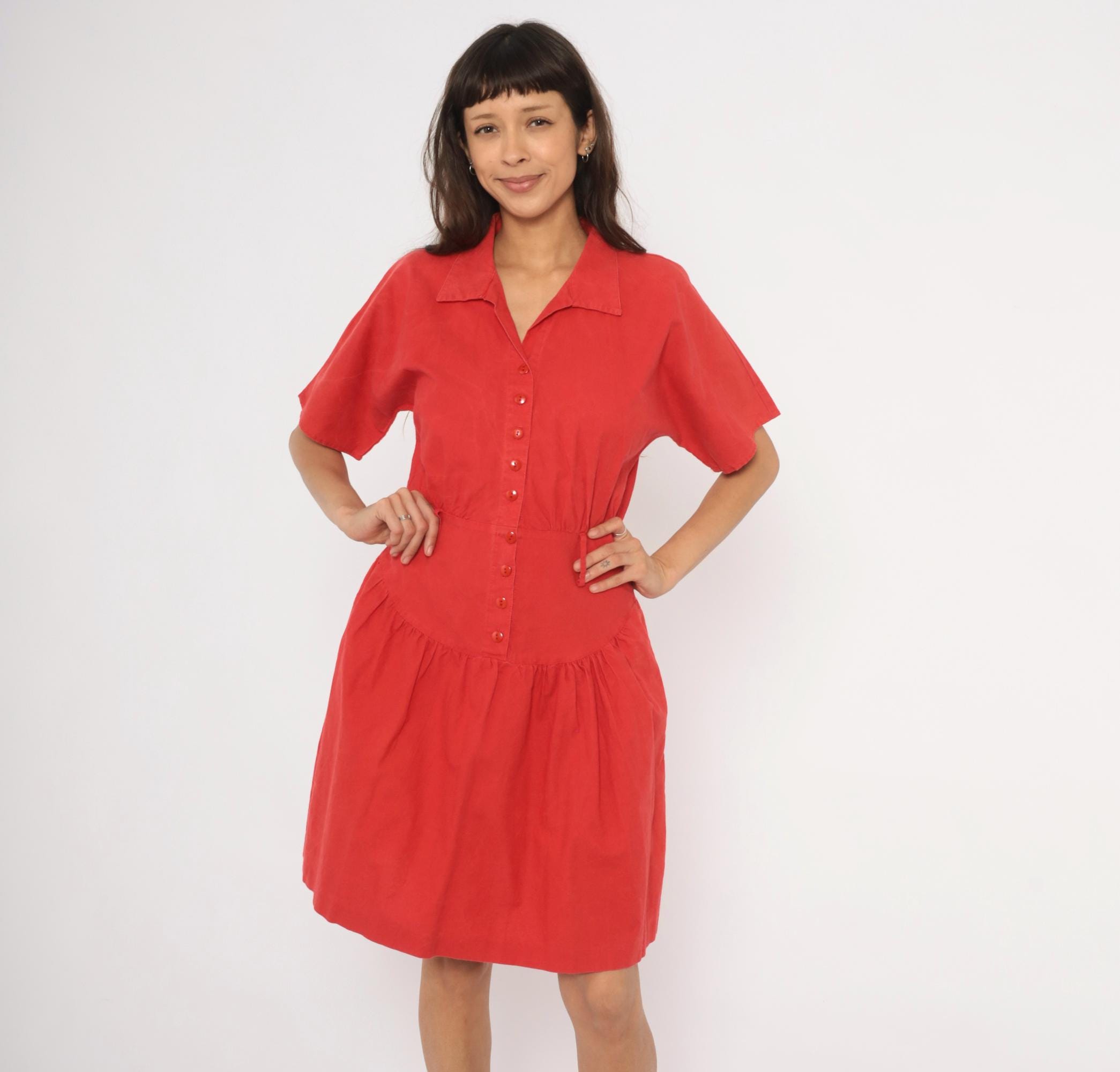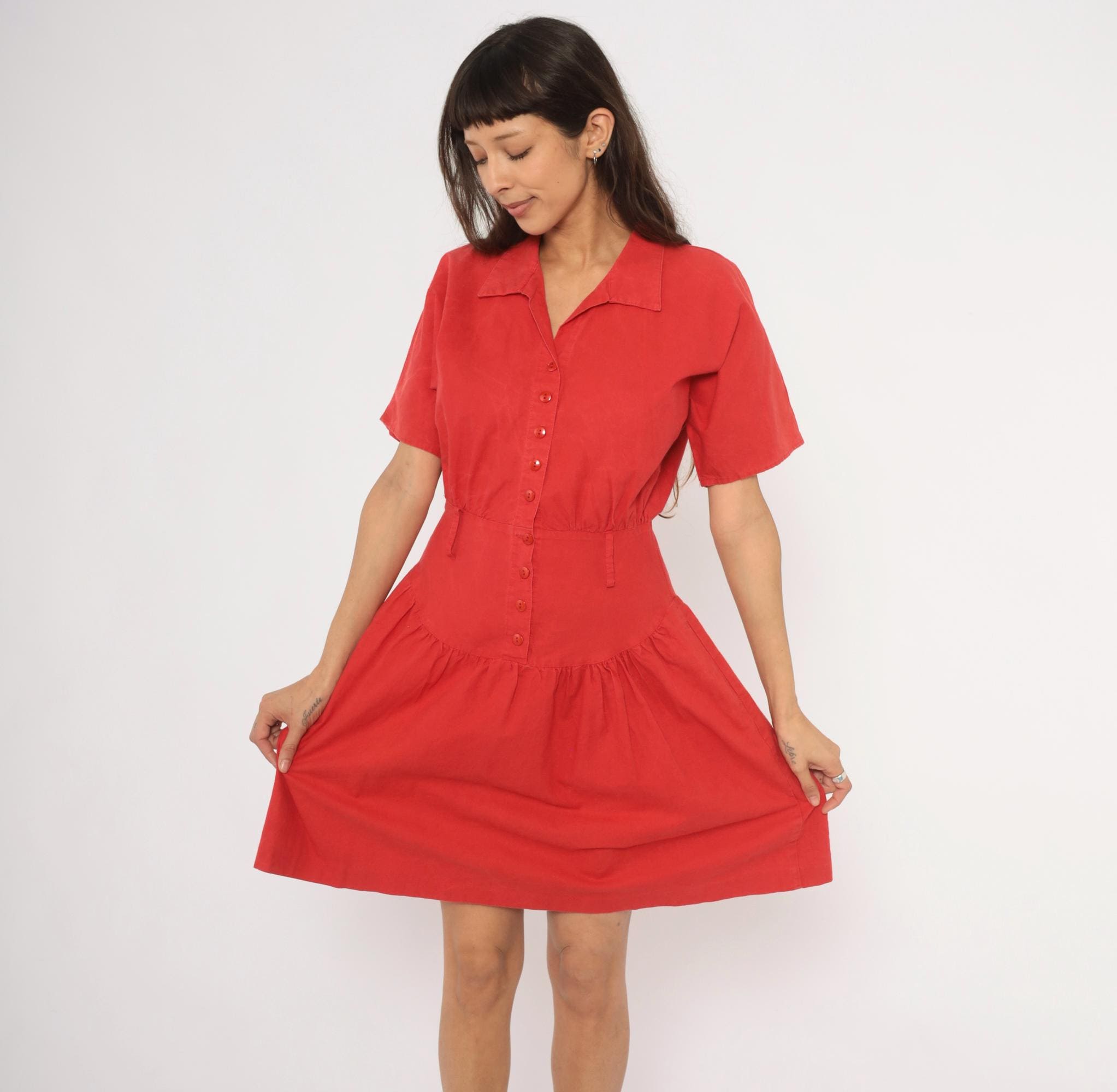 Red cotton shirtdress from the 1990s by Wild Dress with a notched collar, V neckline, and full button front closure. Short cuffed sleeves, a fitted bodice with belt loops at the waist, and a drop-waist seam with a gathered full skirt. Knee-length hem with a cherry red, slightly washed tone throughout.
