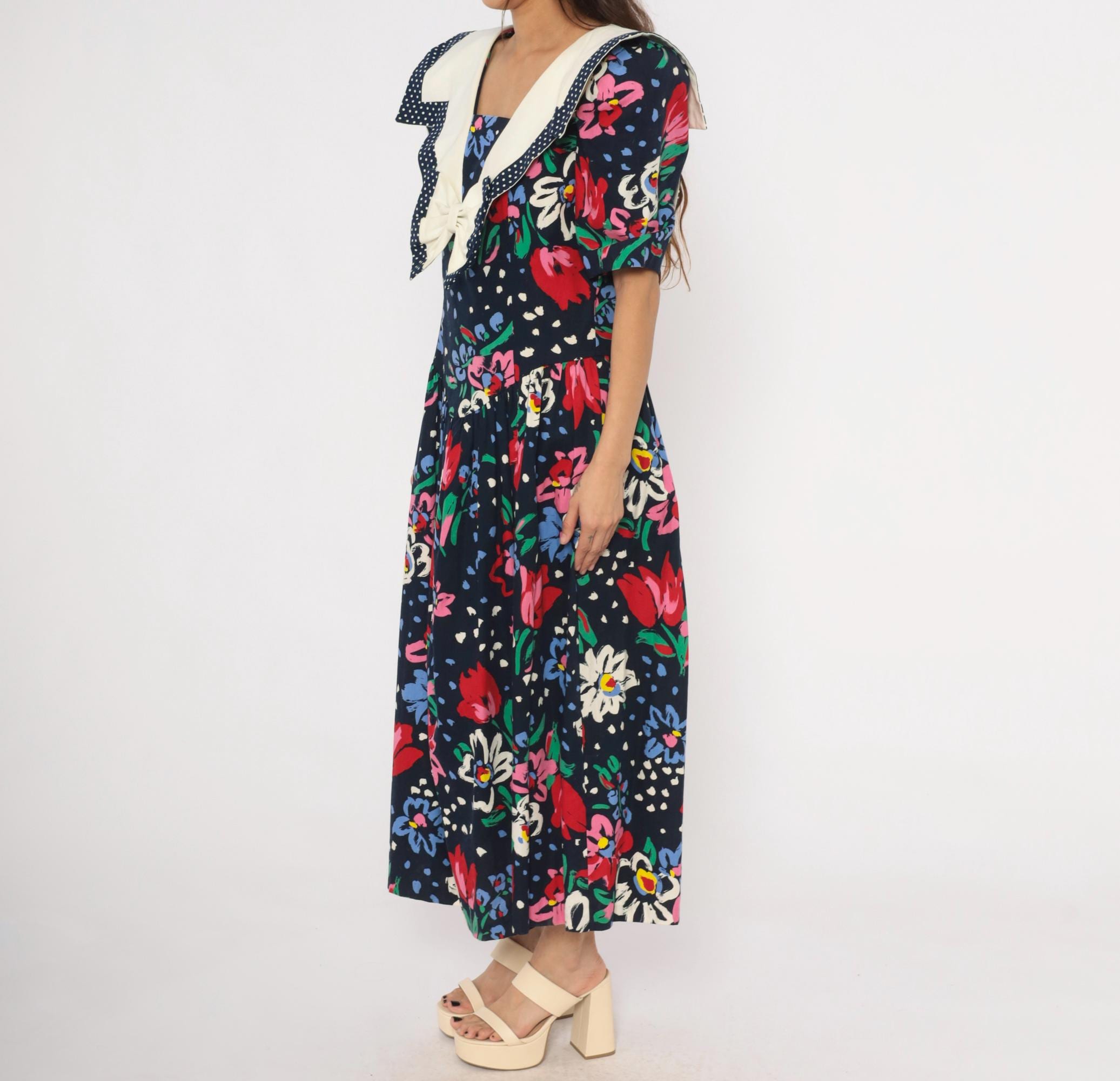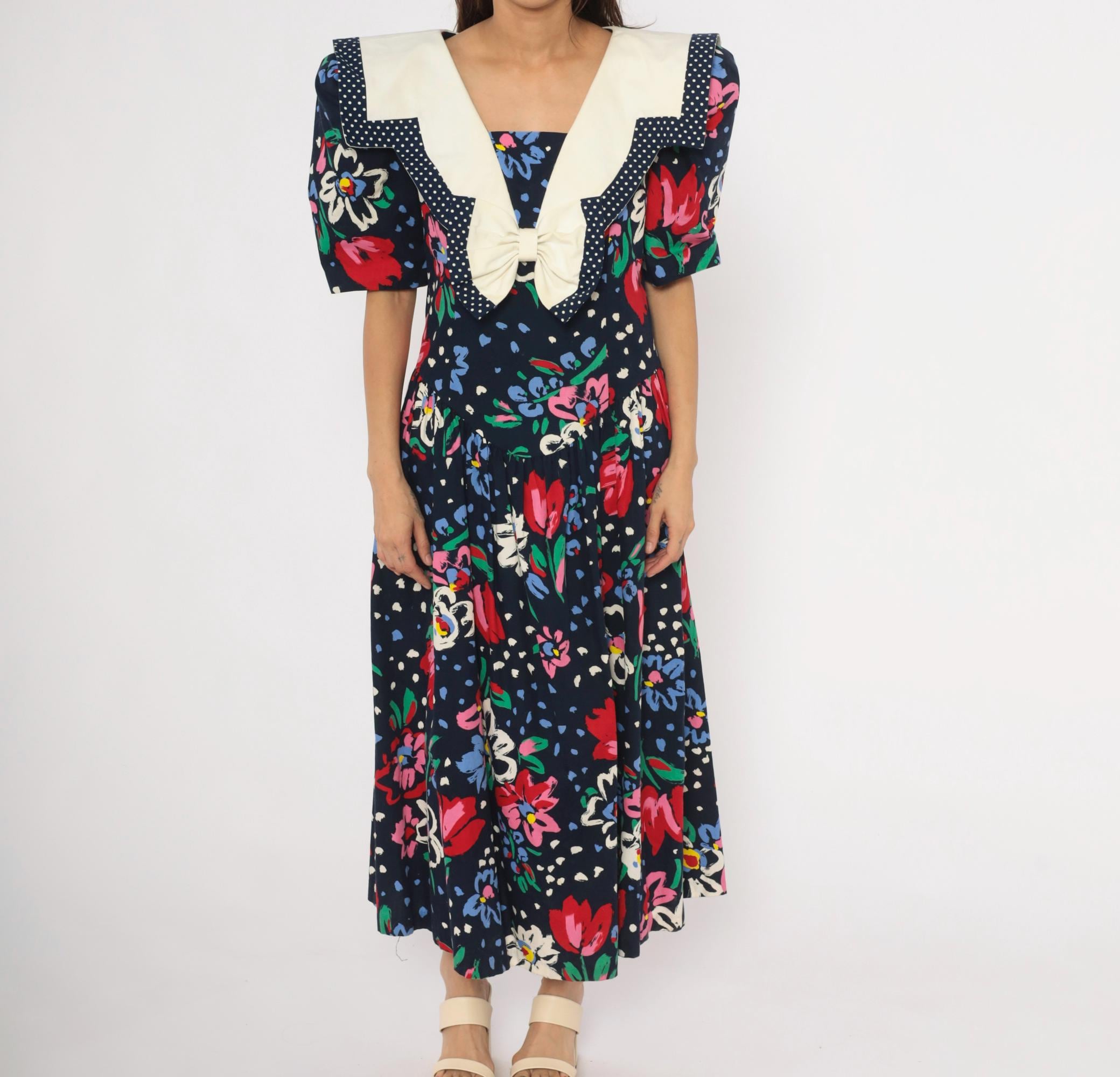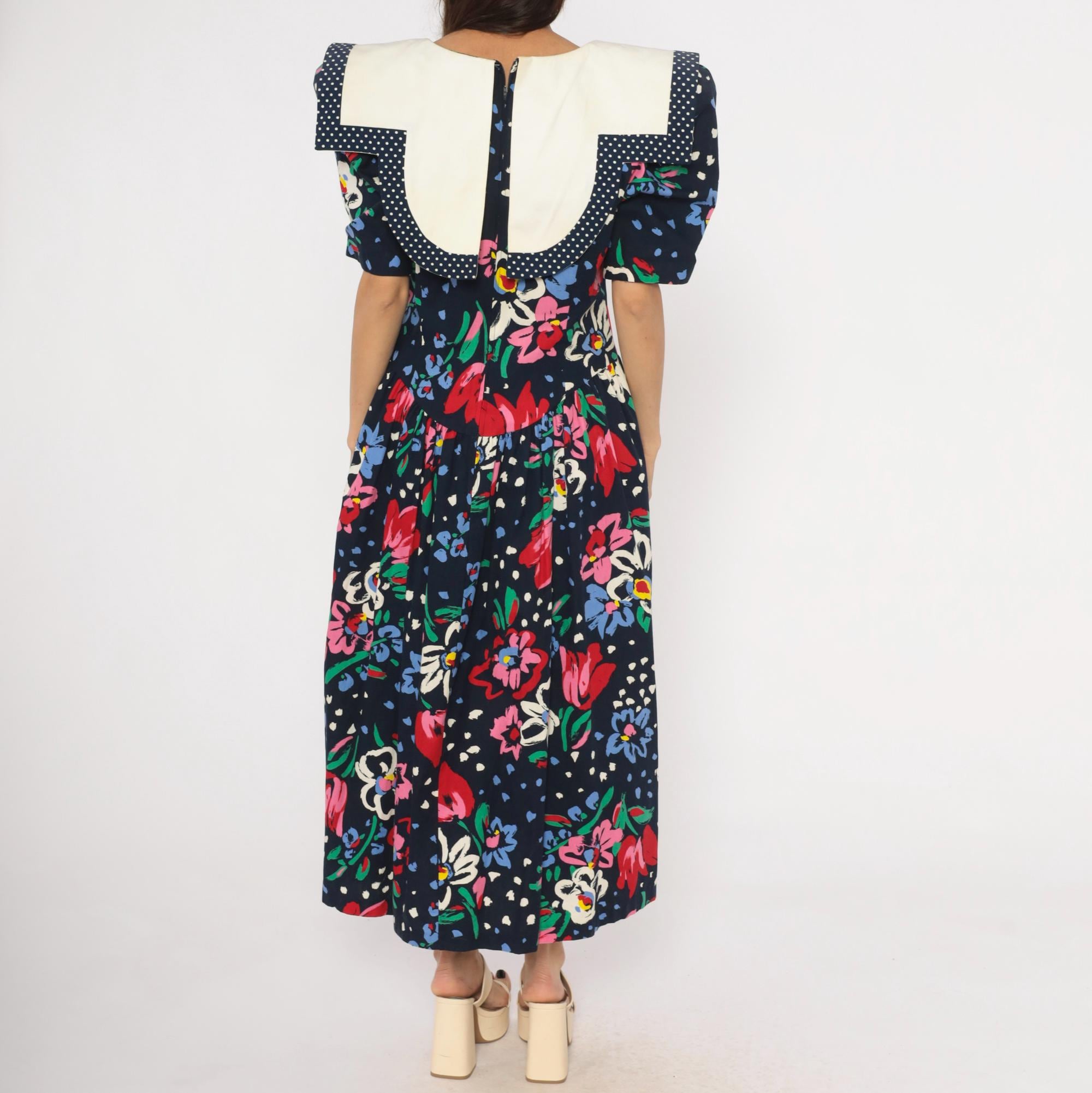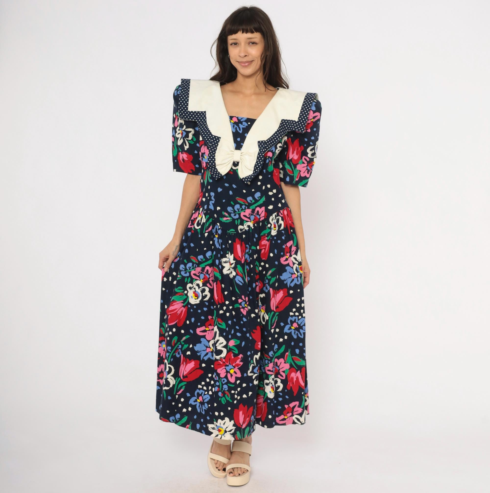 80s navy floral maxi dress from Leslie Lucks with a wide cream sailor collar trimmed in polka dot piping and a matching bow at the center front. Puff sleeves hit at the elbow, and the fitted bodice gathers into a full skirt at the dropped waist. Red, pink, blue, and white painterly flowers scattered across the dark ground with green foliage and blue speckled accents.