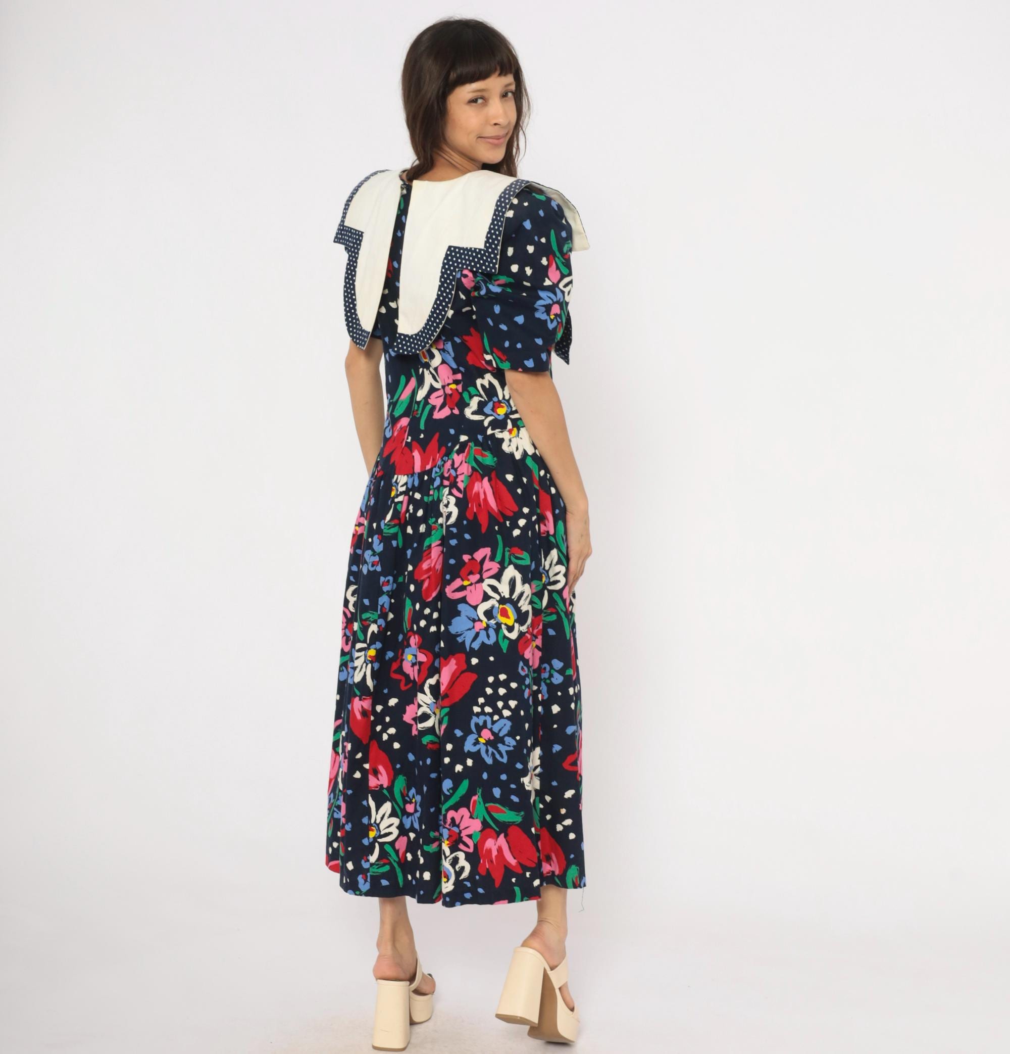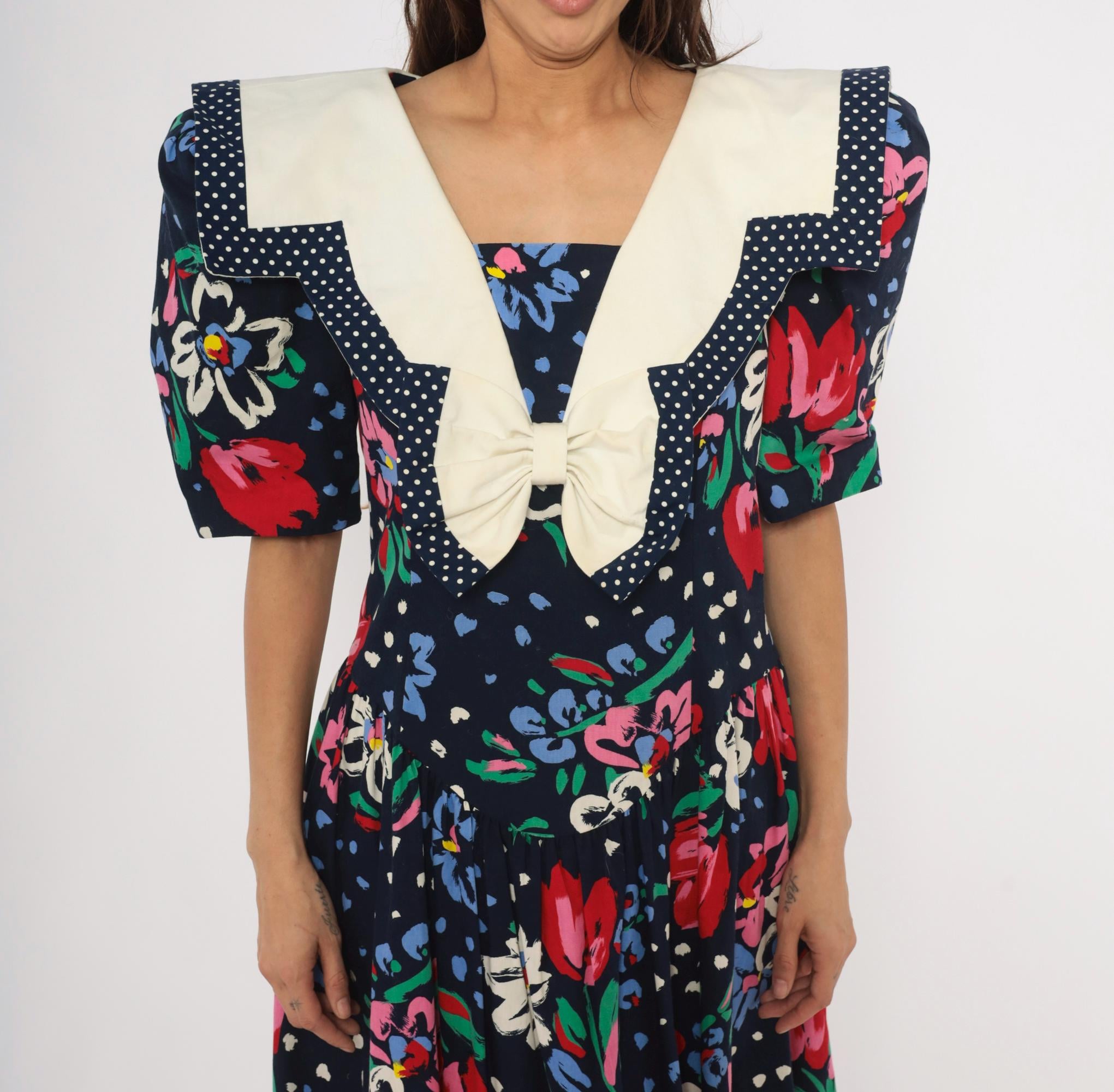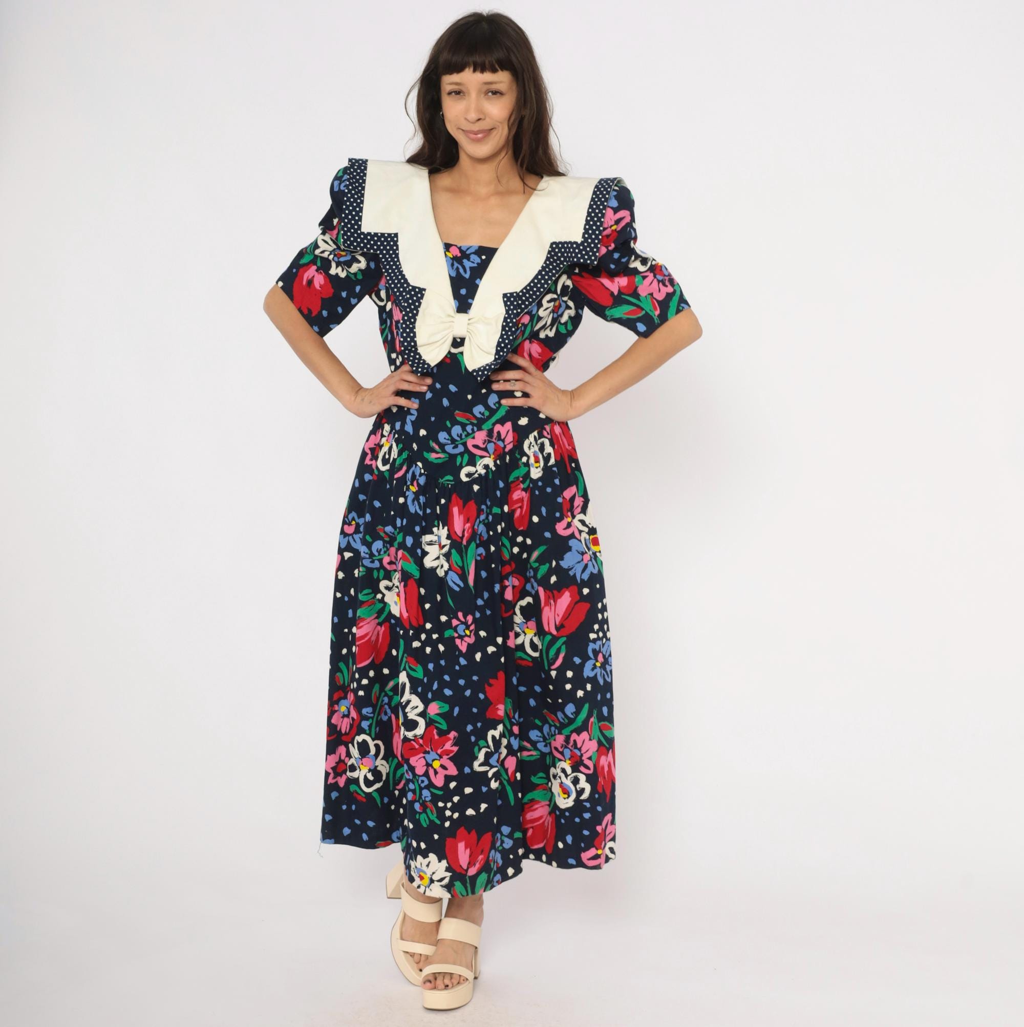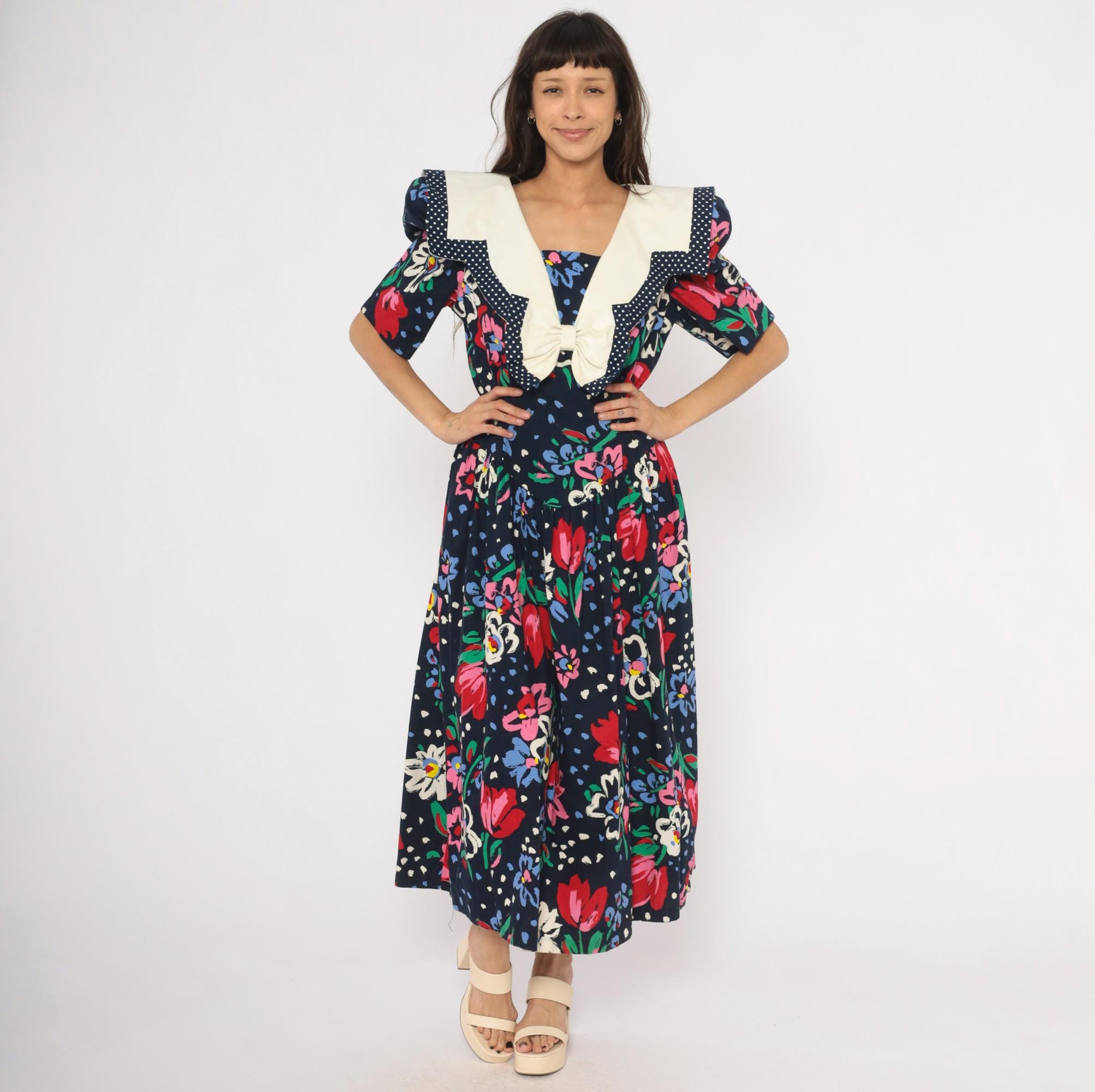 80s navy floral maxi dress from Leslie Lucks with a wide cream sailor collar trimmed in polka dot piping and a matching bow at the center front. Puff sleeves hit at the elbow, and the fitted bodice gathers into a full skirt at the dropped waist. Red, pink, blue, and white painterly flowers scattered across the dark ground with green foliage and blue speckled accents.