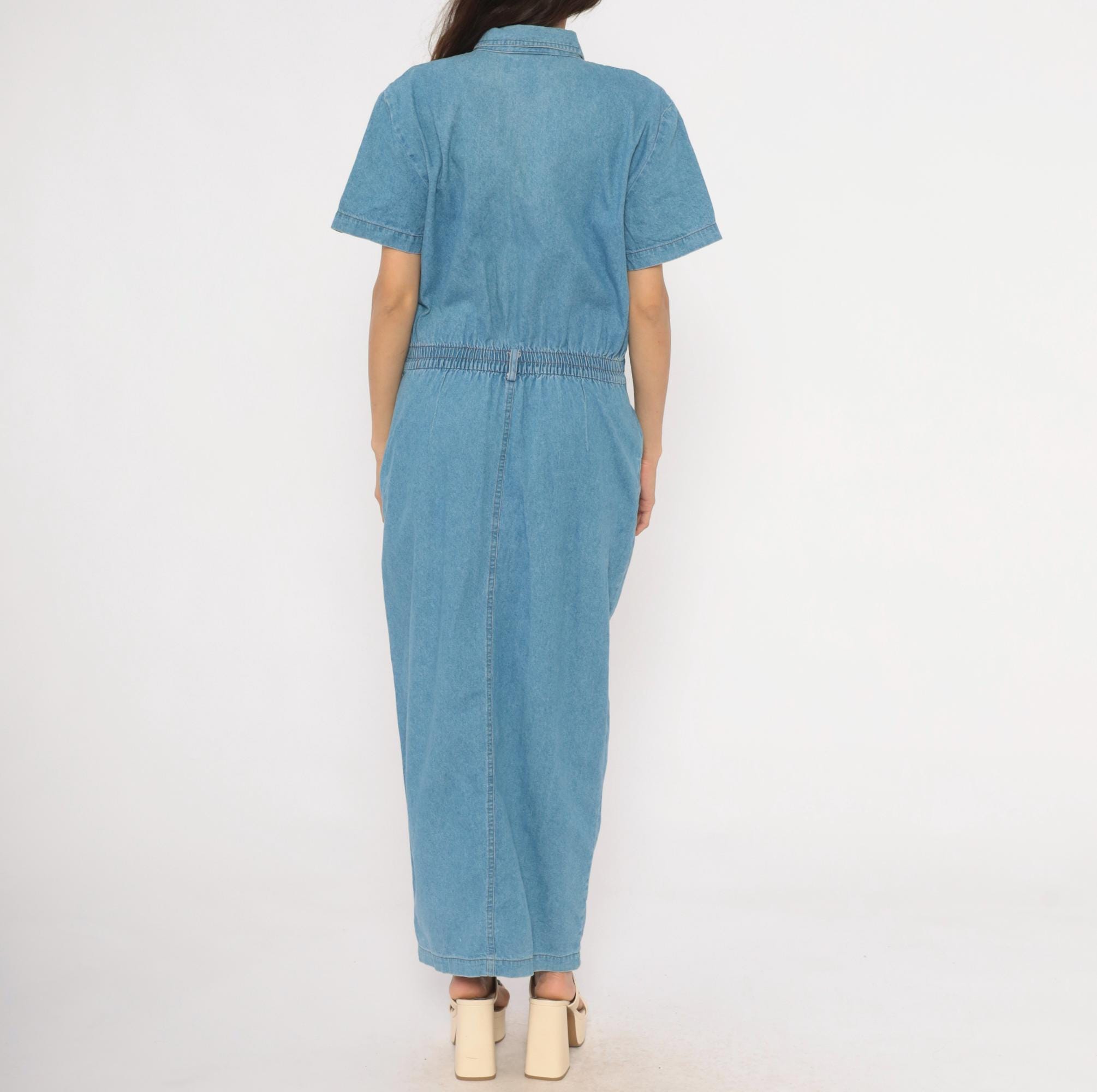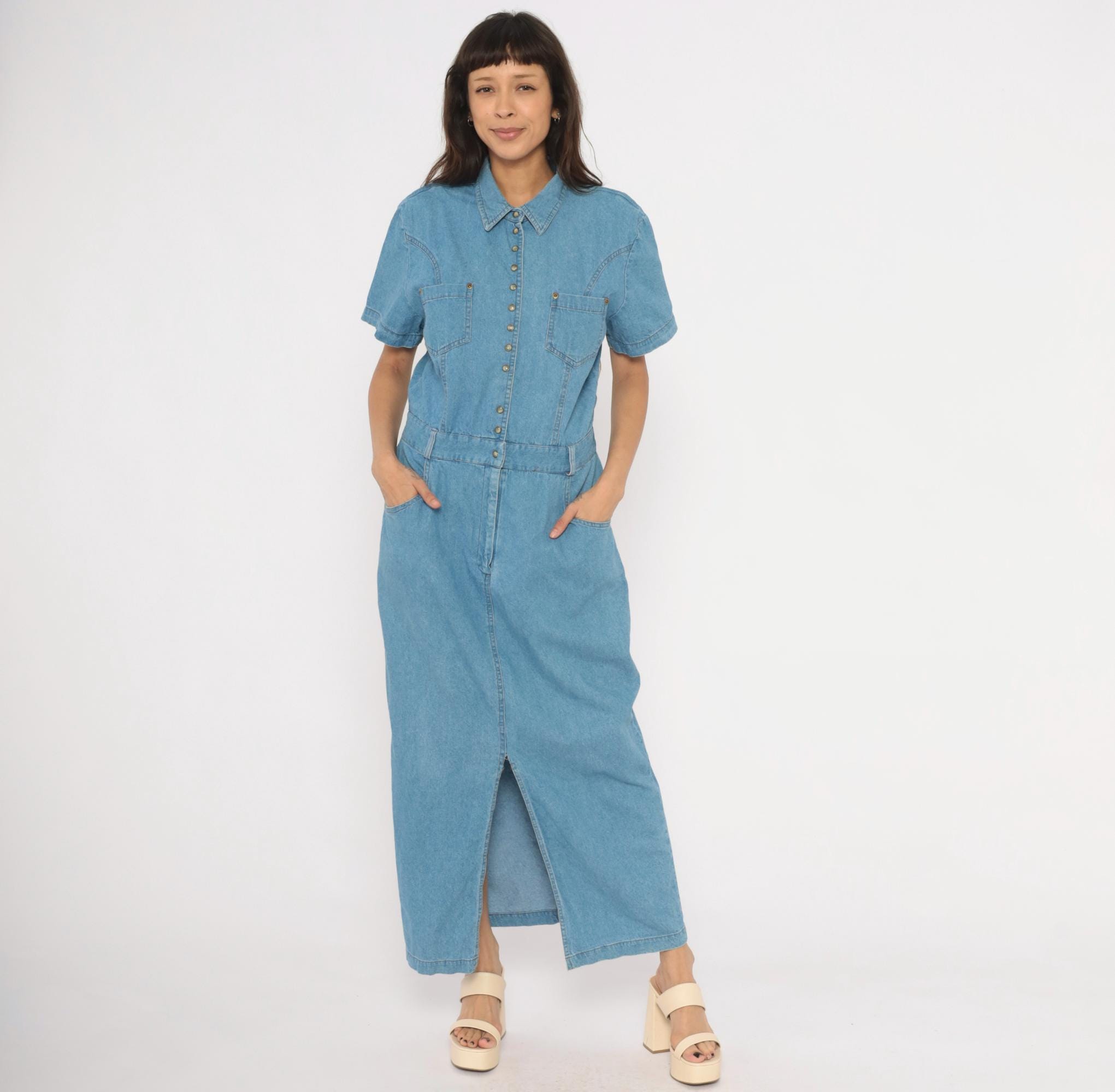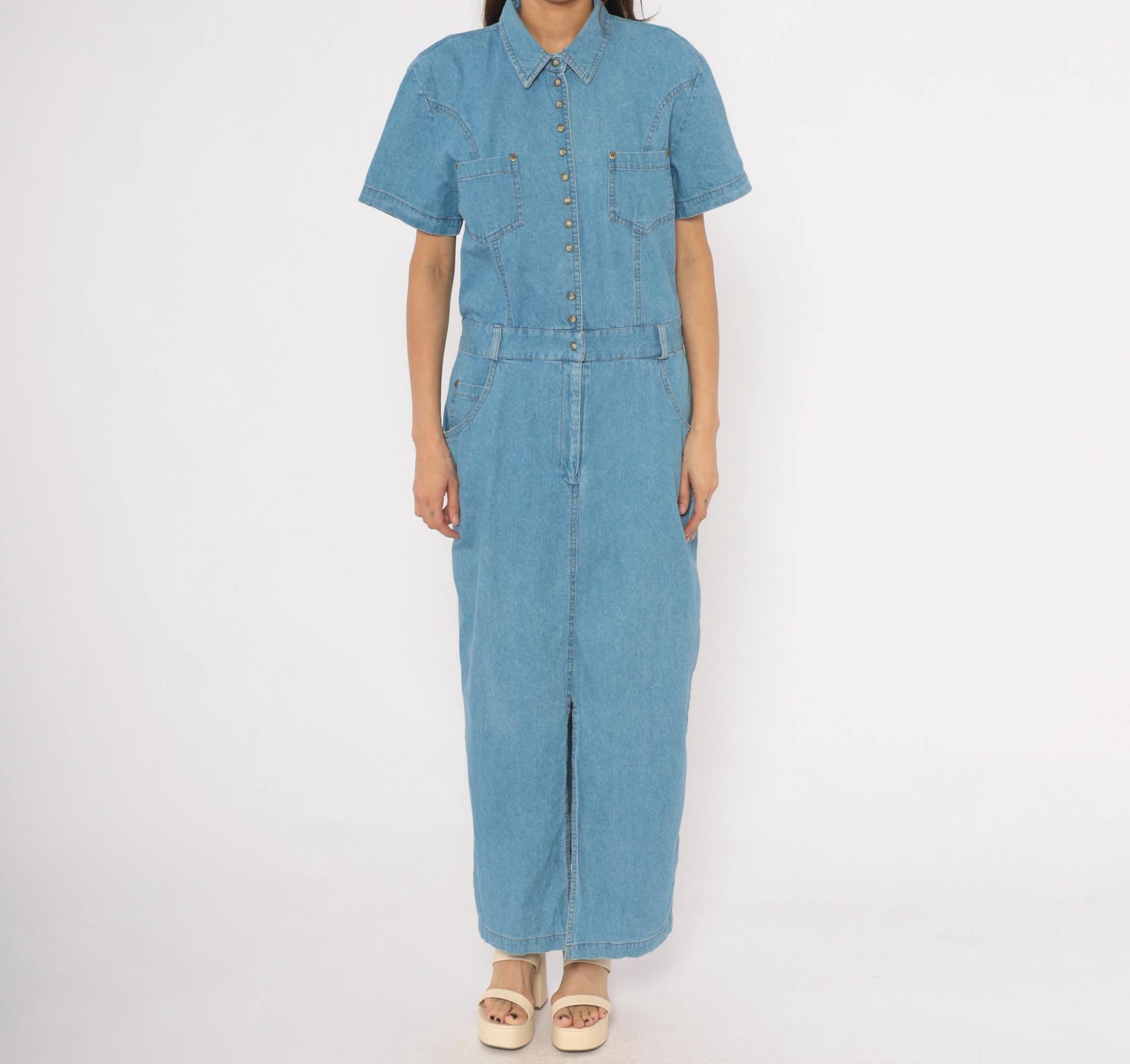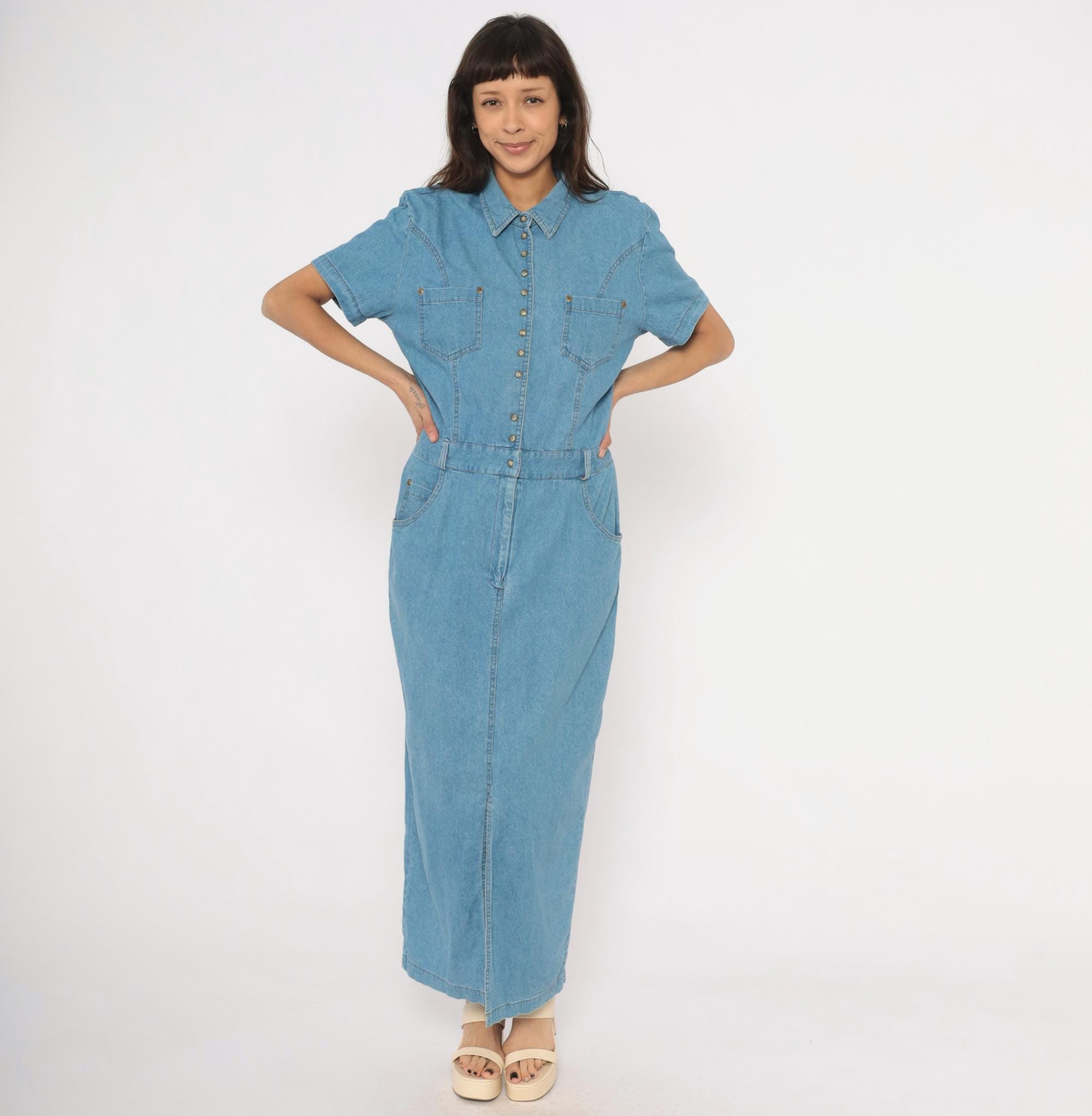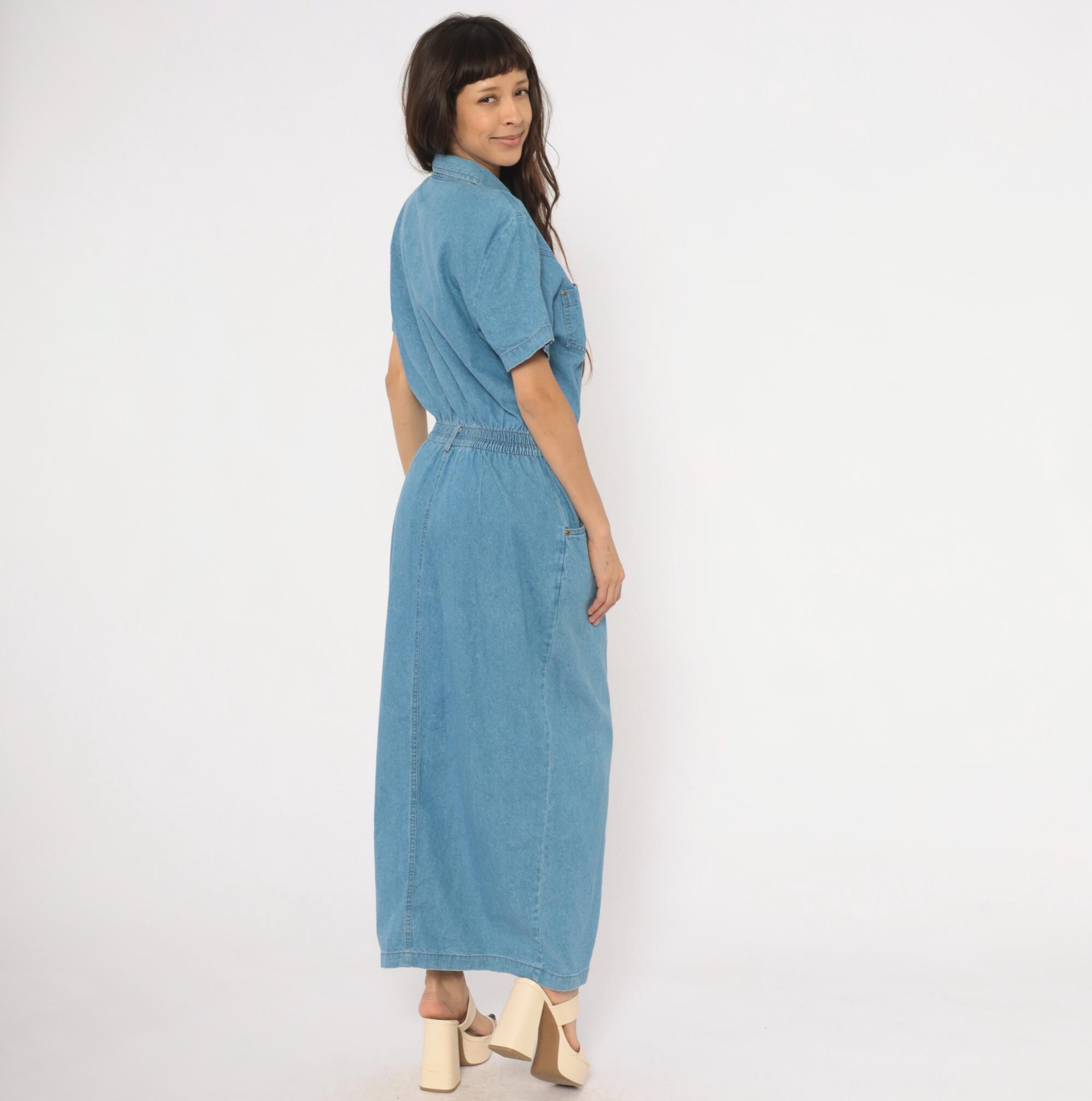 90s light blue denim maxi dress from PG Collections with a pointed collar, snap front closure, and short sleeves. Two chest patch pockets with snap closures sit below western-style yoke seaming, while an elastic waistband at the back and structured waistband at the front define the midsection.
