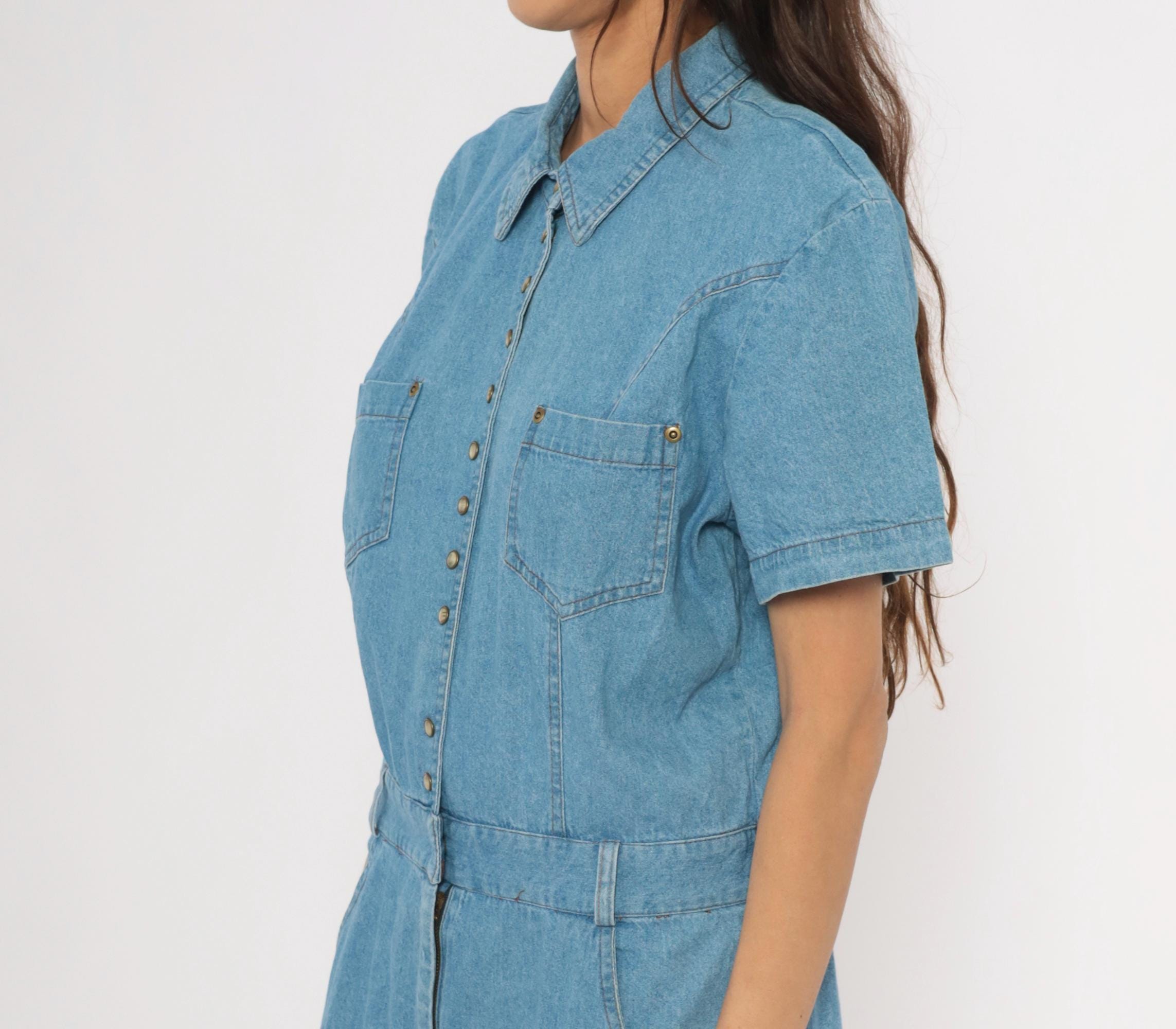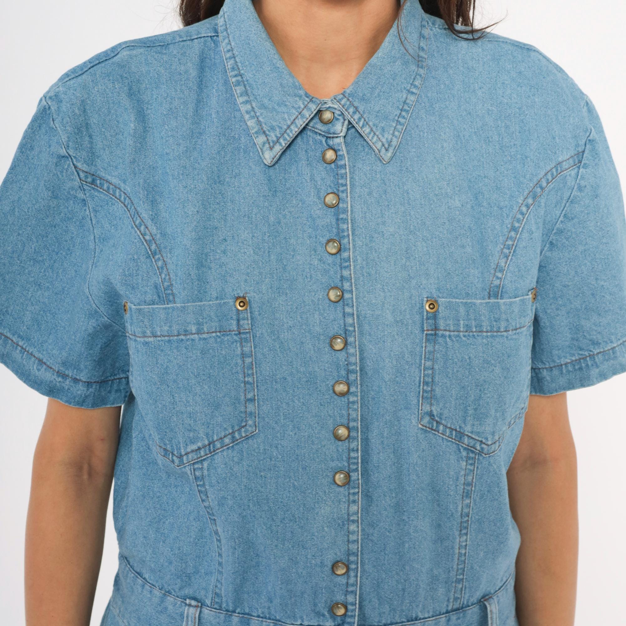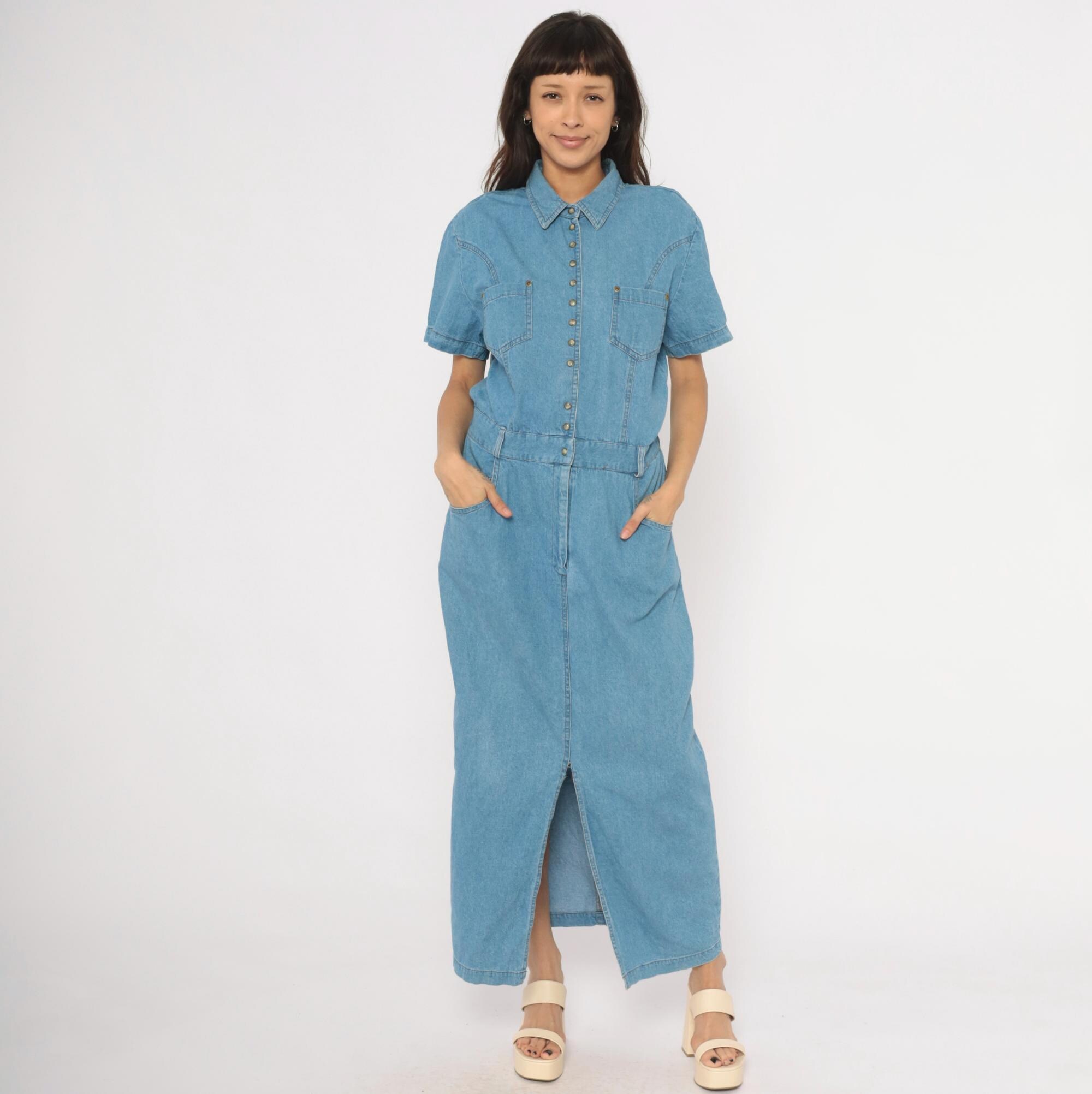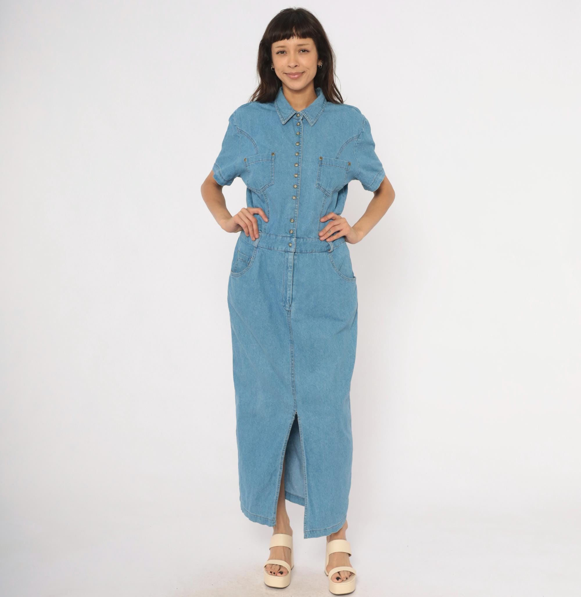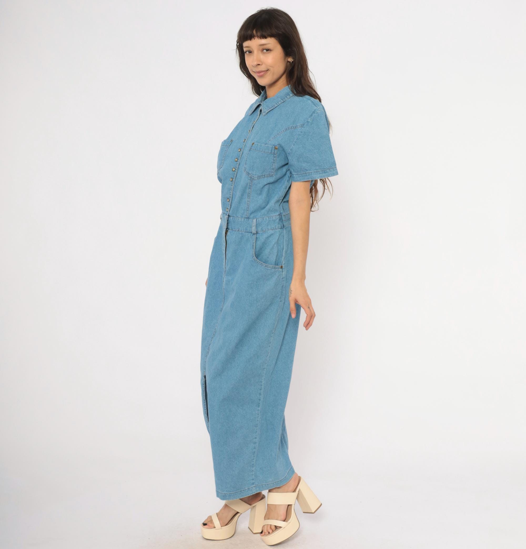 90s light blue denim maxi dress from PG Collections with a pointed collar, snap front closure, and short sleeves. Two chest patch pockets with snap closures sit below western-style yoke seaming, while an elastic waistband at the back and structured waistband at the front define the midsection.