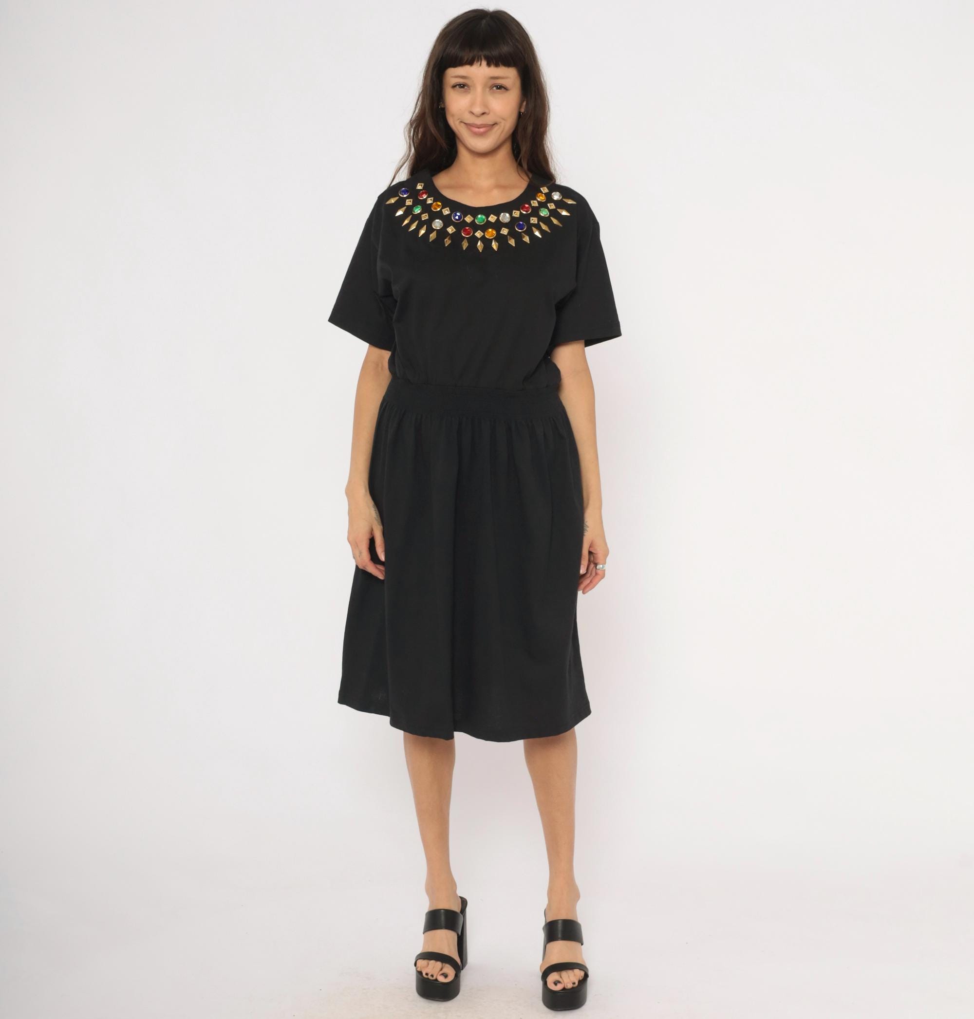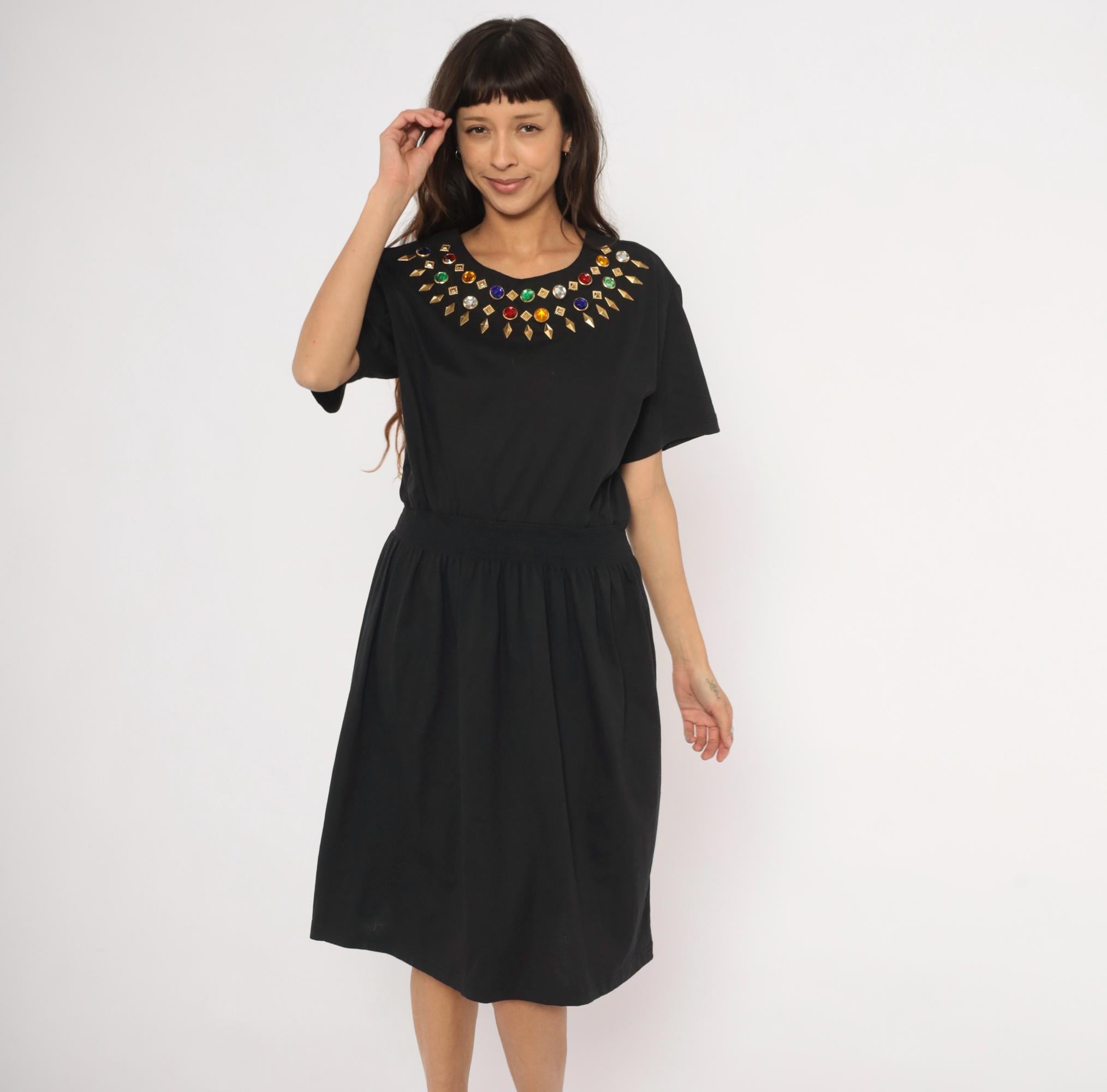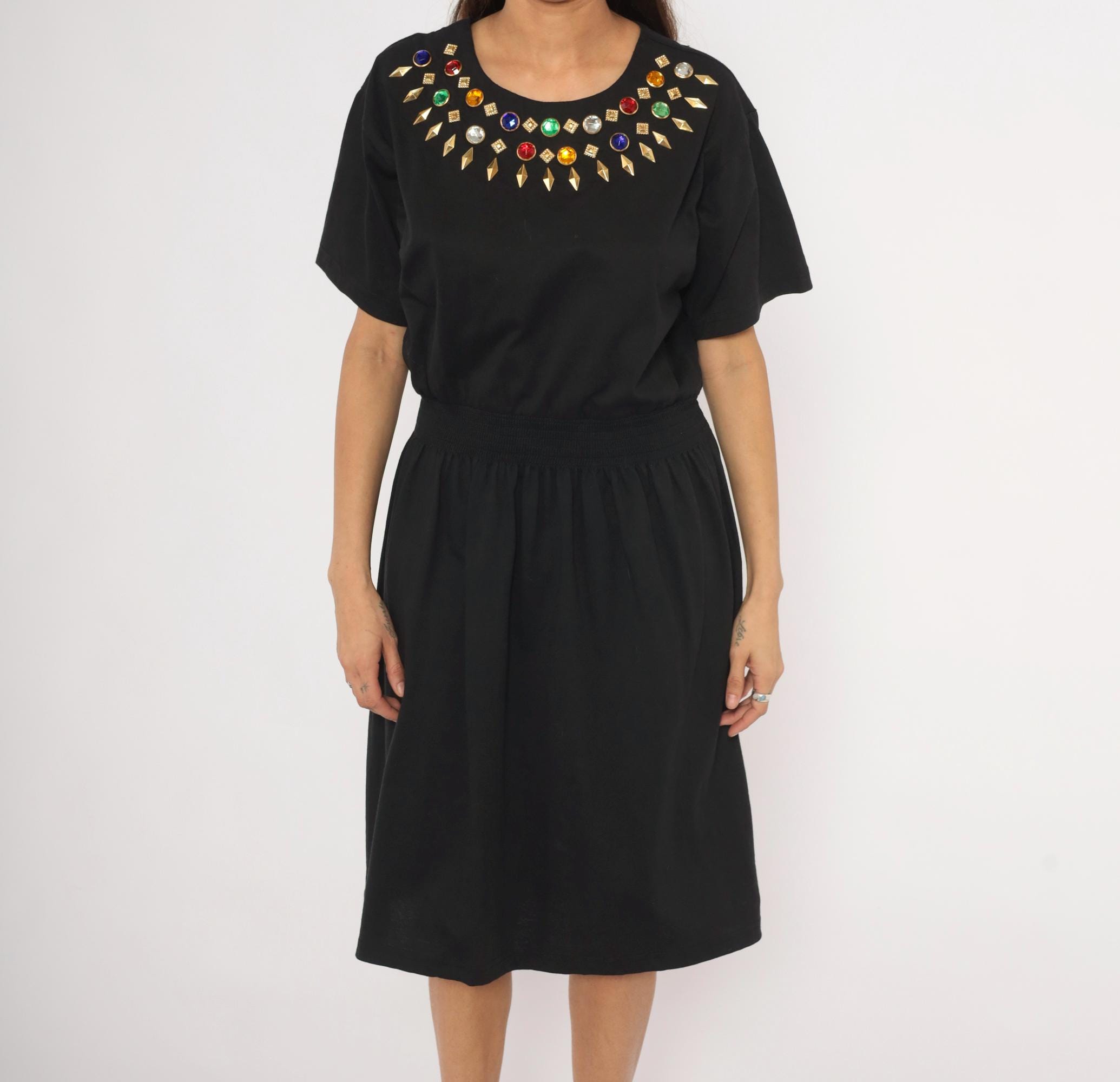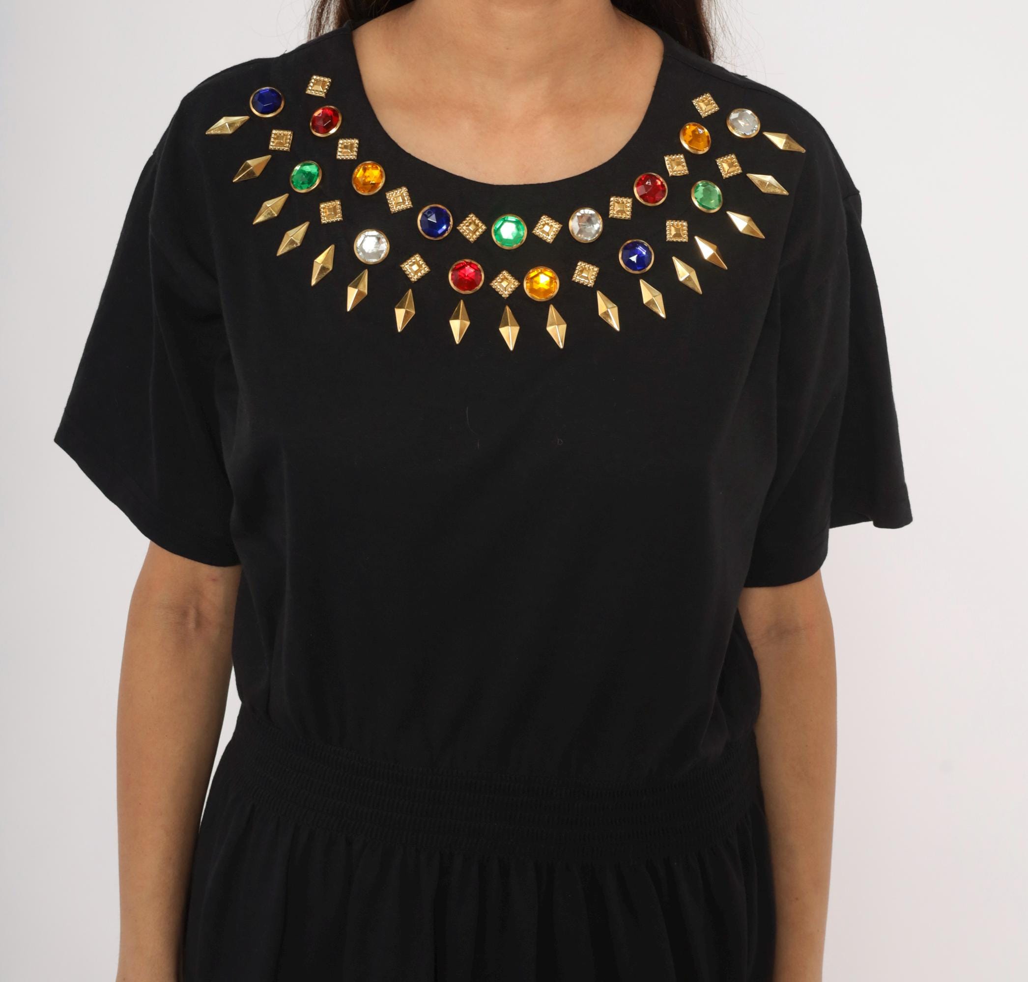 90s black knee-length dress from Cervelle with a scoop neckline adorned with multicolor faceted rhinestones and gold-tone diamond-shaped studs arranged in a bib collar pattern. Short sleeves with a relaxed bodice and elasticized gathered waist.