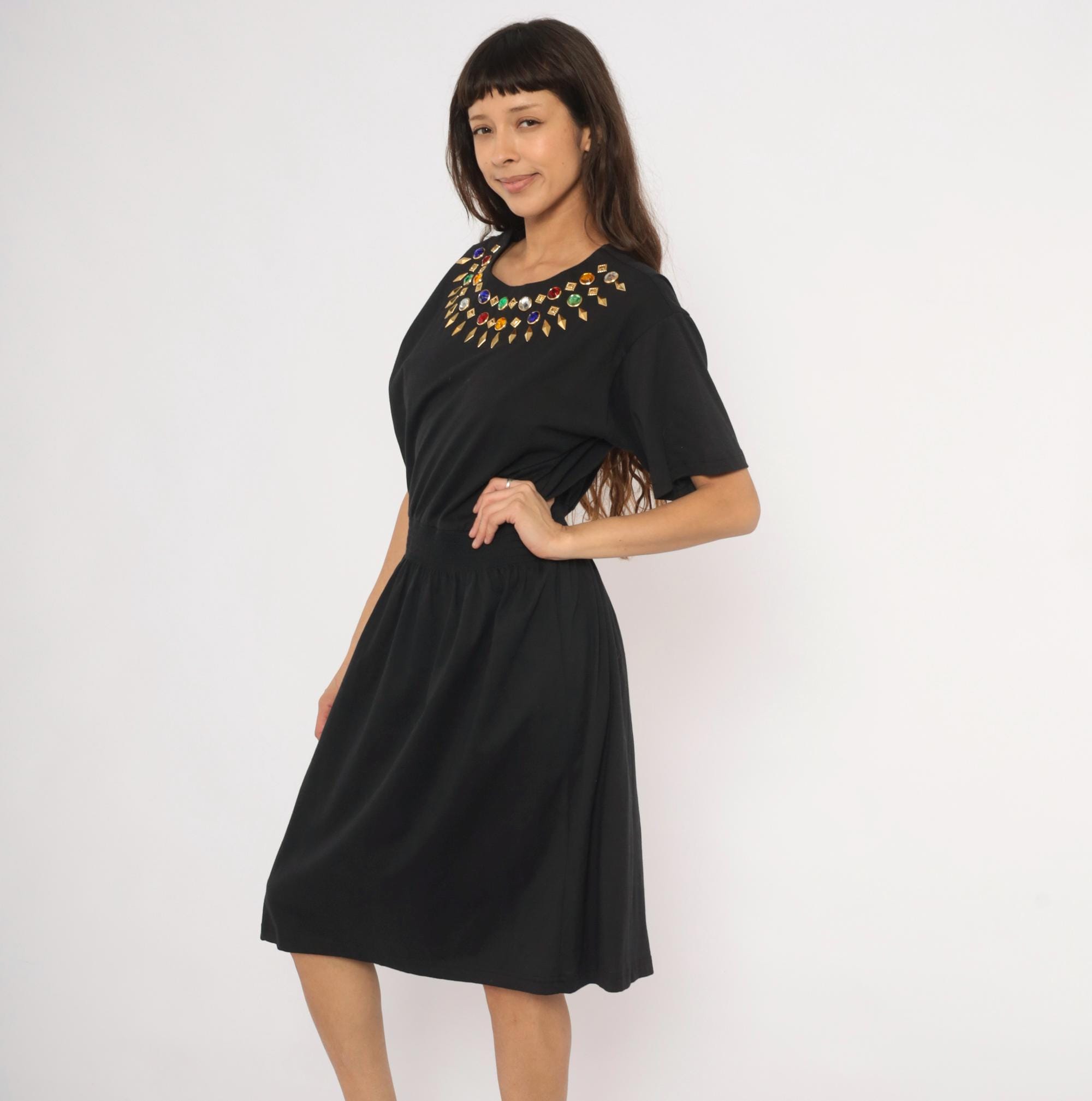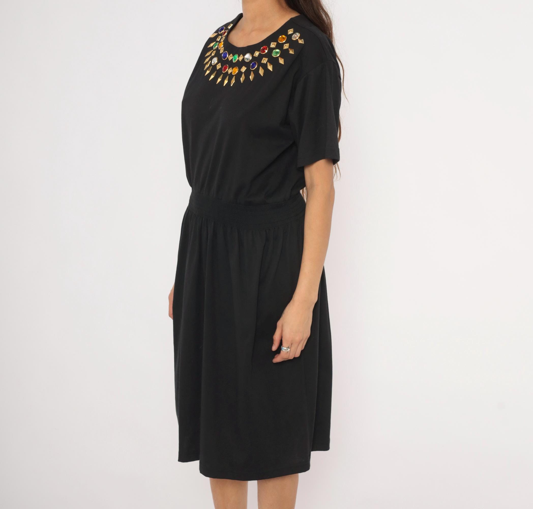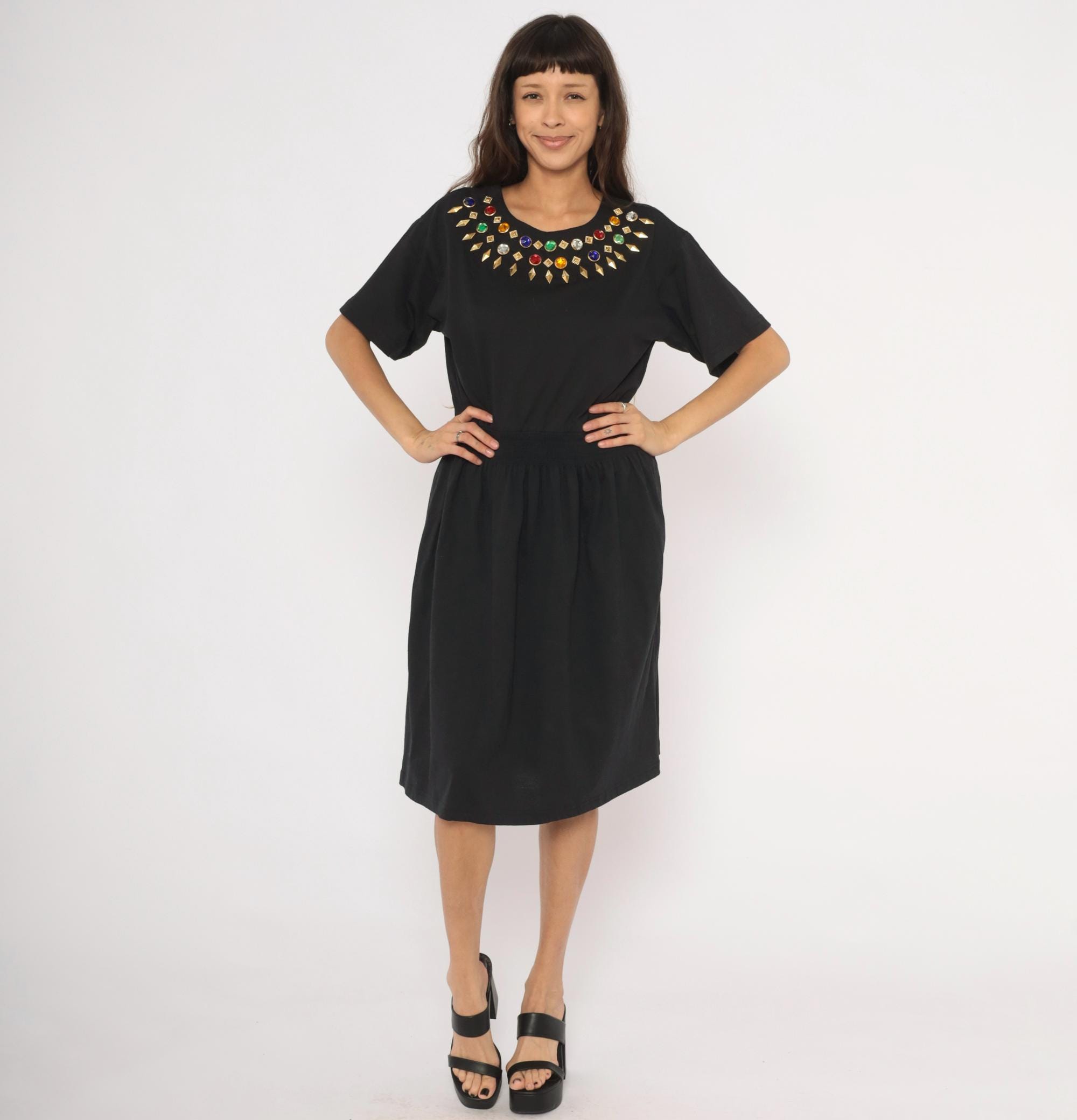 90s black knee-length dress from Cervelle with a scoop neckline adorned with multicolor faceted rhinestones and gold-tone diamond-shaped studs arranged in a bib collar pattern. Short sleeves with a relaxed bodice and elasticized gathered waist.