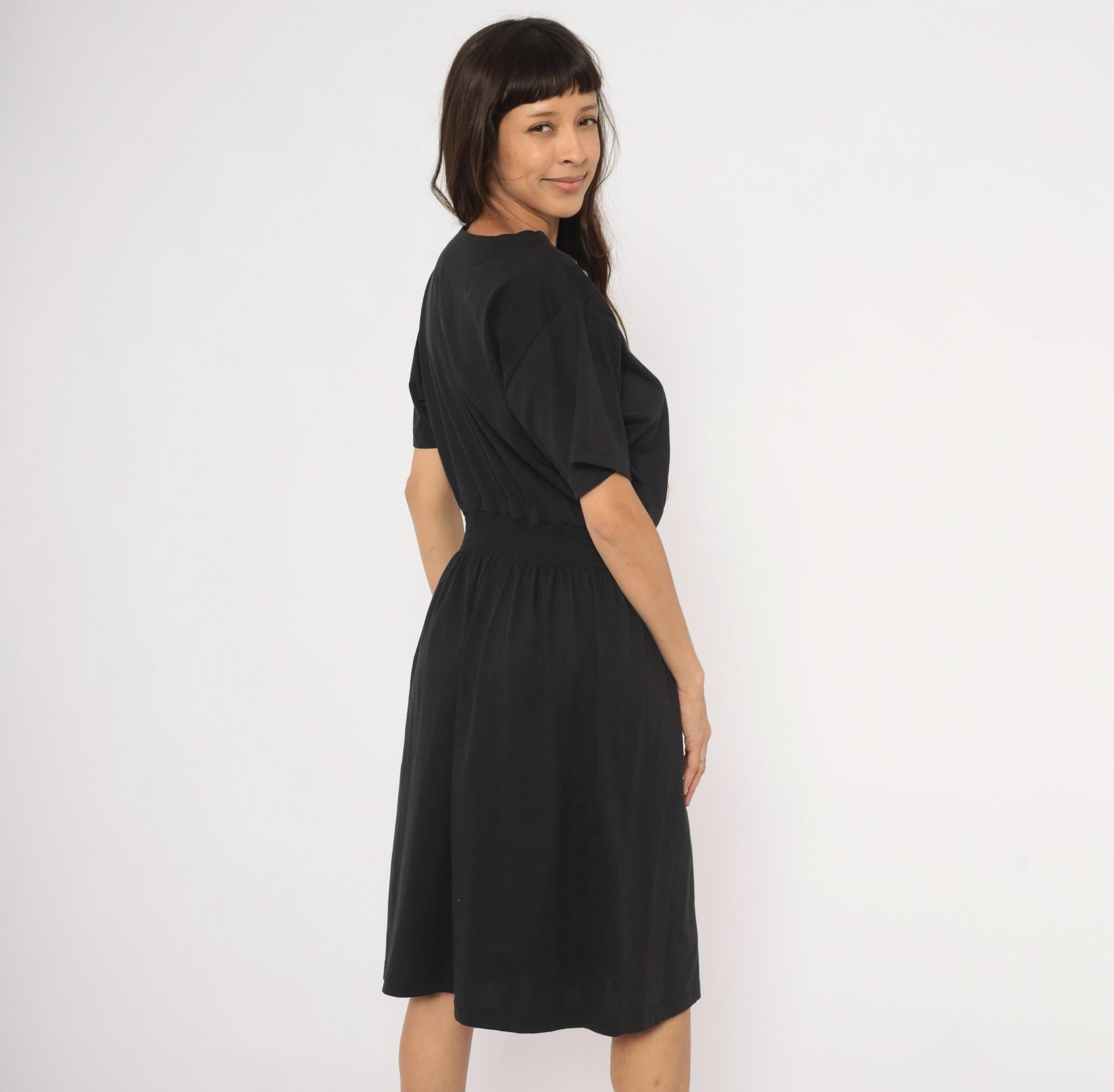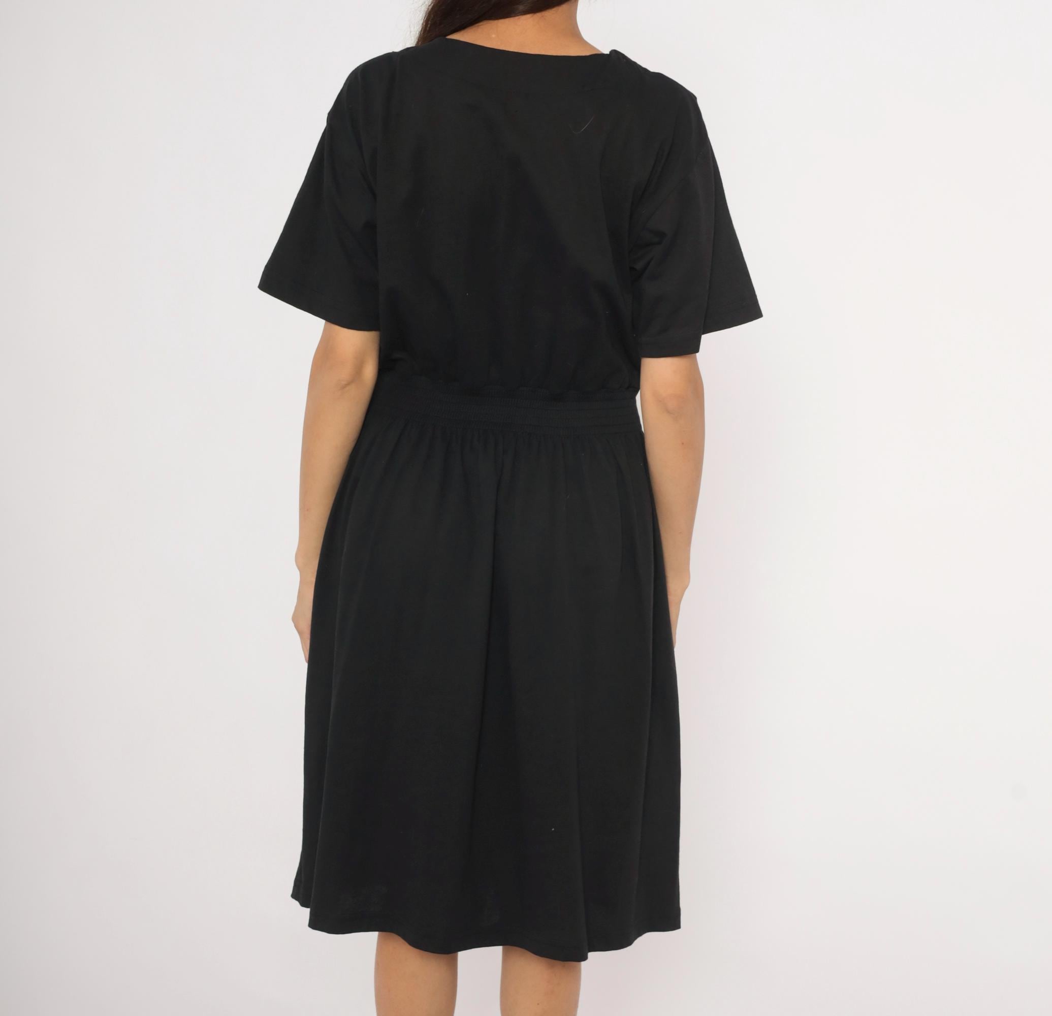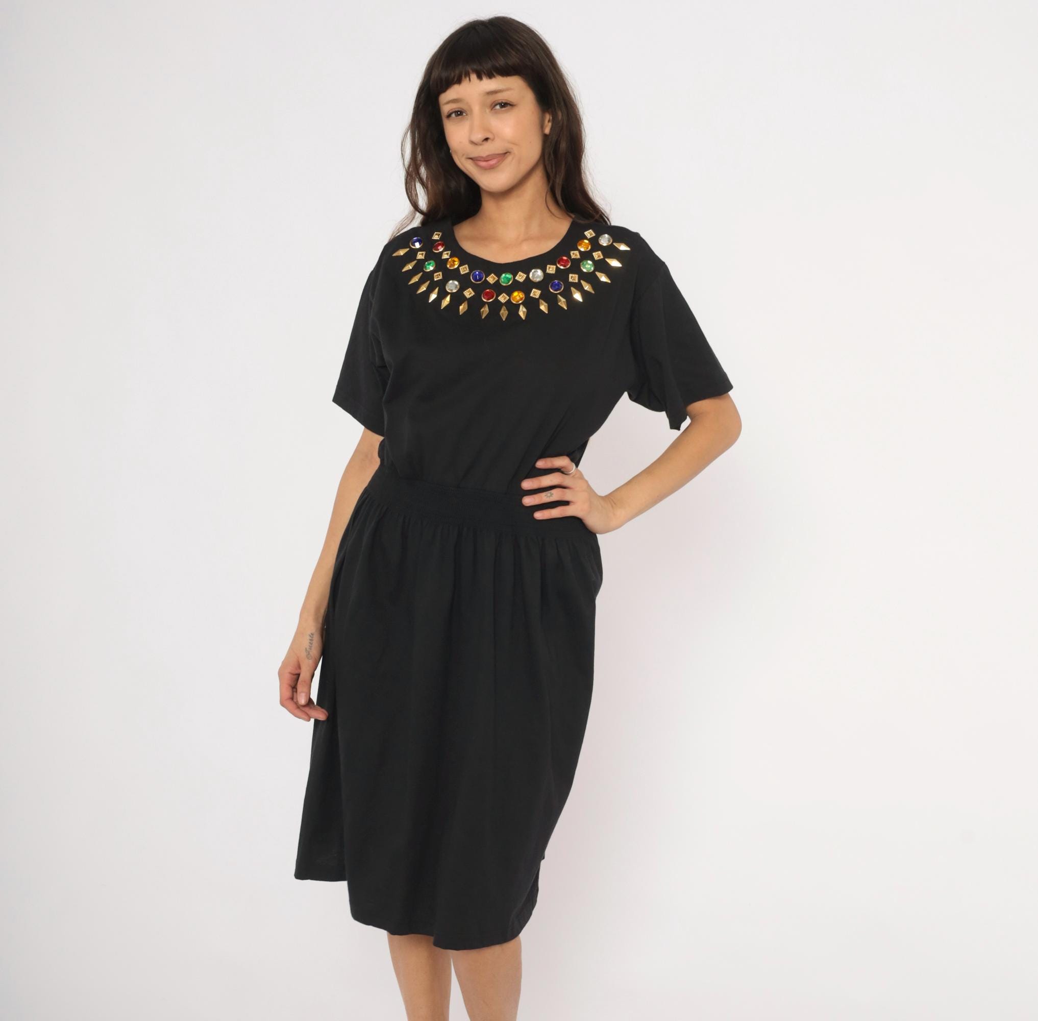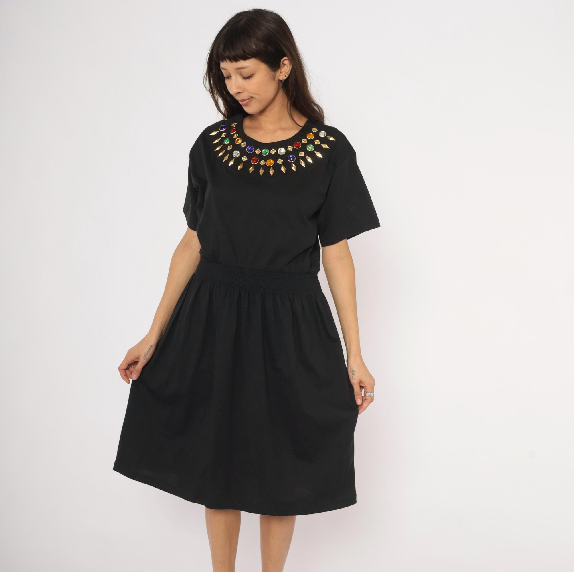 90s black knee-length dress from Cervelle with a scoop neckline adorned with multicolor faceted rhinestones and gold-tone diamond-shaped studs arranged in a bib collar pattern. Short sleeves with a relaxed bodice and elasticized gathered waist.
