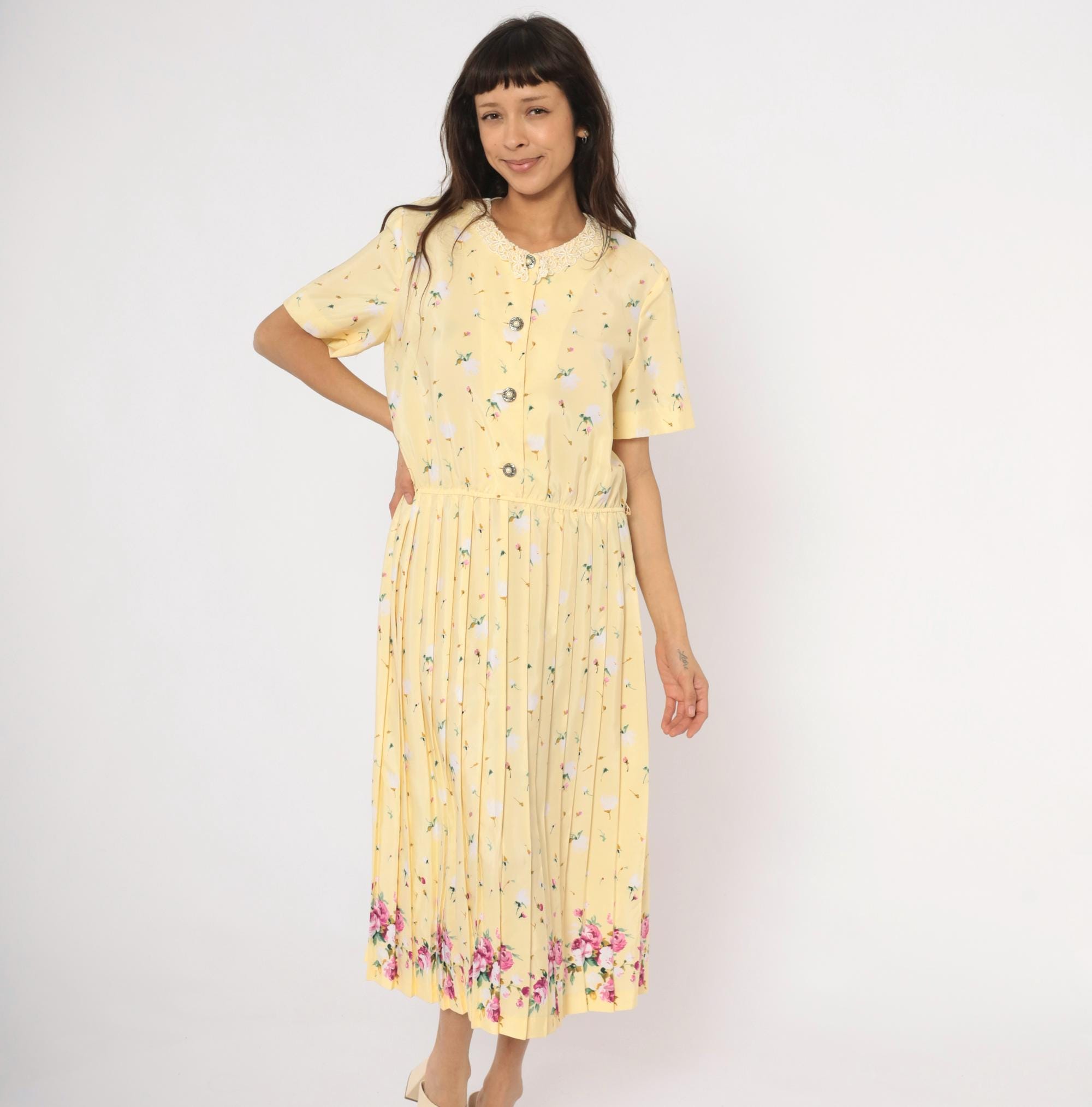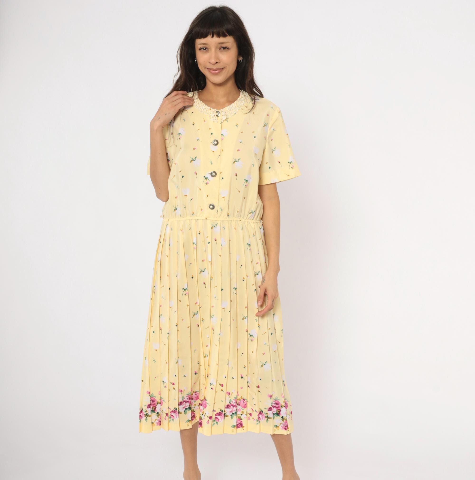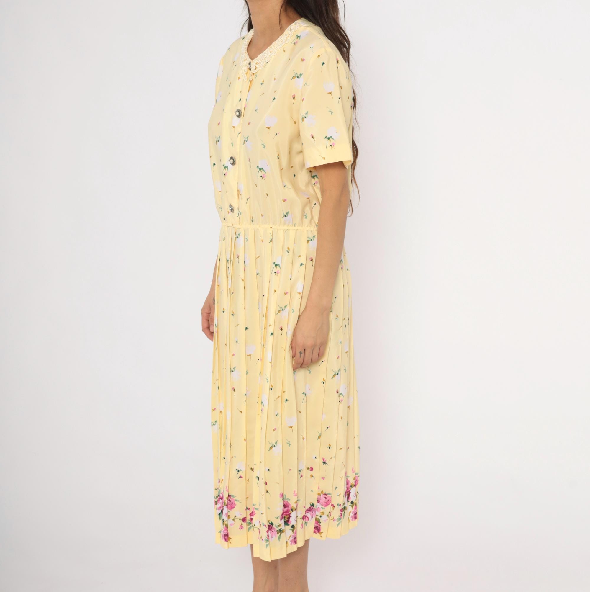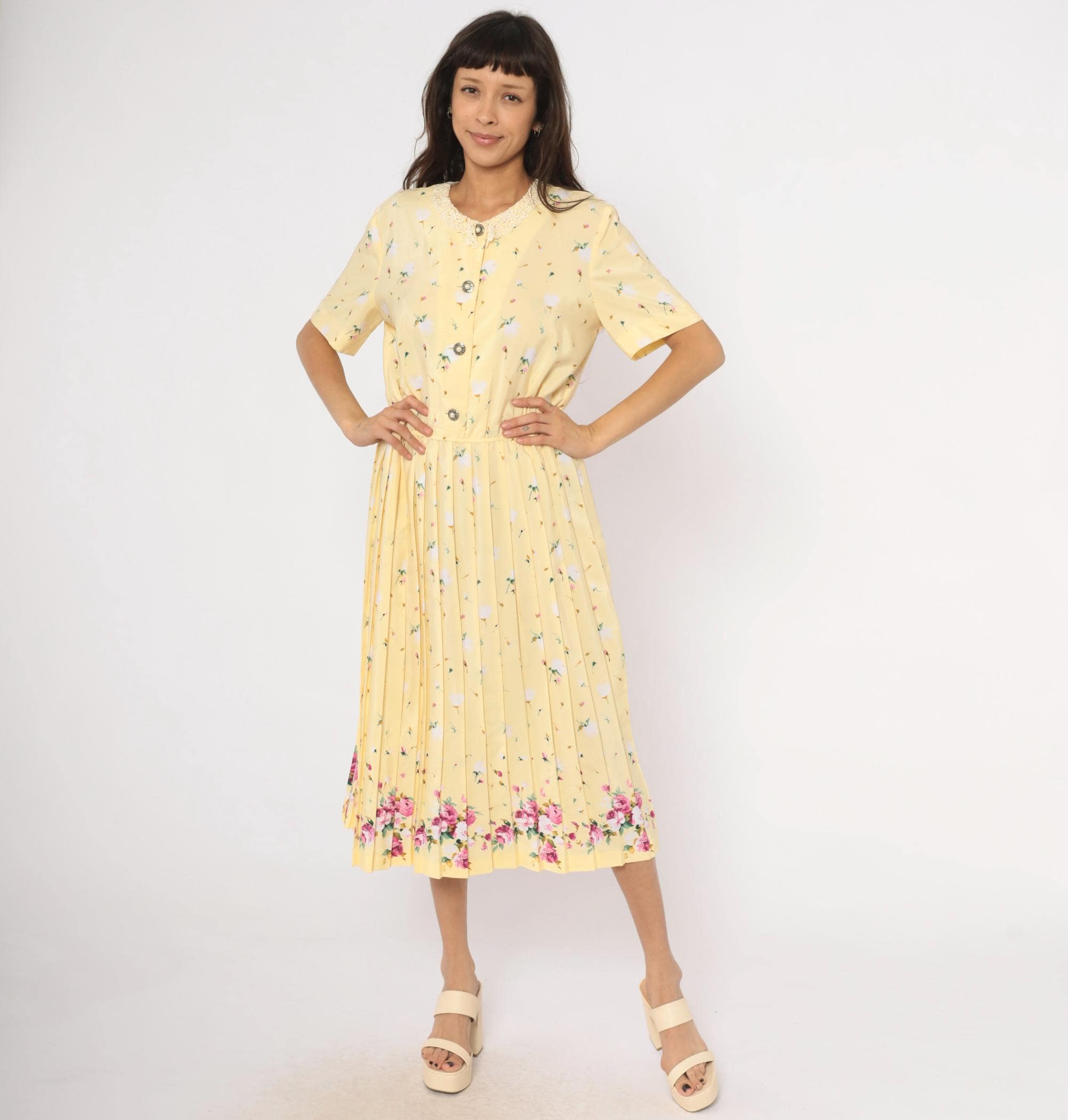 80s butter yellow midi dress from Leslie Fay with a scattered floral print in white, pink, and green, and a dense rose border along the pleated hem. Lace appliqué collar at the rounded neckline with ornate silver-tone pearl-center buttons down the front.