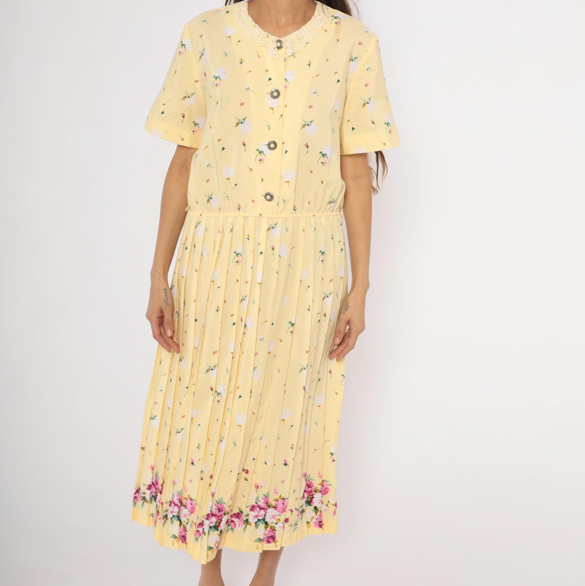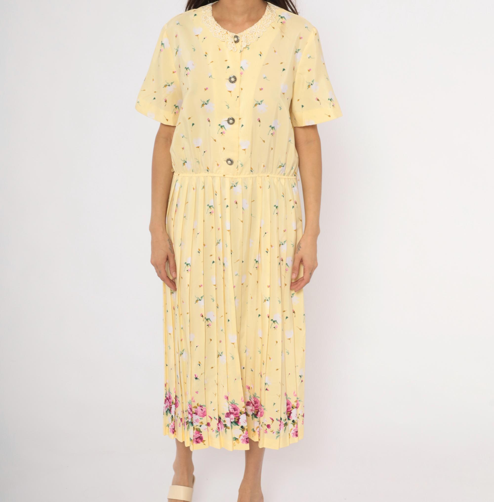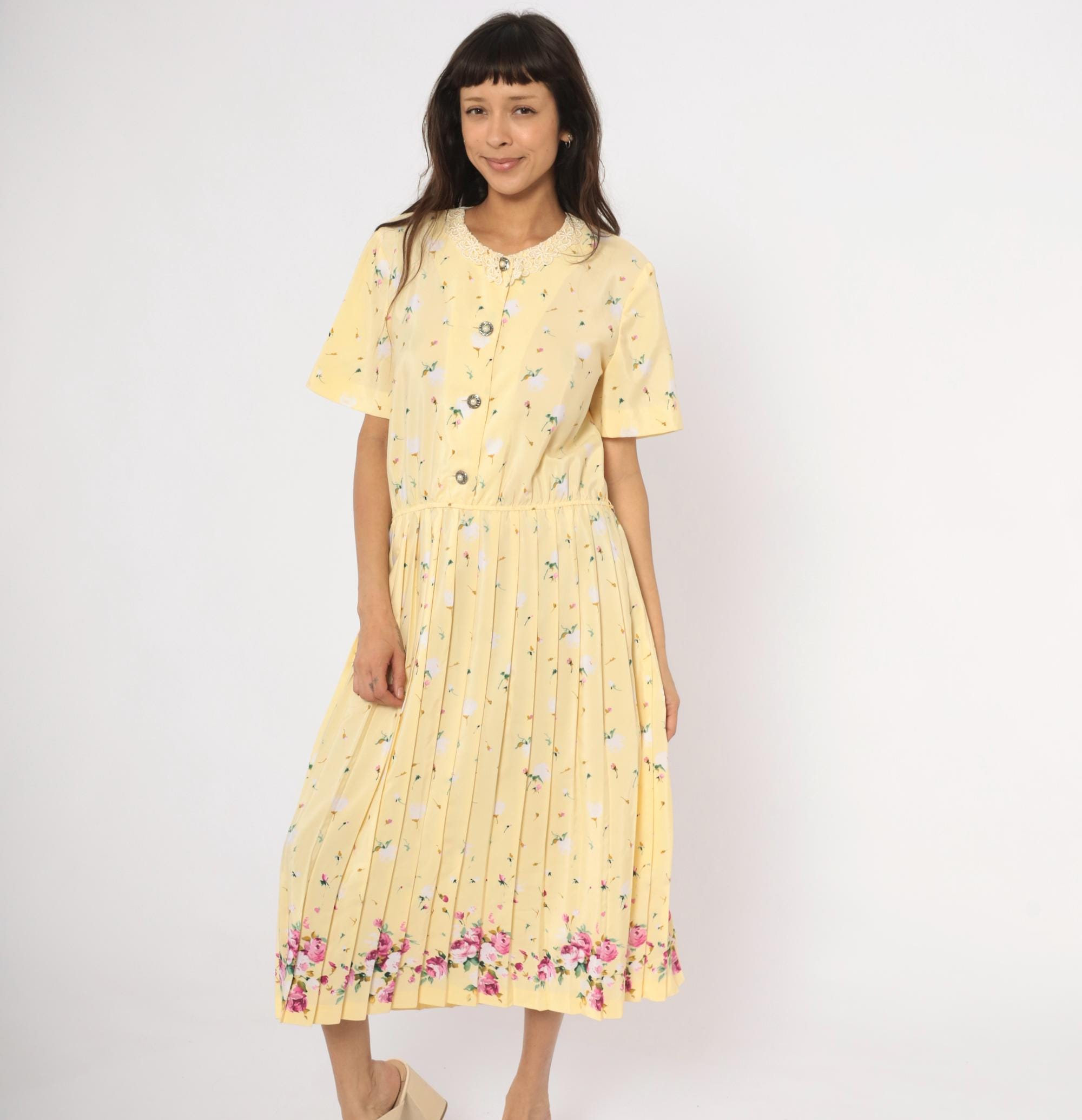 80s butter yellow midi dress from Leslie Fay with a scattered floral print in white, pink, and green, and a dense rose border along the pleated hem. Lace appliqué collar at the rounded neckline with ornate silver-tone pearl-center buttons down the front.