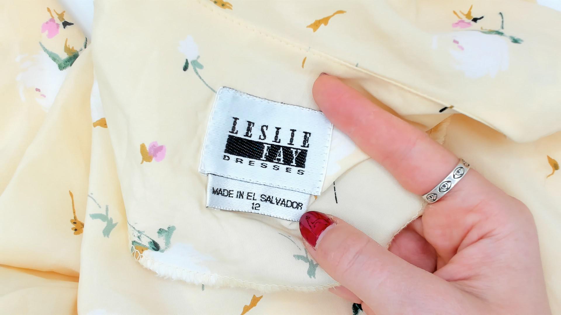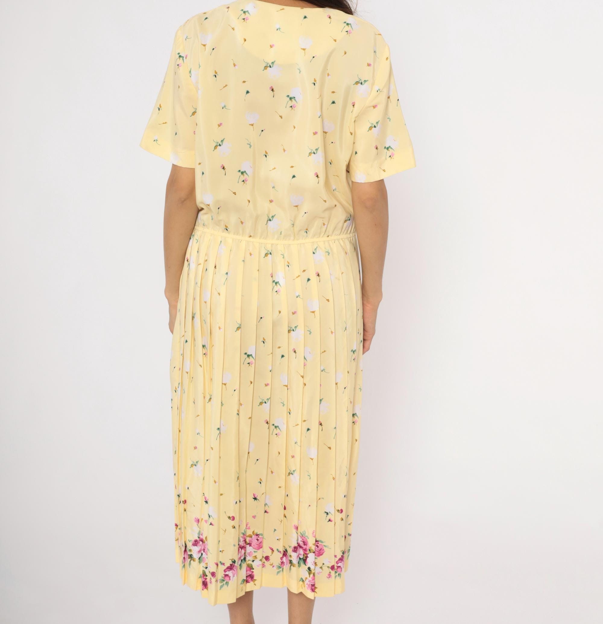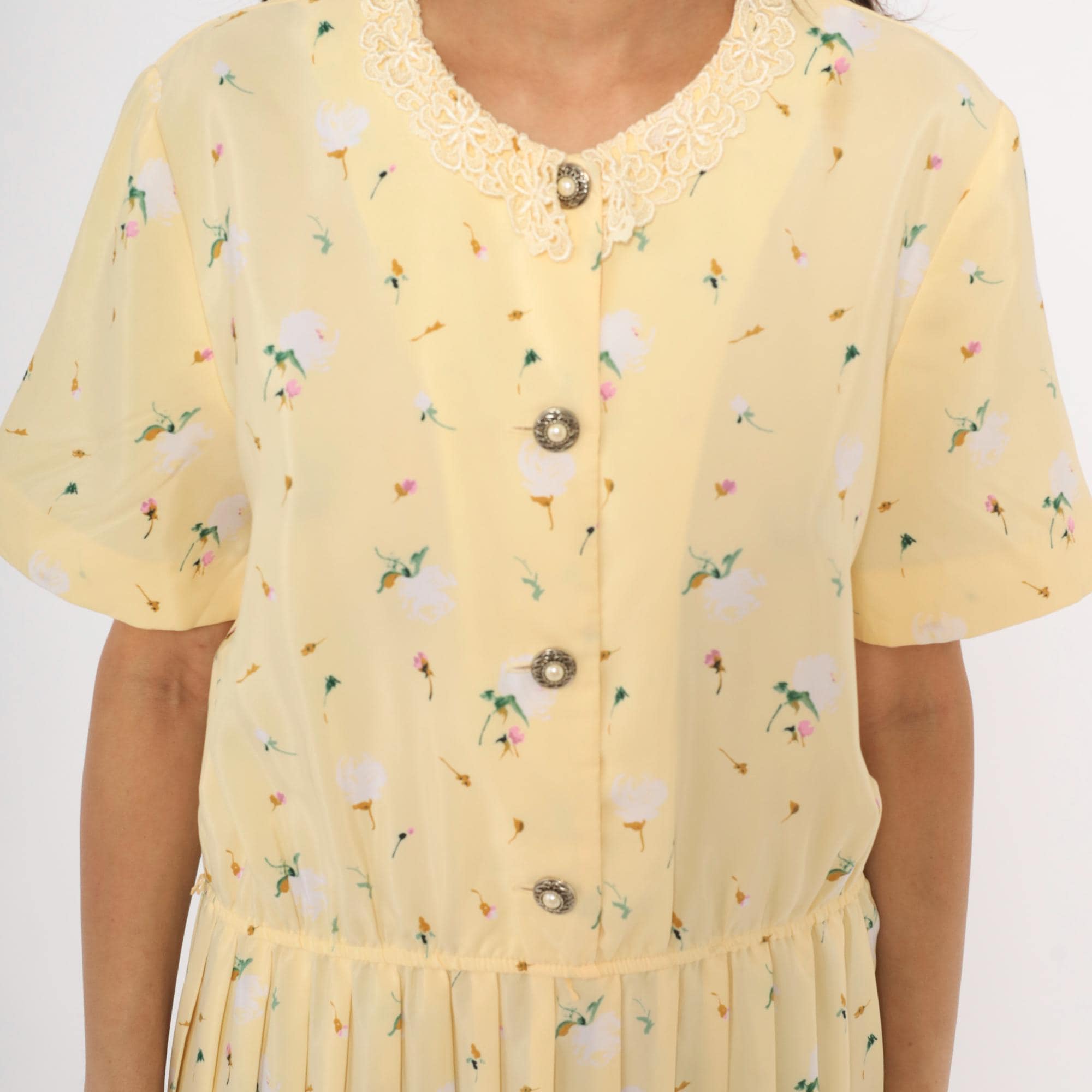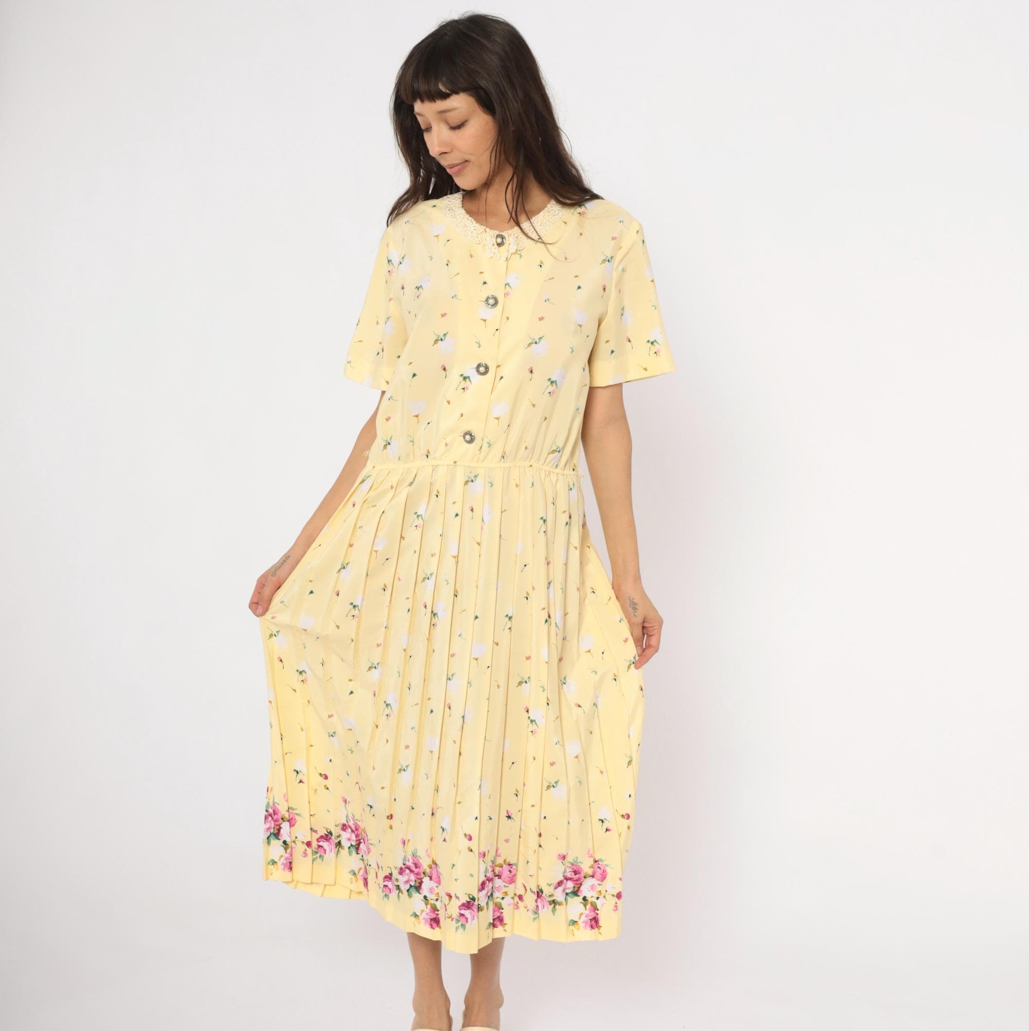 80s butter yellow midi dress from Leslie Fay with a scattered floral print in white, pink, and green, and a dense rose border along the pleated hem. Lace appliqué collar at the rounded neckline with ornate silver-tone pearl-center buttons down the front.