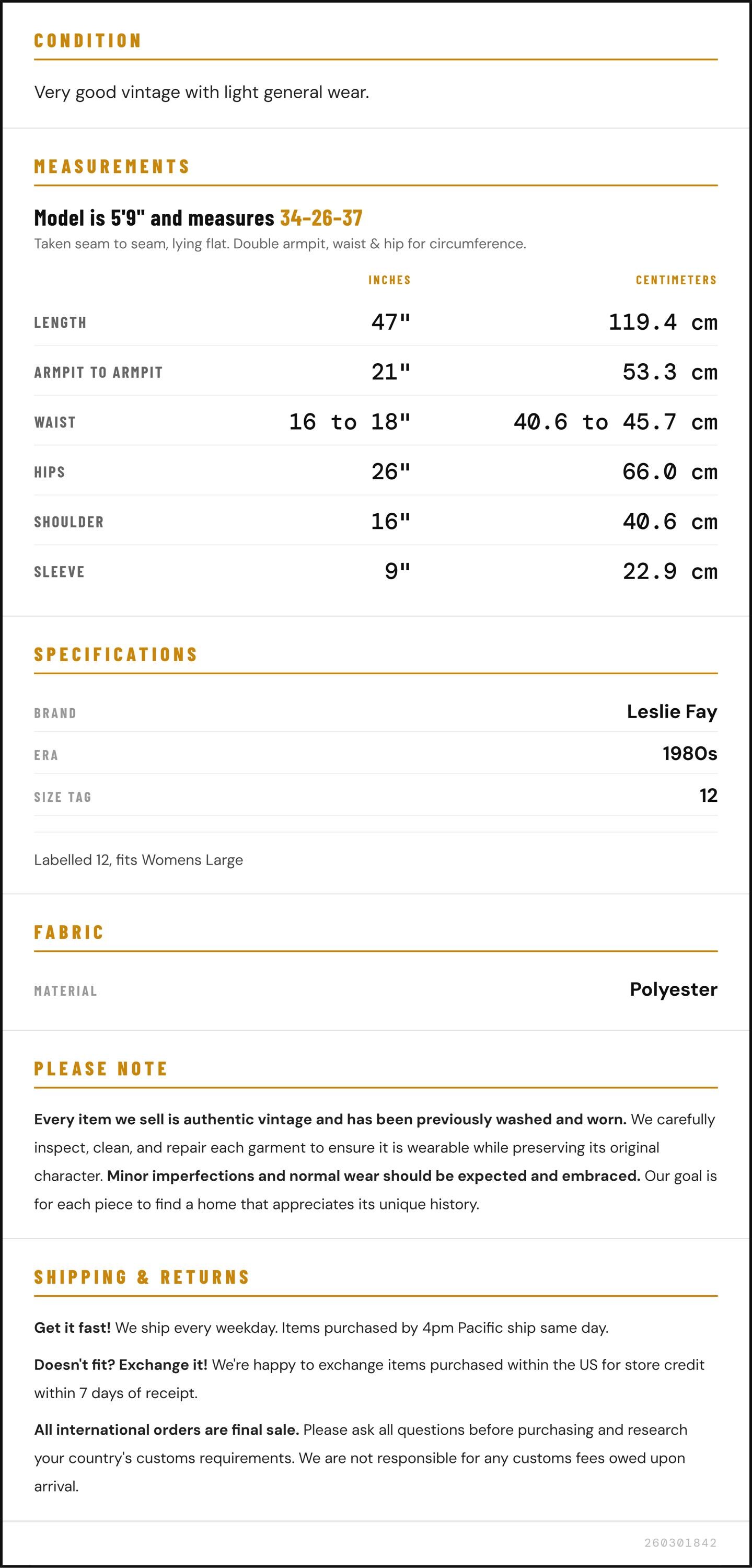 Measurements are taken laying flat and should be doubled where applicable. The "best fits" size is just an estimate, and vintage sizing can vary from modern sizing. Please use measurements to ensure proper fit. The best thing to do is measure a similar item of your own, and compare. When an item has stretch, we will list the unstretched dimensions with the stretched measurement afterwards.