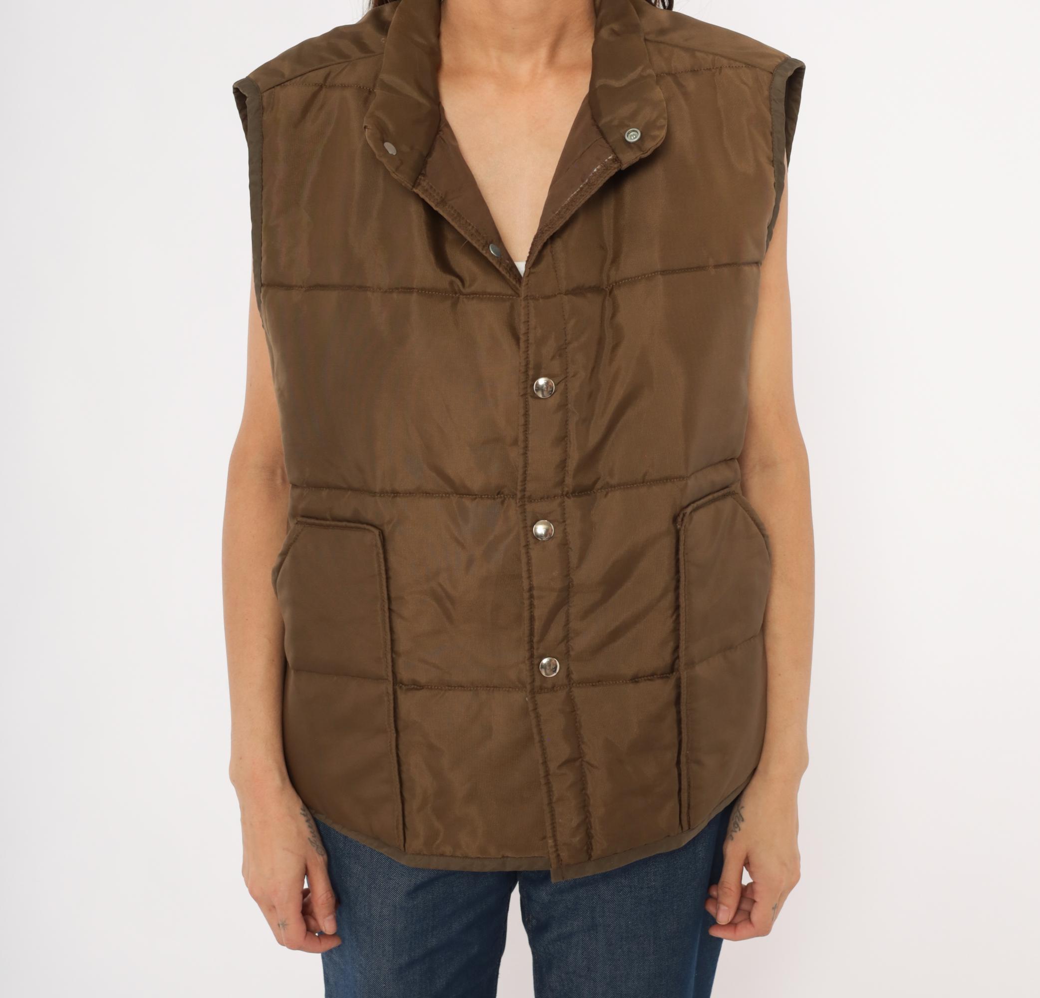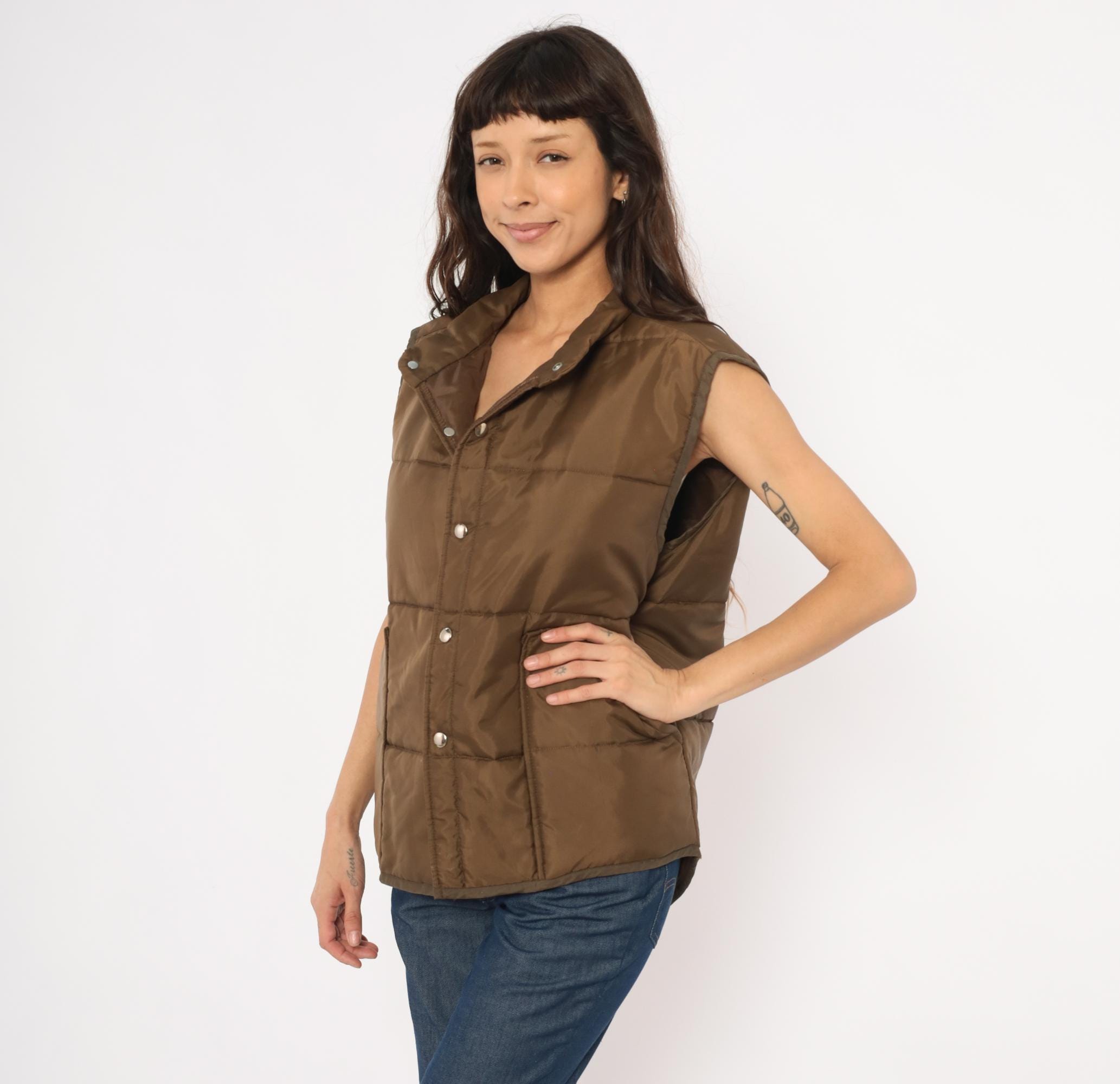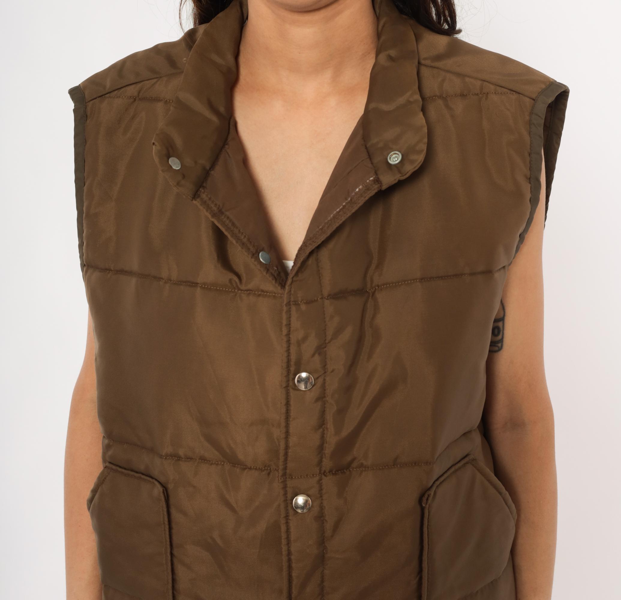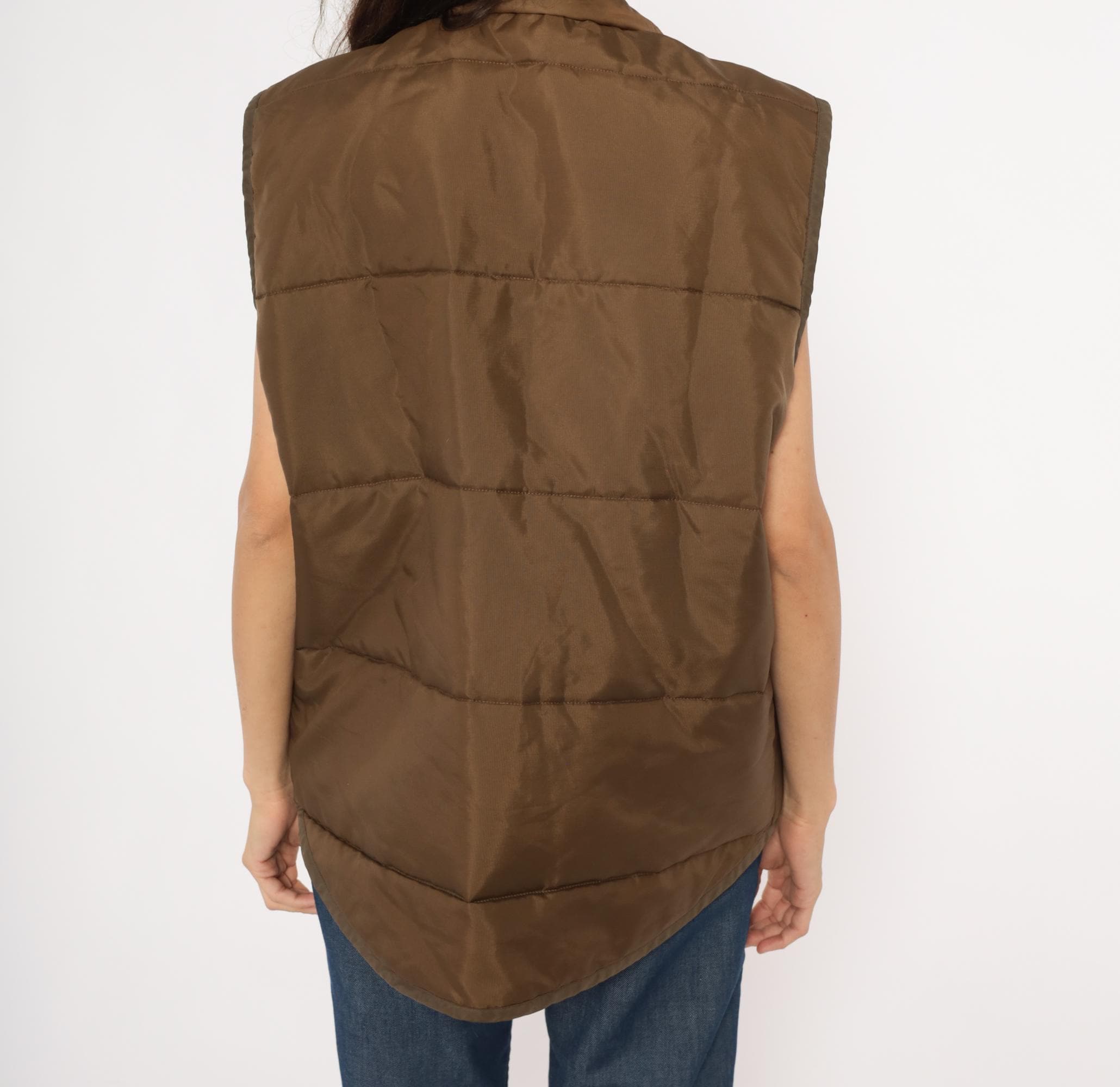 80s brown quilted puffer vest with snap front closure and fold-down pointed collar. Horizontal baffled quilting across the body, two slanted waist pockets, and a curved shirttail hem. Sleeveless with bound armholes and collar snaps at the neckline.