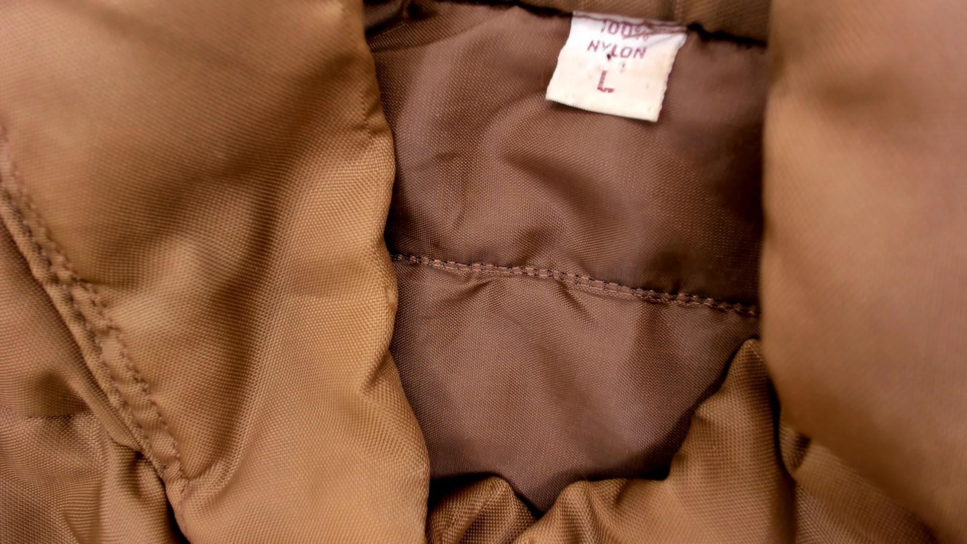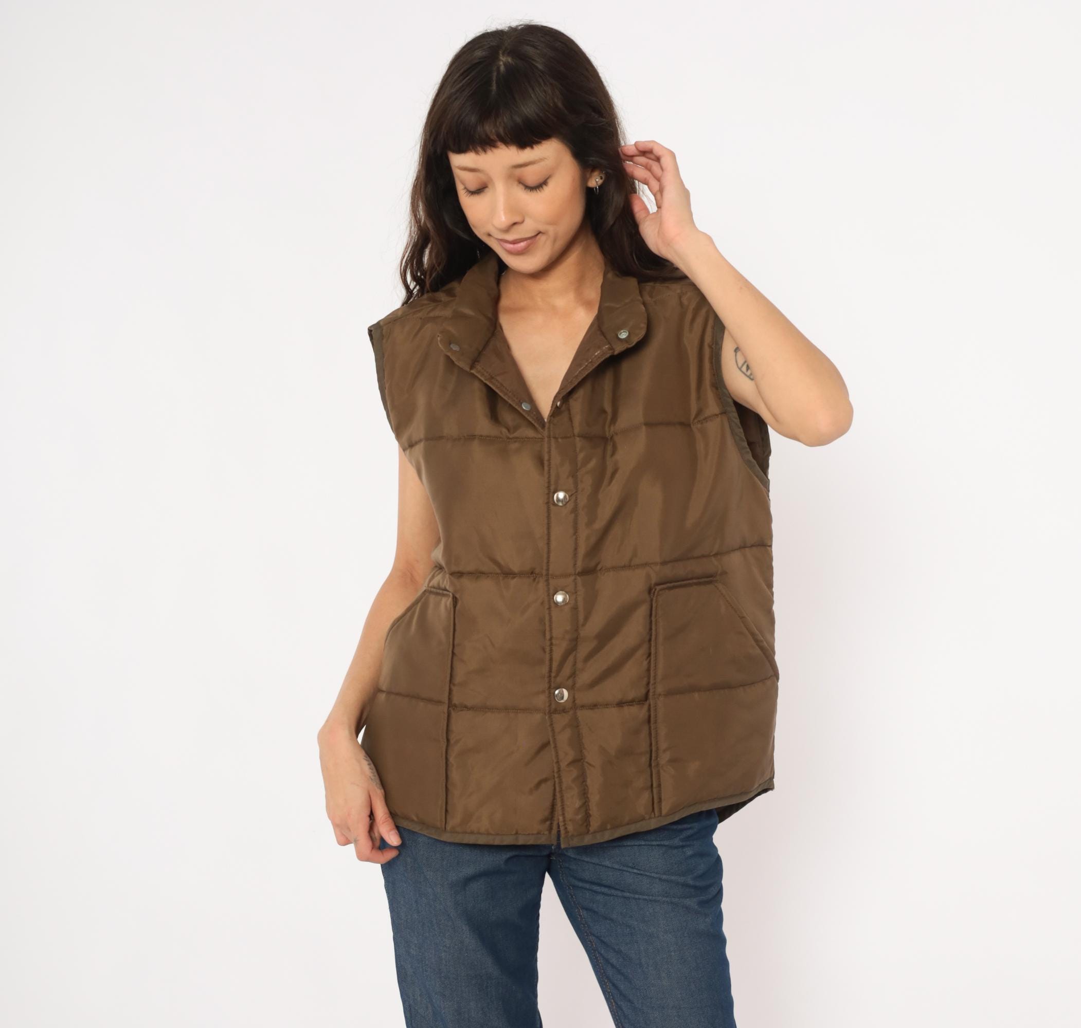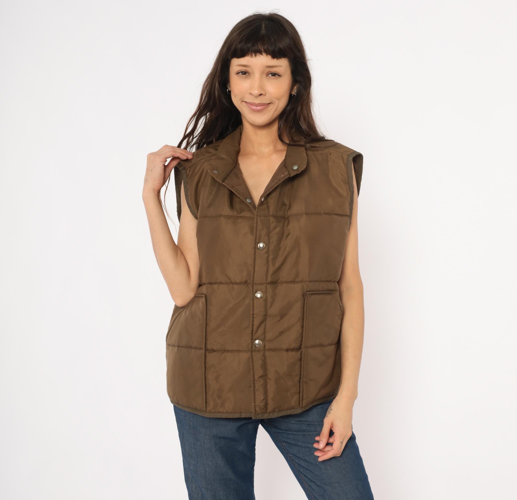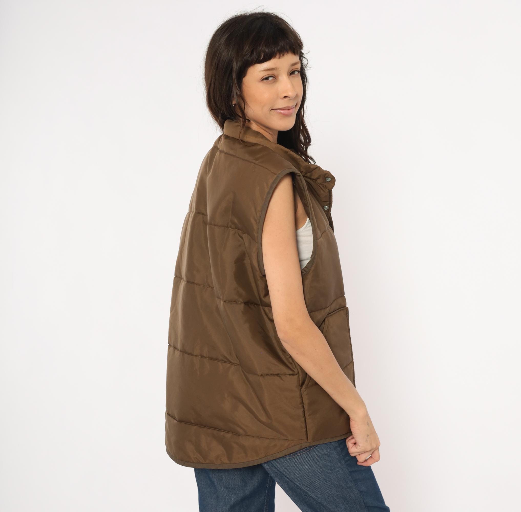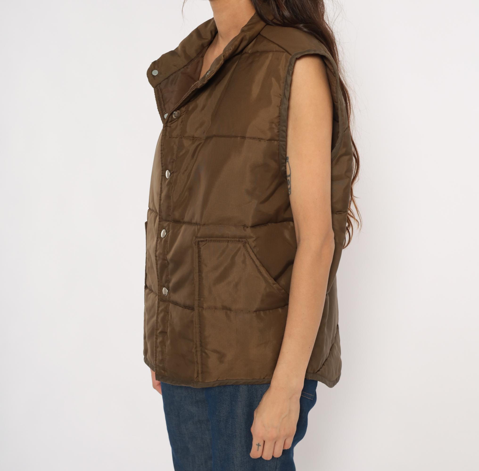 80s brown quilted puffer vest with snap front closure and fold-down pointed collar. Horizontal baffled quilting across the body, two slanted waist pockets, and a curved shirttail hem. Sleeveless with bound armholes and collar snaps at the neckline.