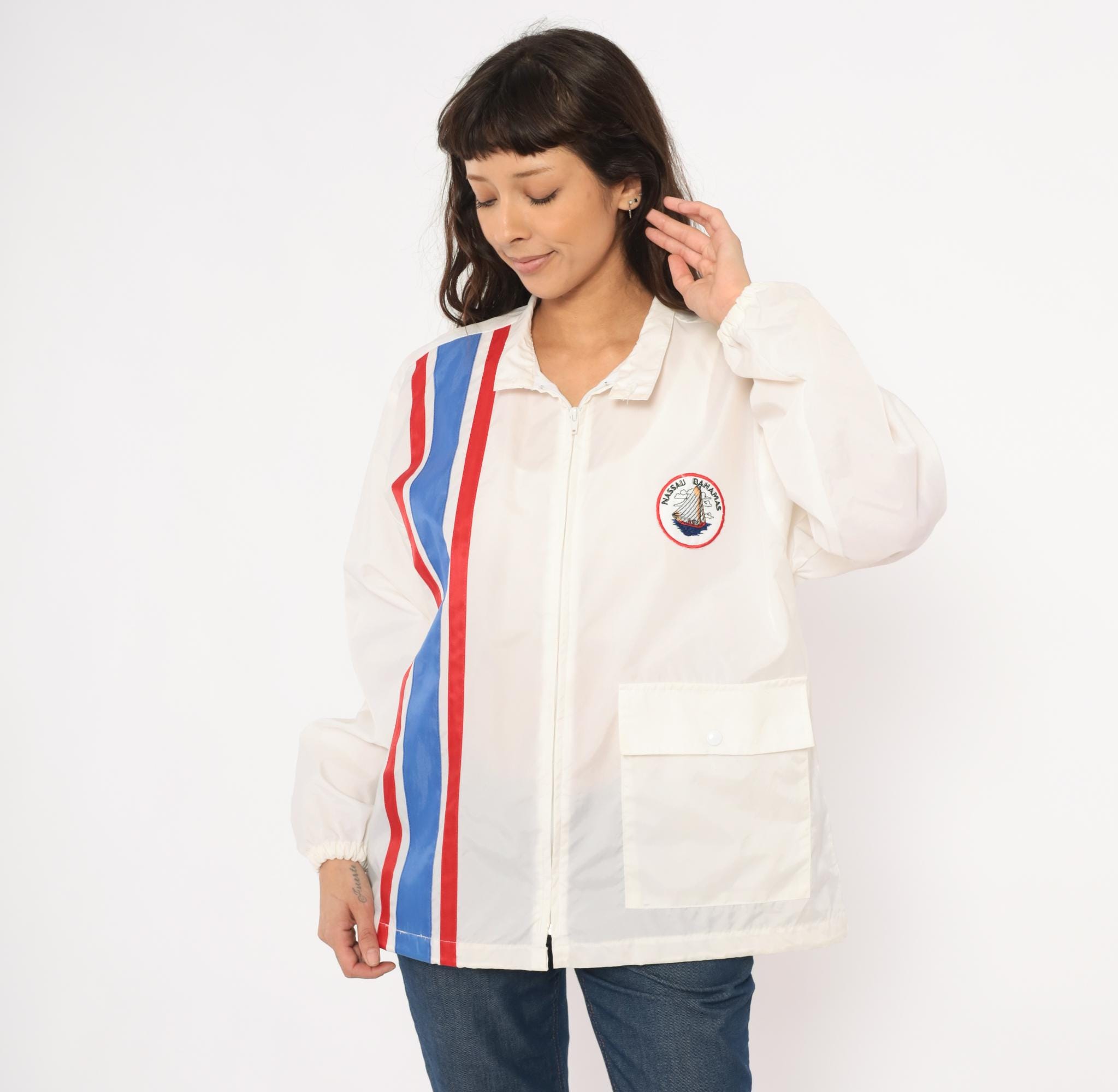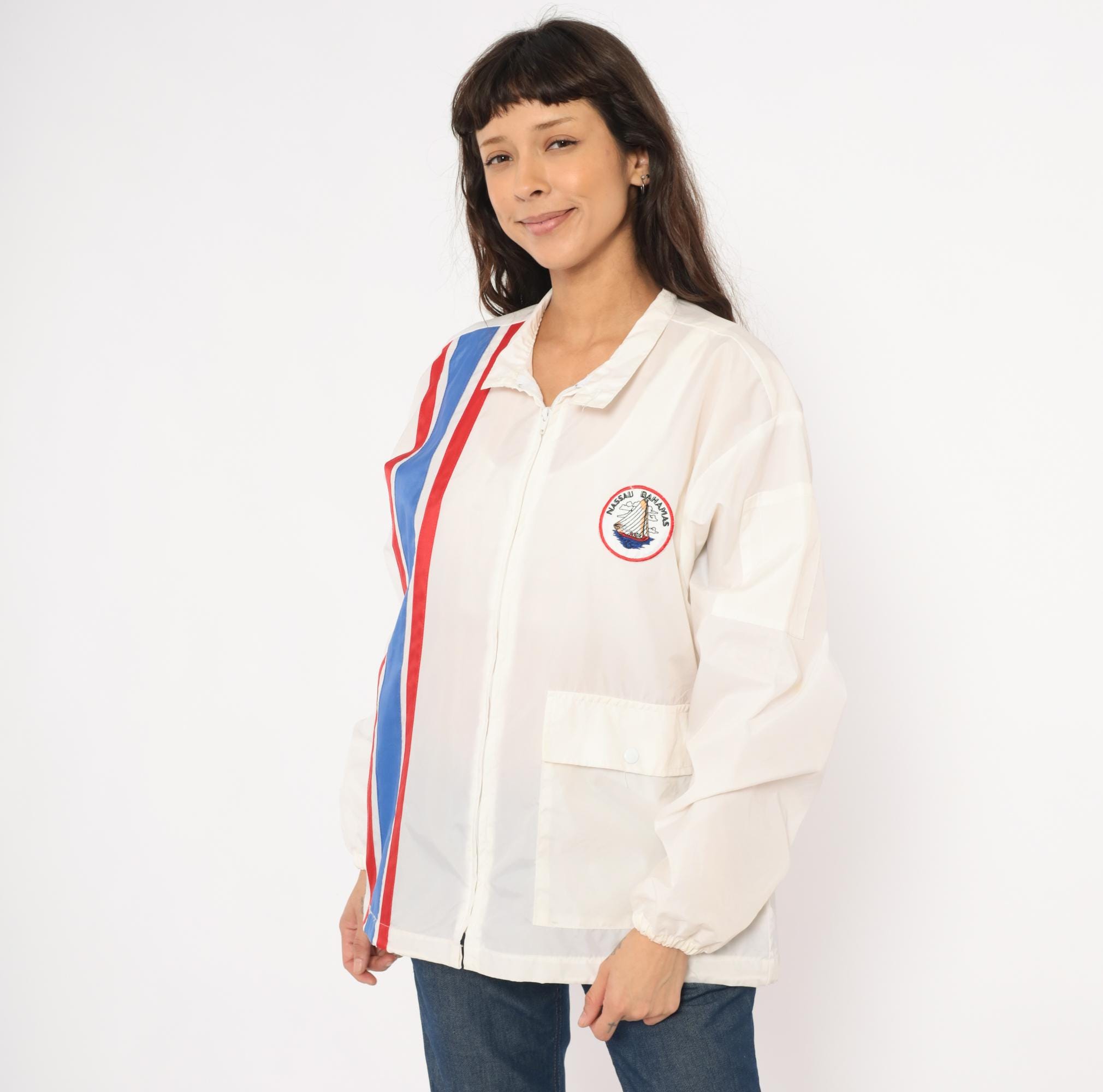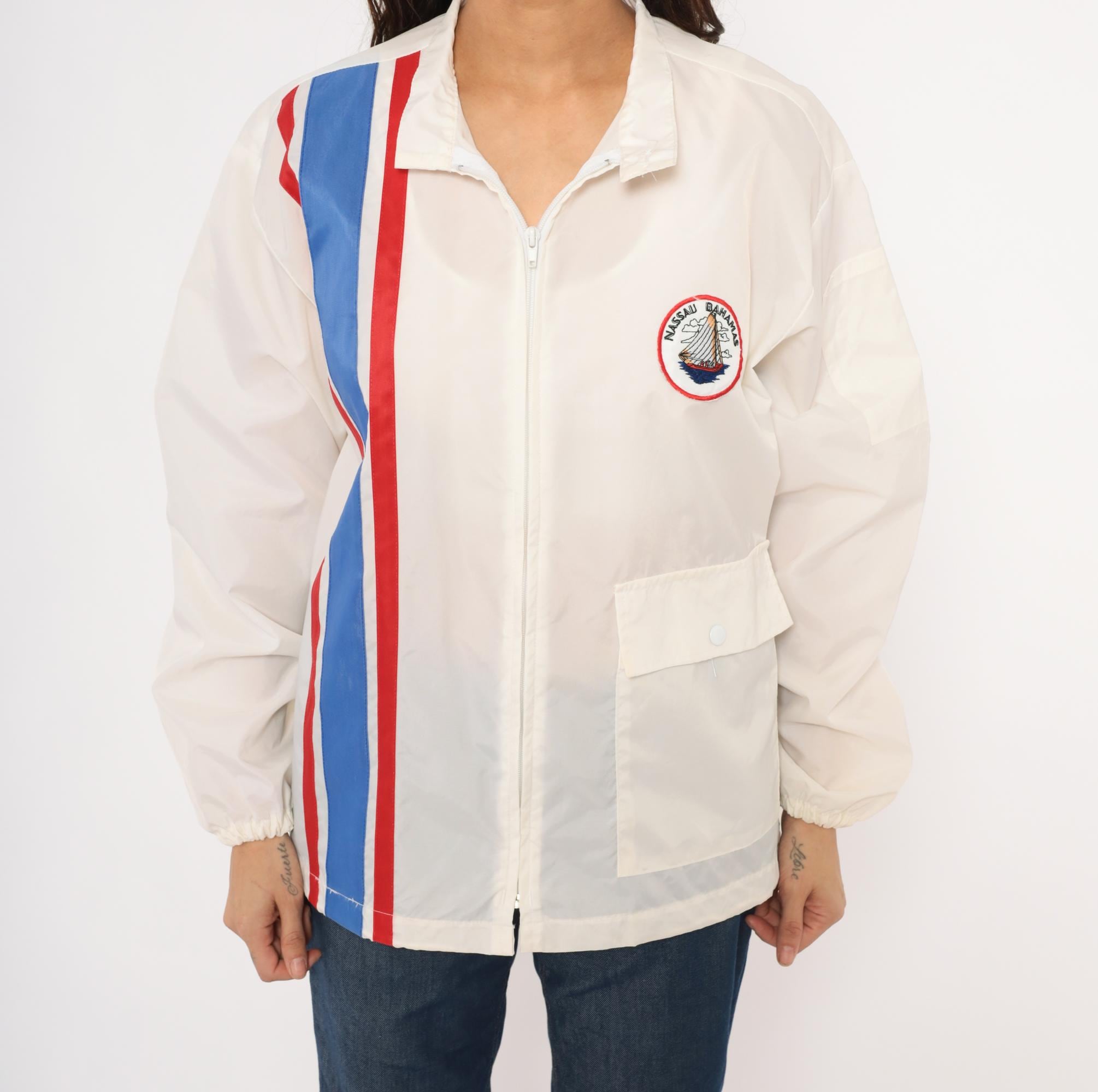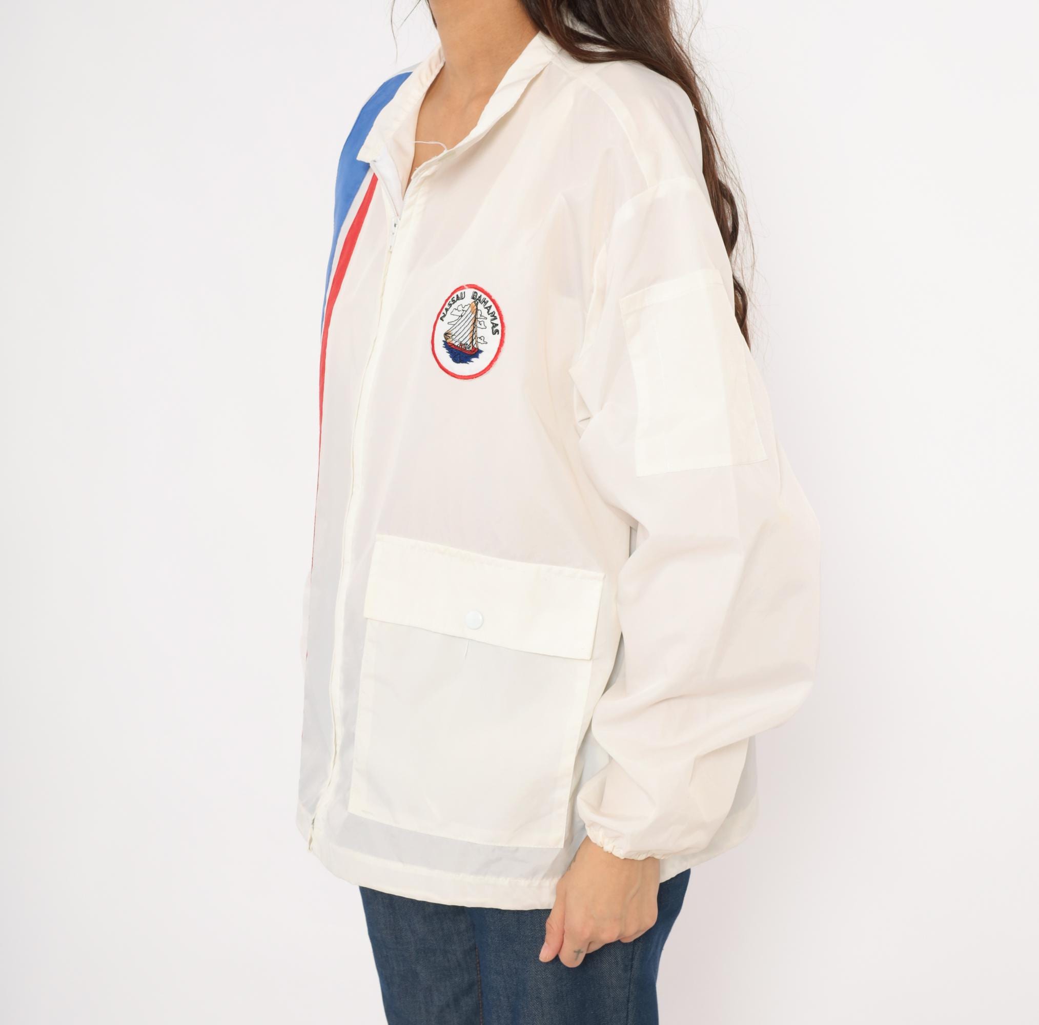 80s white windbreaker from Club Nautique with a zip front closure and fold-down collar. An embroidered "Nassau Bahamas" sailboat patch sits on the left chest, with blue and red diagonal racing stripes running from the right shoulder down the front. Front snap-flap patch pocket on the lower left, additional sleeve pocket on the upper left arm, and elastic cuffs at both wrists.