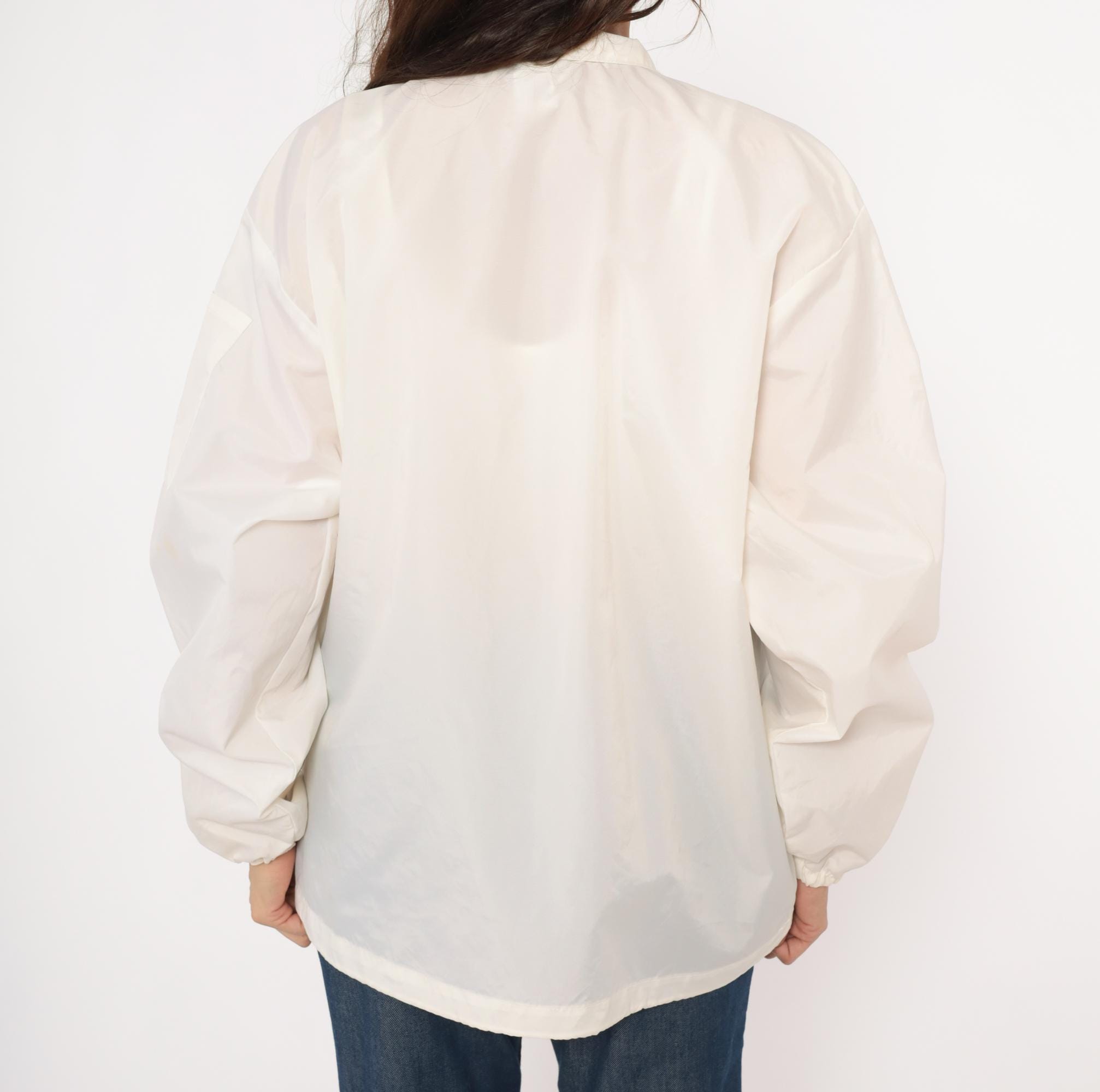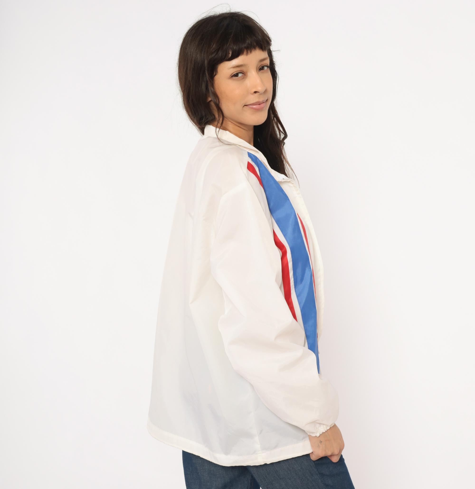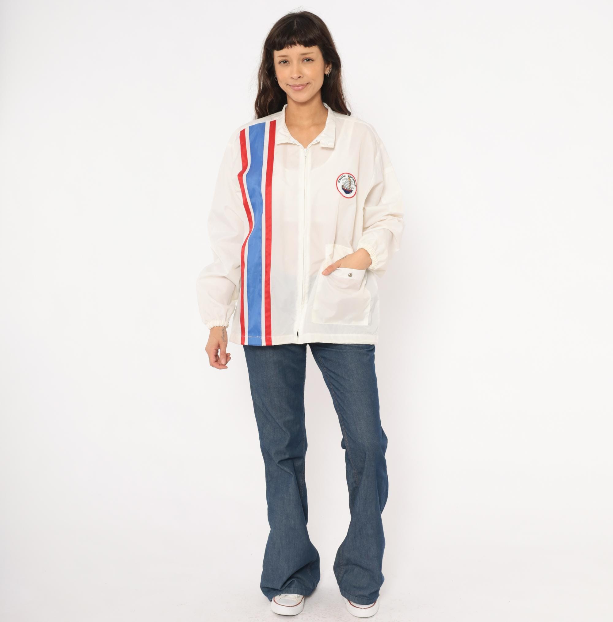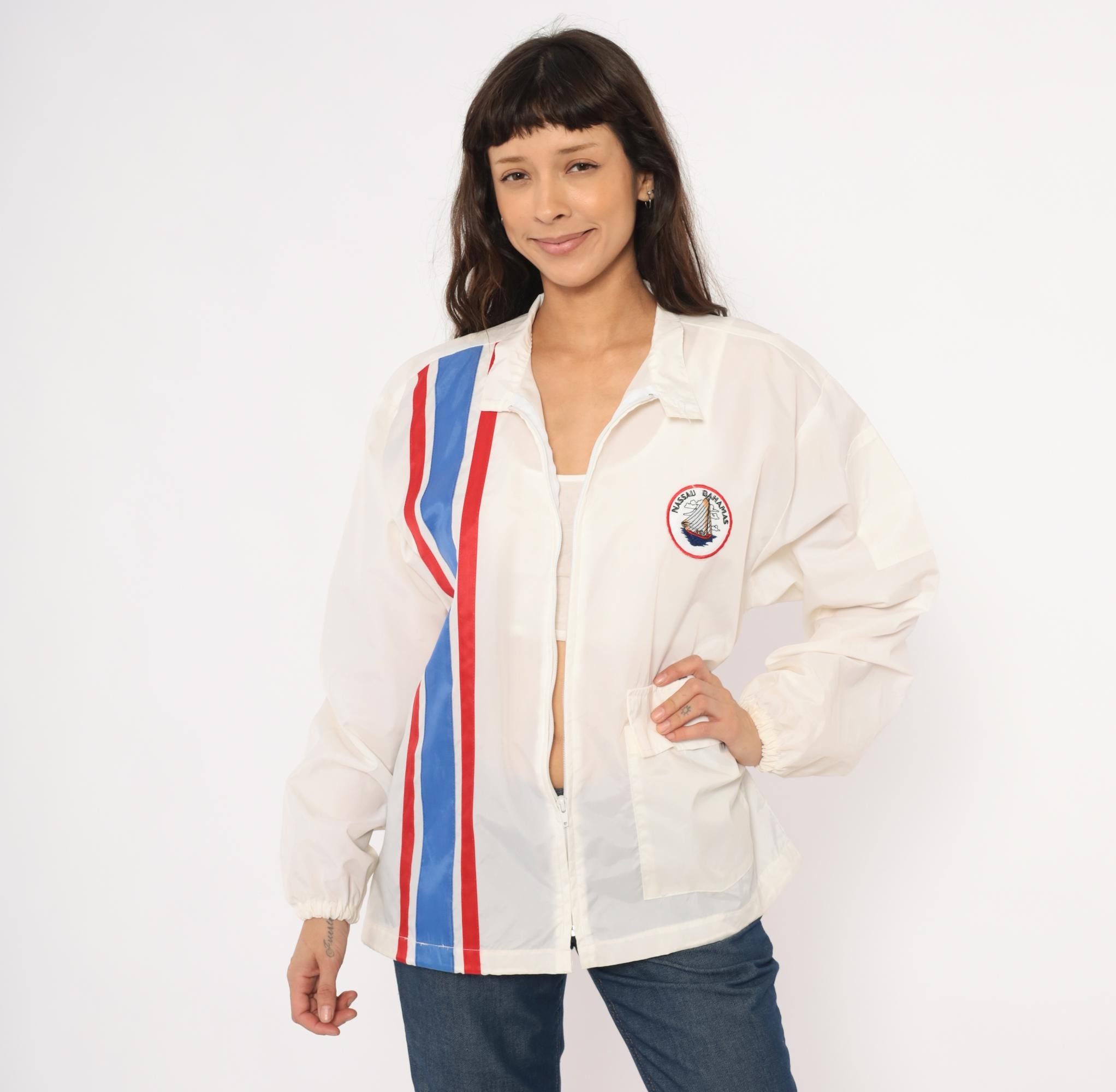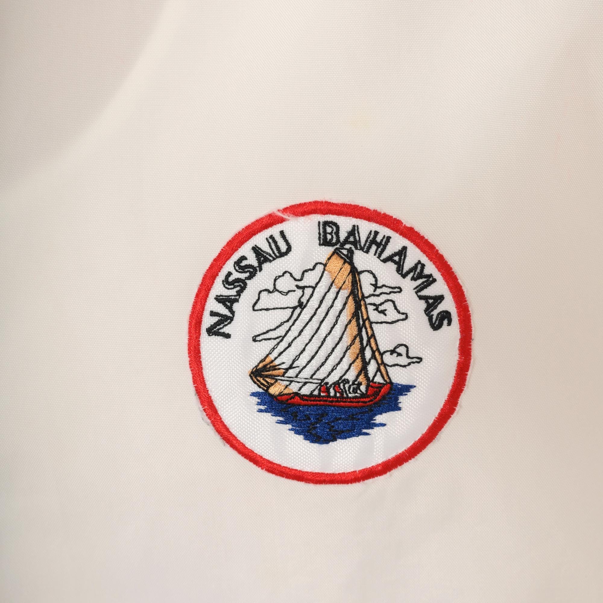 80s white windbreaker from Club Nautique with a zip front closure and fold-down collar. An embroidered "Nassau Bahamas" sailboat patch sits on the left chest, with blue and red diagonal racing stripes running from the right shoulder down the front. Front snap-flap patch pocket on the lower left, additional sleeve pocket on the upper left arm, and elastic cuffs at both wrists.