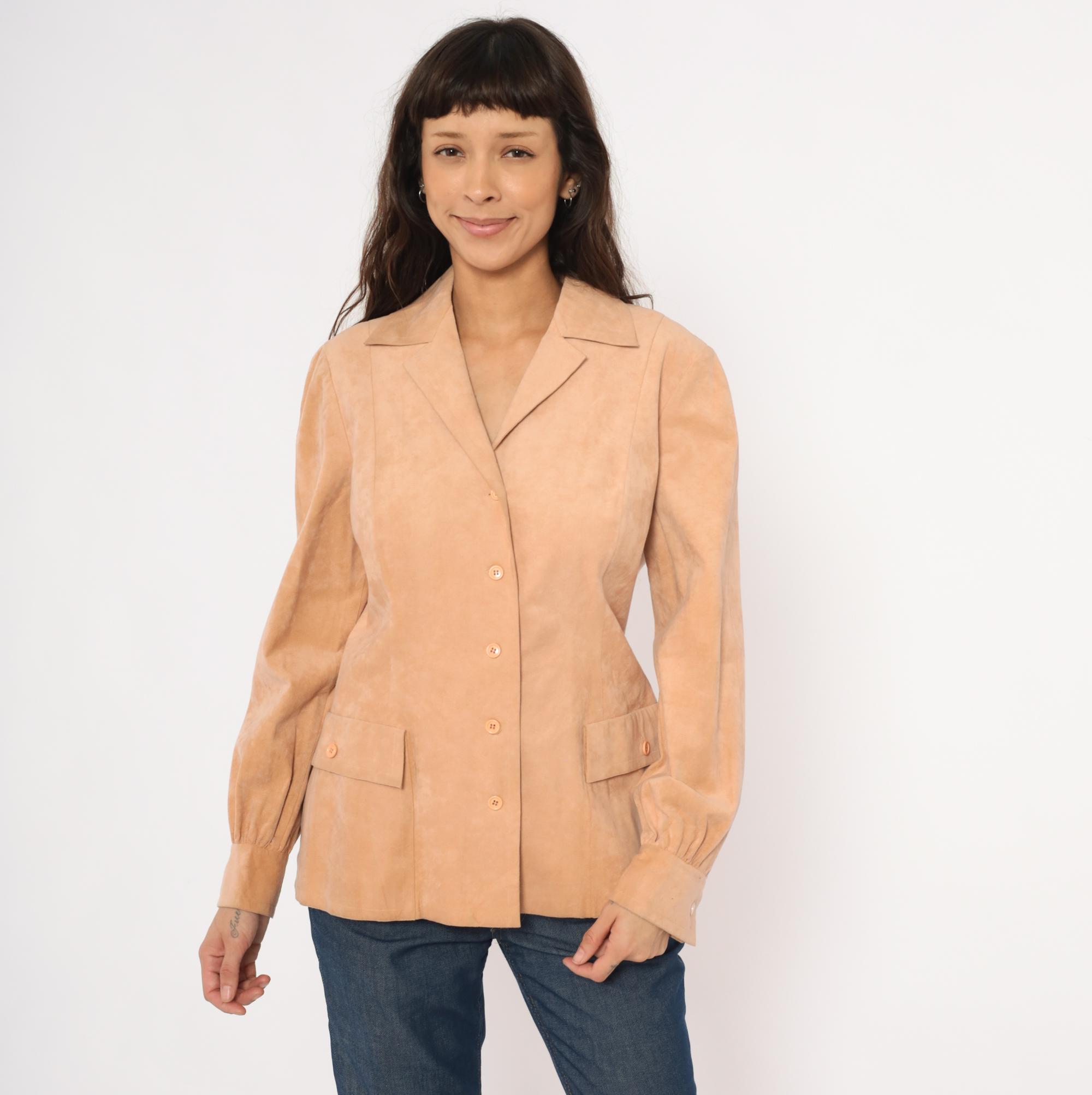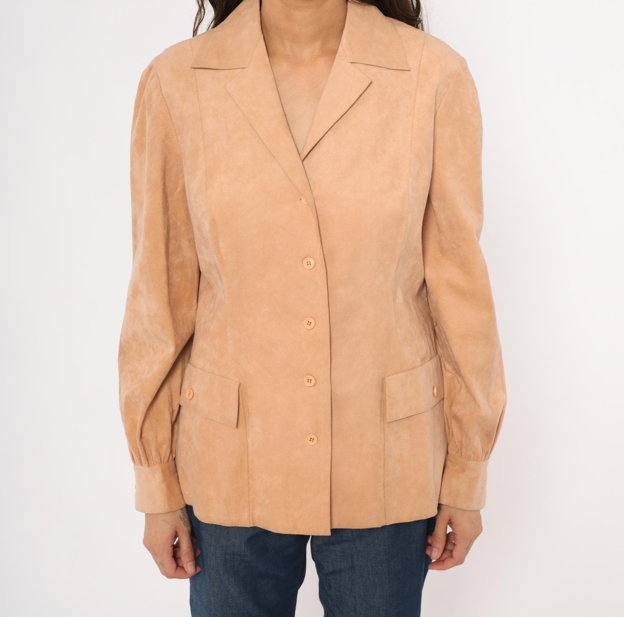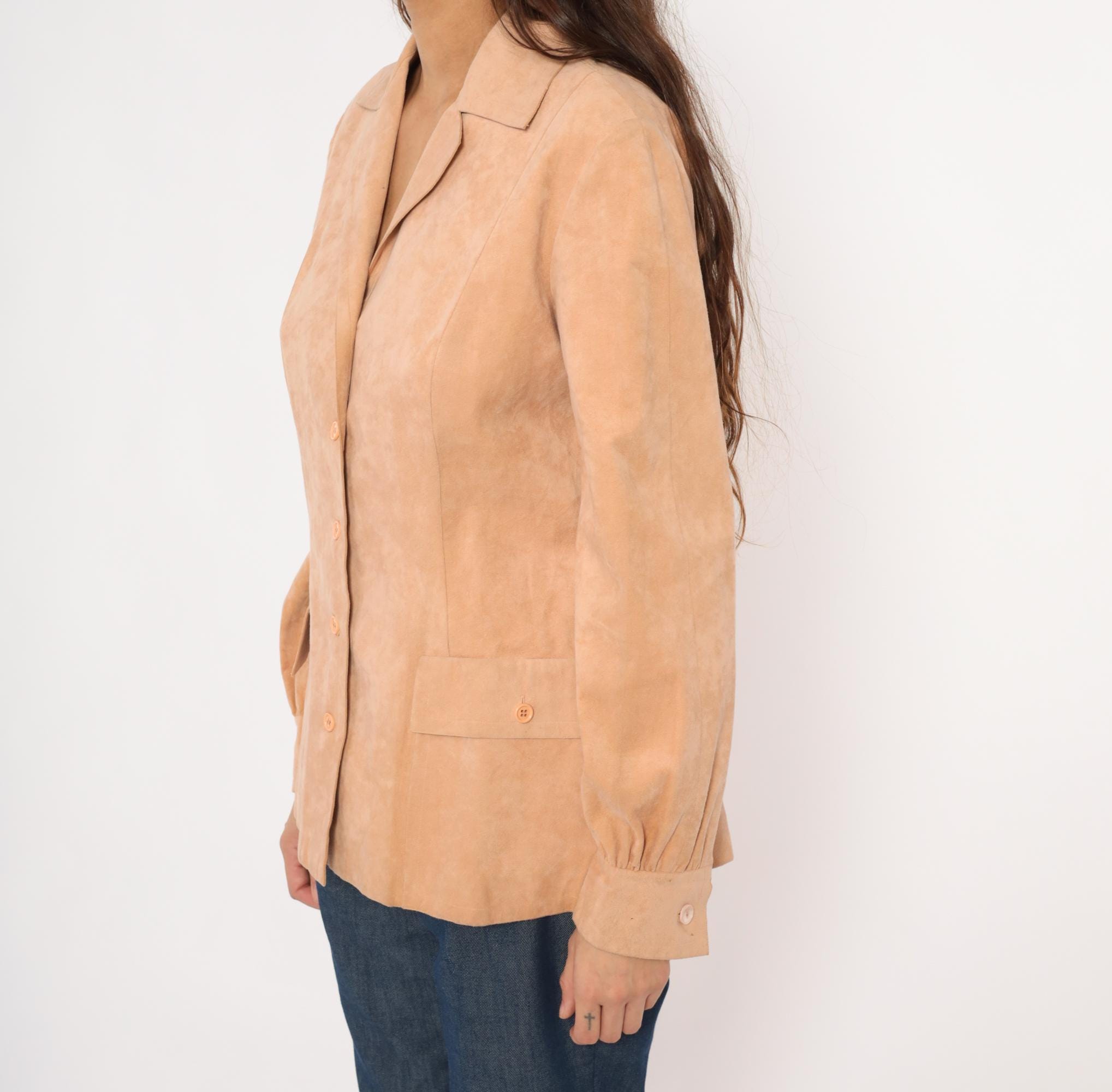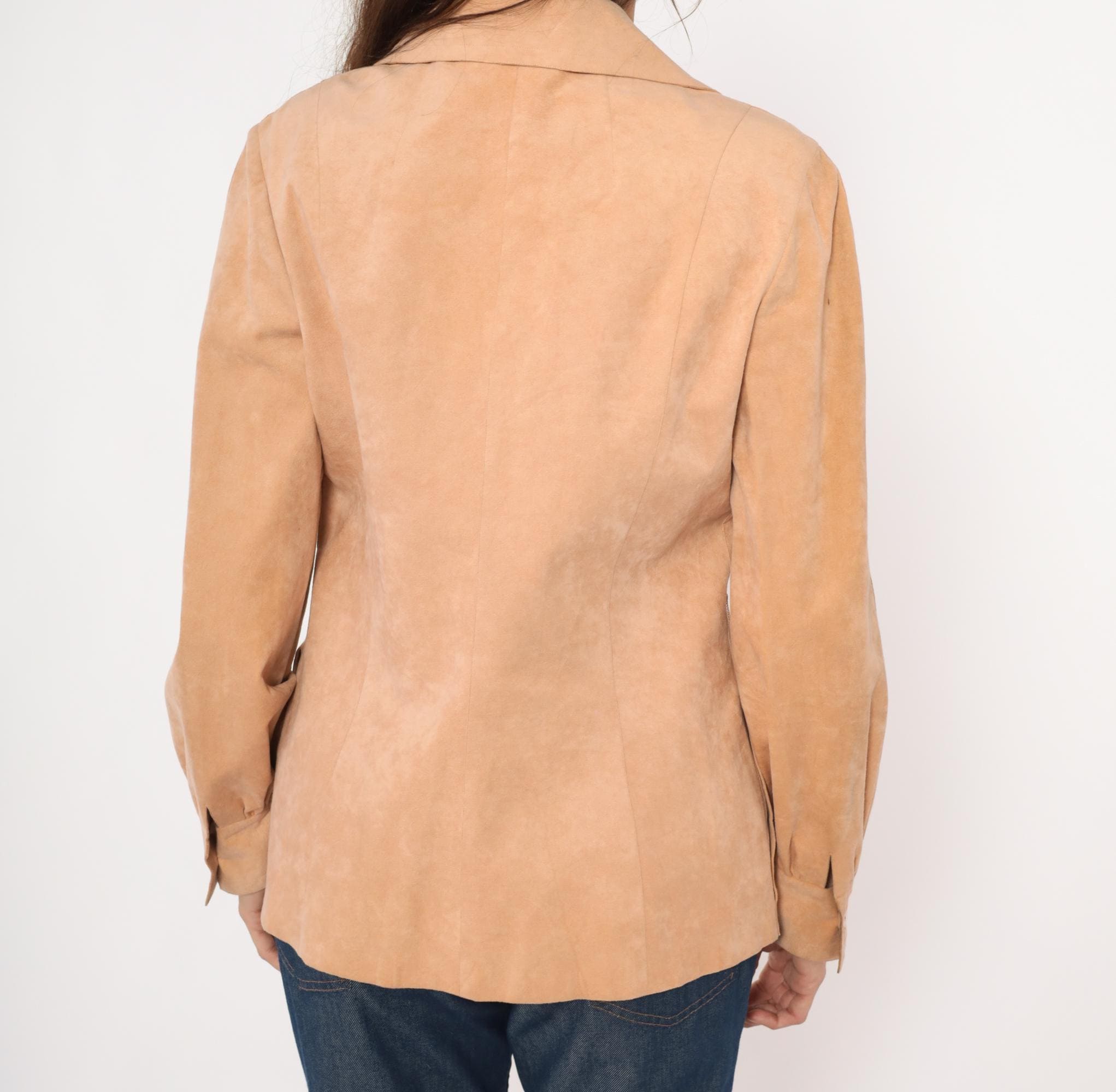 80s tan suede blazer from Mollie Parnis with notched lapel collar and four-button front closure. Long sleeves with gathered detail at the wrists and buttoned cuffs. Two front patch pockets with button closures sit at the hip, and seamed back panels give a shaped silhouette.