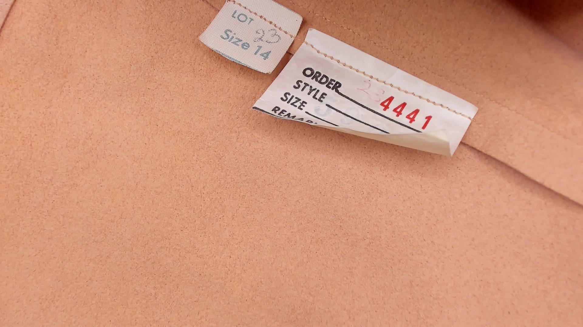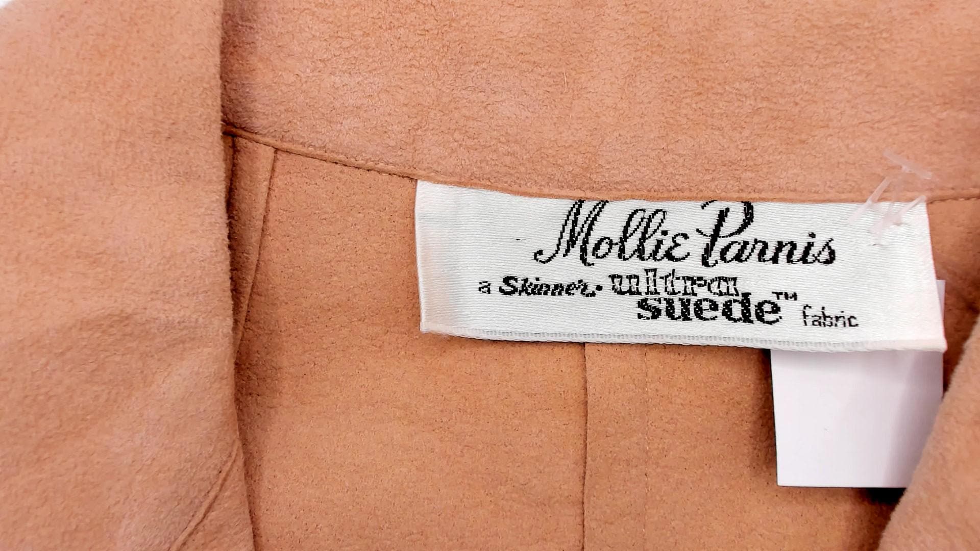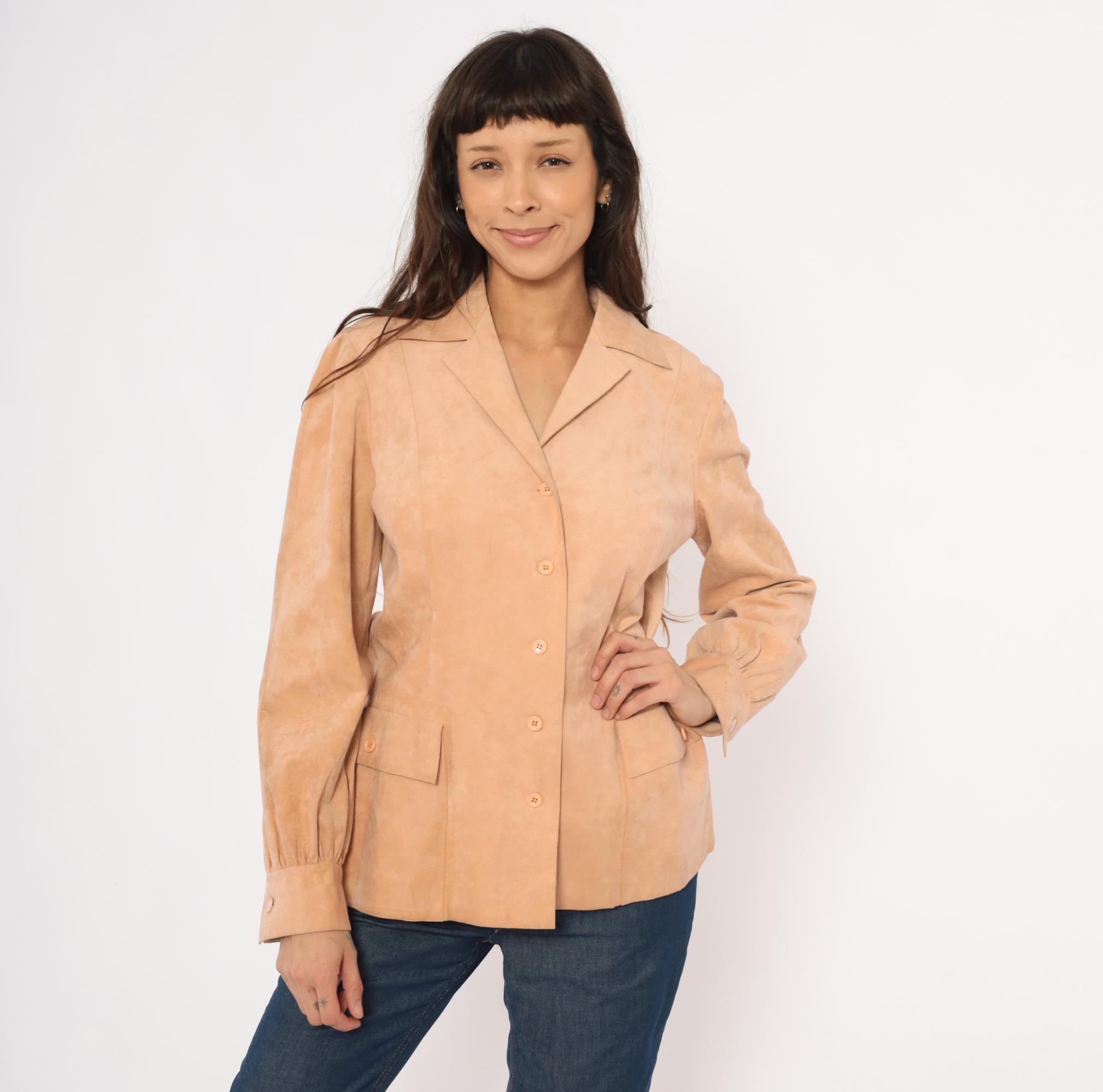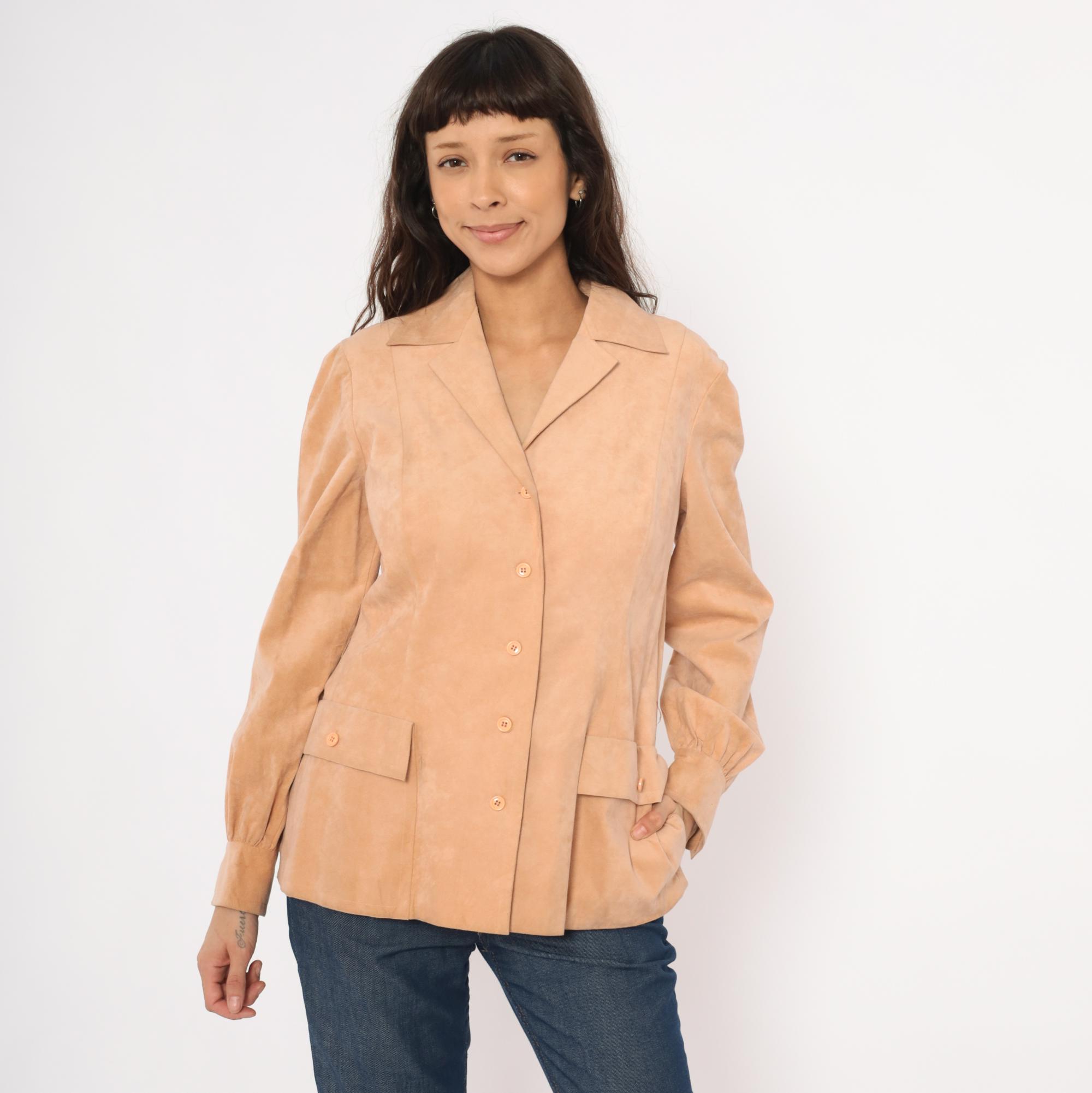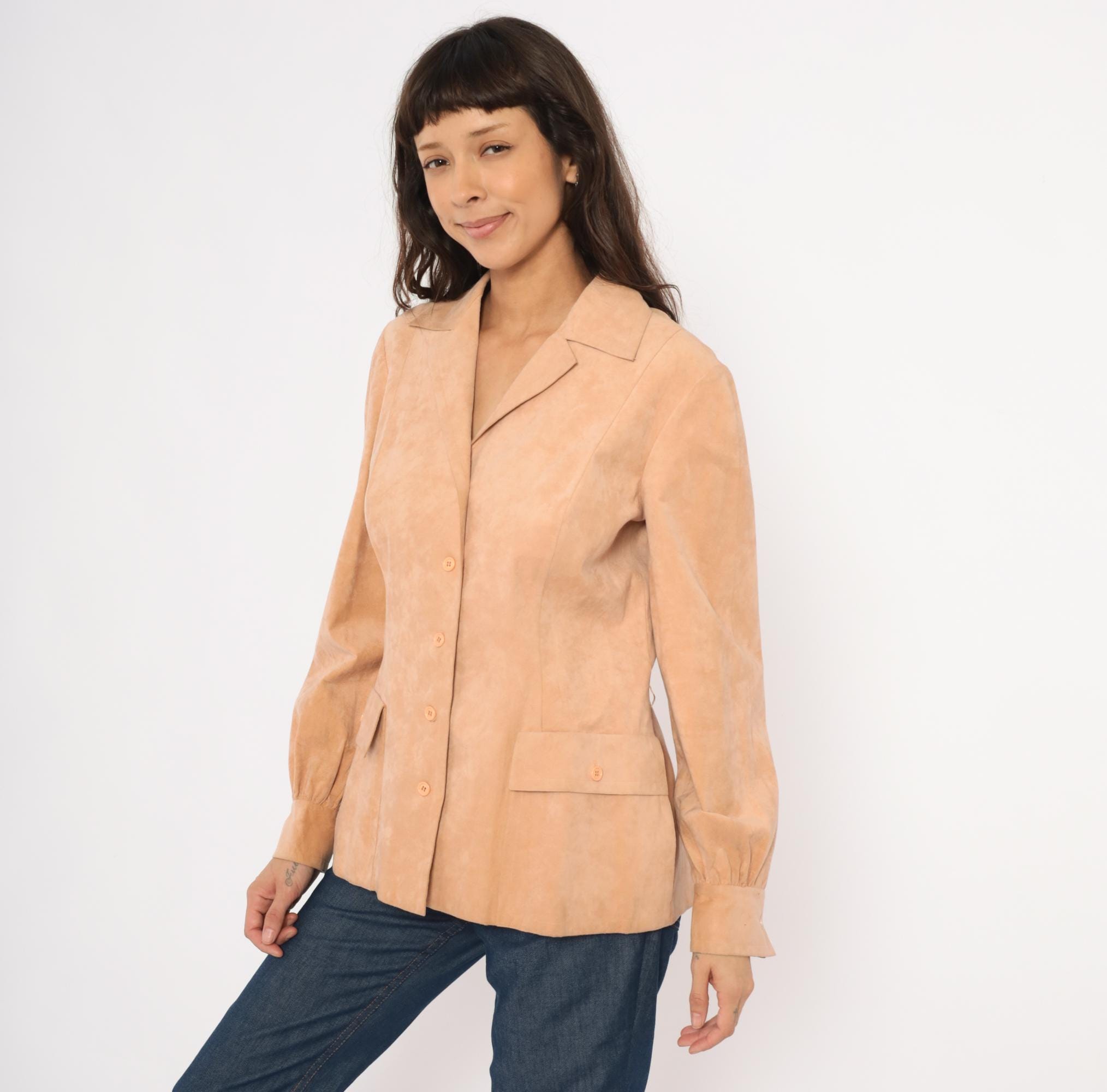 80s tan suede blazer from Mollie Parnis with notched lapel collar and four-button front closure. Long sleeves with gathered detail at the wrists and buttoned cuffs. Two front patch pockets with button closures sit at the hip, and seamed back panels give a shaped silhouette.