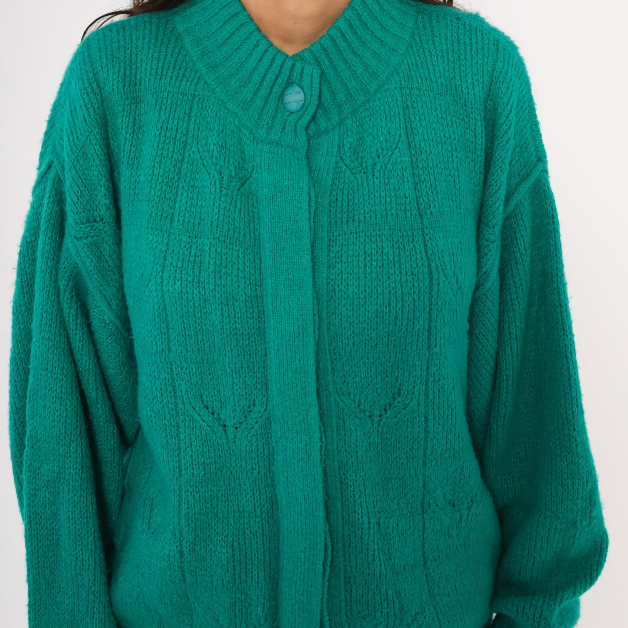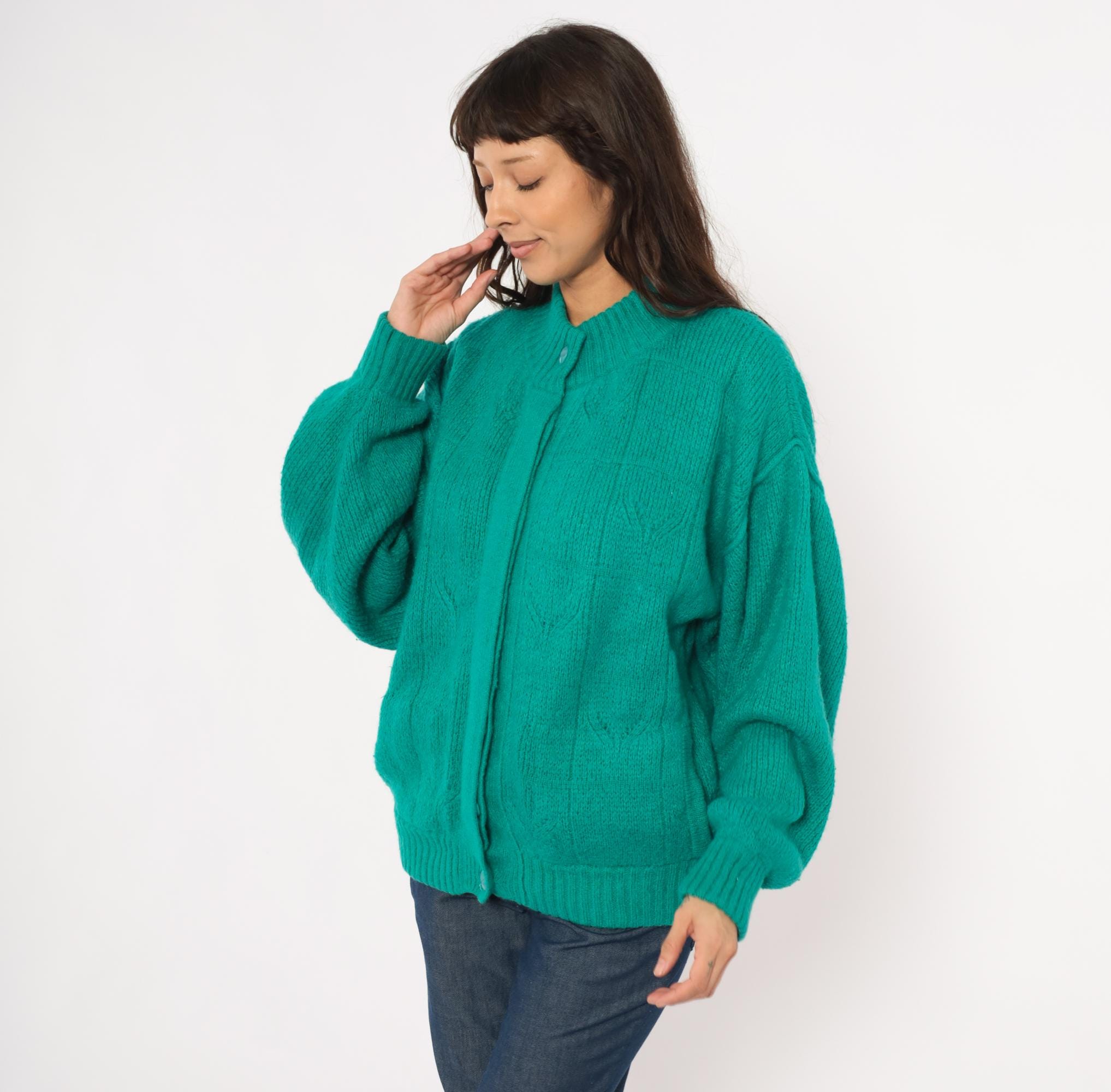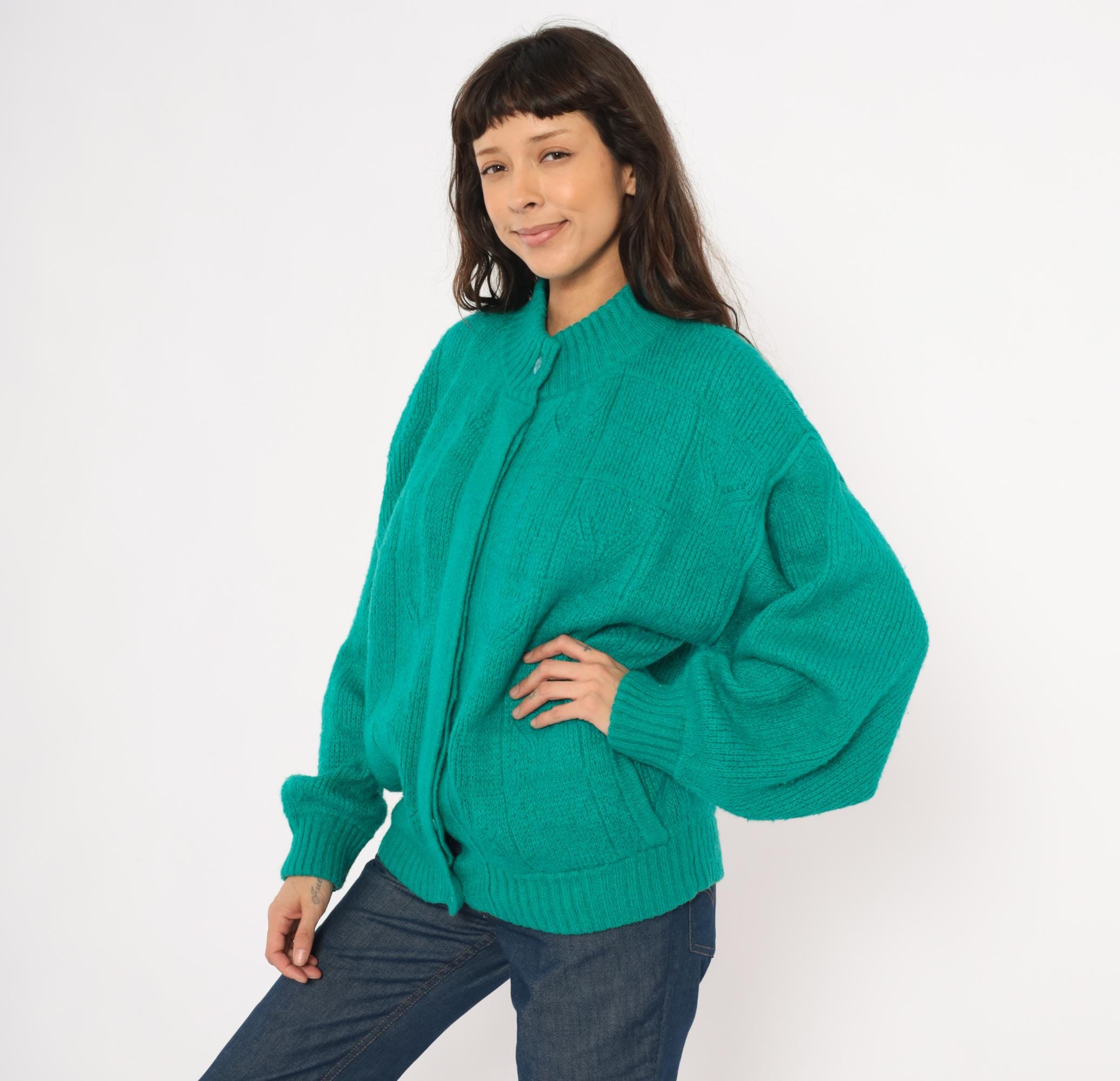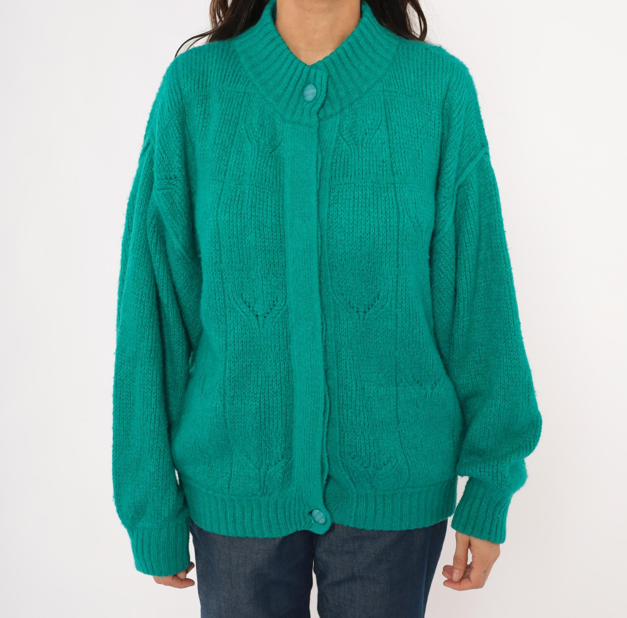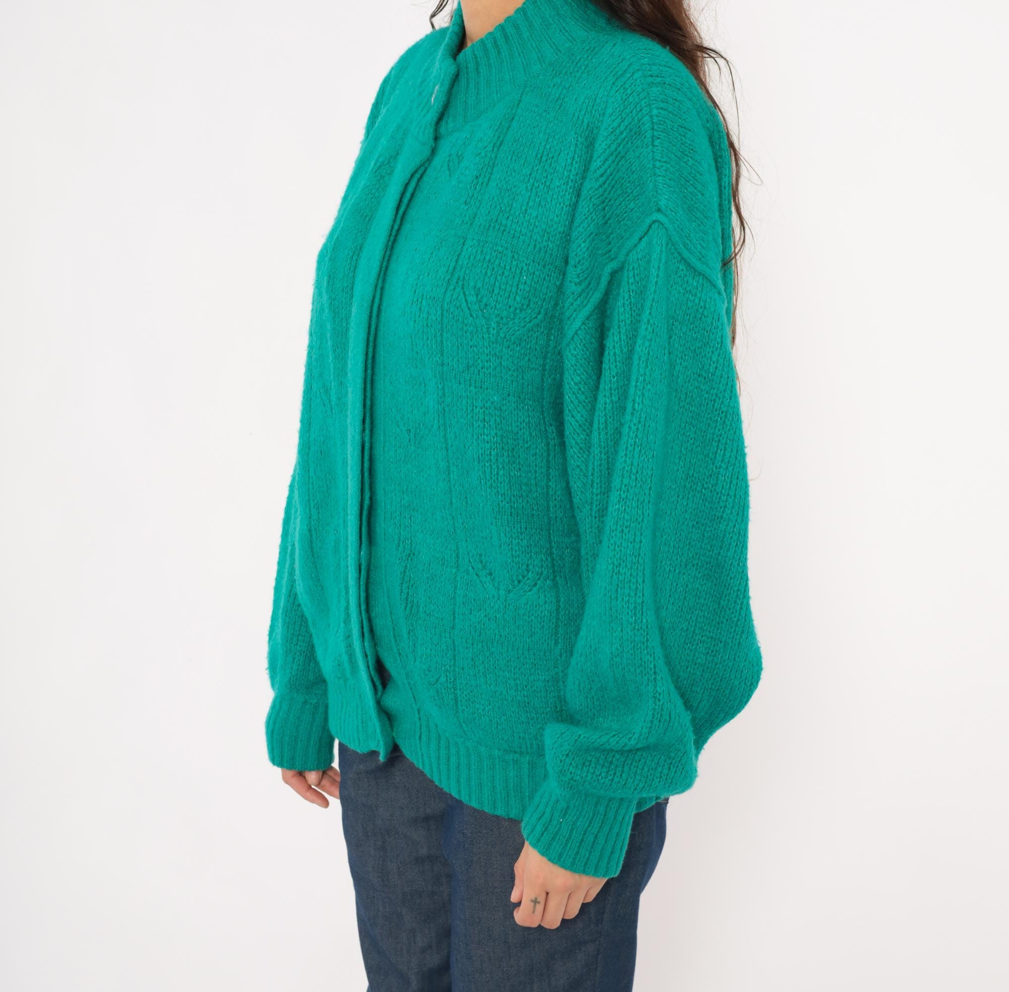 90s teal cardigan from Astri in a mohair-blend knit with a ribbed mock neck collar and ribbed cuffs. Button front closure with two matching teal buttons at the neck and hem, open placket center. Raised leaf and cable knit patterning across the front panels and sleeves, with a simpler stockinette back. Bomber-style silhouette with dropped shoulders, balloon sleeves, and a ribbed waistband hem.