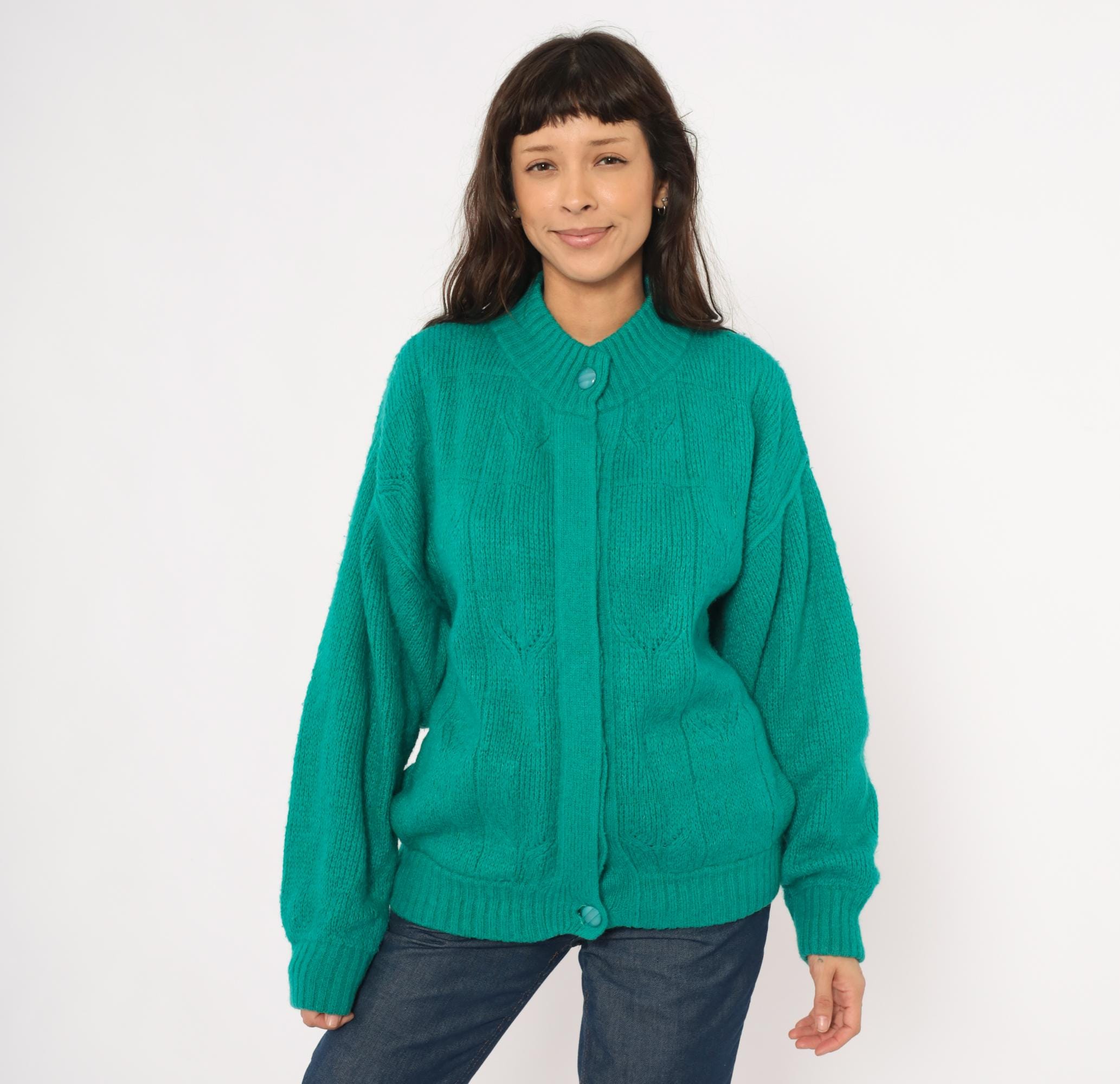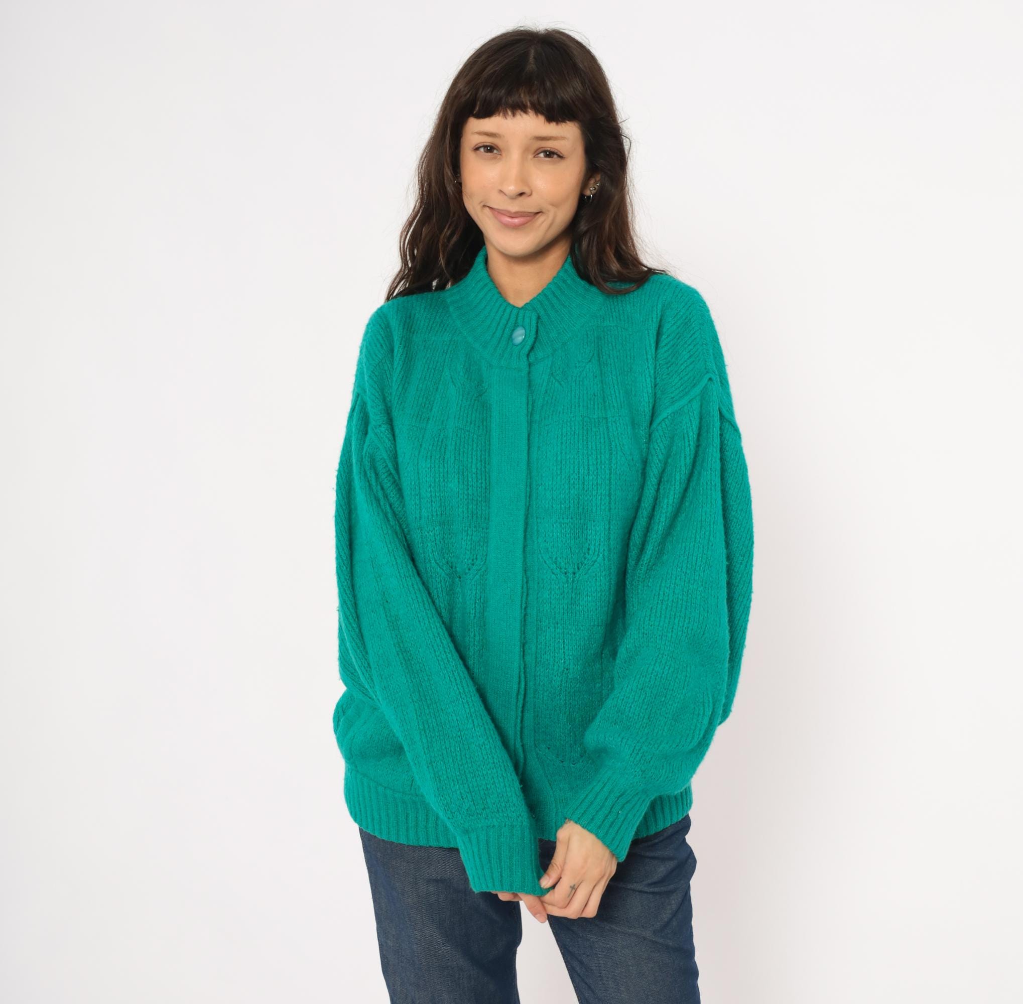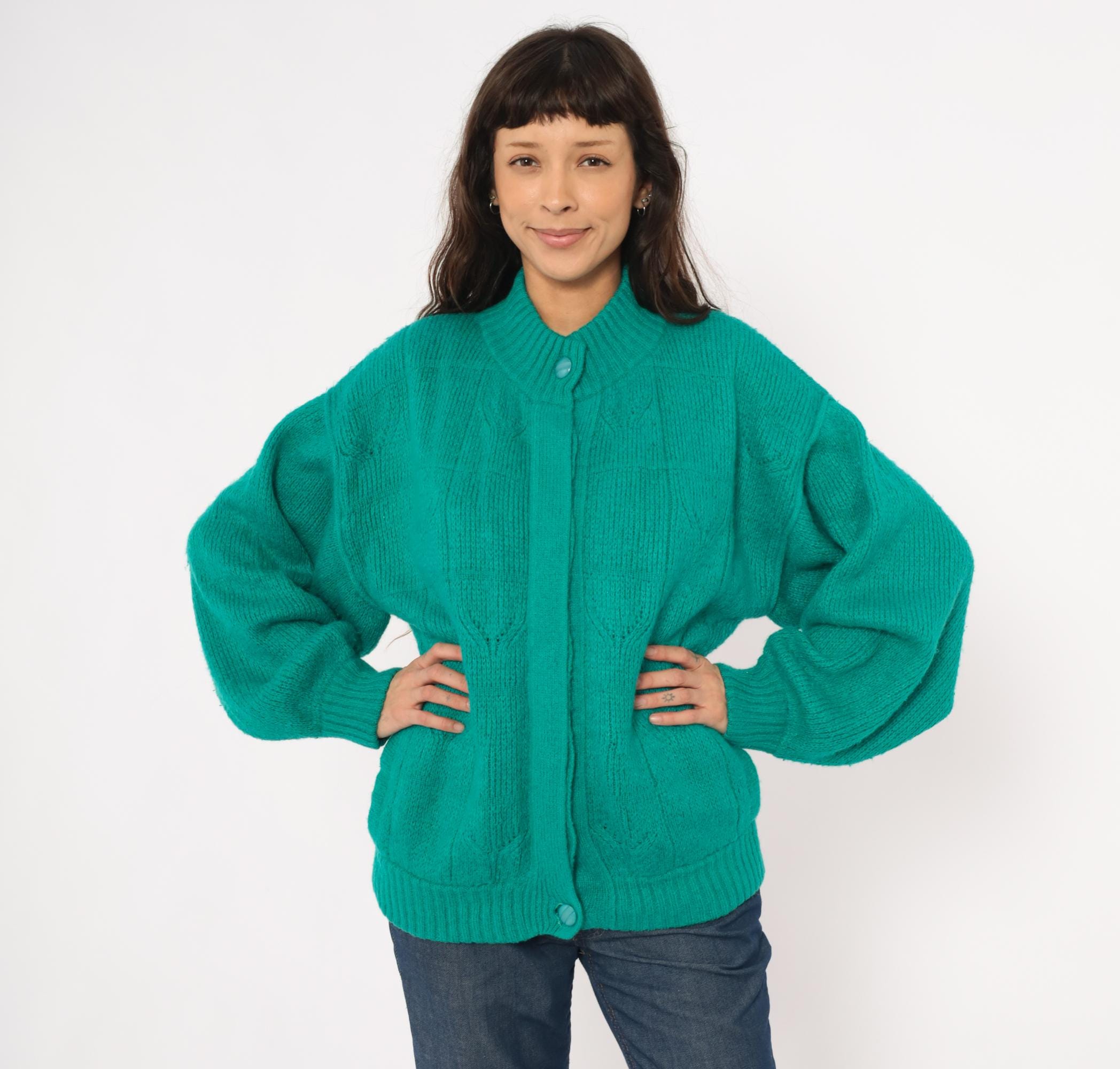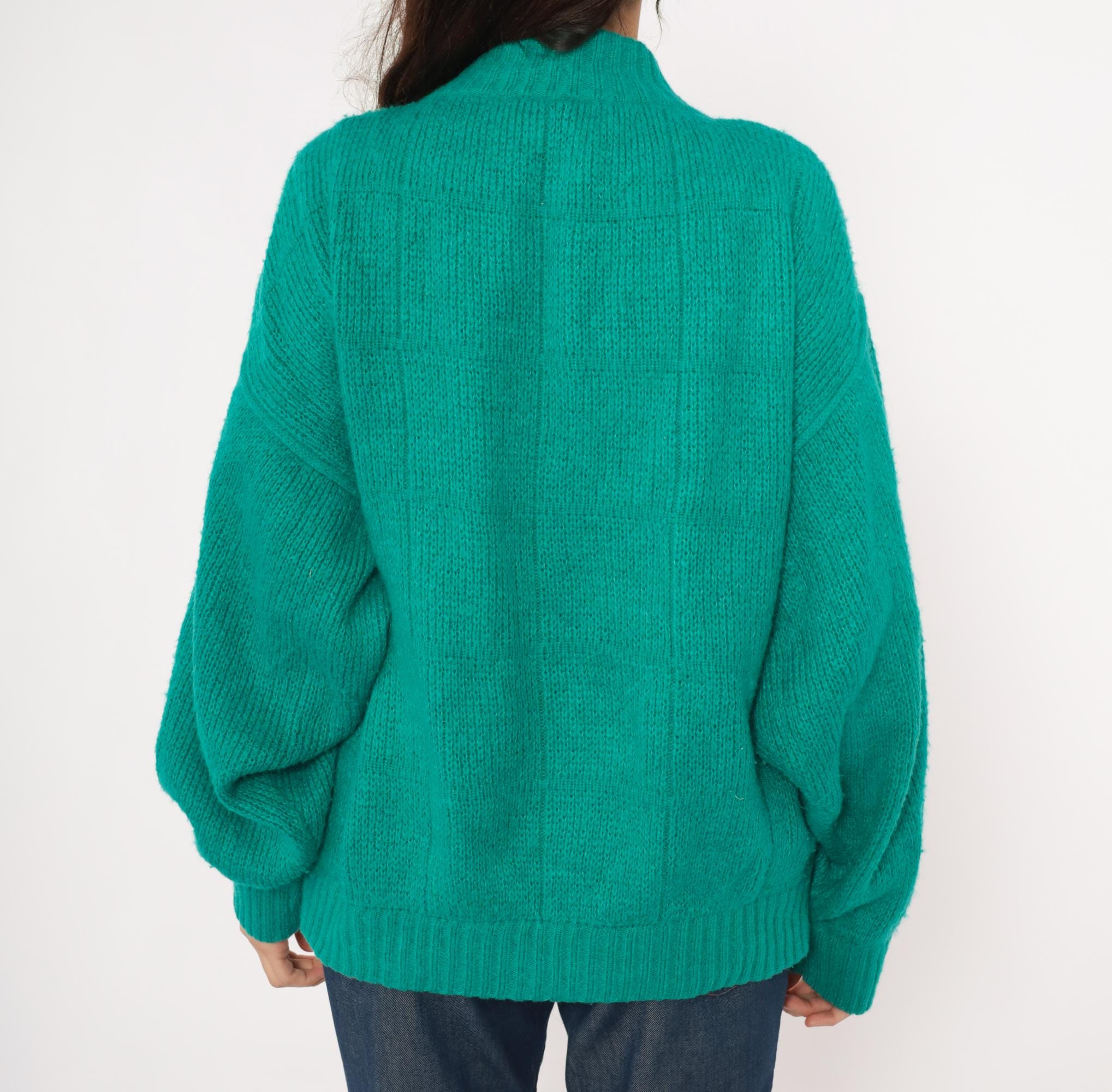 90s teal cardigan from Astri in a mohair-blend knit with a ribbed mock neck collar and ribbed cuffs. Button front closure with two matching teal buttons at the neck and hem, open placket center. Raised leaf and cable knit patterning across the front panels and sleeves, with a simpler stockinette back. Bomber-style silhouette with dropped shoulders, balloon sleeves, and a ribbed waistband hem.
