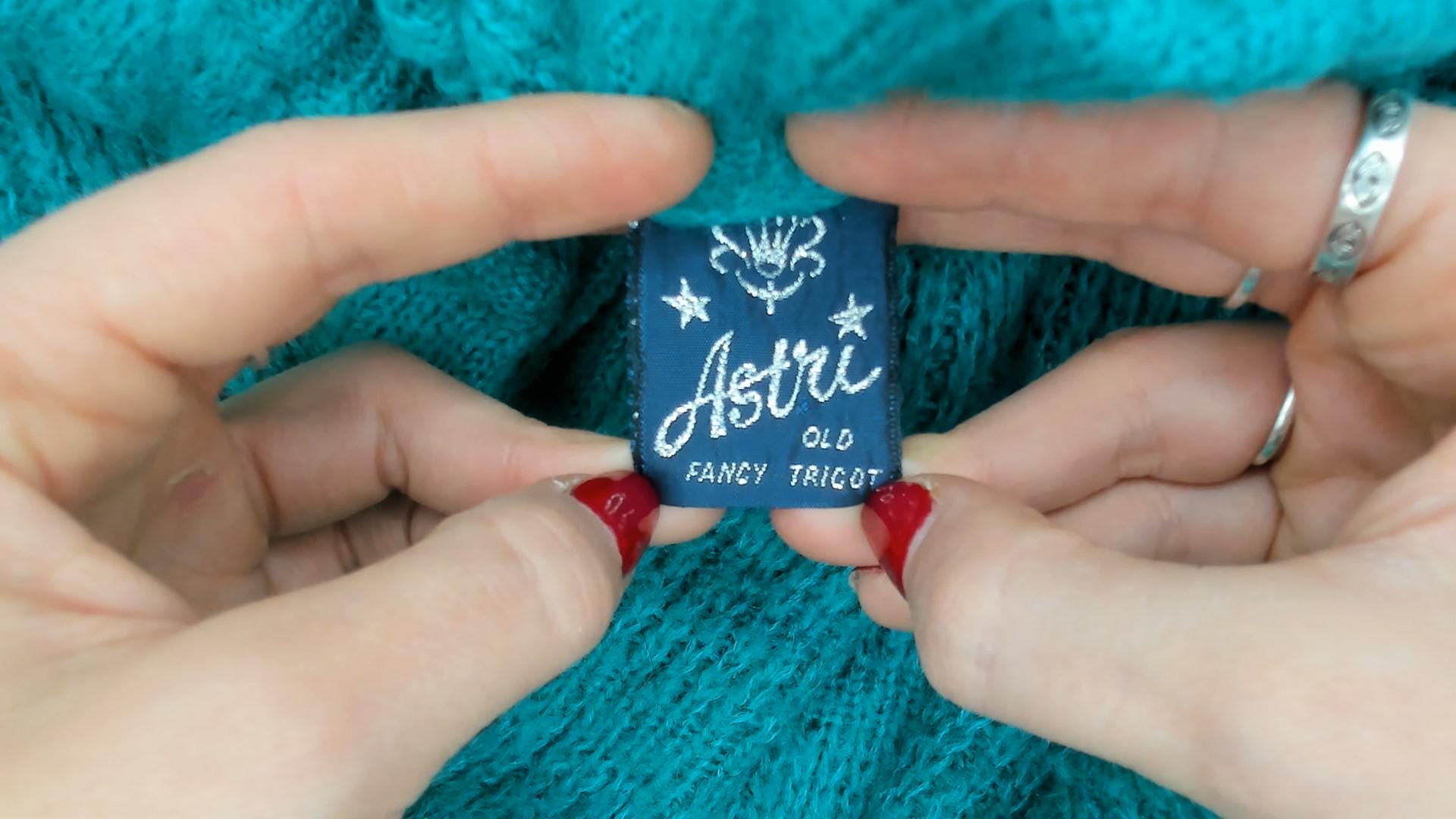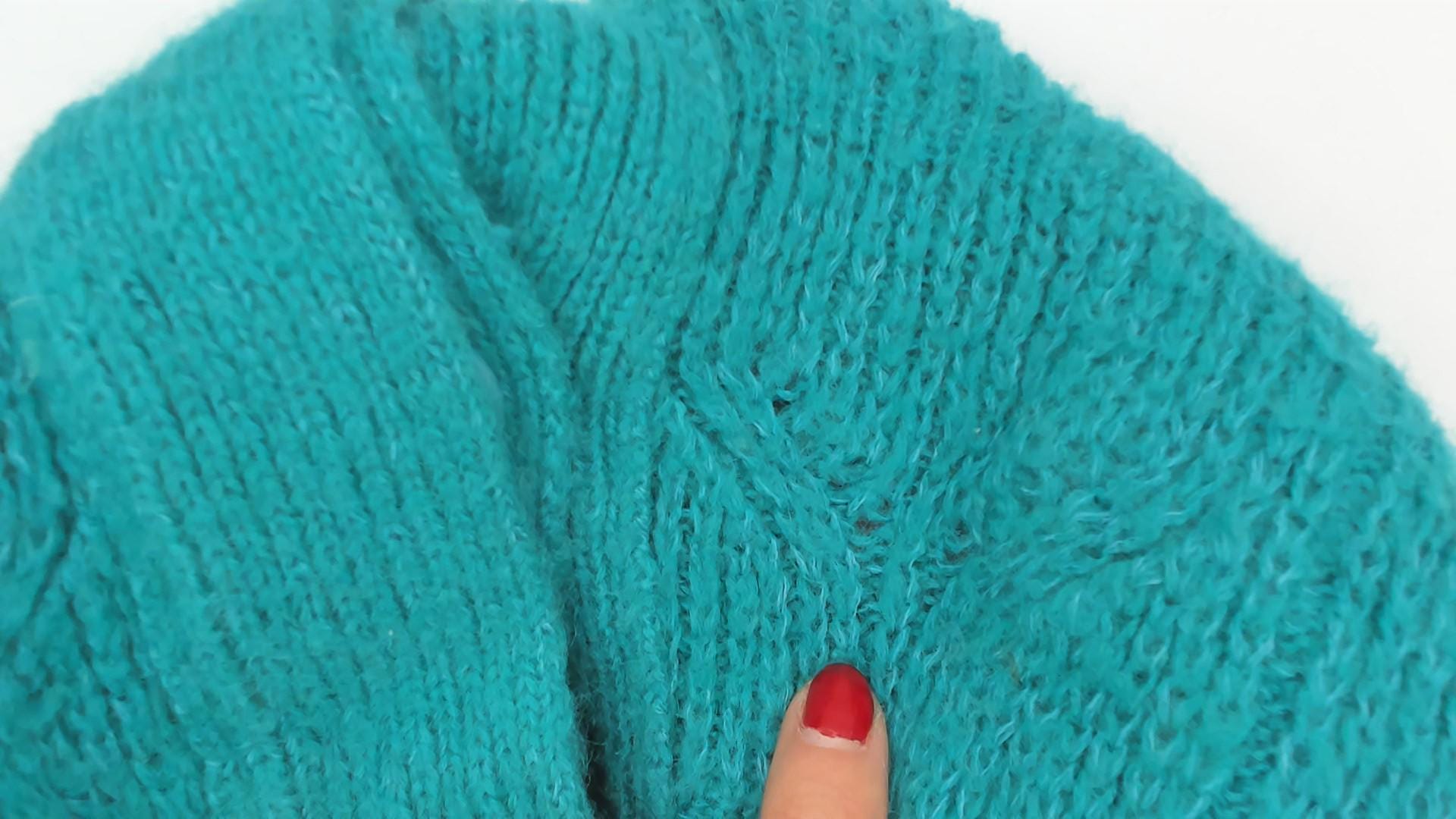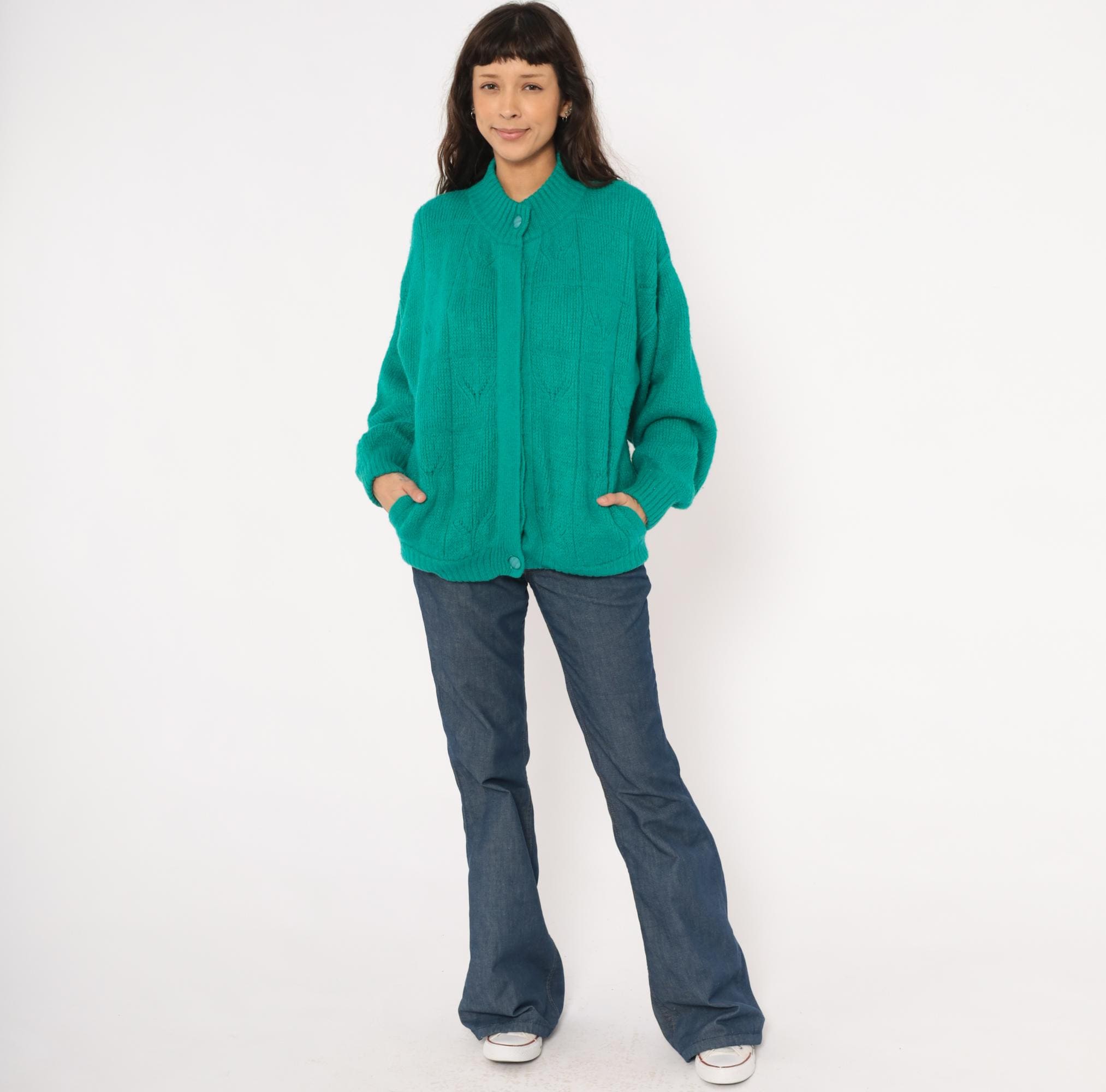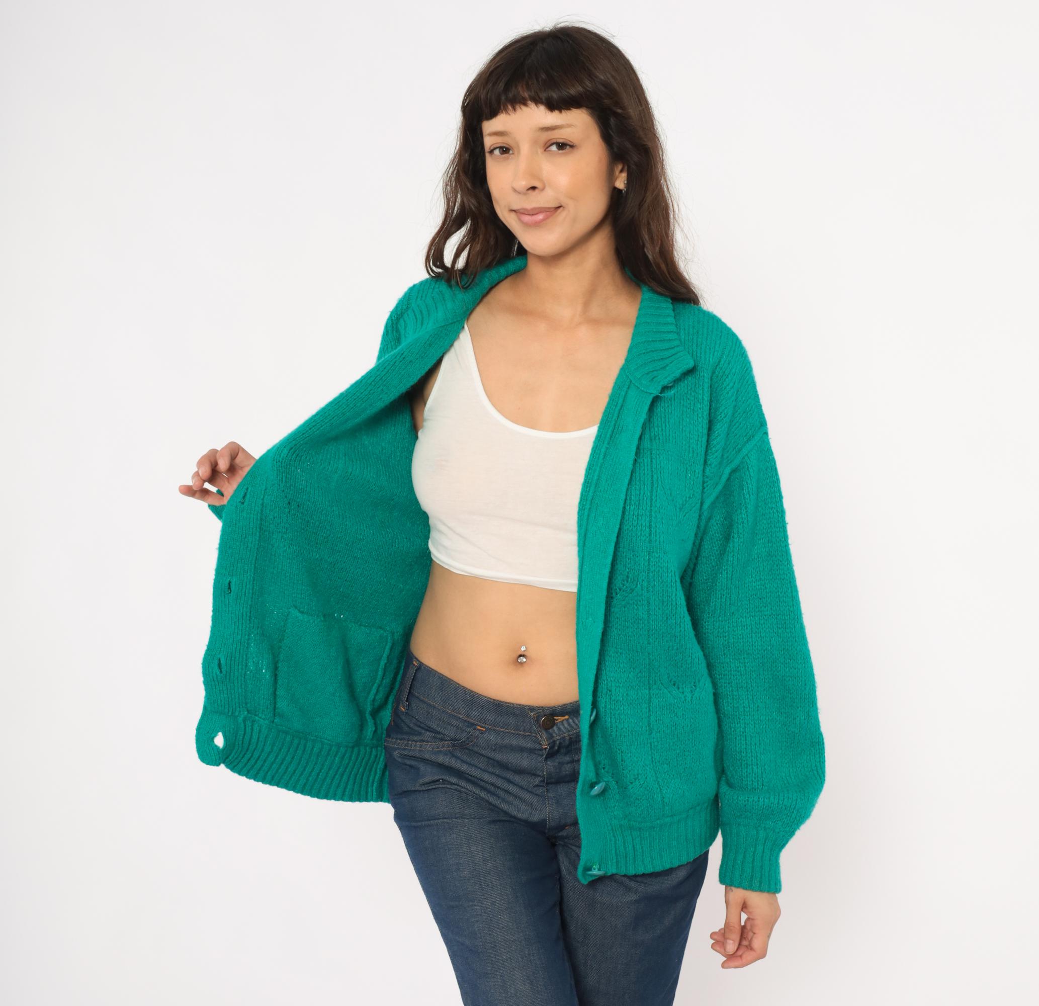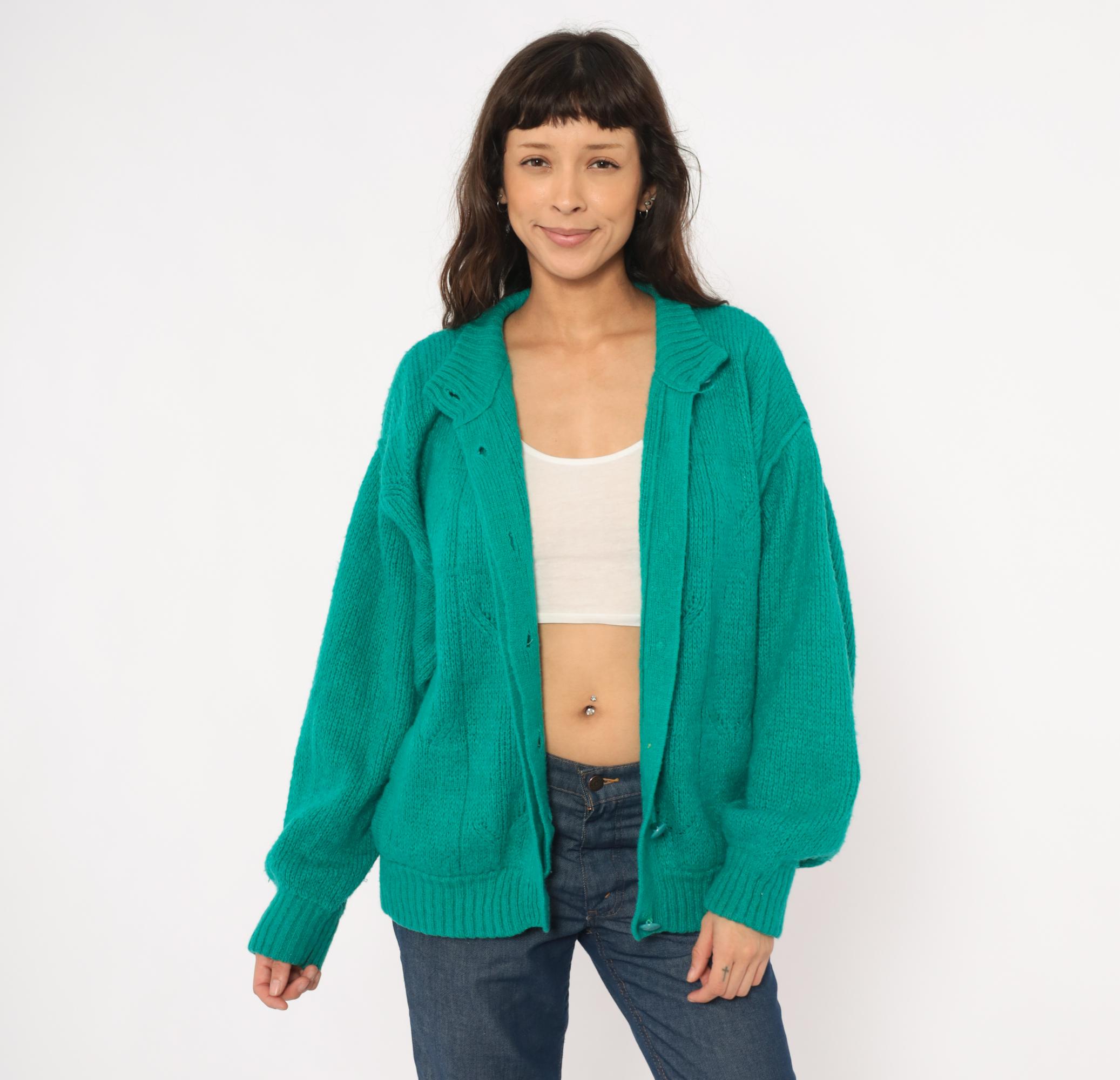 90s teal cardigan from Astri in a mohair-blend knit with a ribbed mock neck collar and ribbed cuffs. Button front closure with two matching teal buttons at the neck and hem, open placket center. Raised leaf and cable knit patterning across the front panels and sleeves, with a simpler stockinette back. Bomber-style silhouette with dropped shoulders, balloon sleeves, and a ribbed waistband hem.