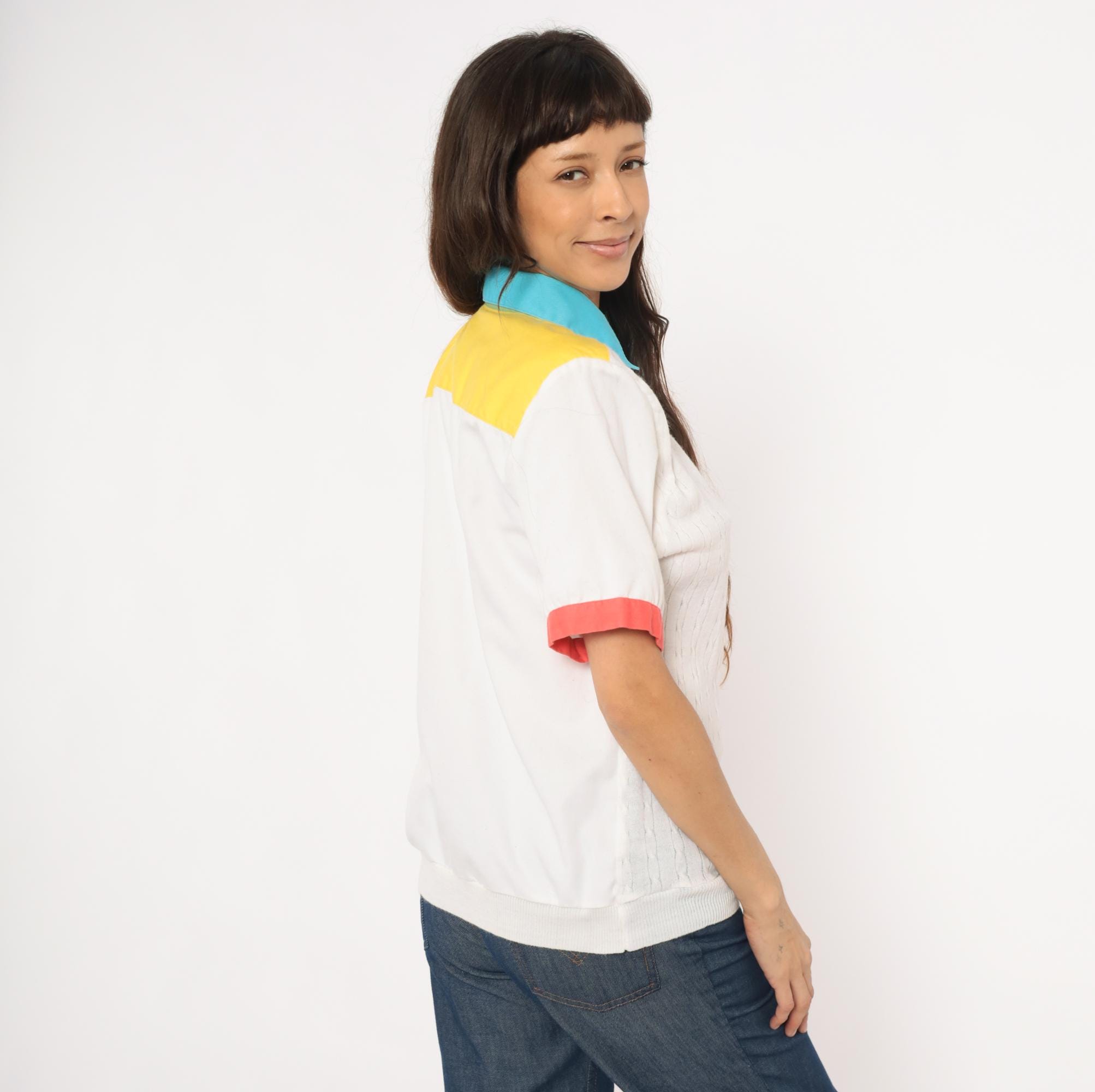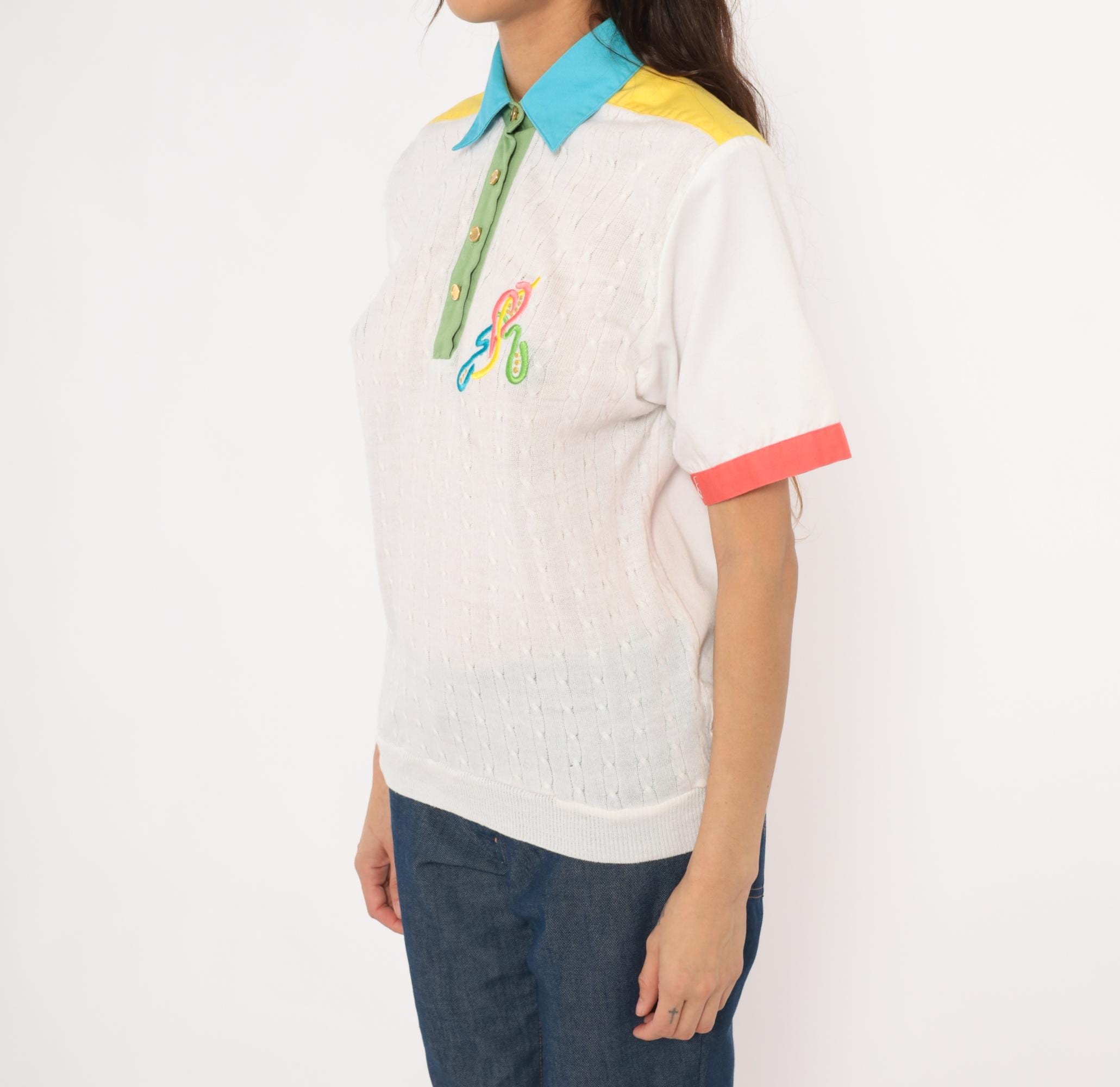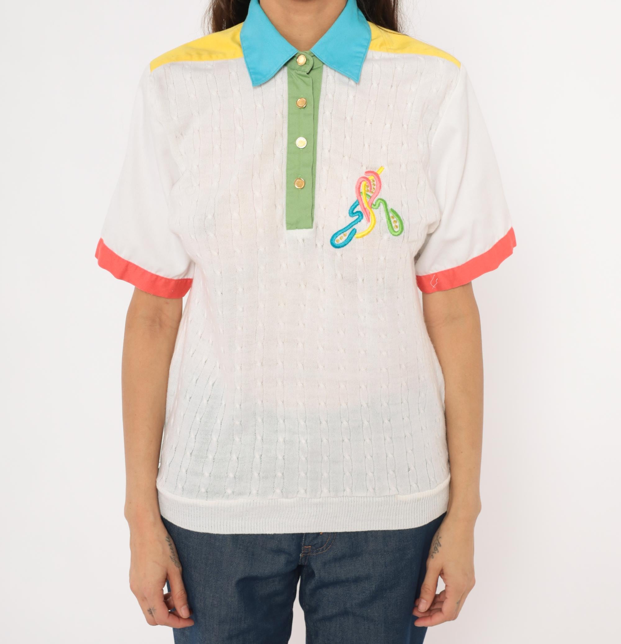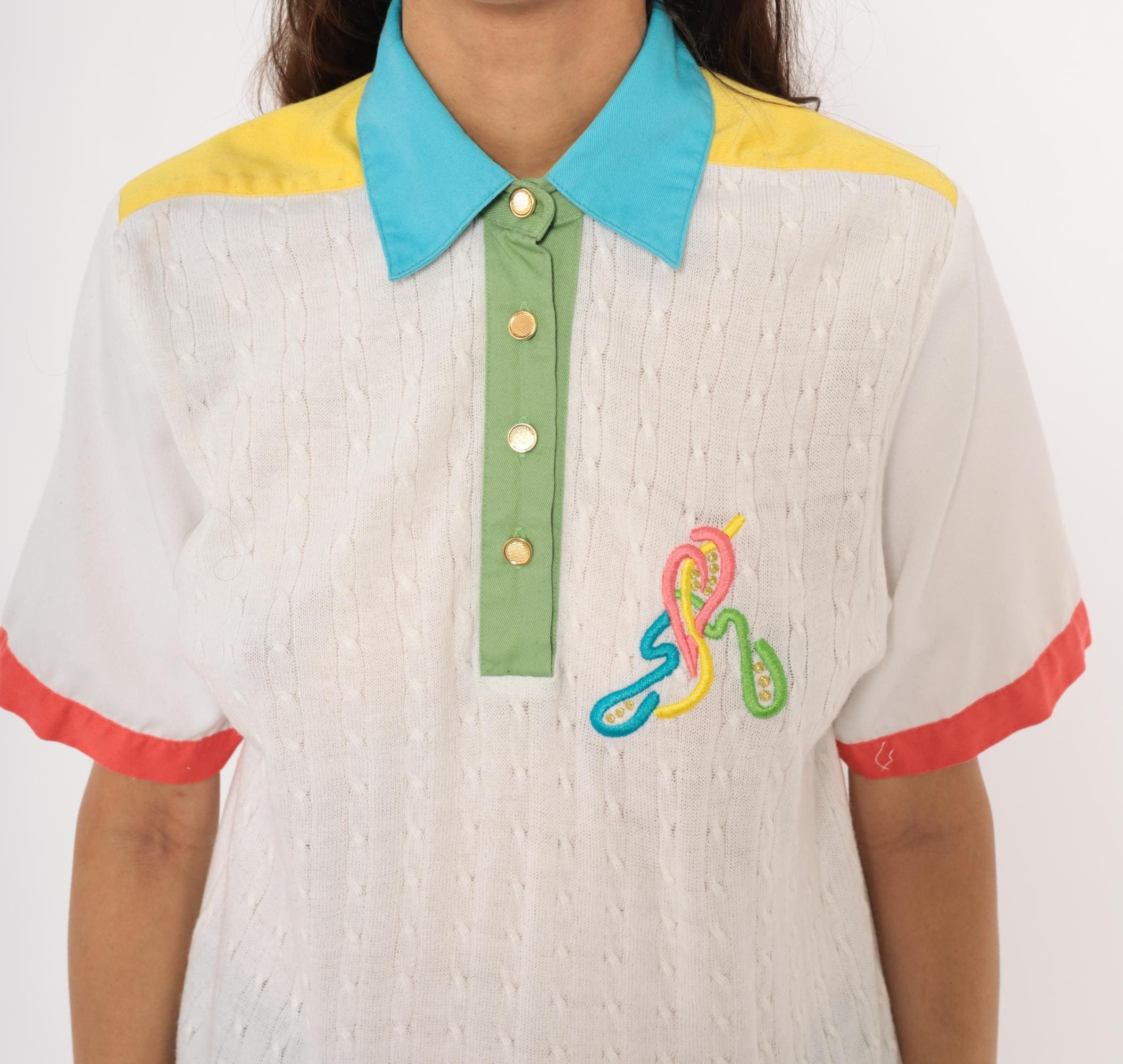 80s cable knit polo from Joyce with colorblock woven details throughout, including a turquoise pointed collar, yellow shoulder panels, sage green snap-button placket, and coral sleeve cuffs against a white knit body. Multicolor embroidered abstract motif on the left chest in pink, teal, green, and yellow with small gold-tone stud accents.
