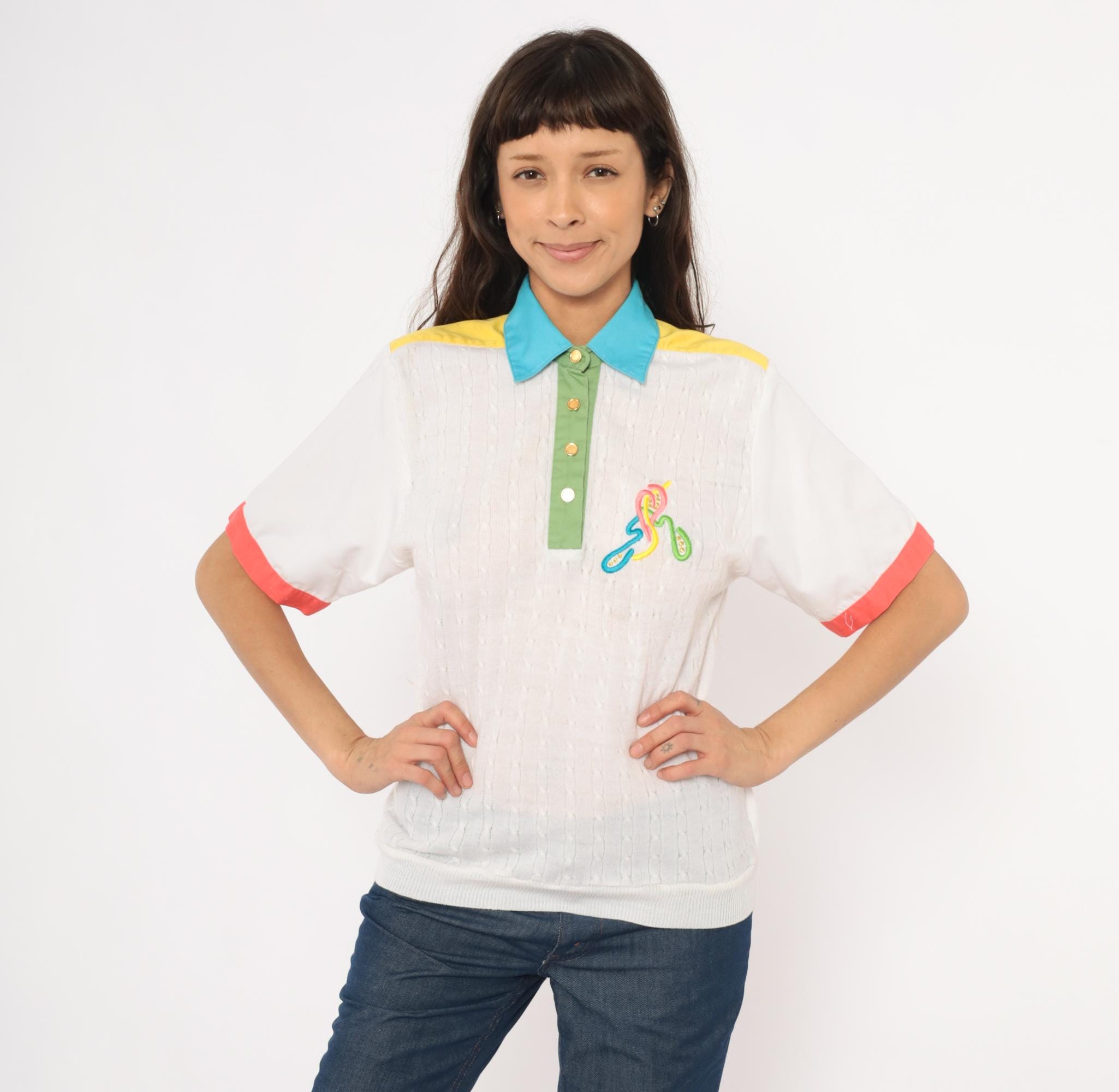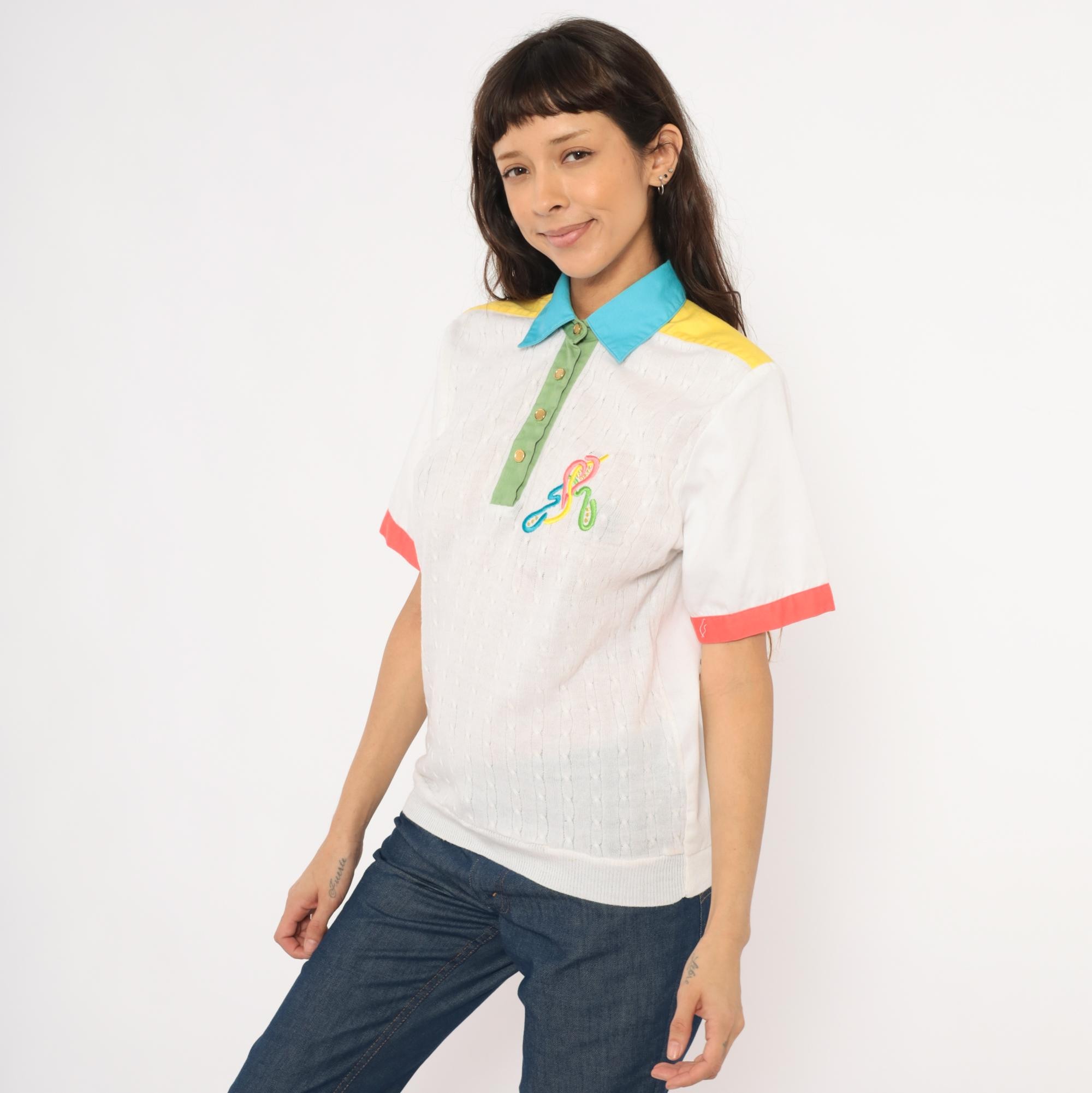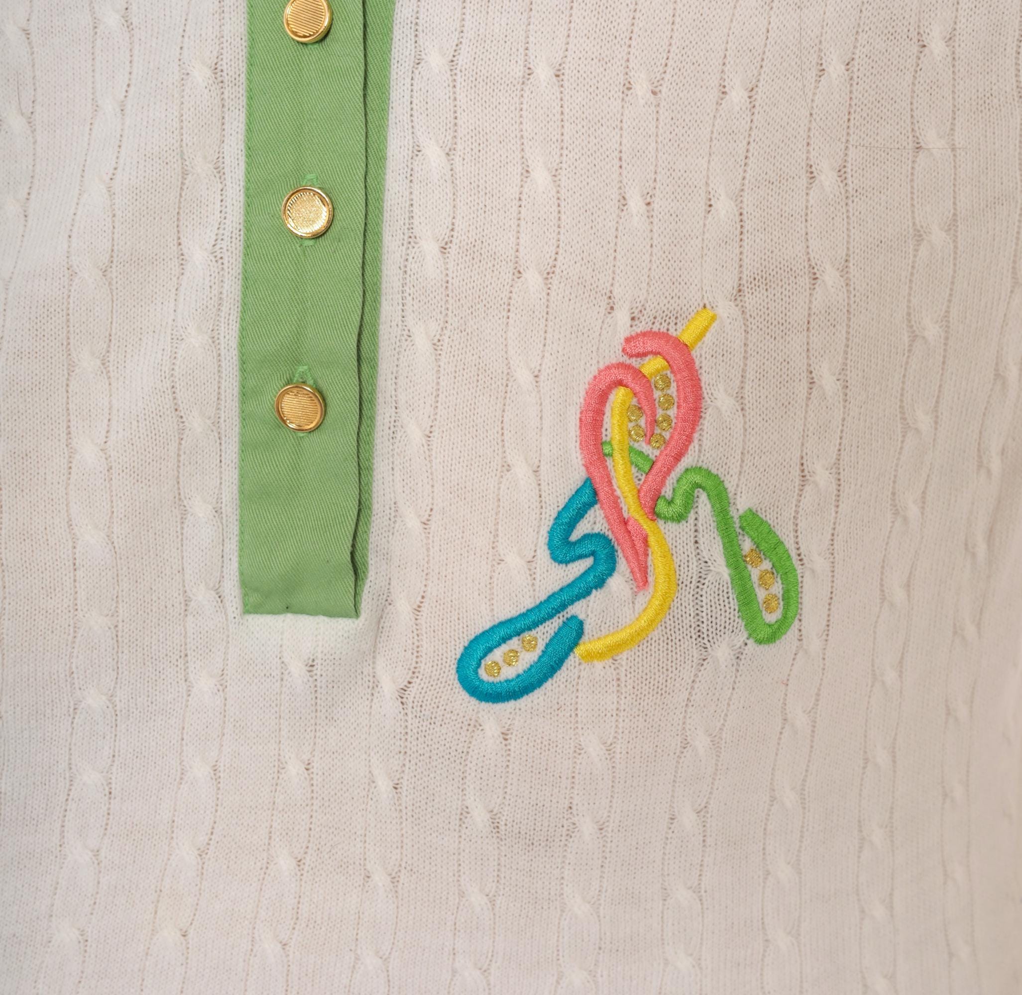 80s cable knit polo from Joyce with colorblock woven details throughout, including a turquoise pointed collar, yellow shoulder panels, sage green snap-button placket, and coral sleeve cuffs against a white knit body. Multicolor embroidered abstract motif on the left chest in pink, teal, green, and yellow with small gold-tone stud accents.