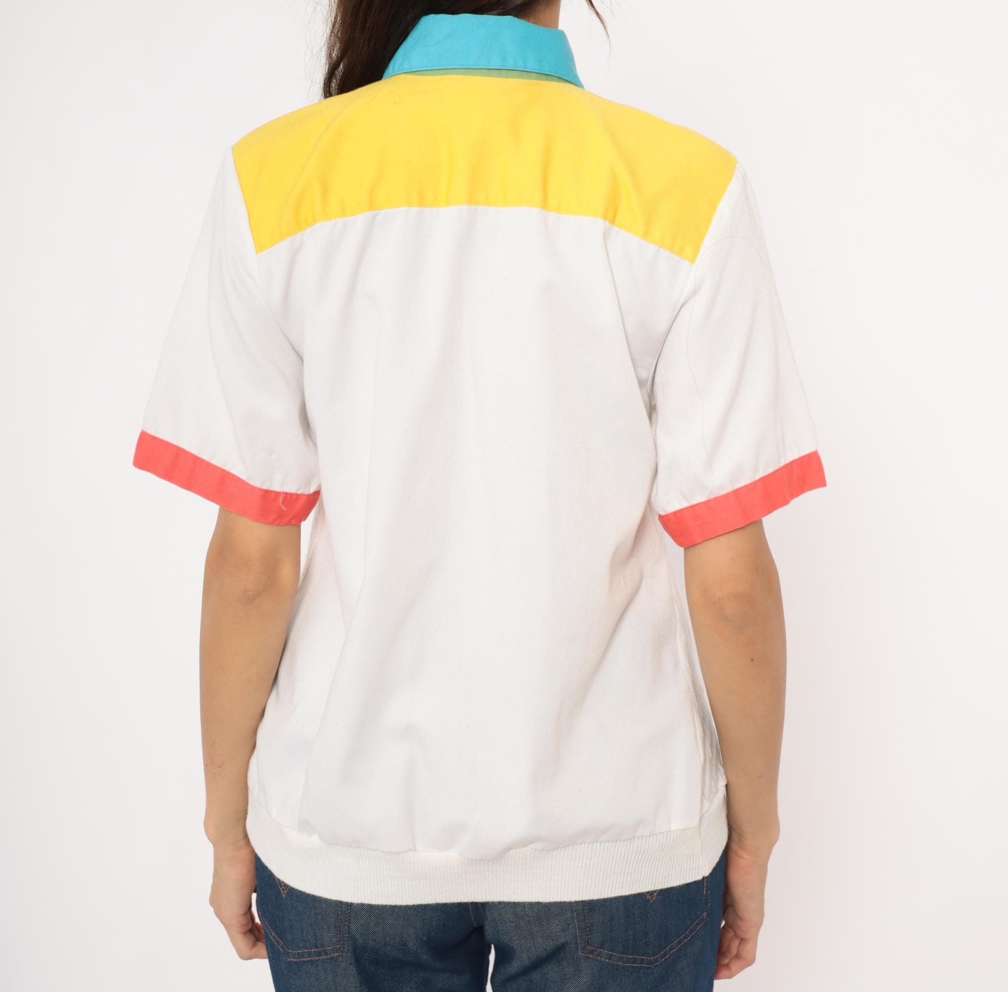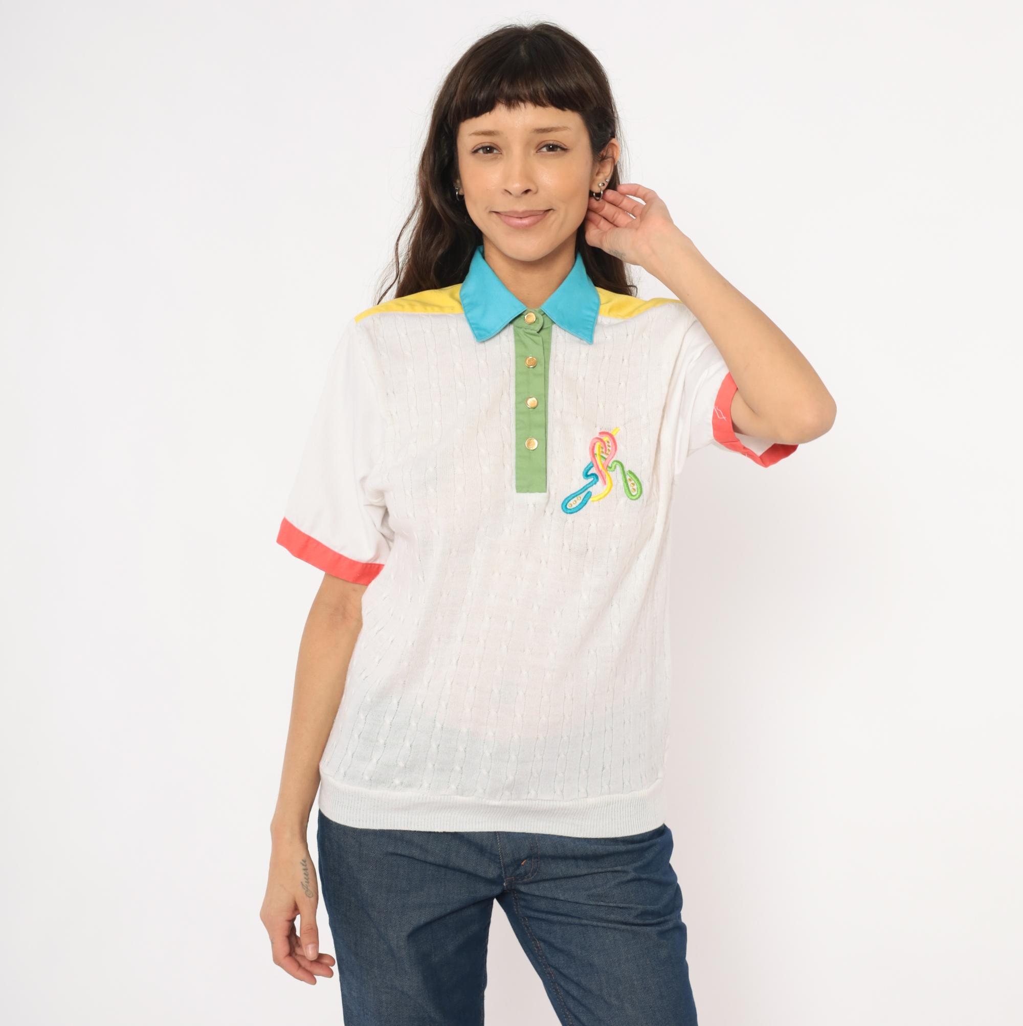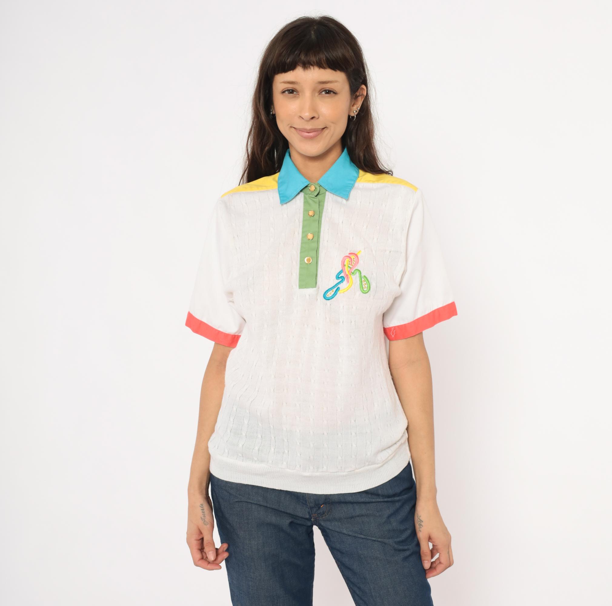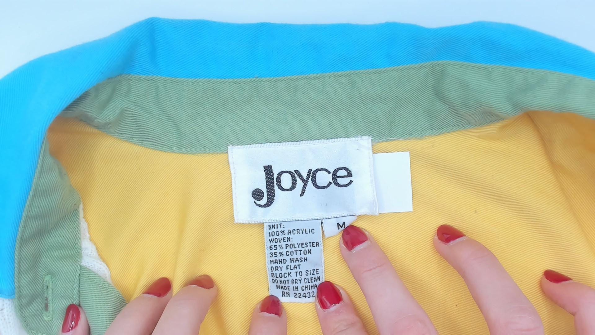 80s cable knit polo from Joyce with colorblock woven details throughout, including a turquoise pointed collar, yellow shoulder panels, sage green snap-button placket, and coral sleeve cuffs against a white knit body. Multicolor embroidered abstract motif on the left chest in pink, teal, green, and yellow with small gold-tone stud accents.