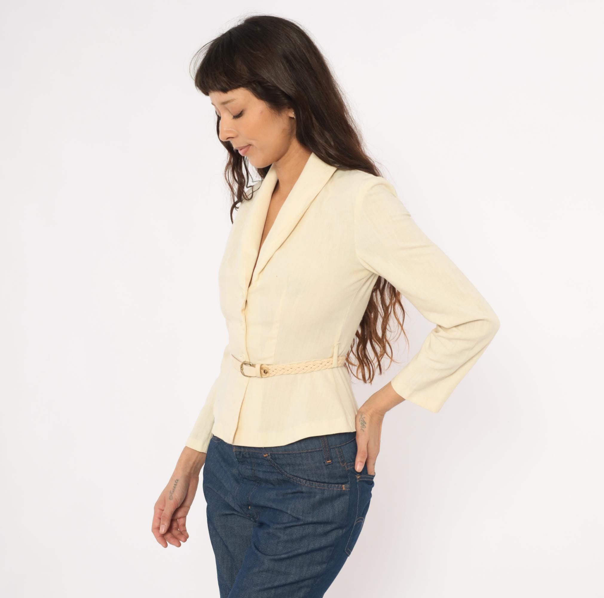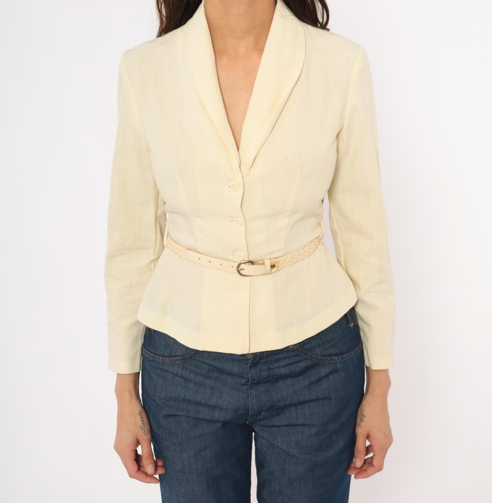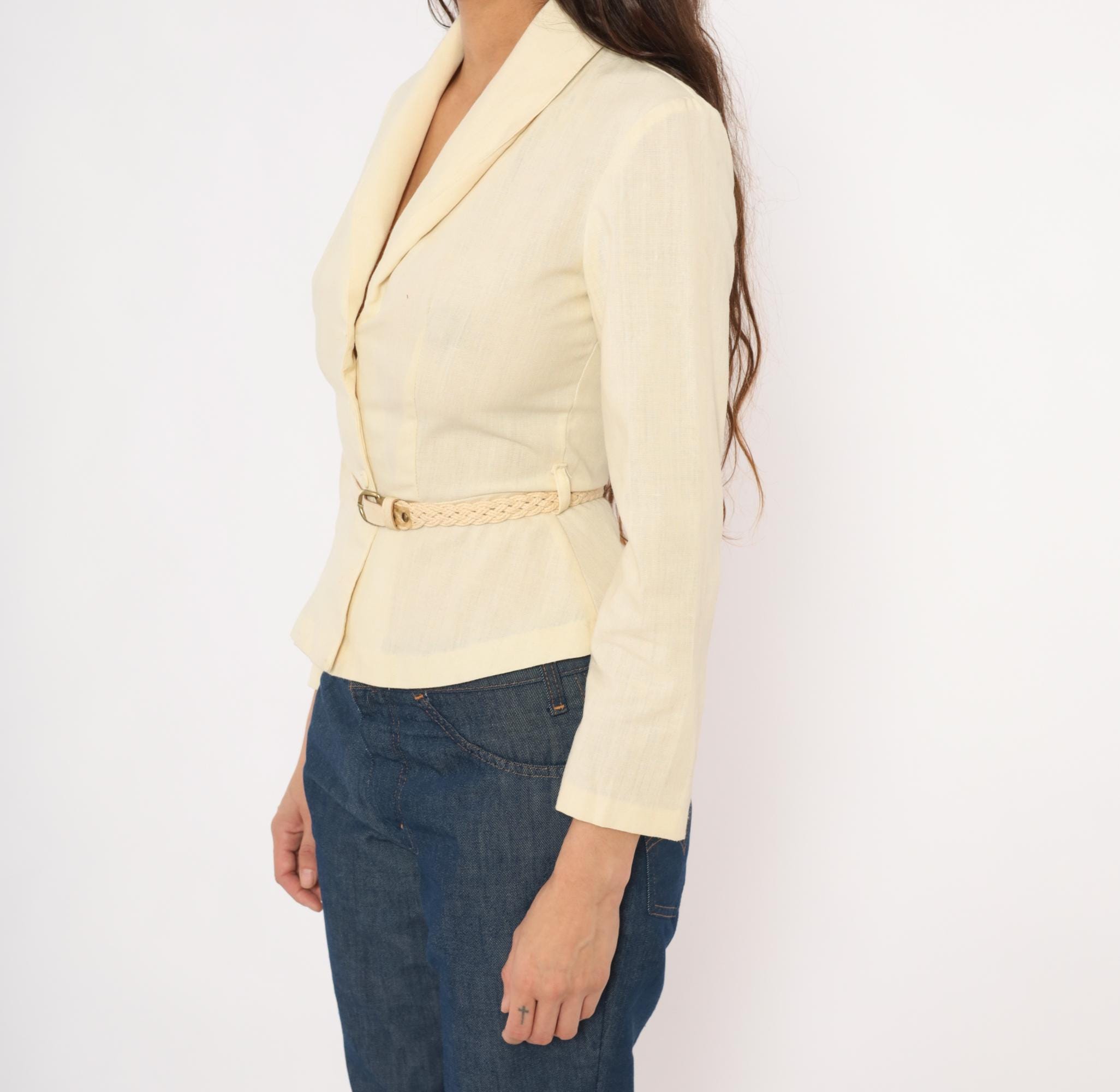 70s cream linen blend blazer with a shawl collar, V neckline, and button front closure. Fitted waist with a braided woven belt threaded through belt loops, and a peplum hem below the waist. Three-quarter length sleeves and princess seam construction through the bodice.