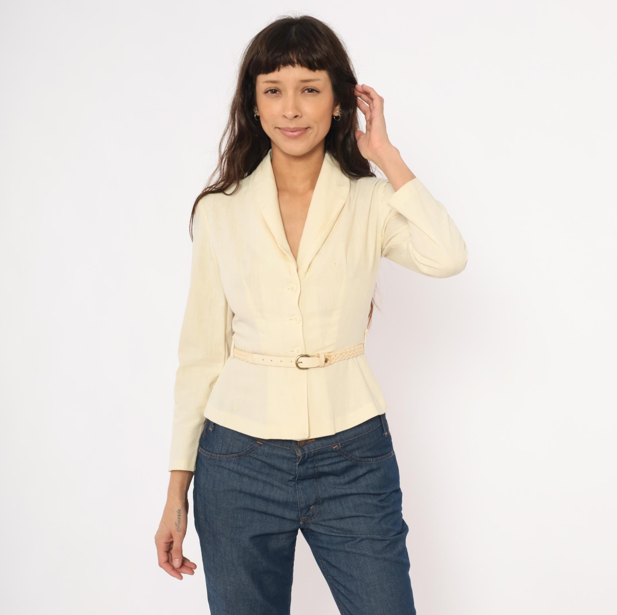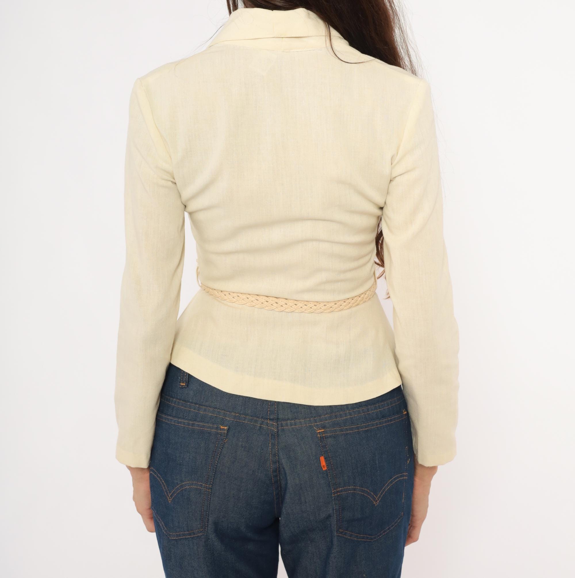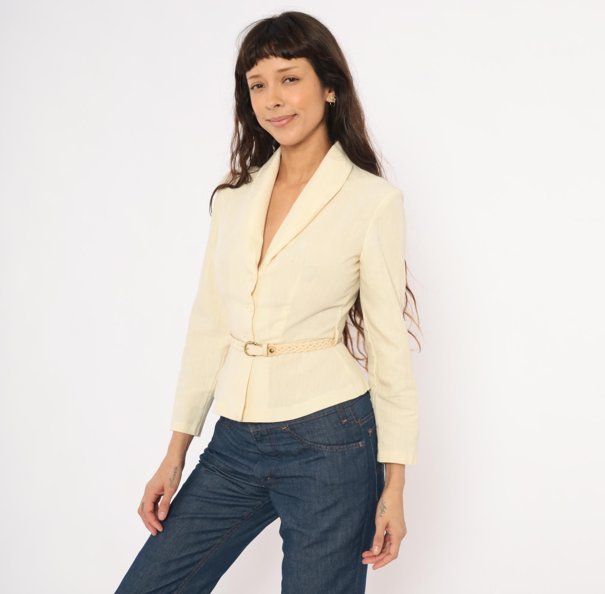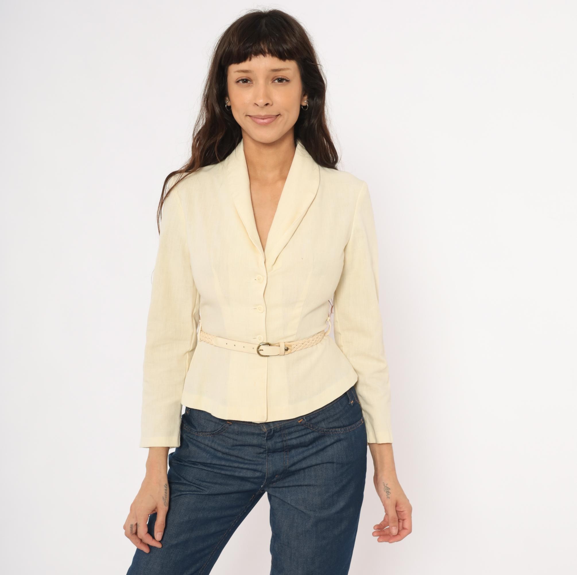 70s cream linen blend blazer with a shawl collar, V neckline, and button front closure. Fitted waist with a braided woven belt threaded through belt loops, and a peplum hem below the waist. Three-quarter length sleeves and princess seam construction through the bodice.