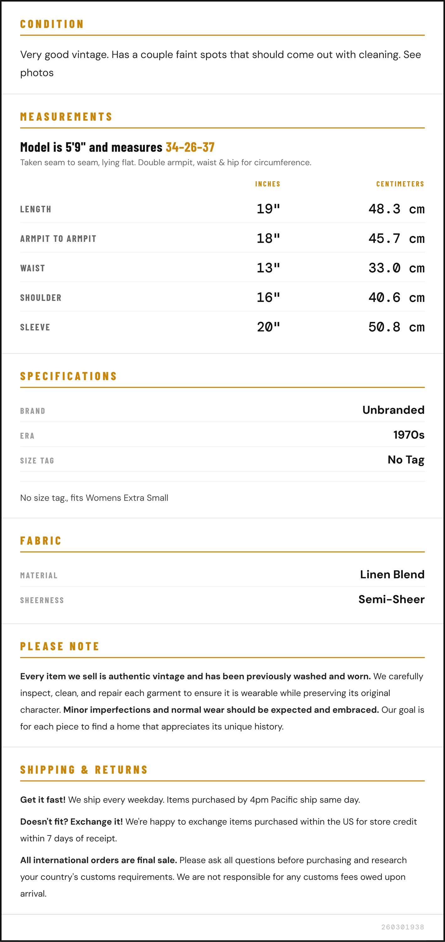 Vintage denim was usually made without any stretch, unlike modern jeans. Check the measurements to ensure proper fit, and remember to give yourself a little wiggle room in the waist and hips, depending on your preferred fit.