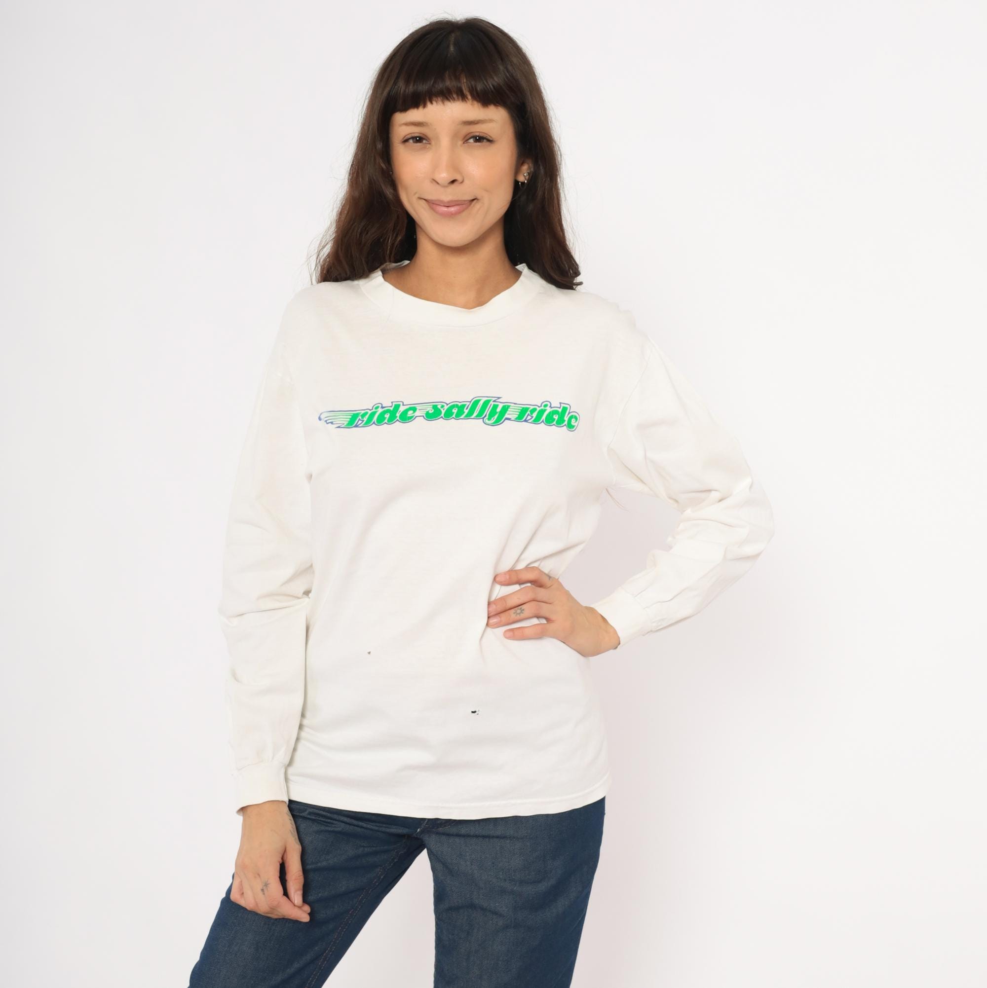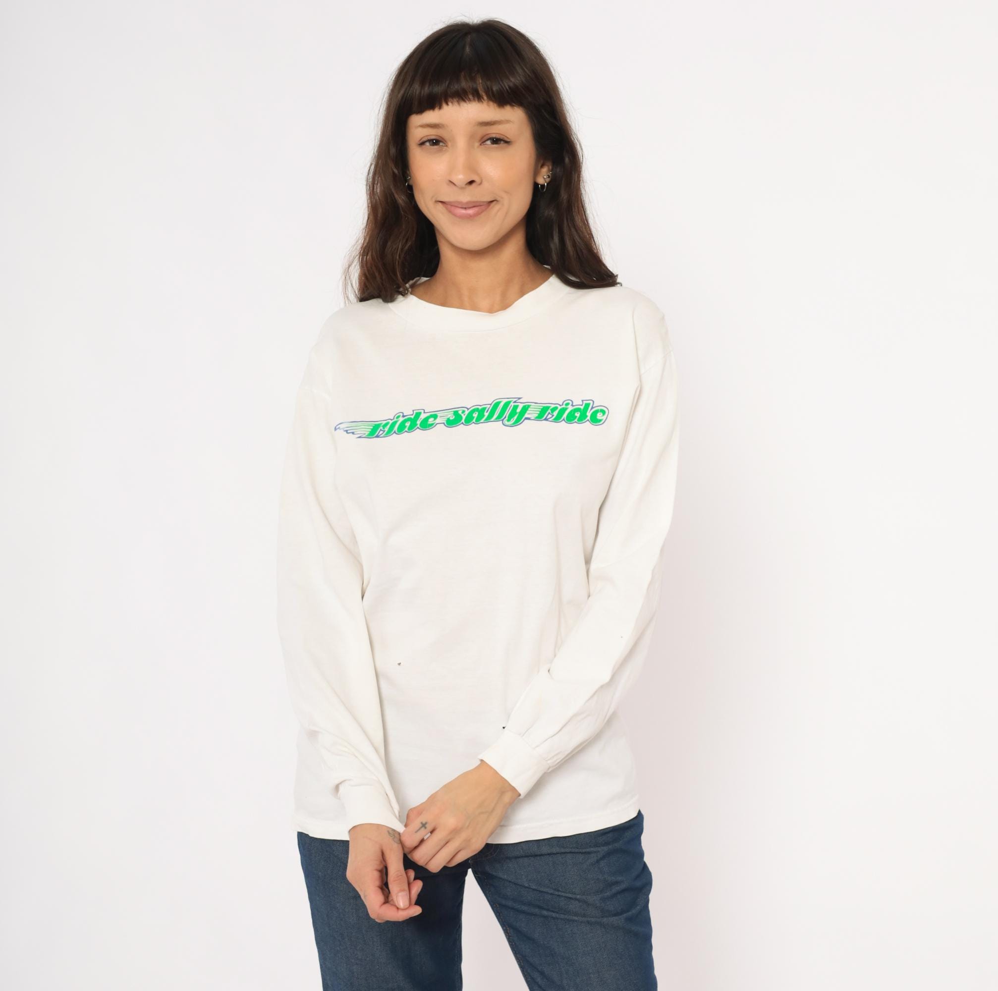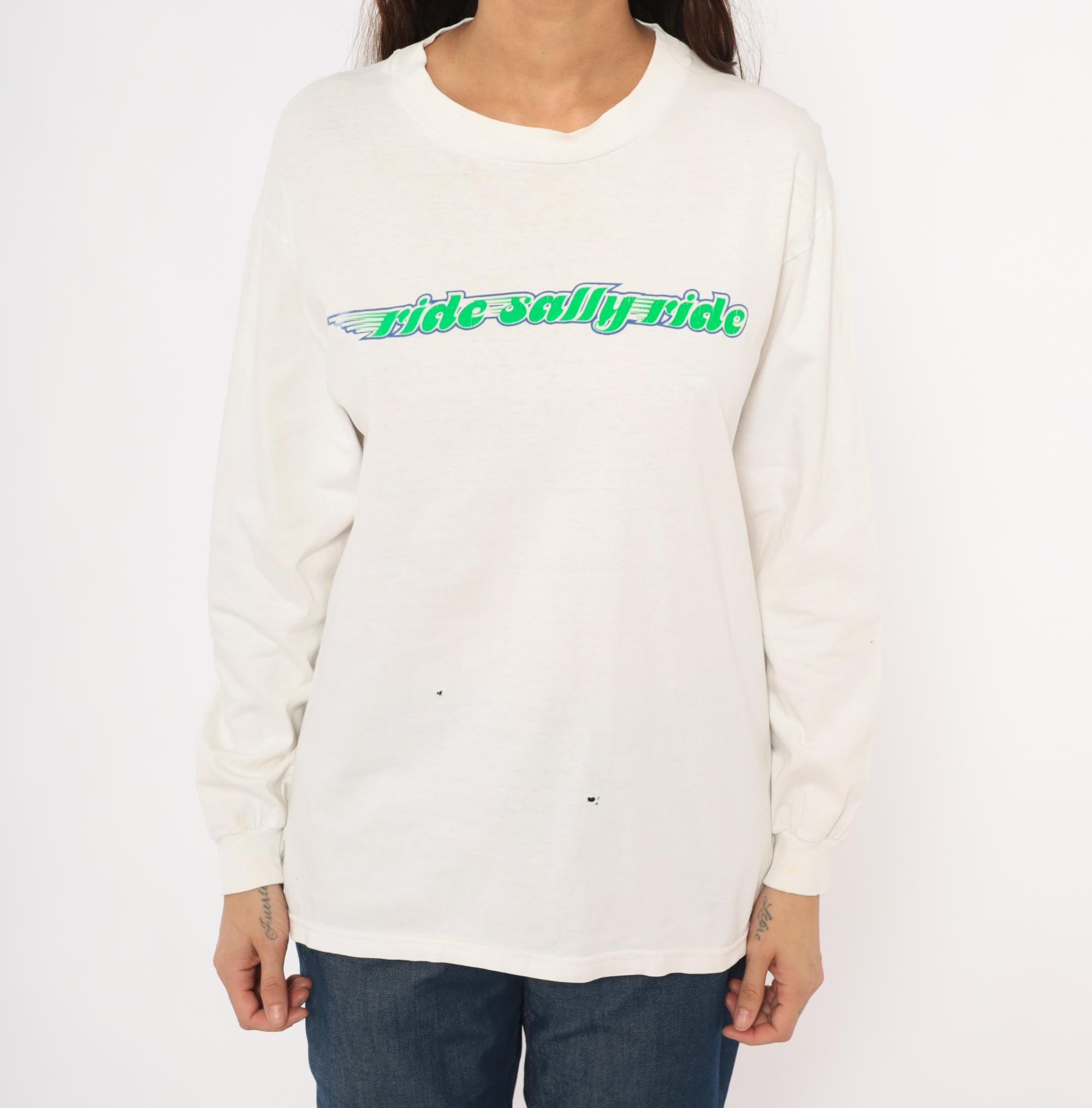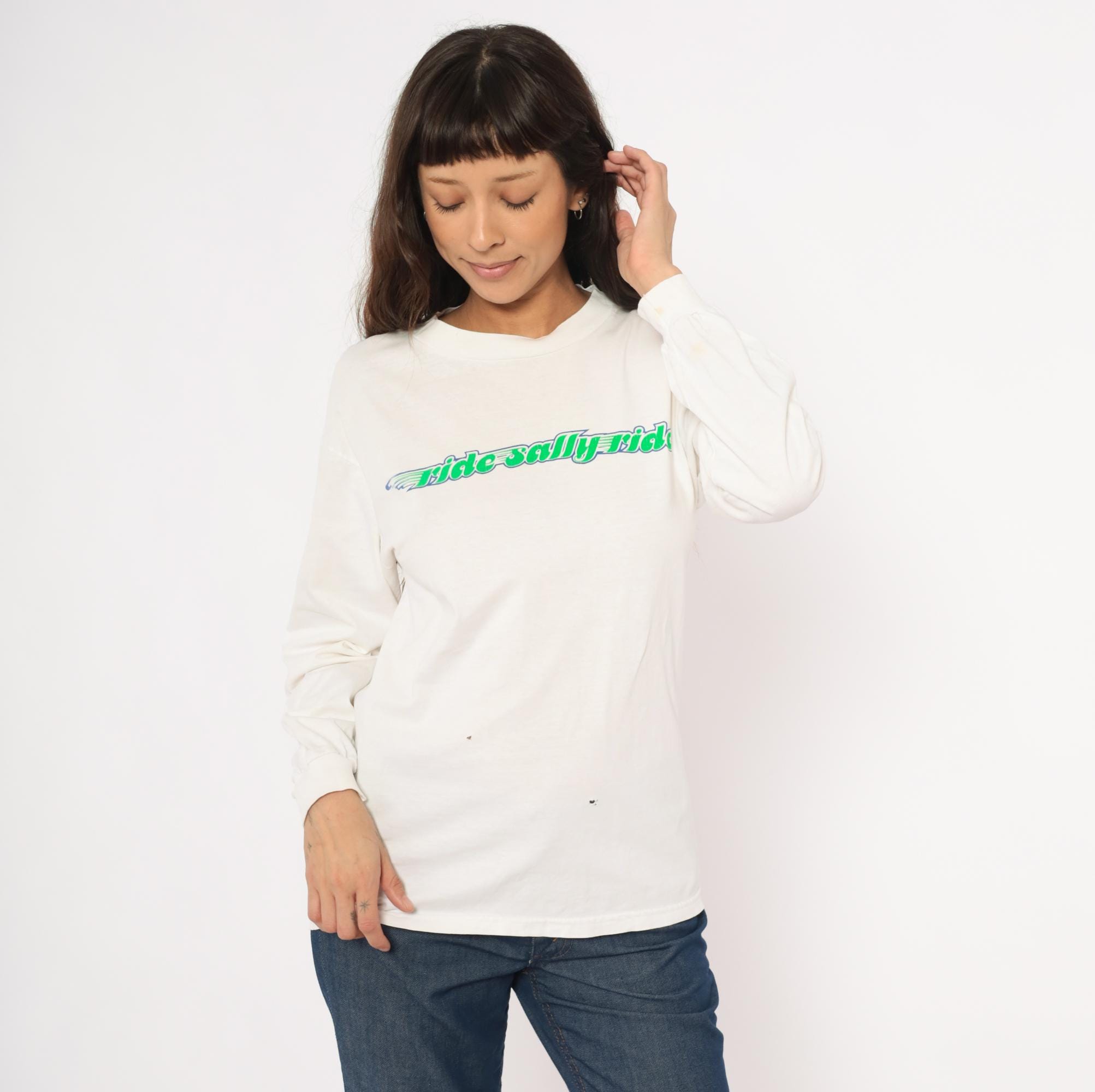 90s white long sleeve tee from Hanes with a green and blue "ride sally ride" graphic across the chest in italic script with a wing motif extending from the left side. Crew neck, ribbed cuffs, and a relaxed straight body. Plain back with no additional graphics. A few small pin holes visible on the front body below the graphic.