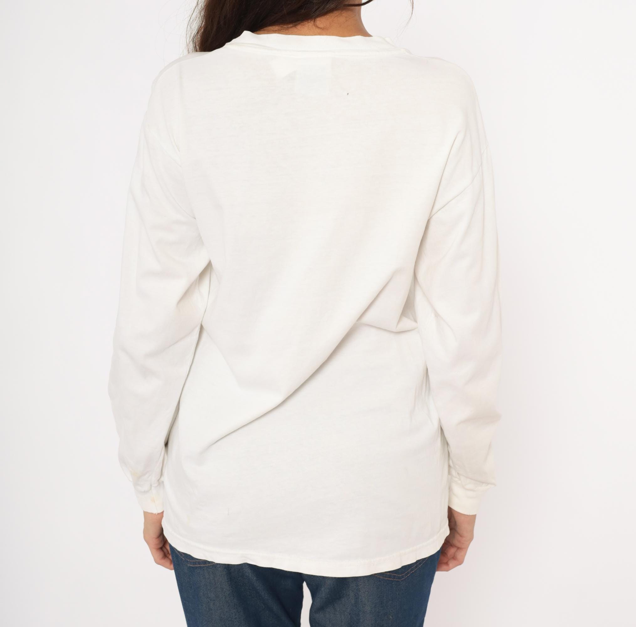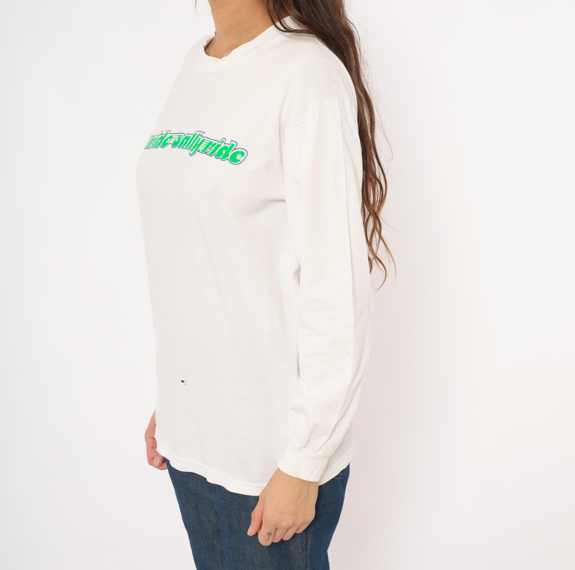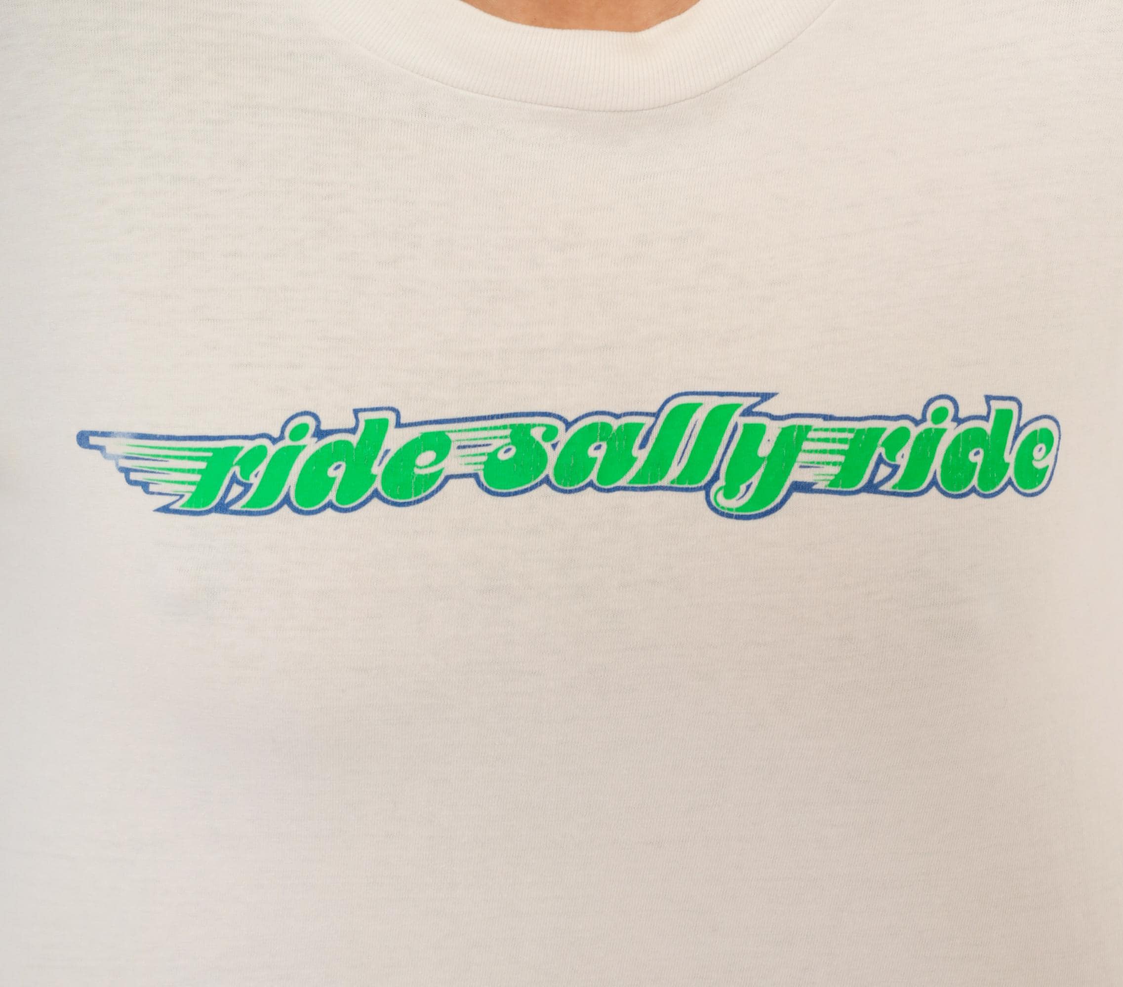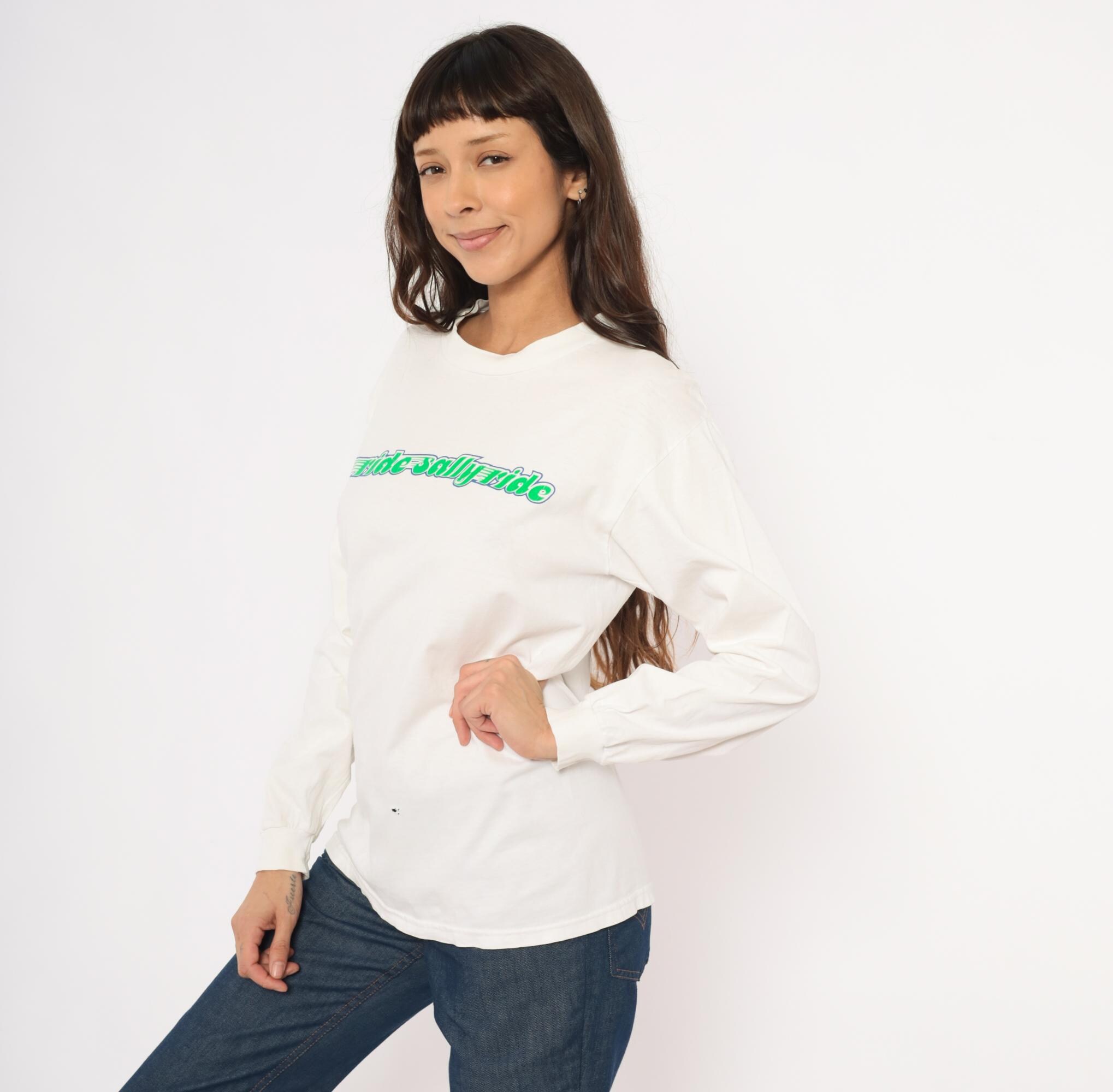 90s white long sleeve tee from Hanes with a green and blue "ride sally ride" graphic across the chest in italic script with a wing motif extending from the left side. Crew neck, ribbed cuffs, and a relaxed straight body. Plain back with no additional graphics. A few small pin holes visible on the front body below the graphic.