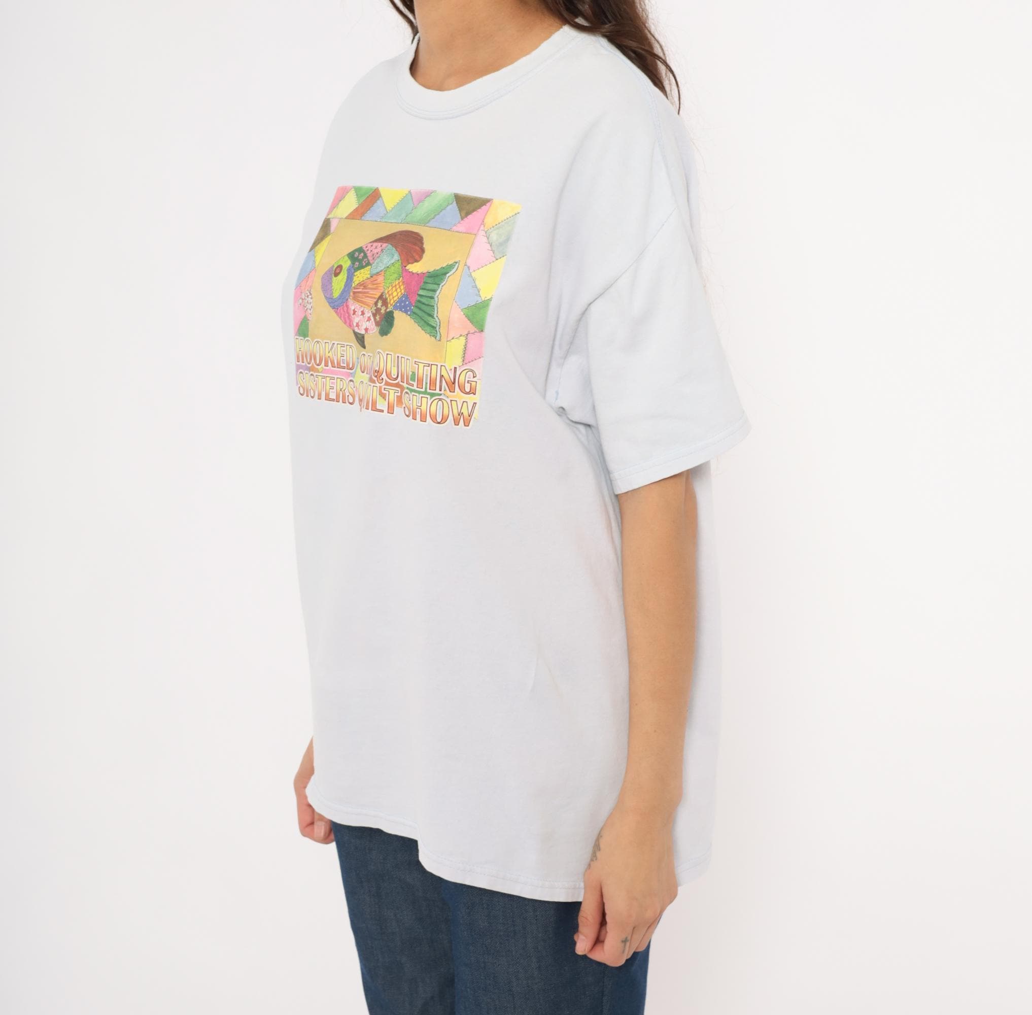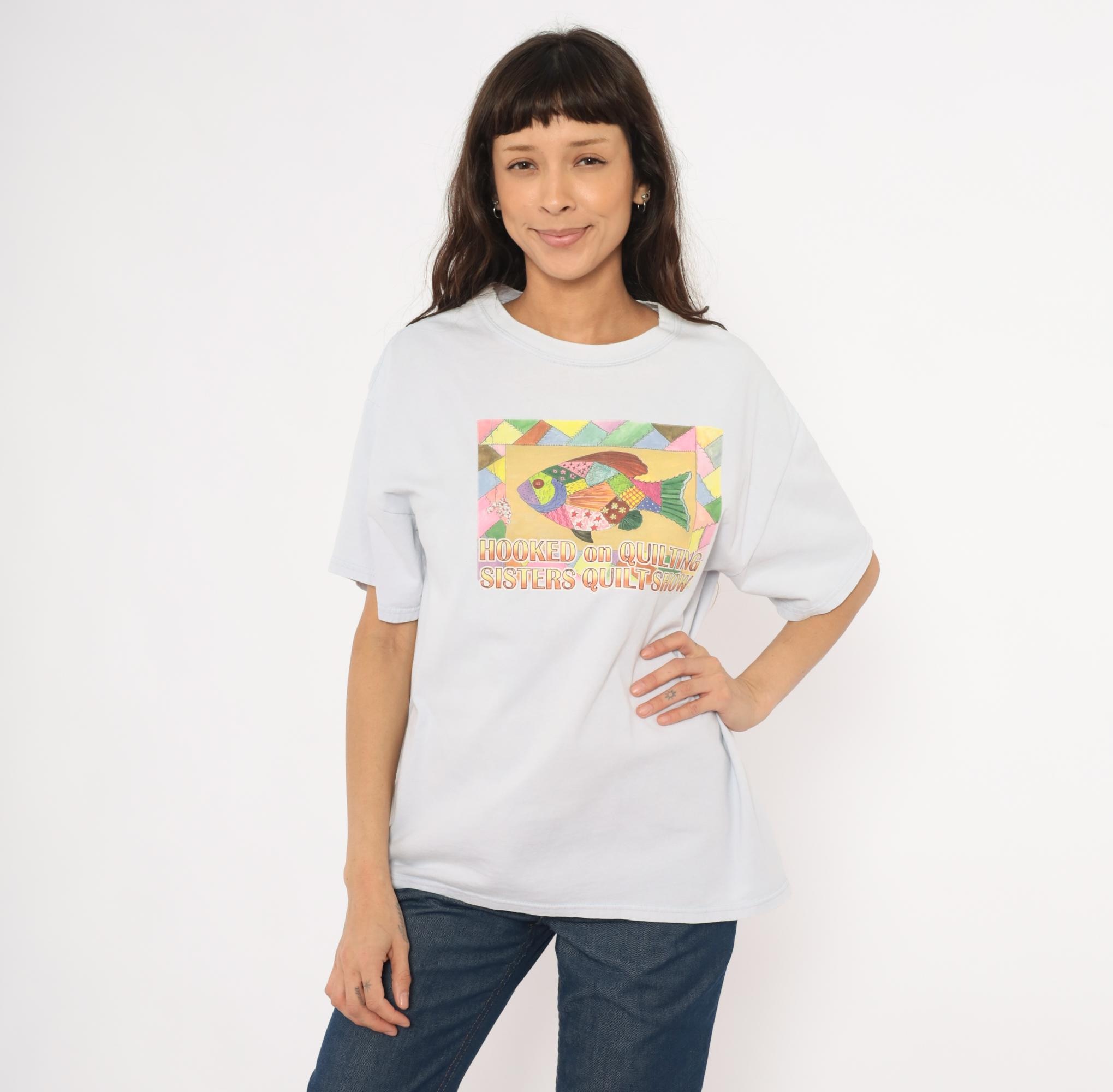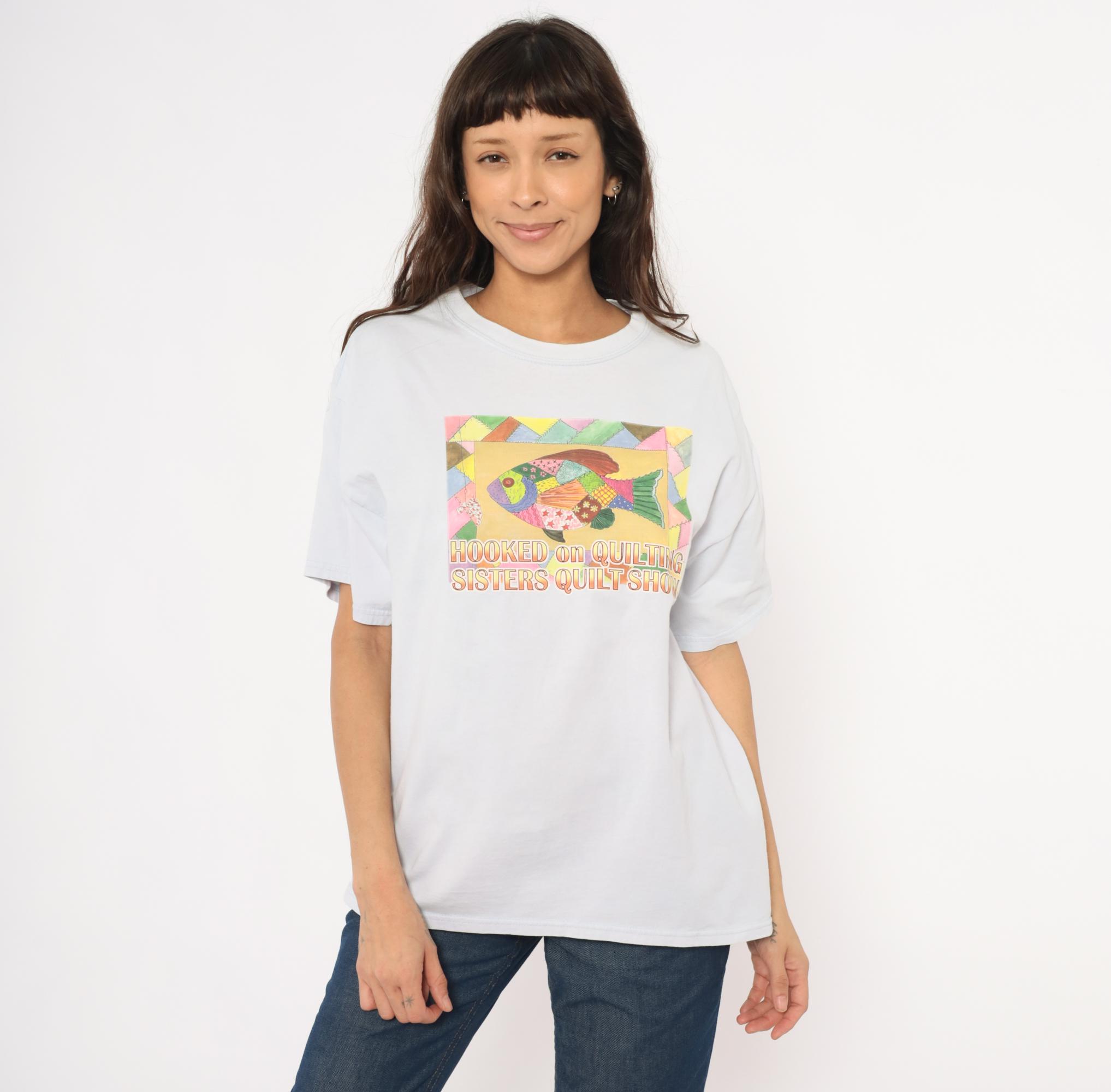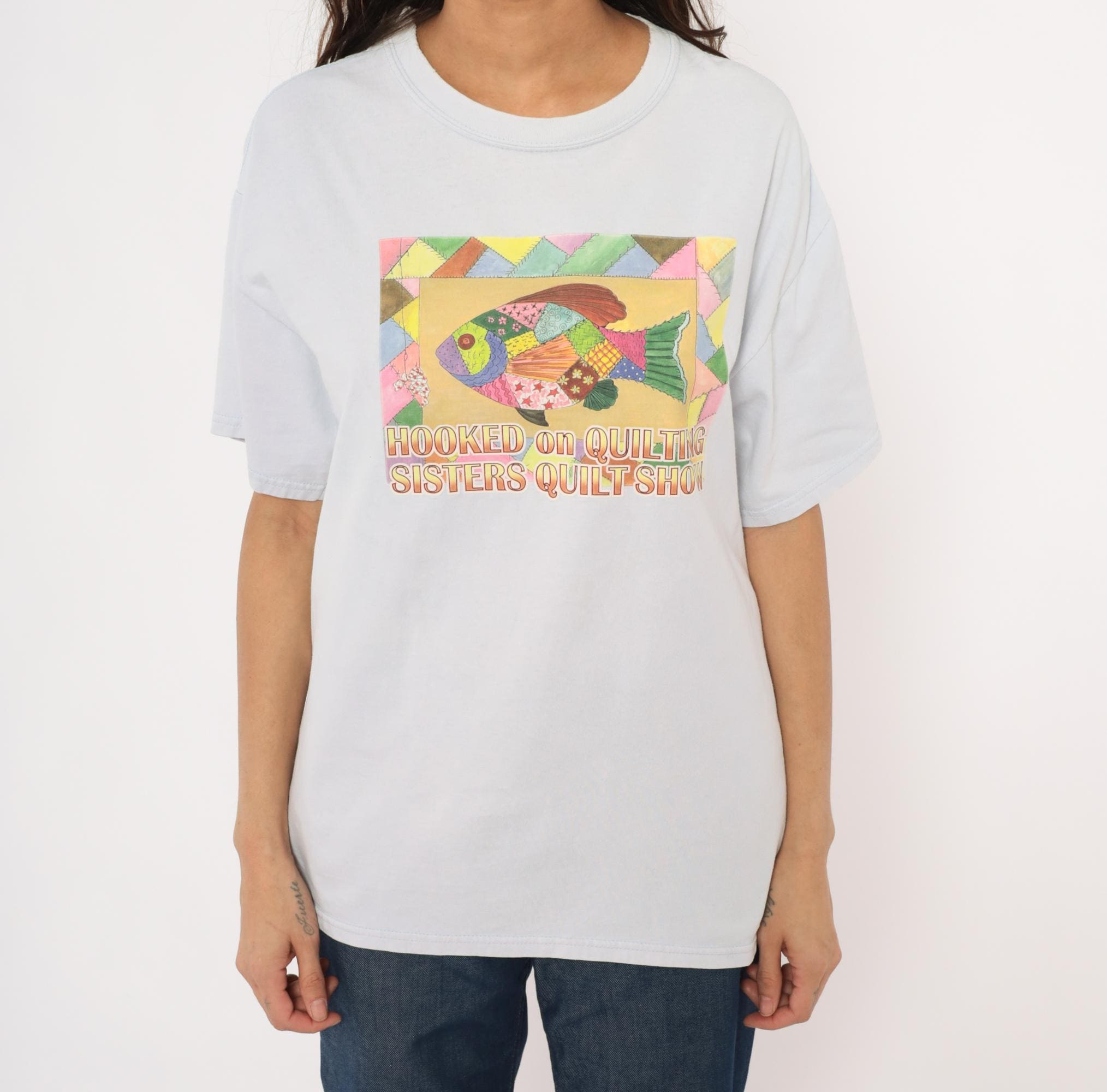 90s pale blue crew neck tee from Gildan with a colorful patchwork-style fish graphic on the front, reading "Hooked on Quilting Sisters Quilt Show." The fish illustration is composed of multicolor quilt-pattern segments in pink, green, gold, purple, and brown, surrounded by a geometric triangle border.
