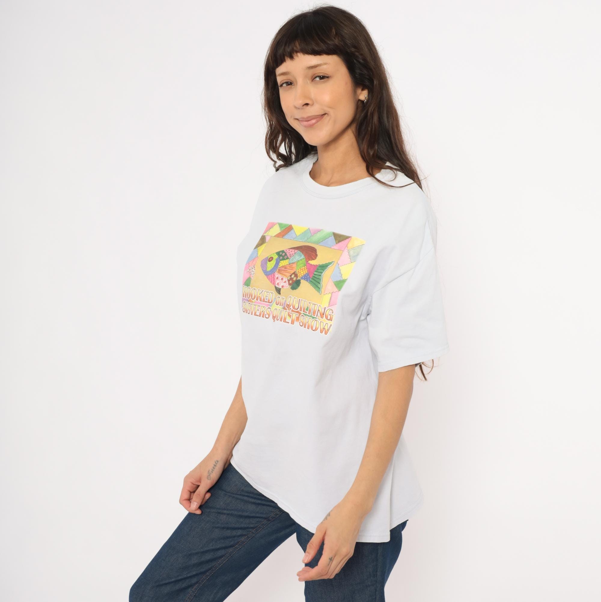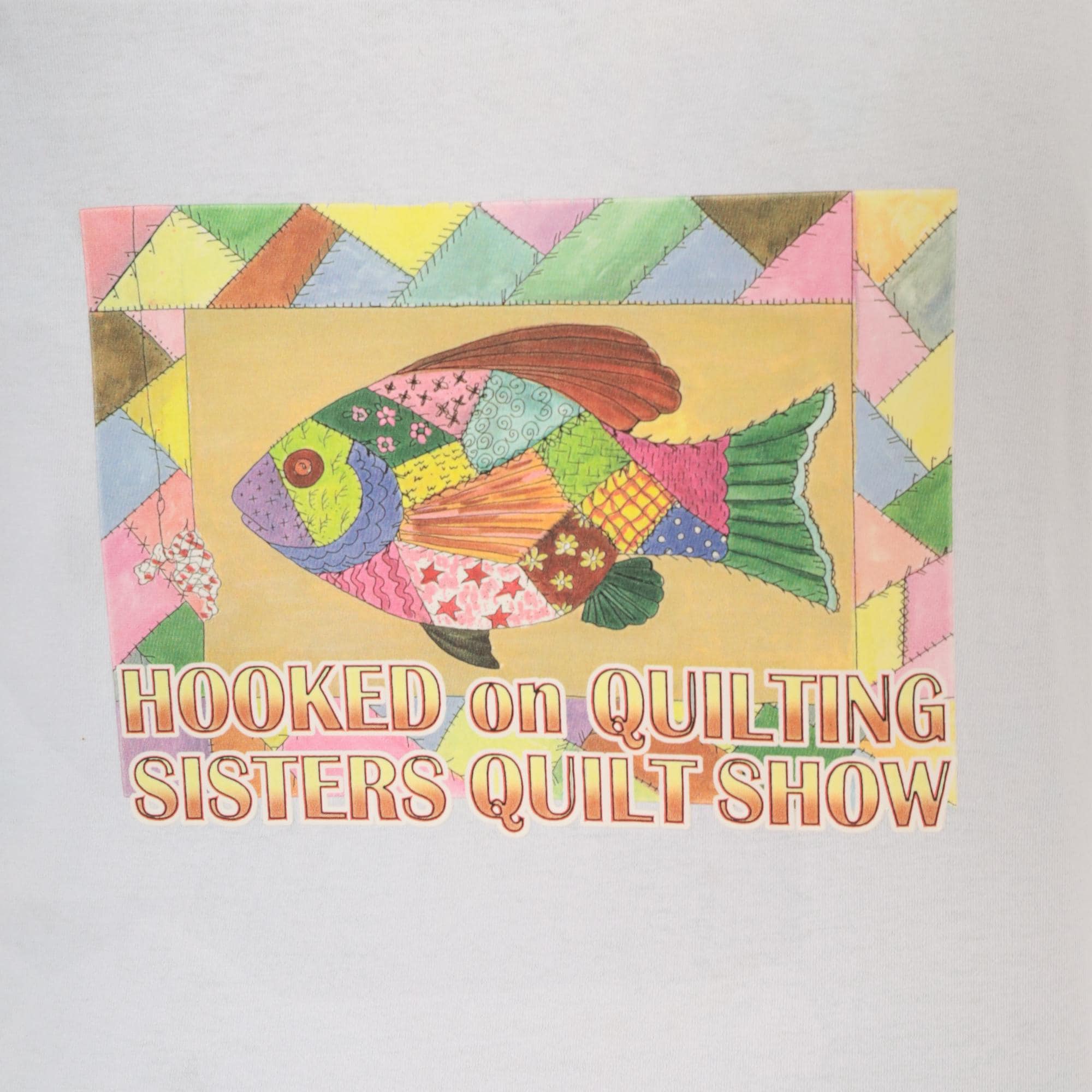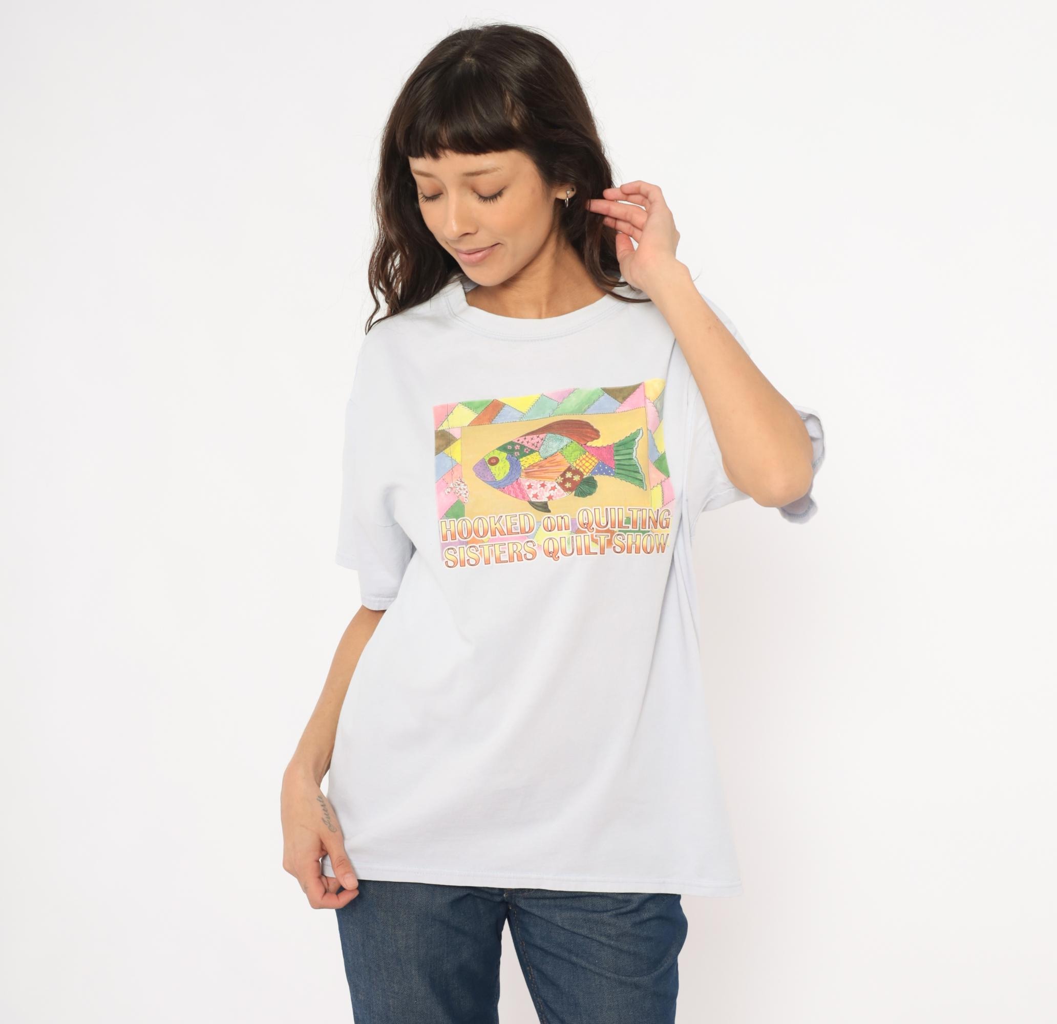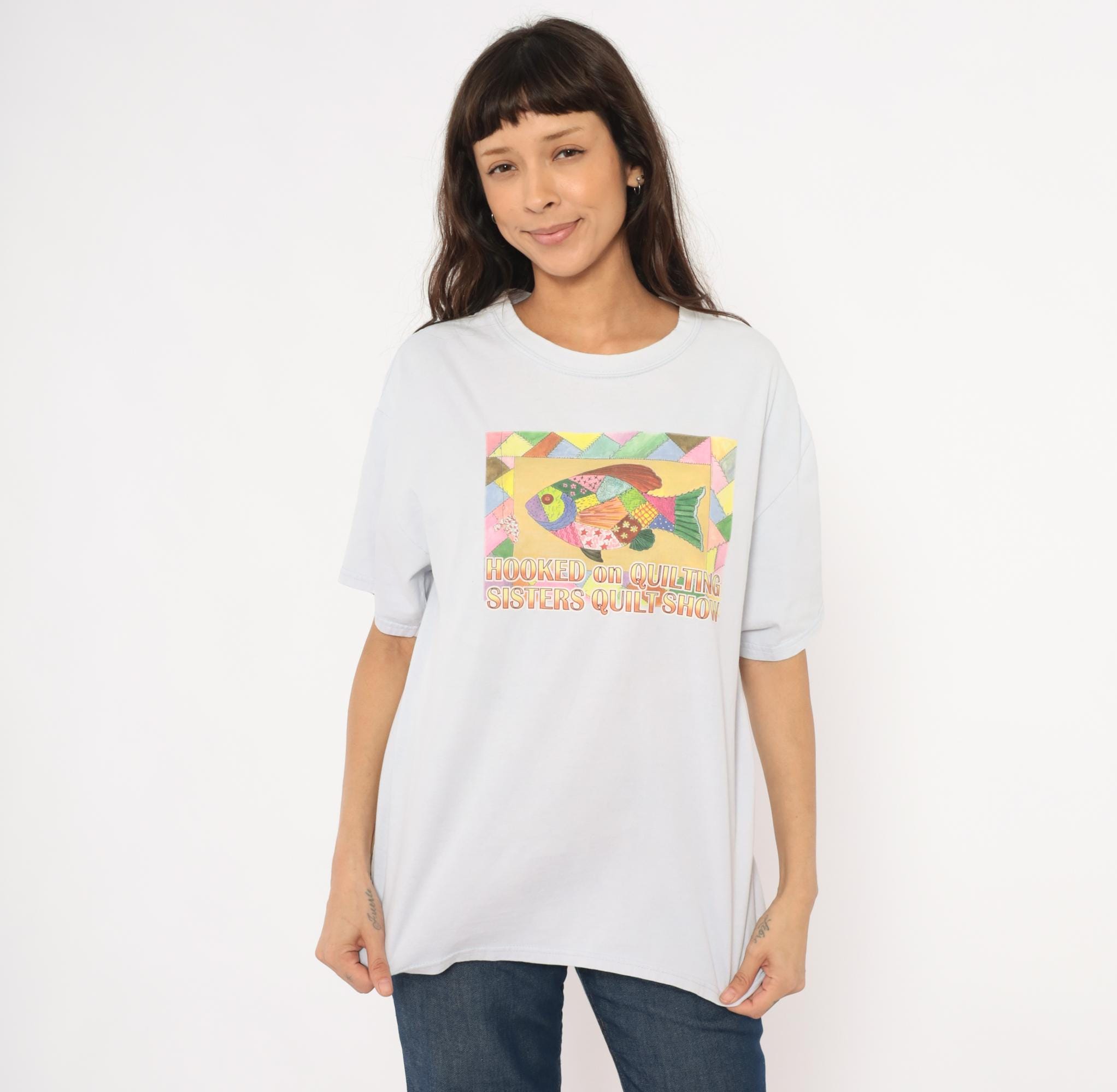 90s pale blue crew neck tee from Gildan with a colorful patchwork-style fish graphic on the front, reading "Hooked on Quilting Sisters Quilt Show." The fish illustration is composed of multicolor quilt-pattern segments in pink, green, gold, purple, and brown, surrounded by a geometric triangle border.