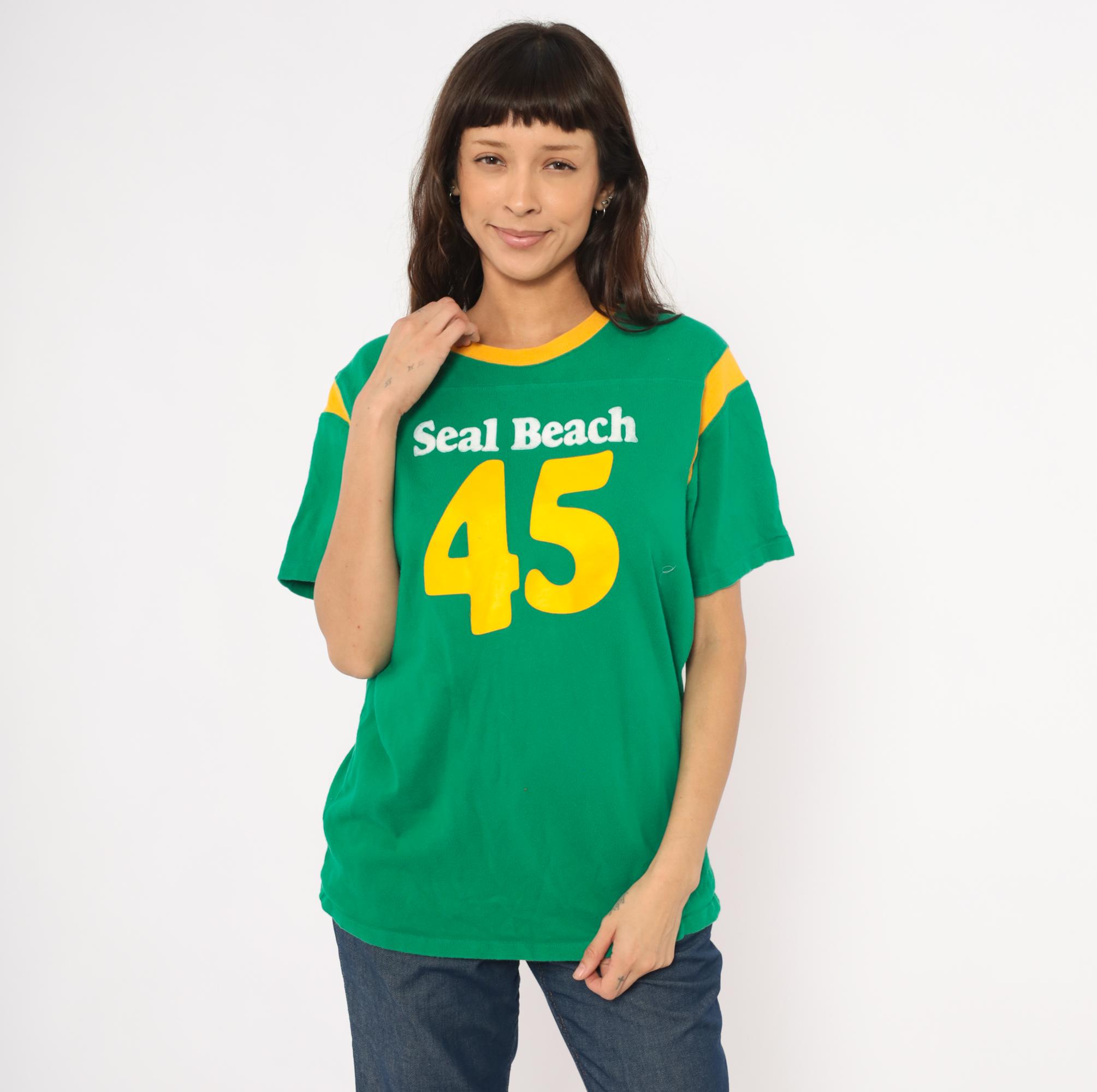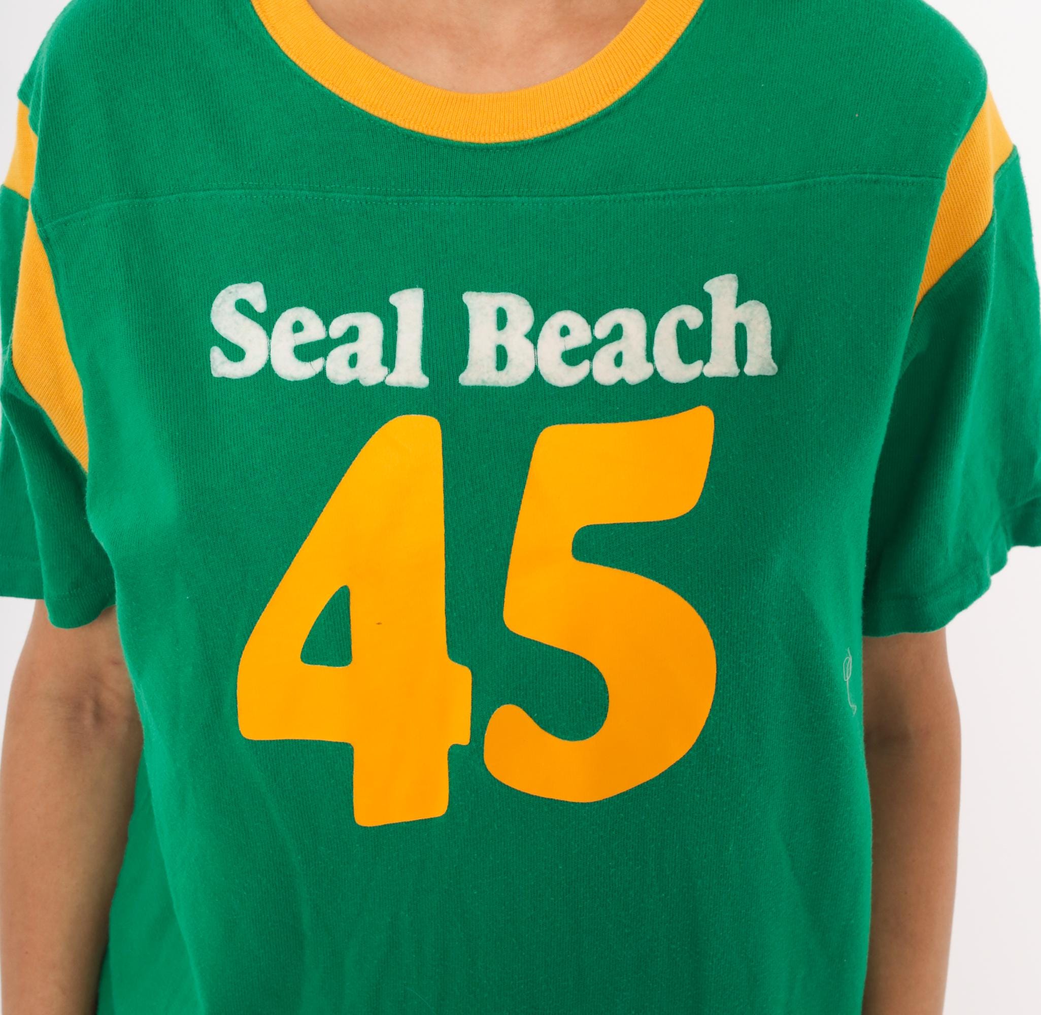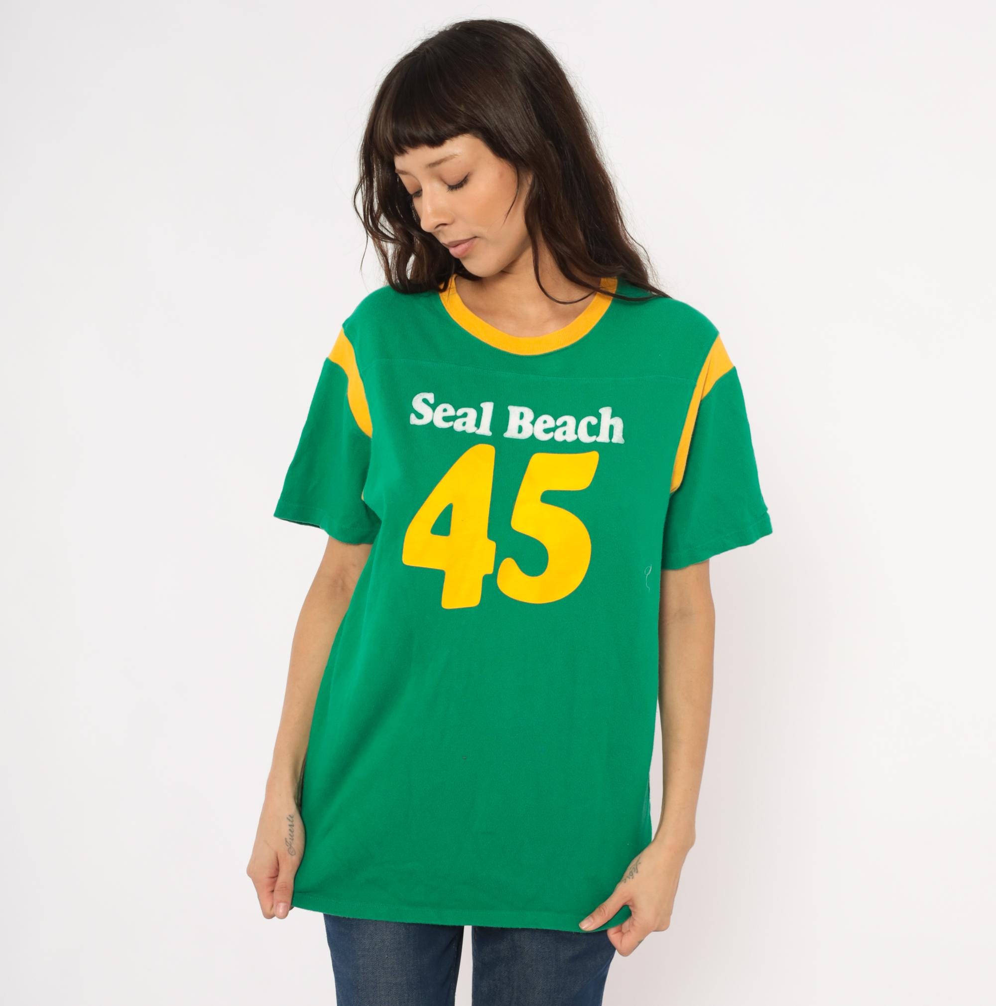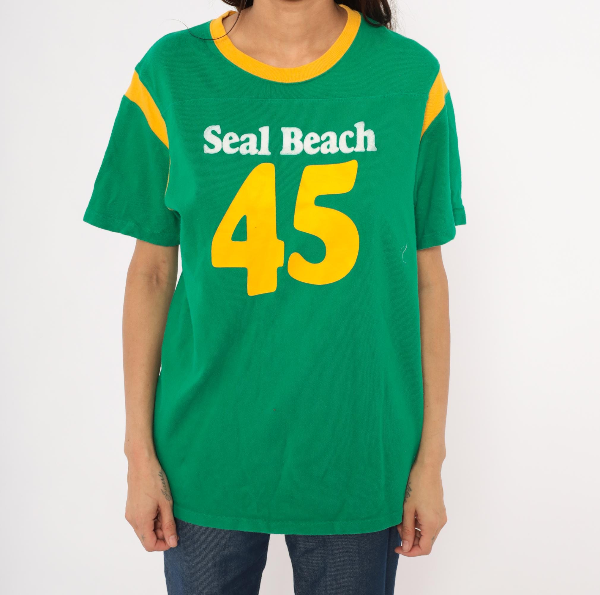 Green and gold jersey-style tee from Hollister with "Seal Beach" in white chenille lettering and a large yellow "45" graphic on the front. Crew neckline with gold contrast rib trim and curved gold shoulder stripe panels on both sides. Short sleeves, pullover construction, and a plain back with no additional graphics.