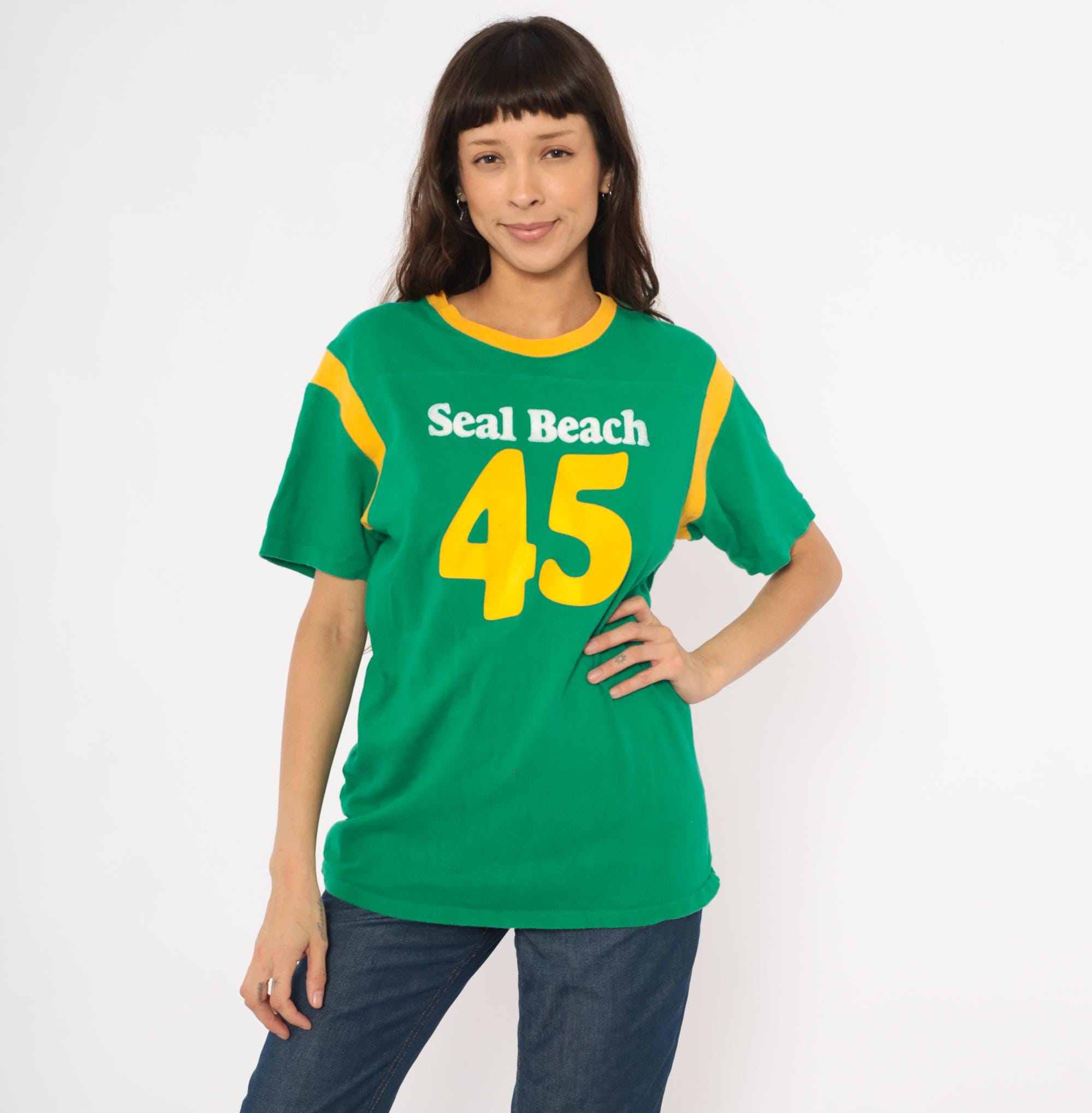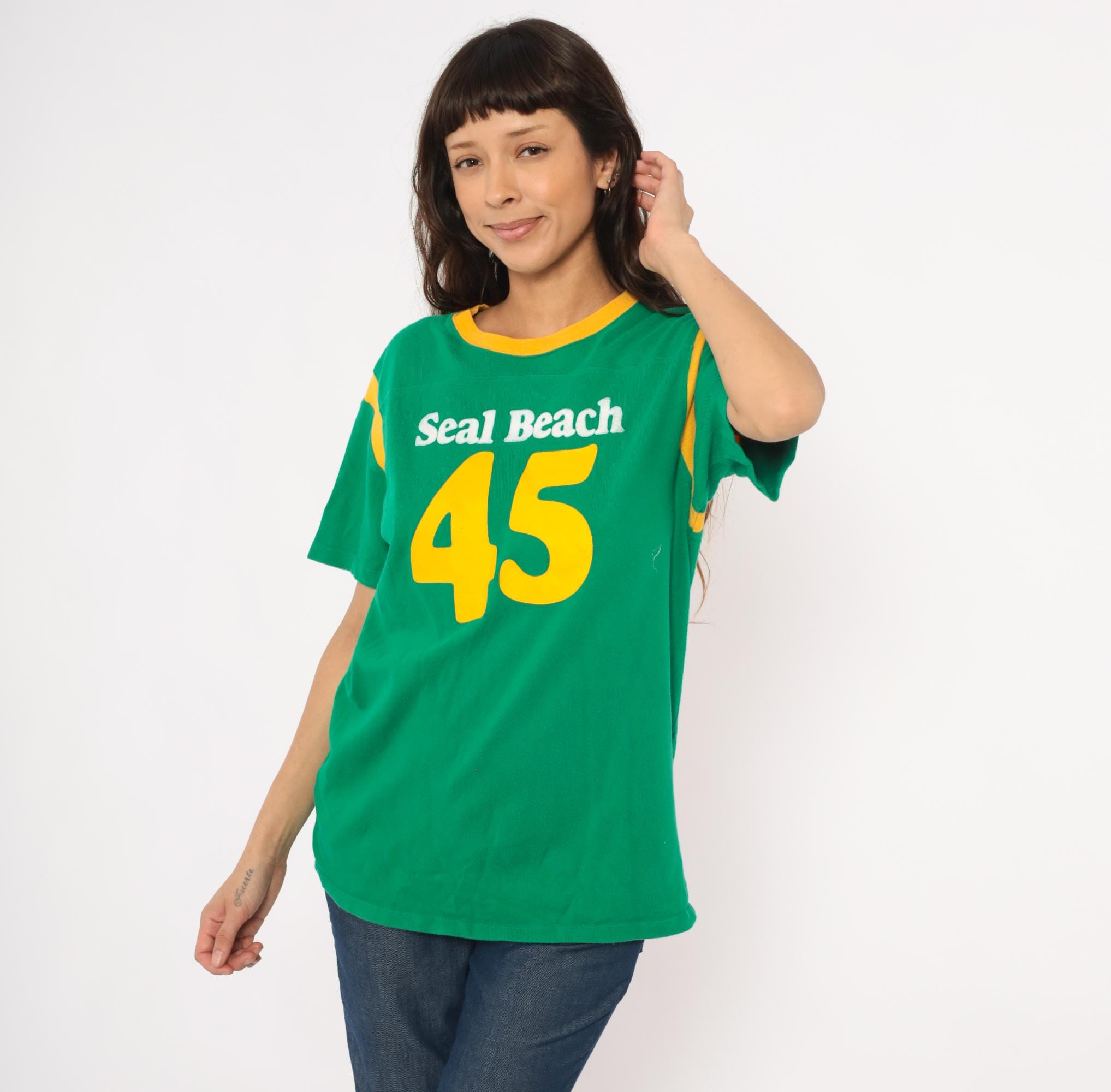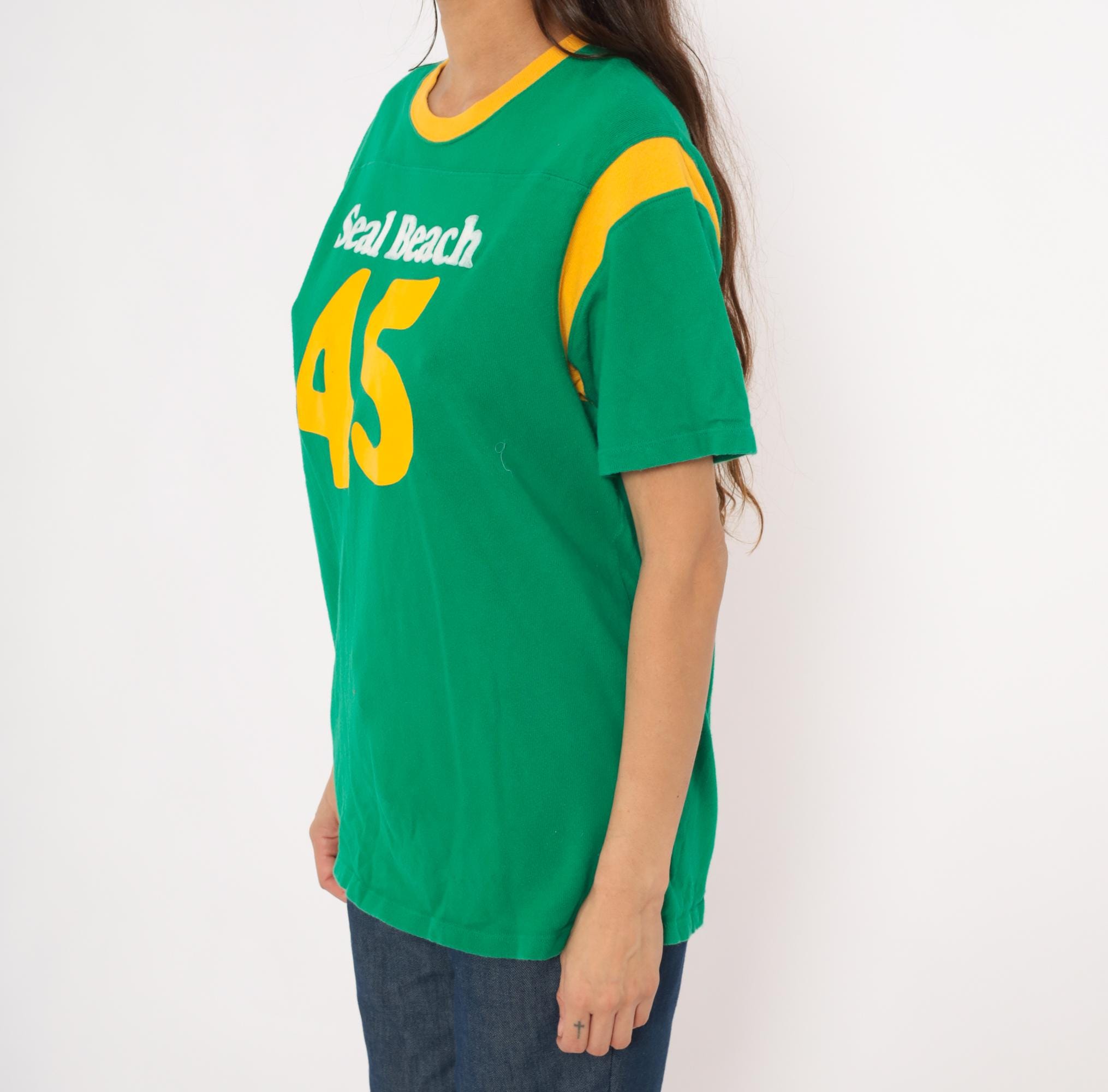 Green and gold jersey-style tee from Hollister with "Seal Beach" in white chenille lettering and a large yellow "45" graphic on the front. Crew neckline with gold contrast rib trim and curved gold shoulder stripe panels on both sides. Short sleeves, pullover construction, and a plain back with no additional graphics.