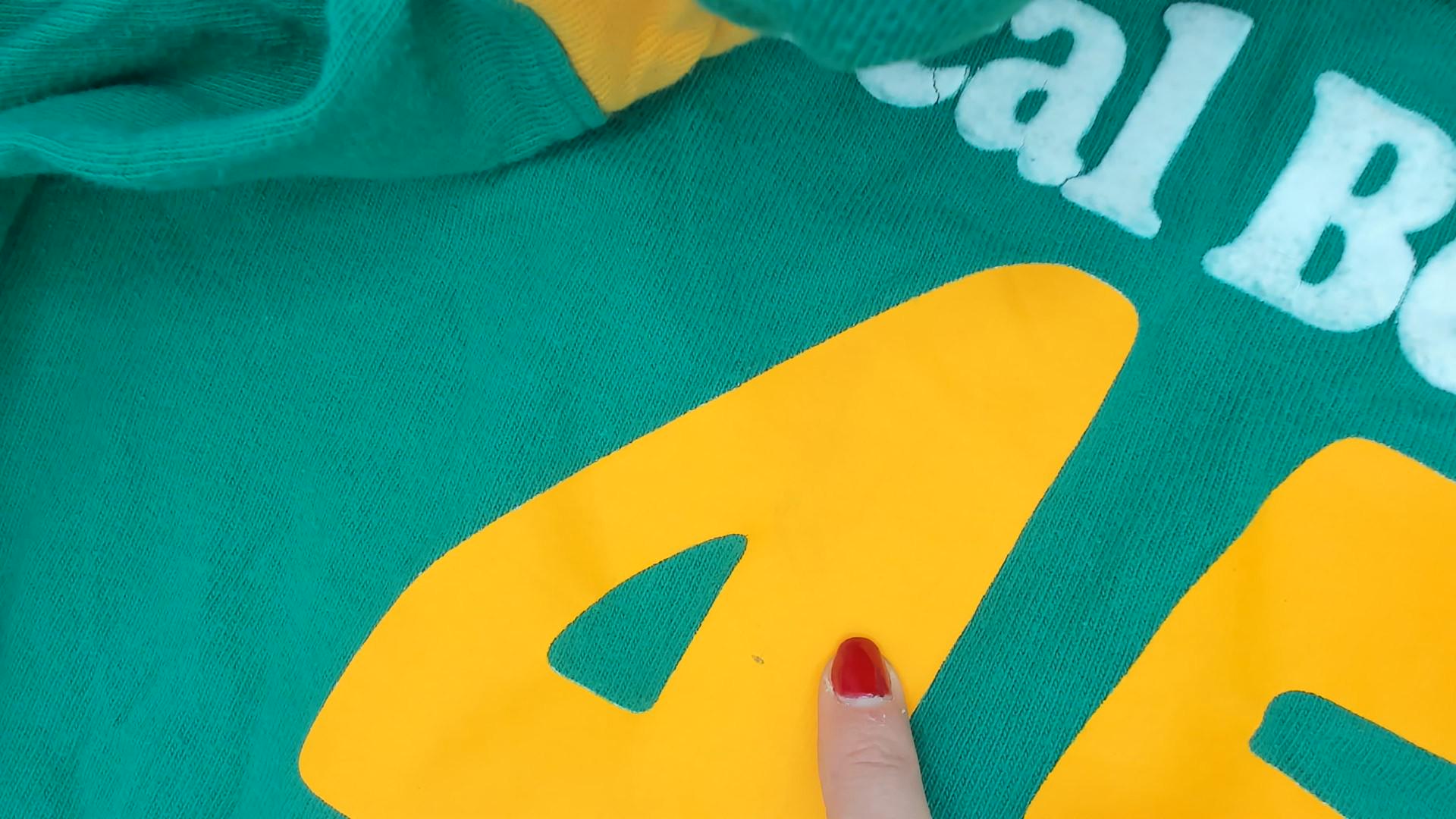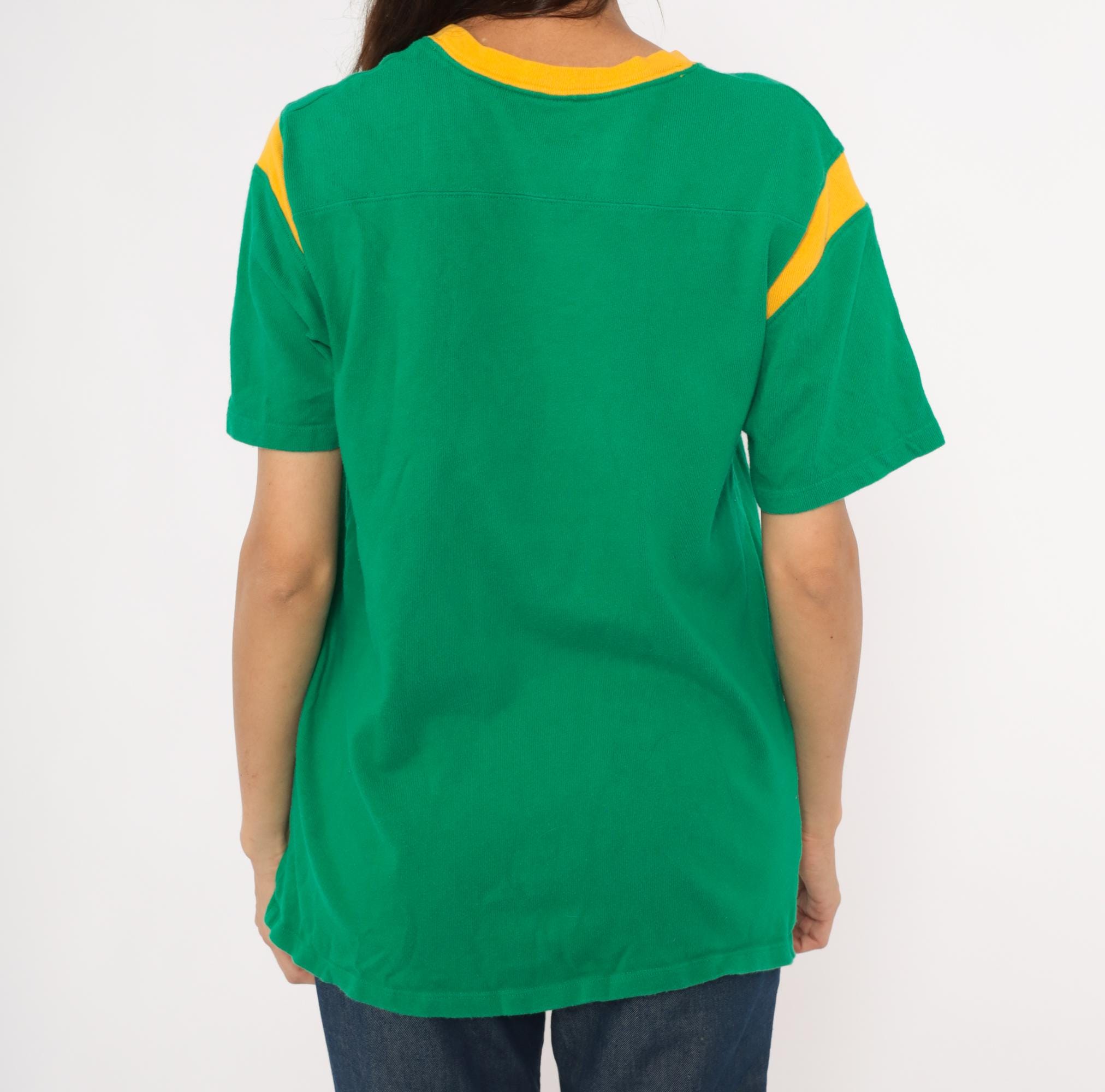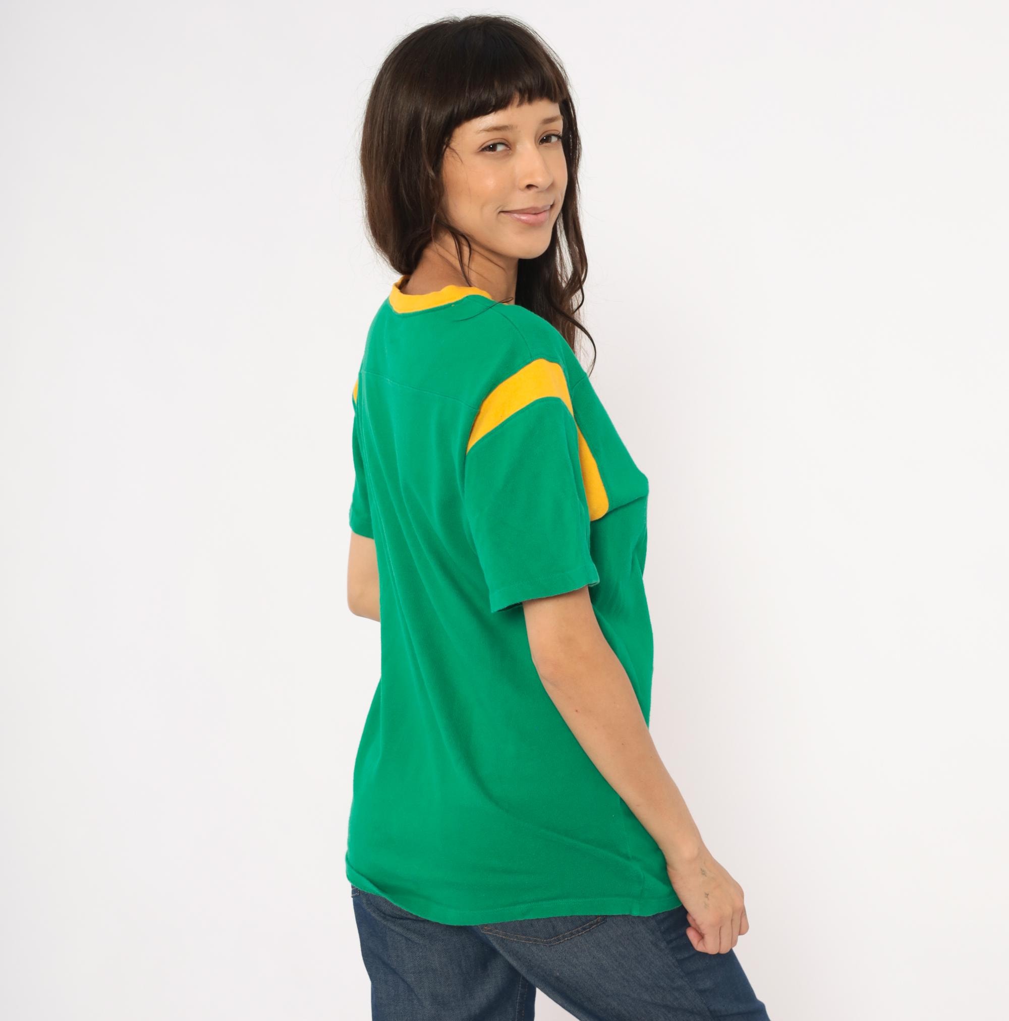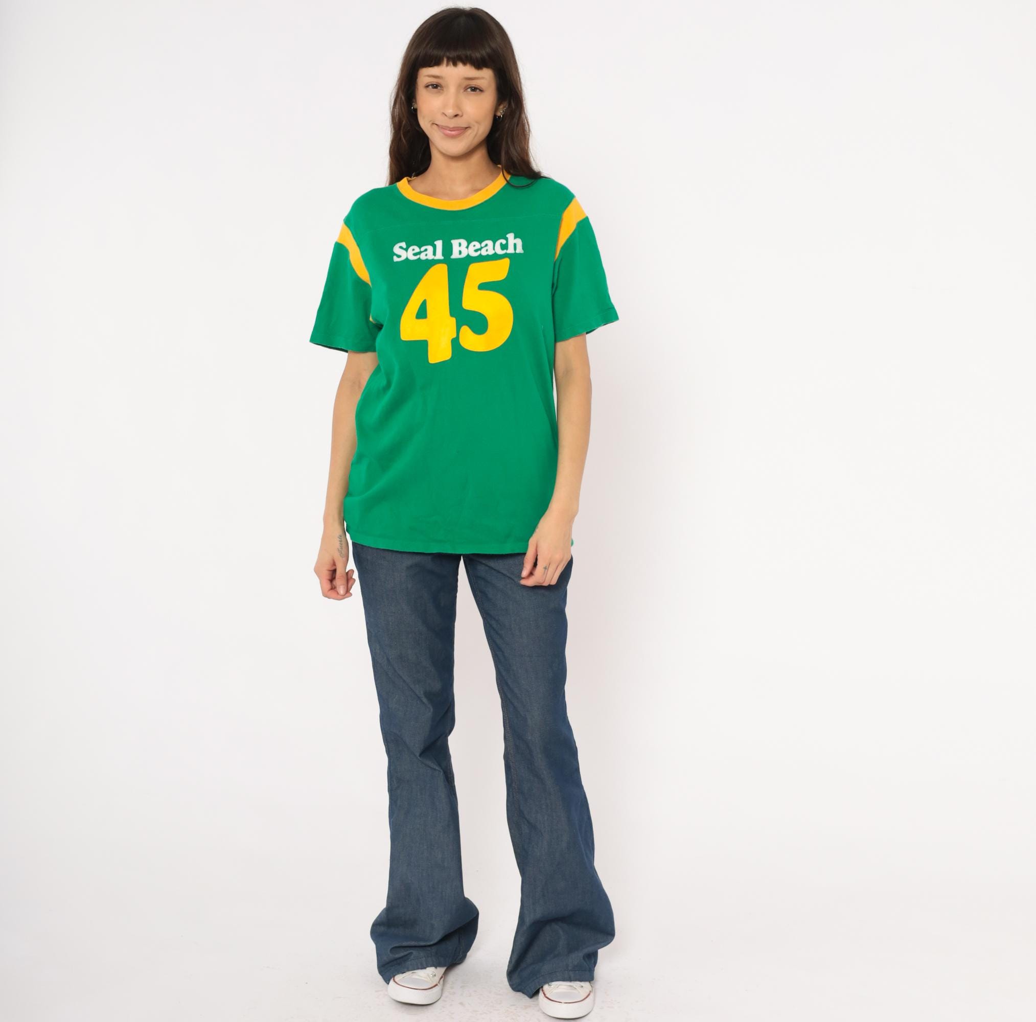 Green and gold jersey-style tee from Hollister with "Seal Beach" in white chenille lettering and a large yellow "45" graphic on the front. Crew neckline with gold contrast rib trim and curved gold shoulder stripe panels on both sides. Short sleeves, pullover construction, and a plain back with no additional graphics.