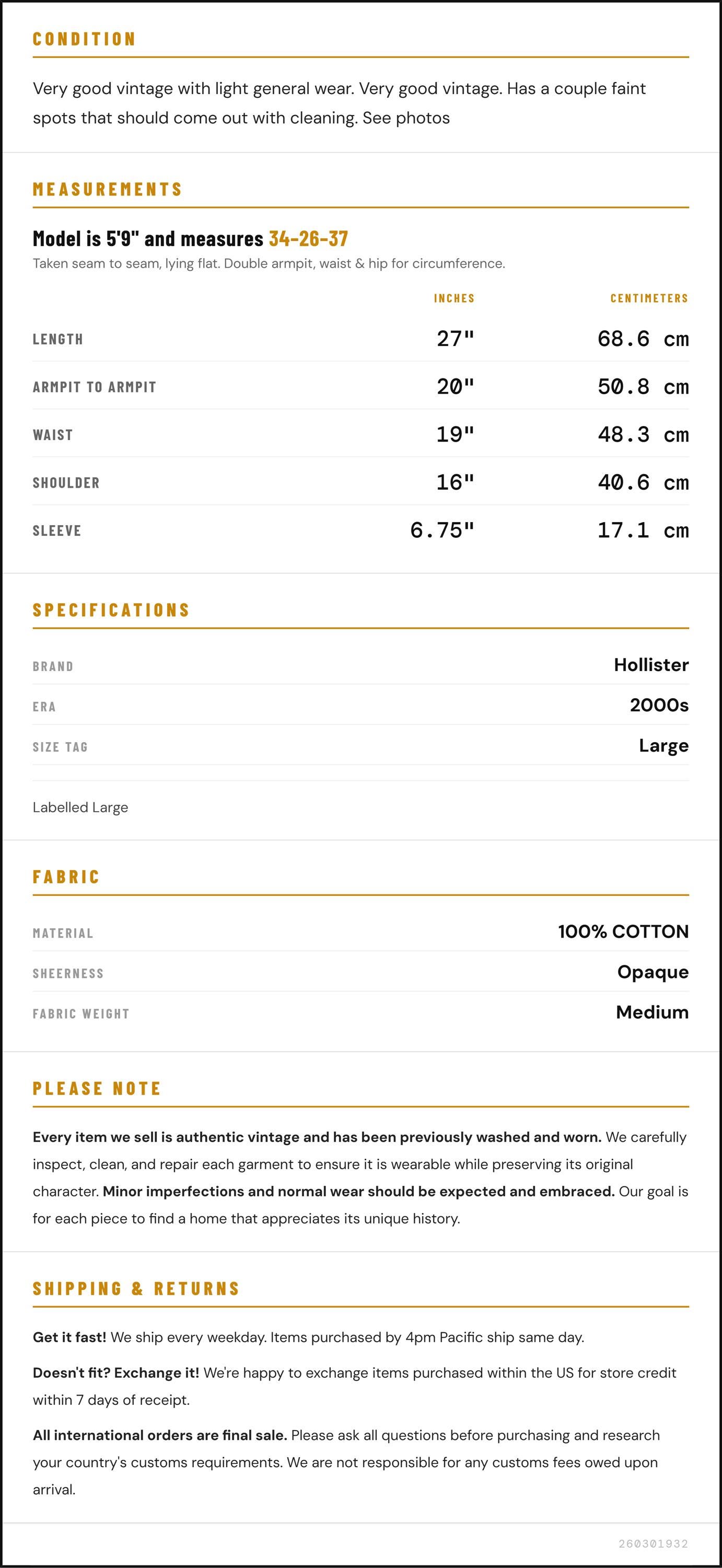 Vintage denim was usually made without any stretch, unlike modern jeans. Check the measurements to ensure proper fit, and remember to give yourself a little wiggle room in the waist and hips, depending on your preferred fit.