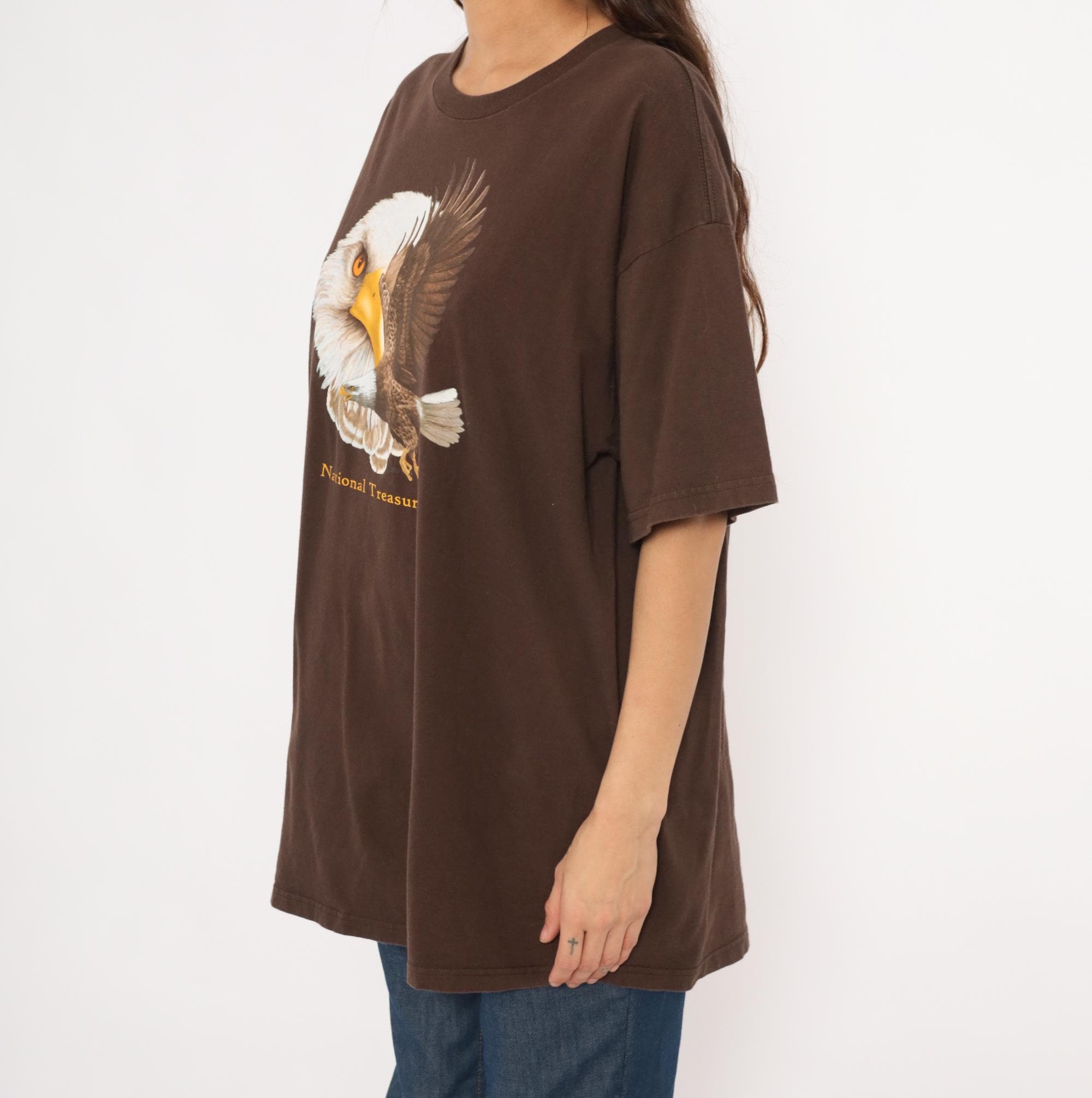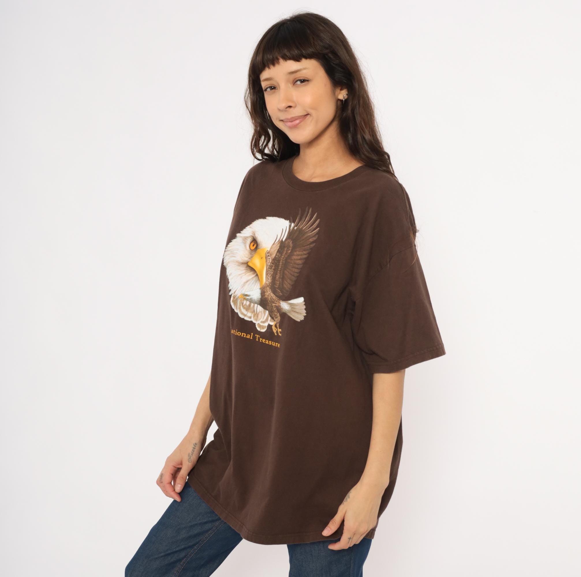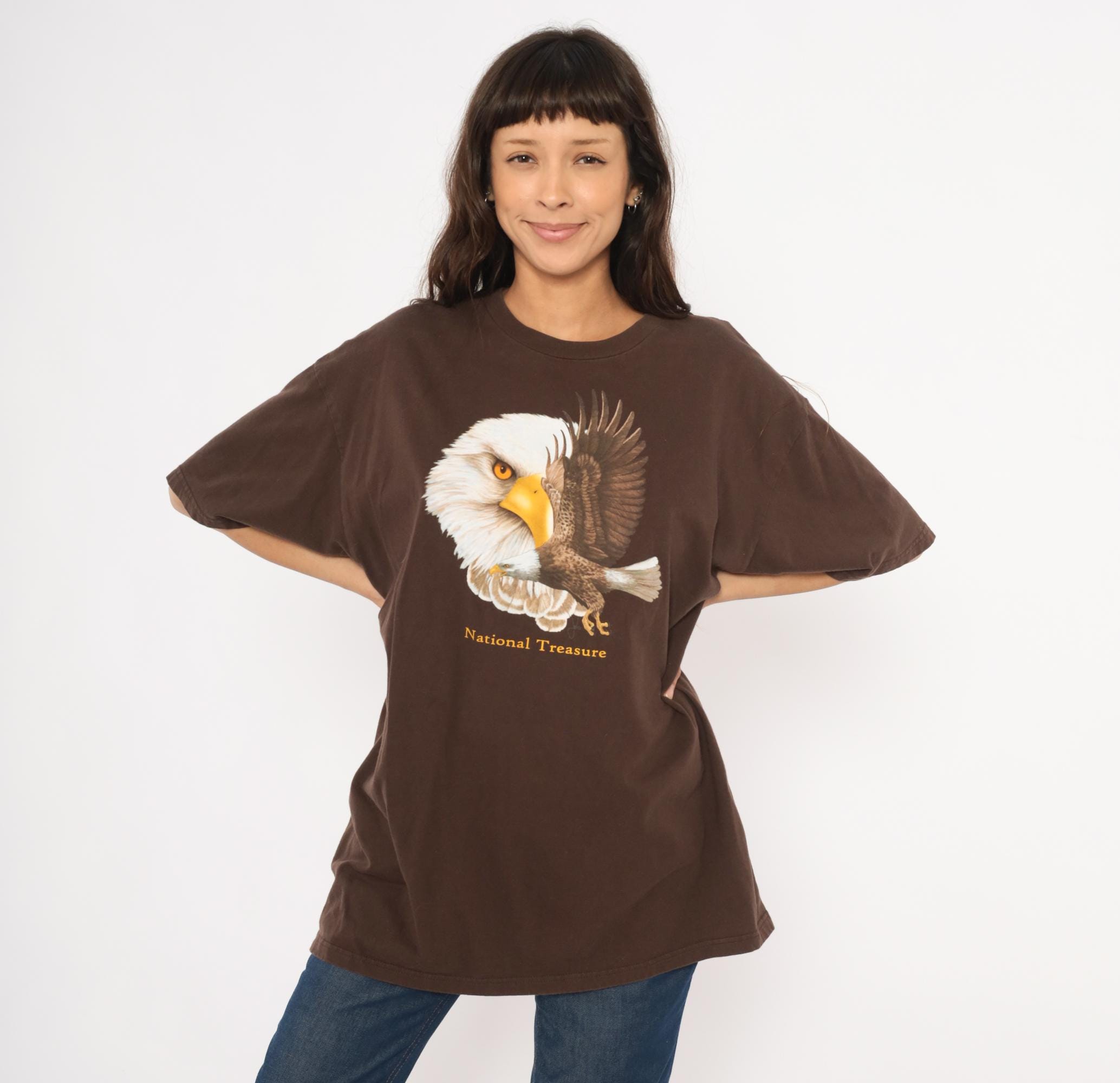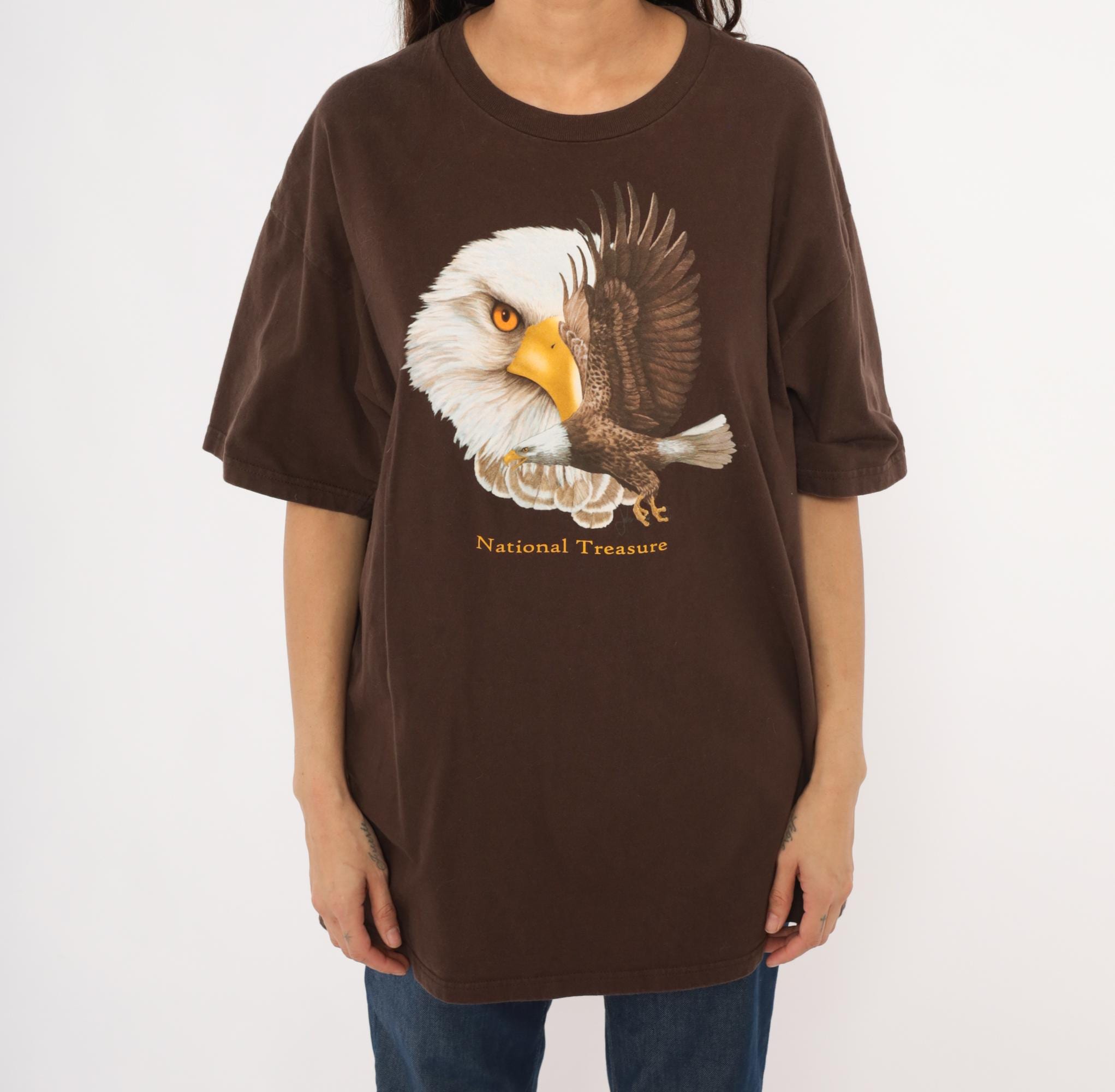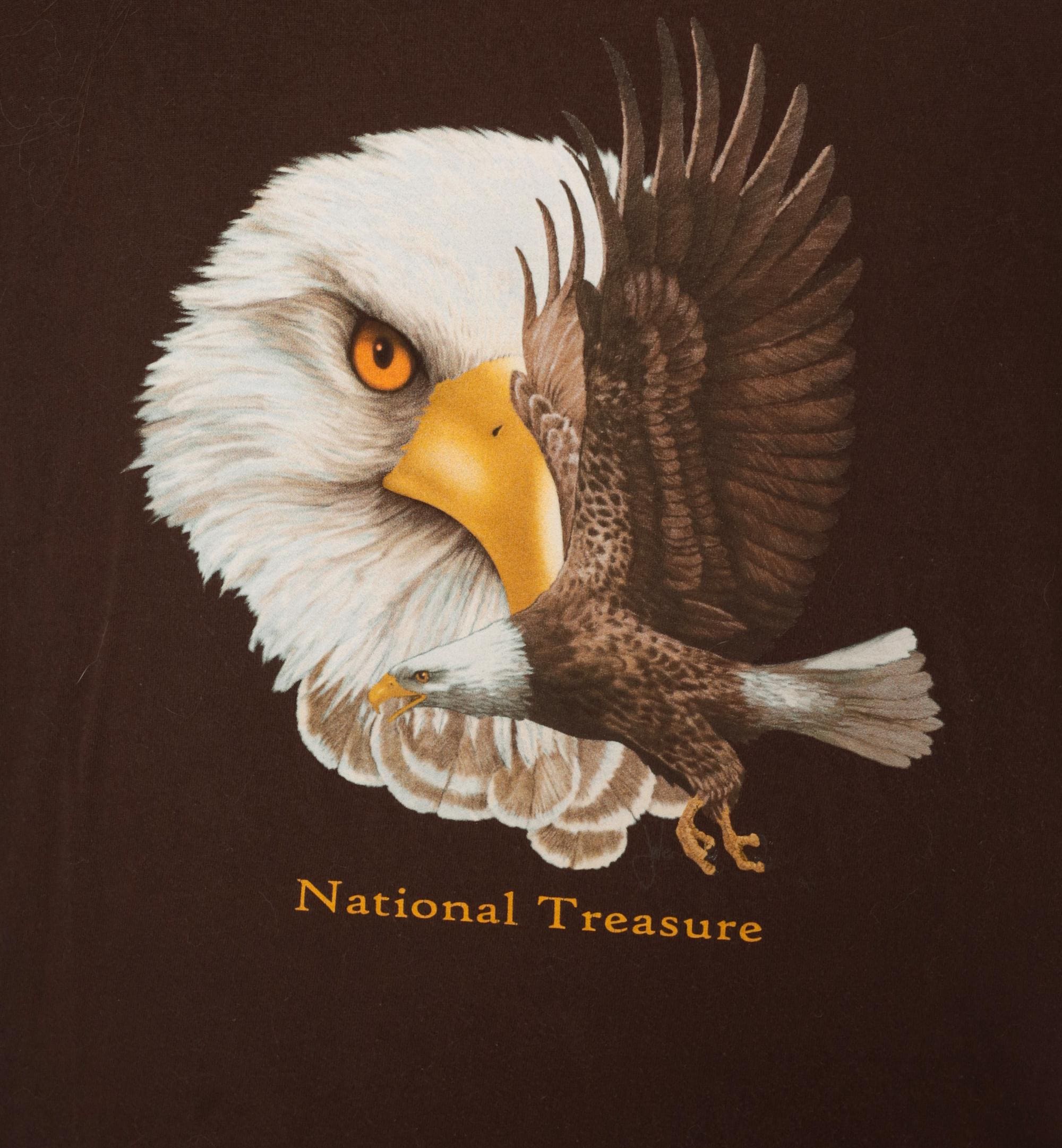 2000s brown graphic tee from Ringspun Apparel with a large bald eagle illustration across the front chest. A close-up eagle head portrait overlaps with a full-body eagle in flight, printed in white, golden yellow, and brown tones. Gold "National Treasure" text beneath the graphic, crew neckline, short sleeves, and a relaxed straight body throughout.