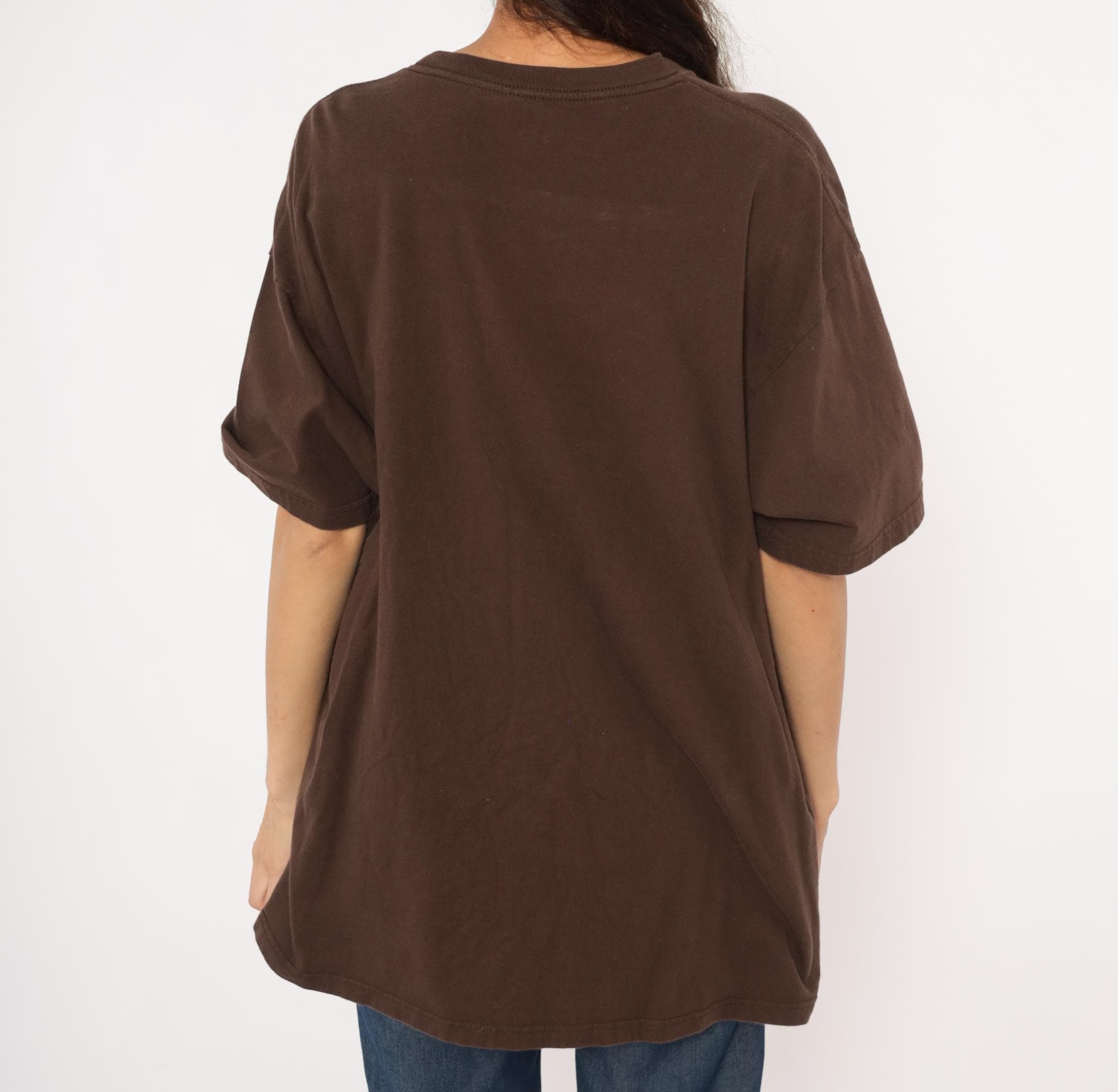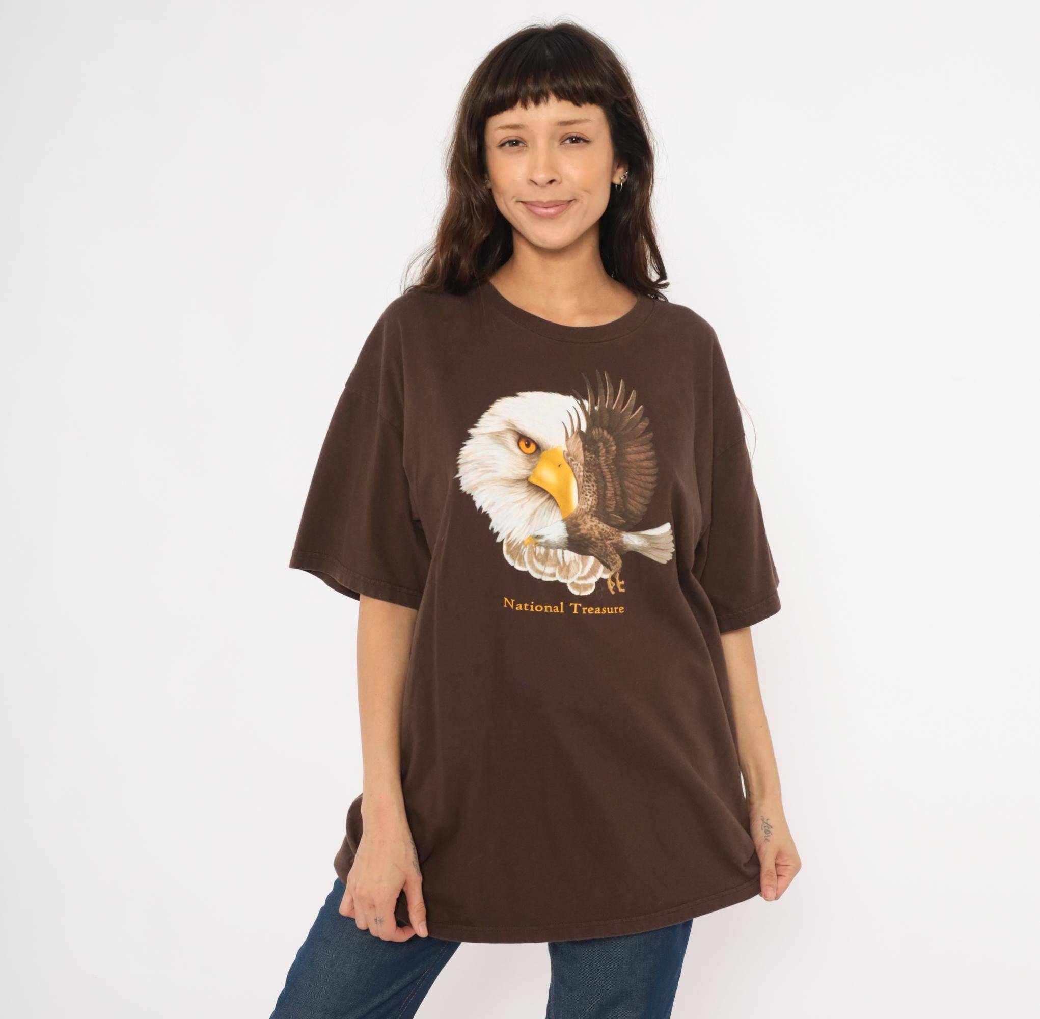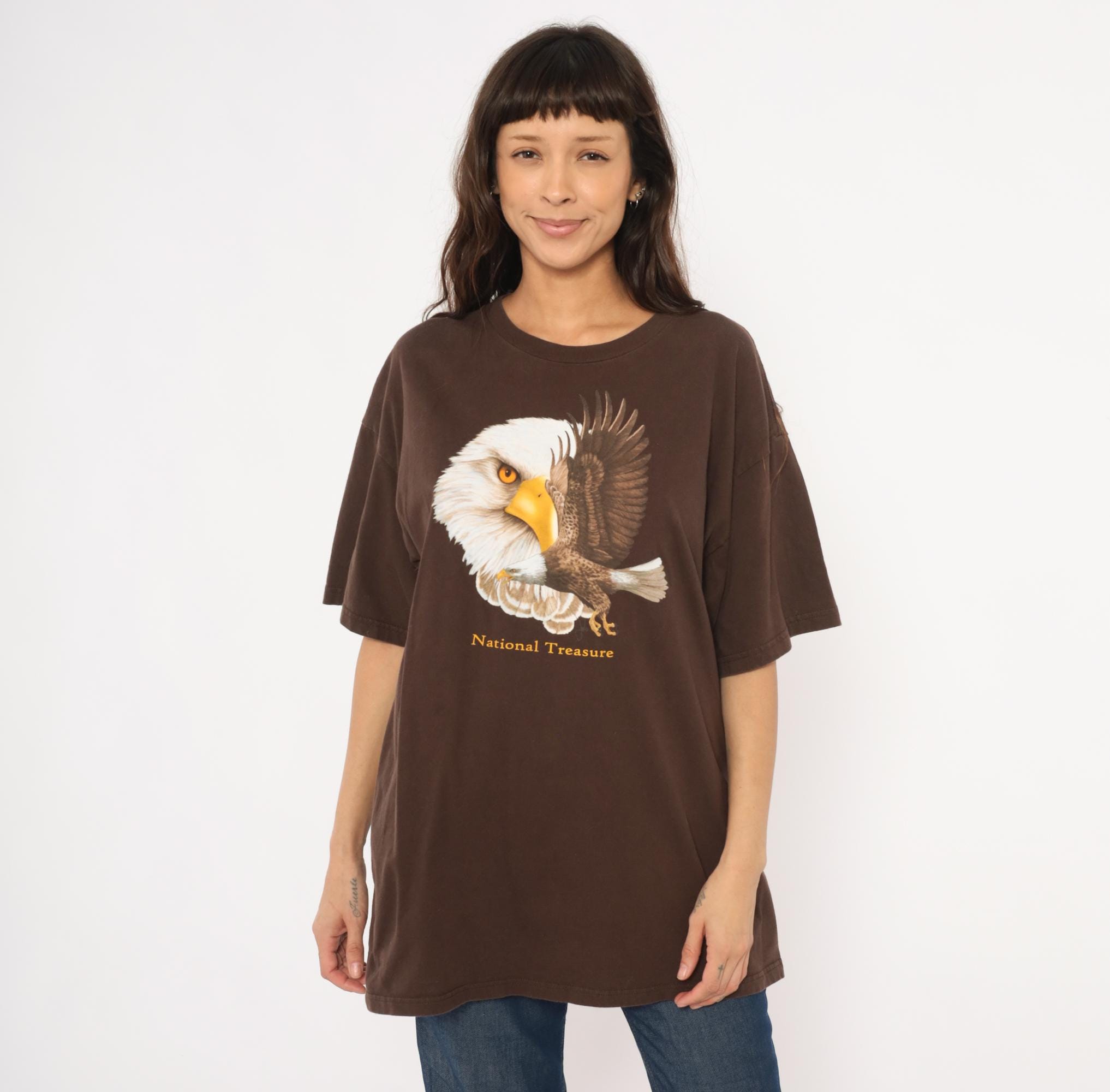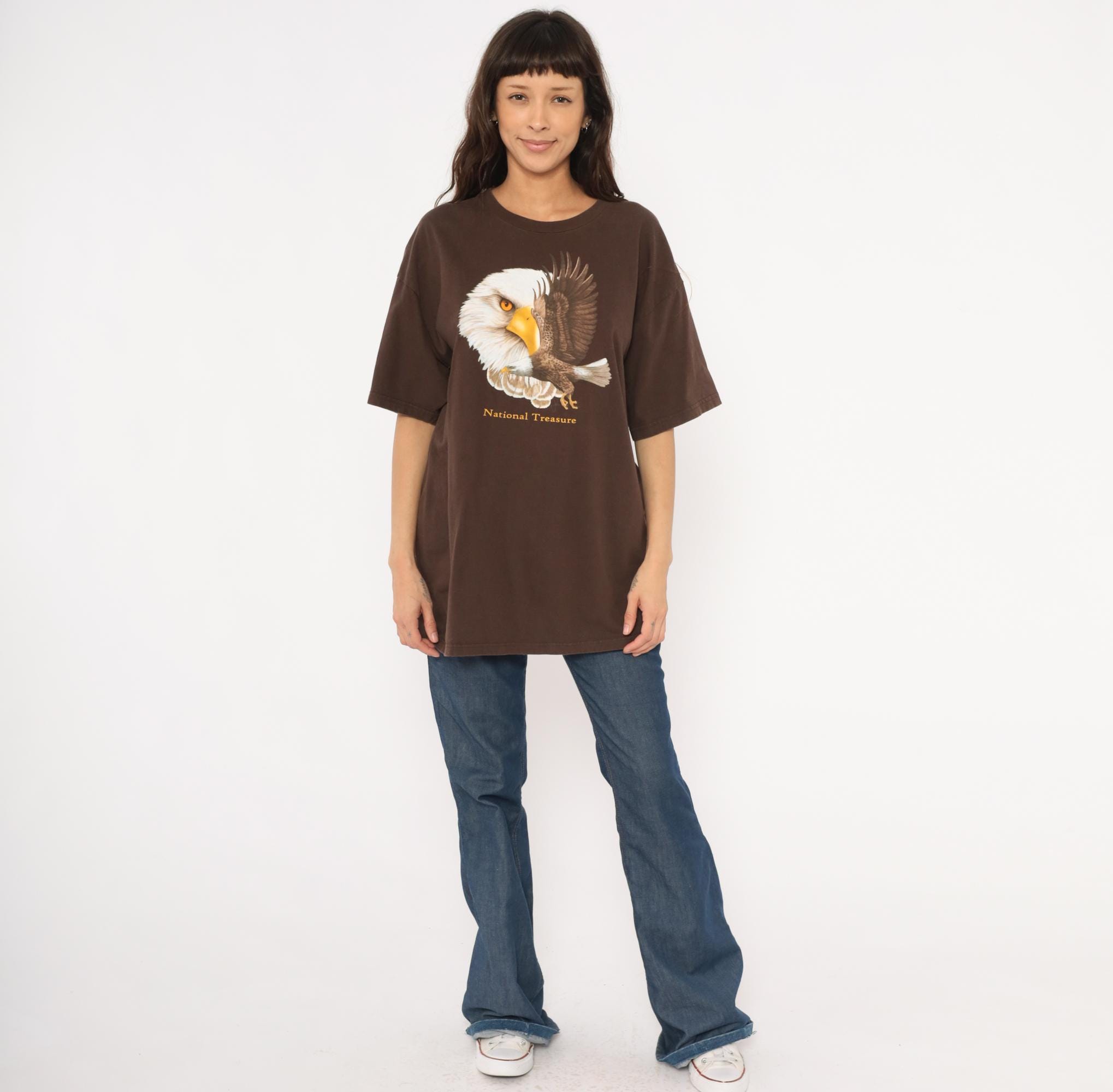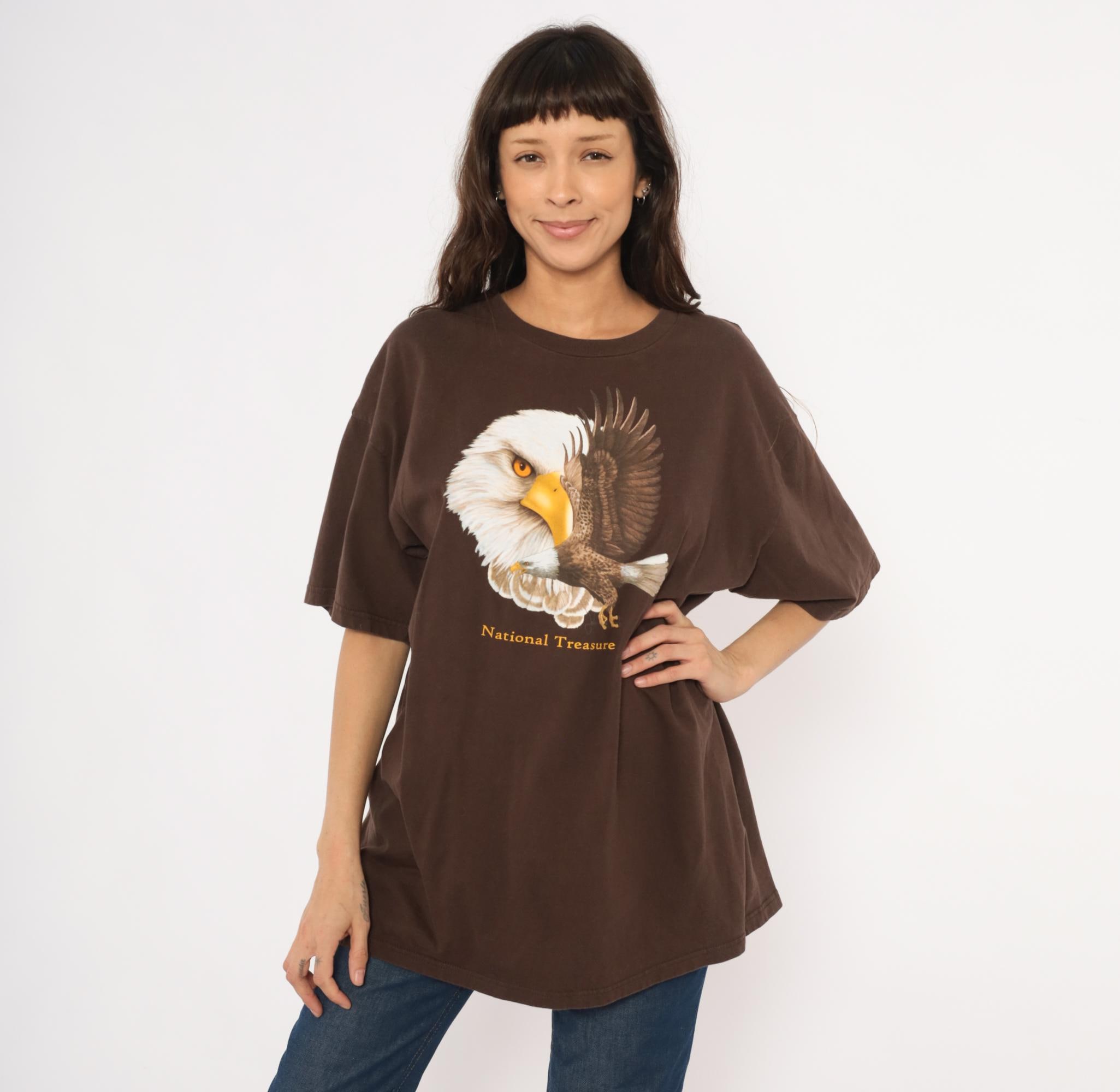 2000s brown graphic tee from Ringspun Apparel with a large bald eagle illustration across the front chest. A close-up eagle head portrait overlaps with a full-body eagle in flight, printed in white, golden yellow, and brown tones. Gold "National Treasure" text beneath the graphic, crew neckline, short sleeves, and a relaxed straight body throughout.