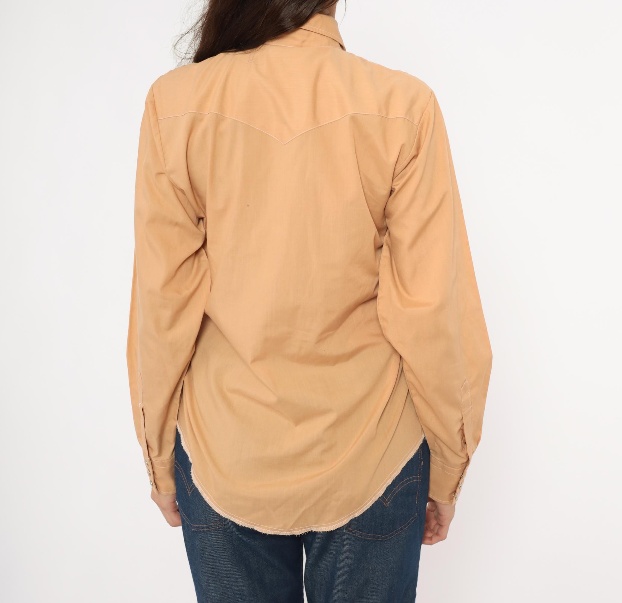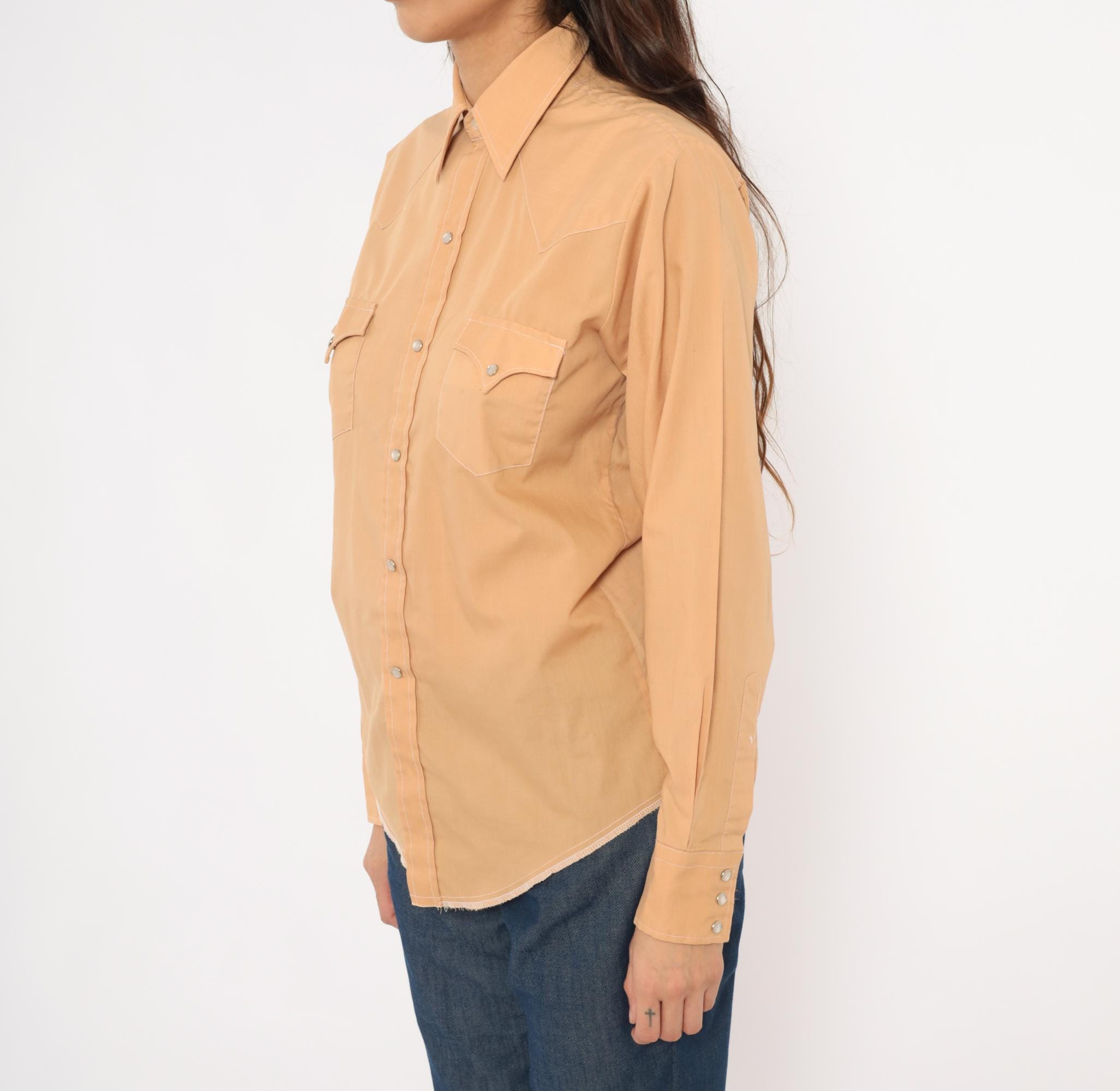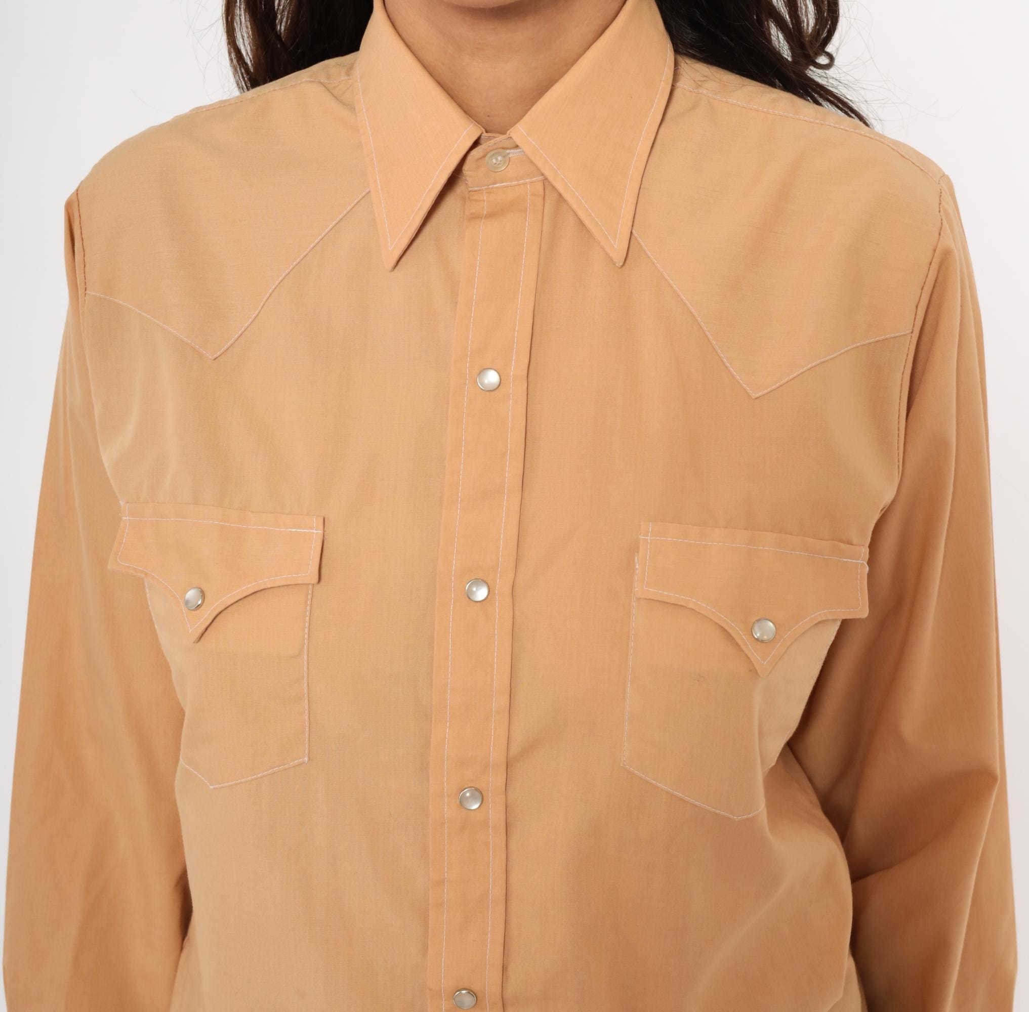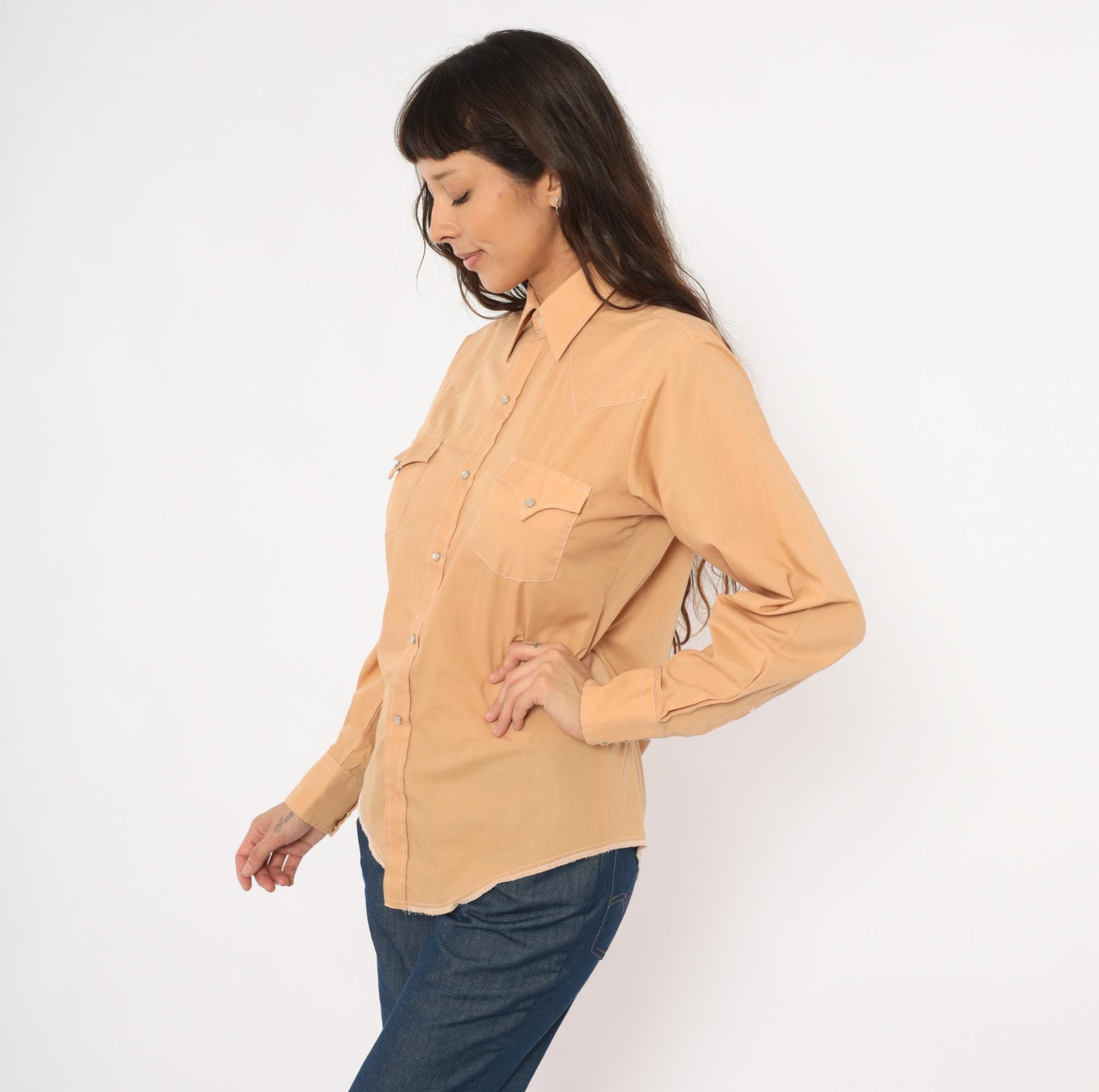 80s Western Fashions pearl snap shirt in a warm peach-tan color with pointed collar and classic western yoke detailing across the chest and back. Two front flap pockets with snap closures, full snap front placket, and long sleeves with snap cuffs. Raw hem along the bottom edge and contrast topstitching throughout.