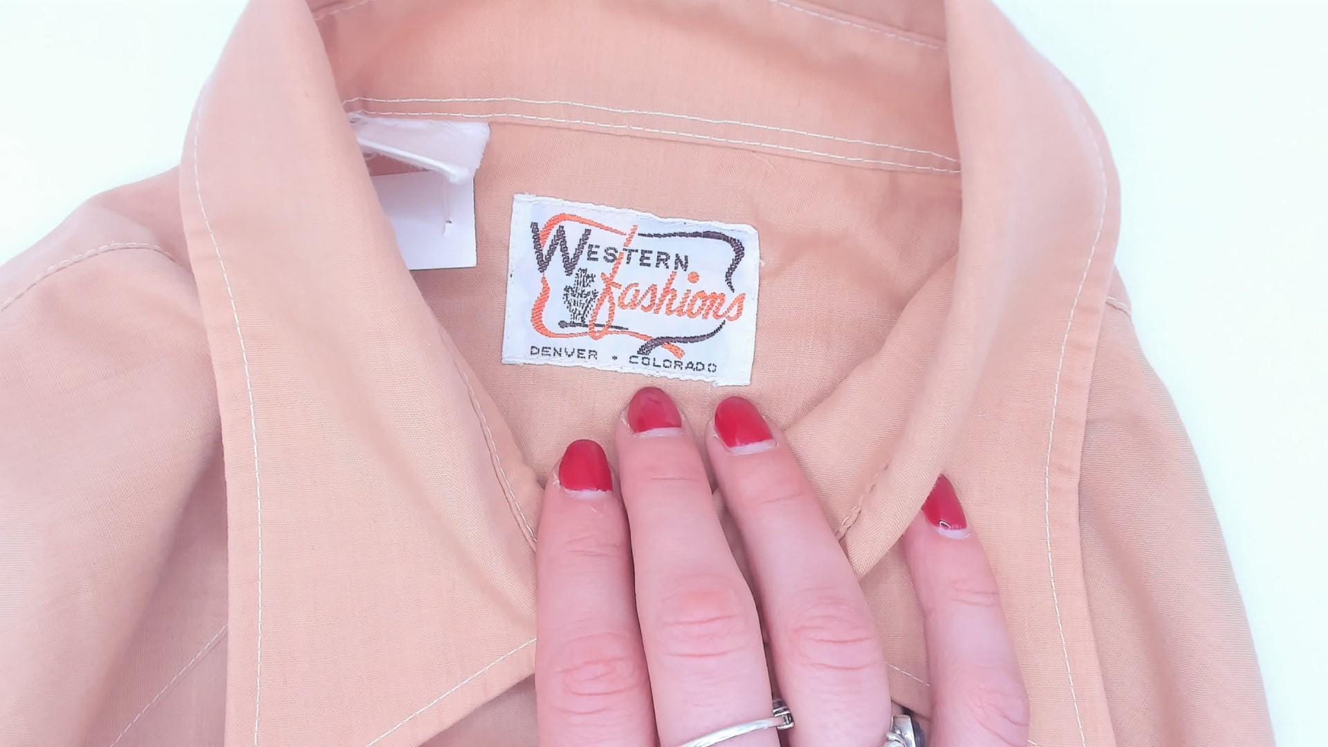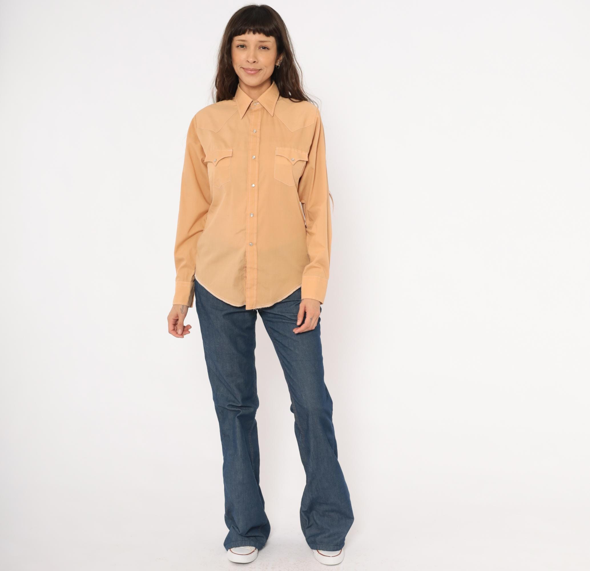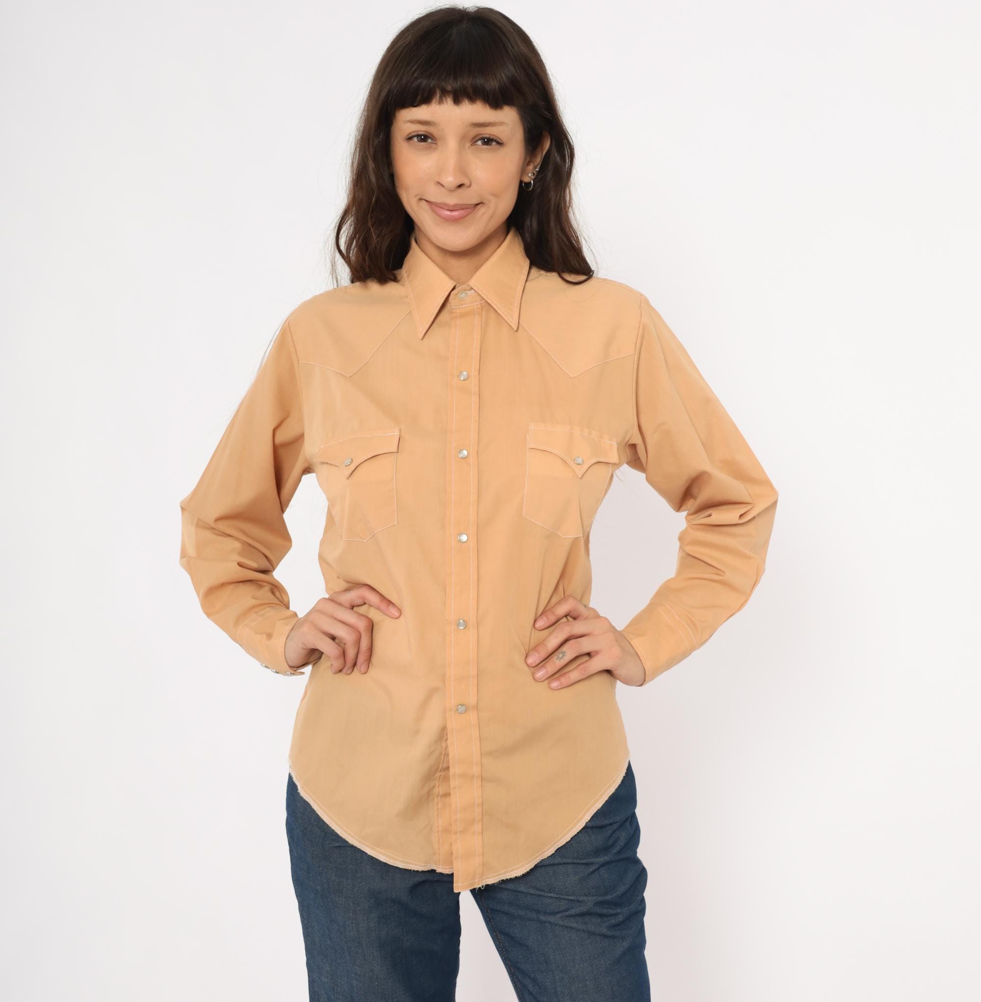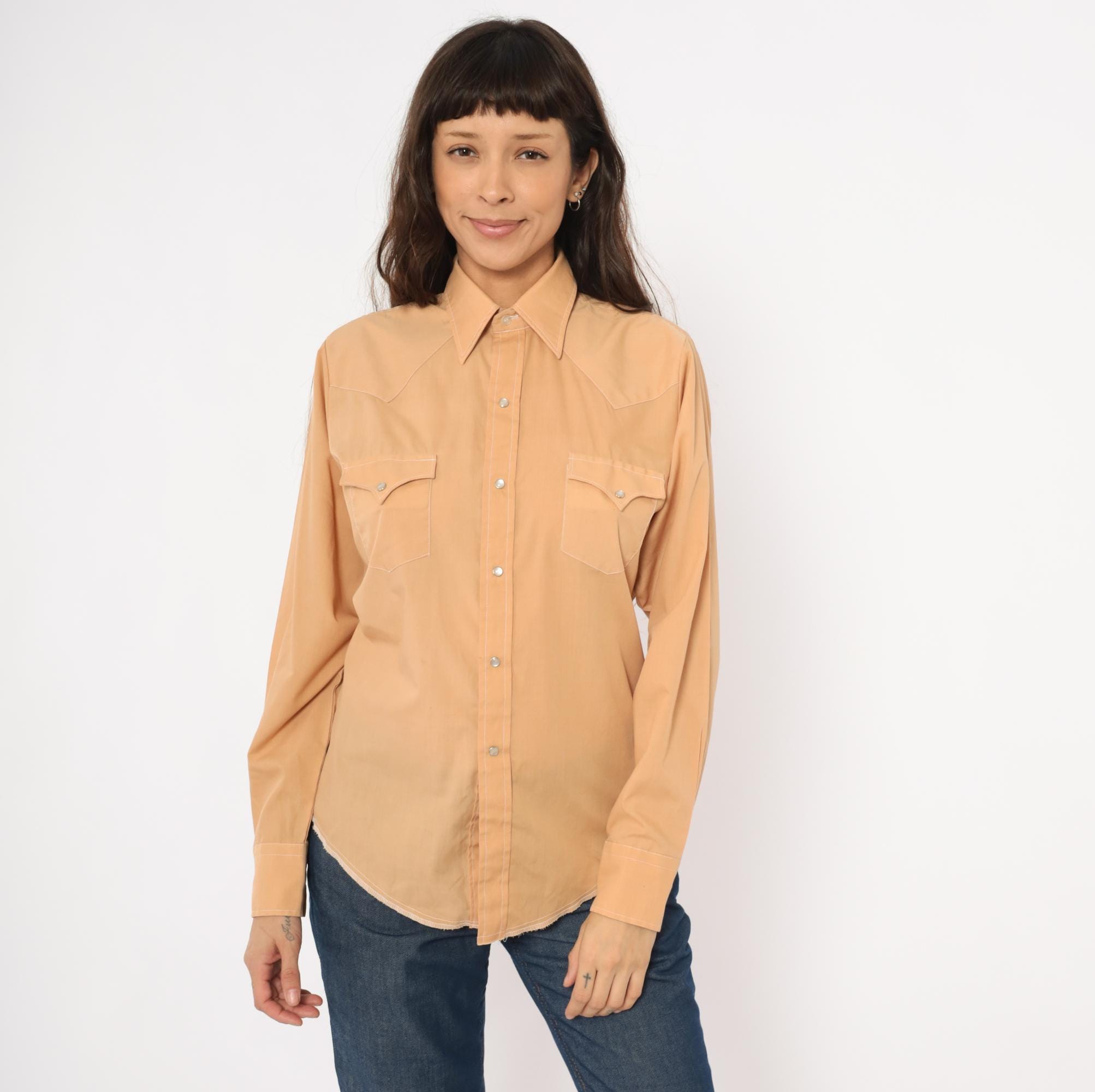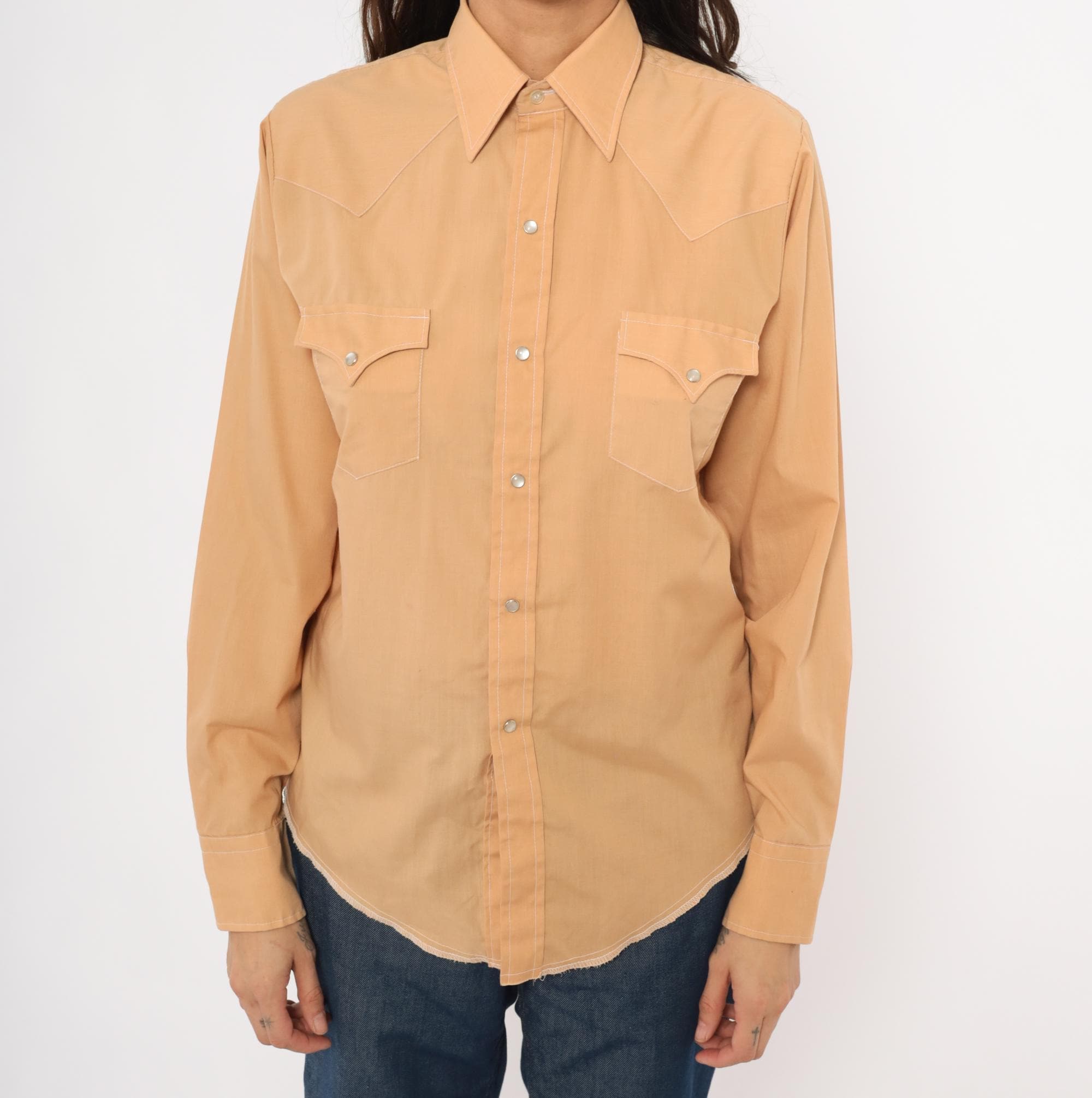 80s Western Fashions pearl snap shirt in a warm peach-tan color with pointed collar and classic western yoke detailing across the chest and back. Two front flap pockets with snap closures, full snap front placket, and long sleeves with snap cuffs. Raw hem along the bottom edge and contrast topstitching throughout.