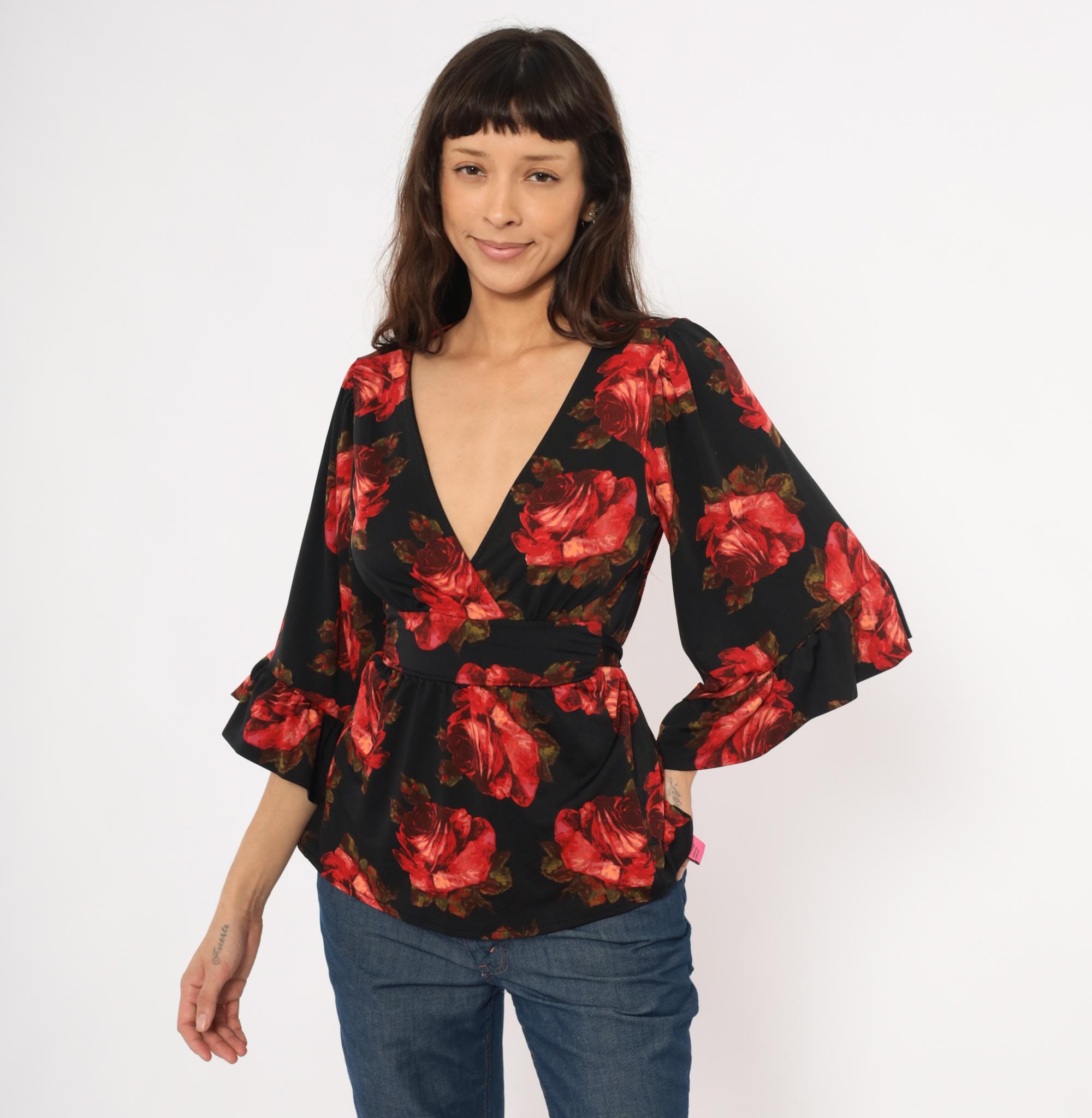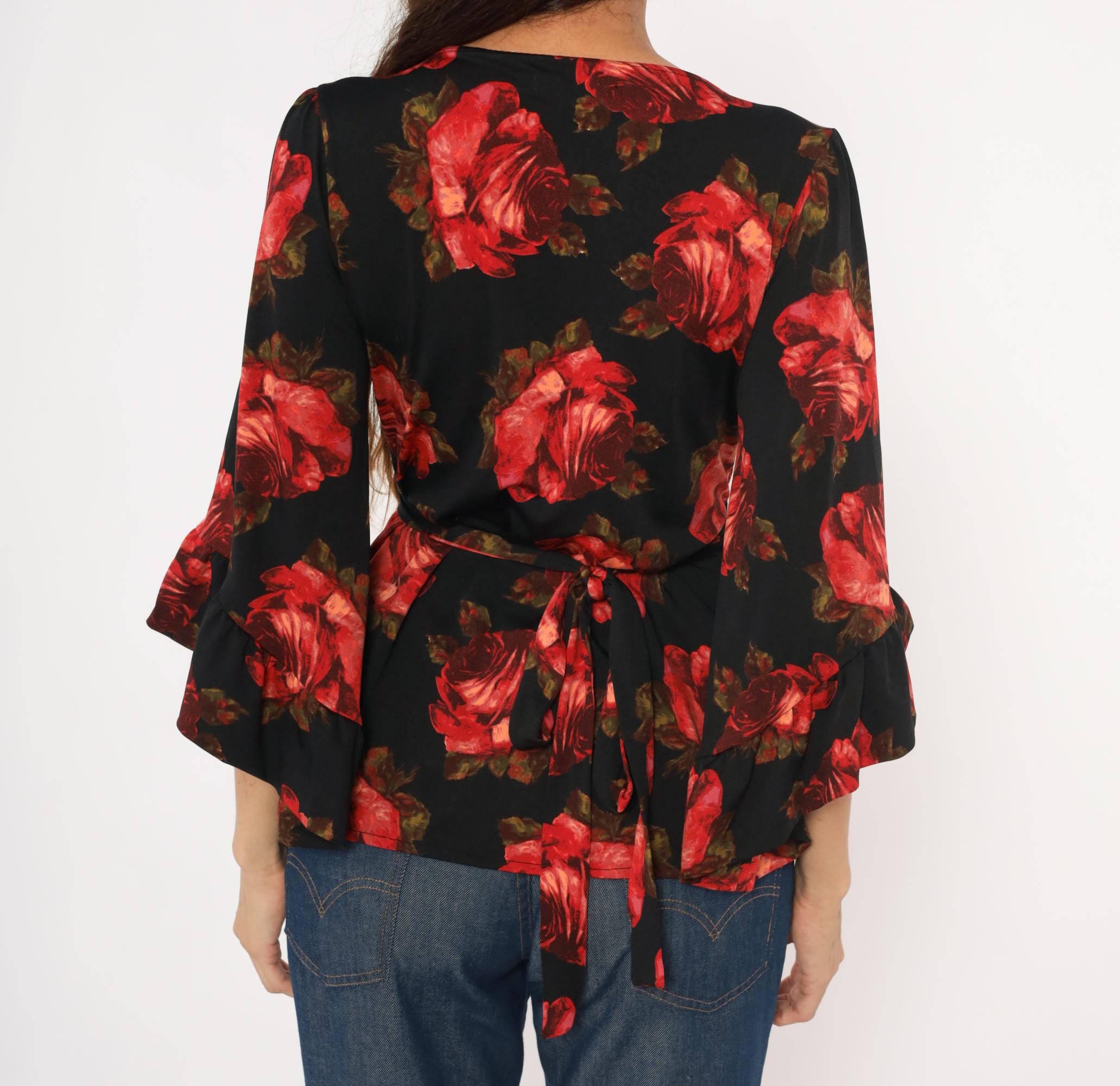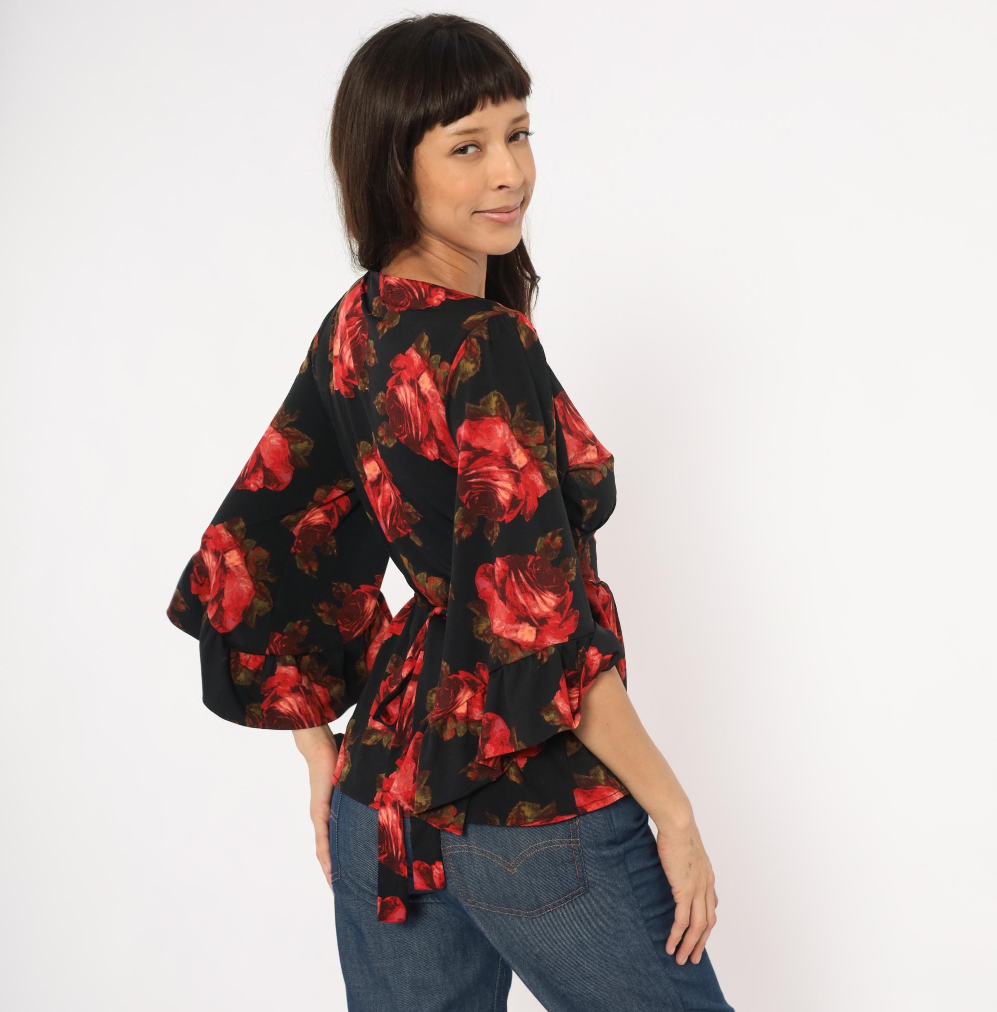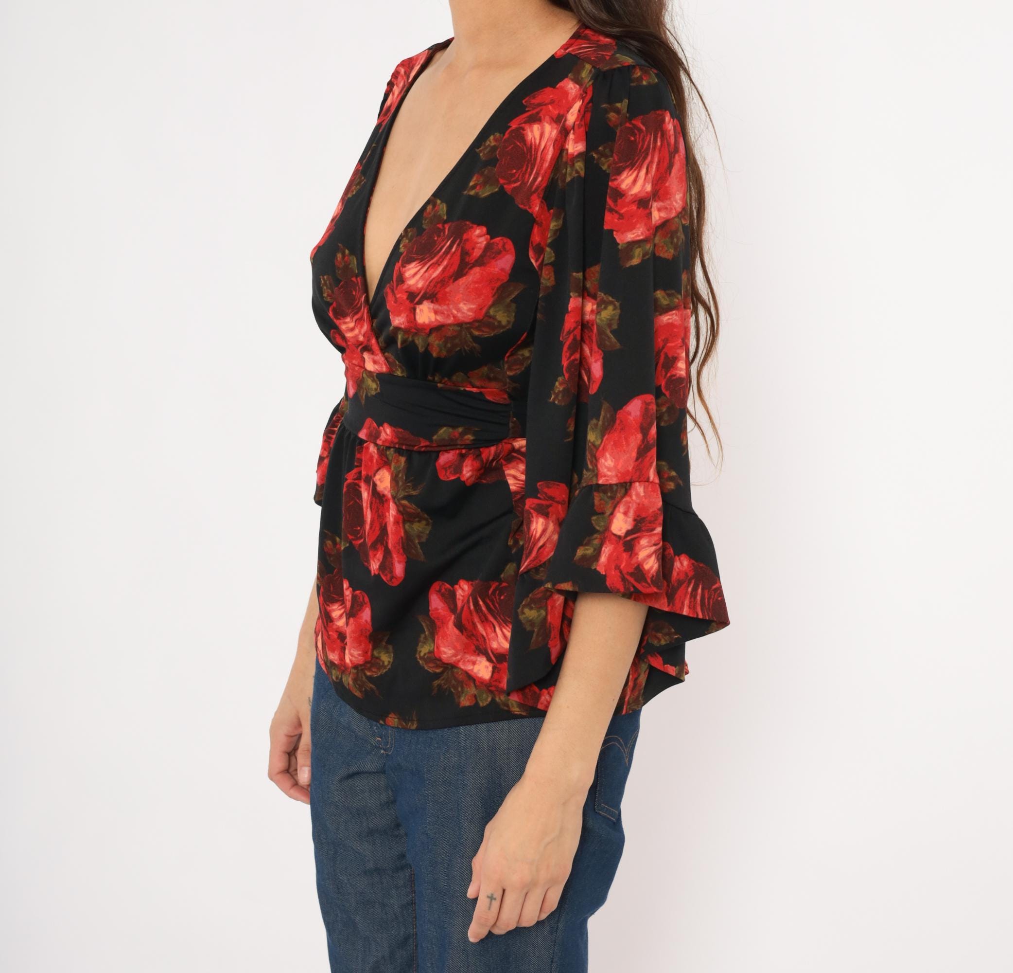 2000s Betsey Johnson wrap top in black with large red and crimson rose print throughout, accented by olive green leaves. Deep V neckline with surplice crossover bodice and cinched waist with long tie closure at the back. Three-quarter length bell sleeves with wide flared cuffs, and a peplum-style hem that sits at the hip.
