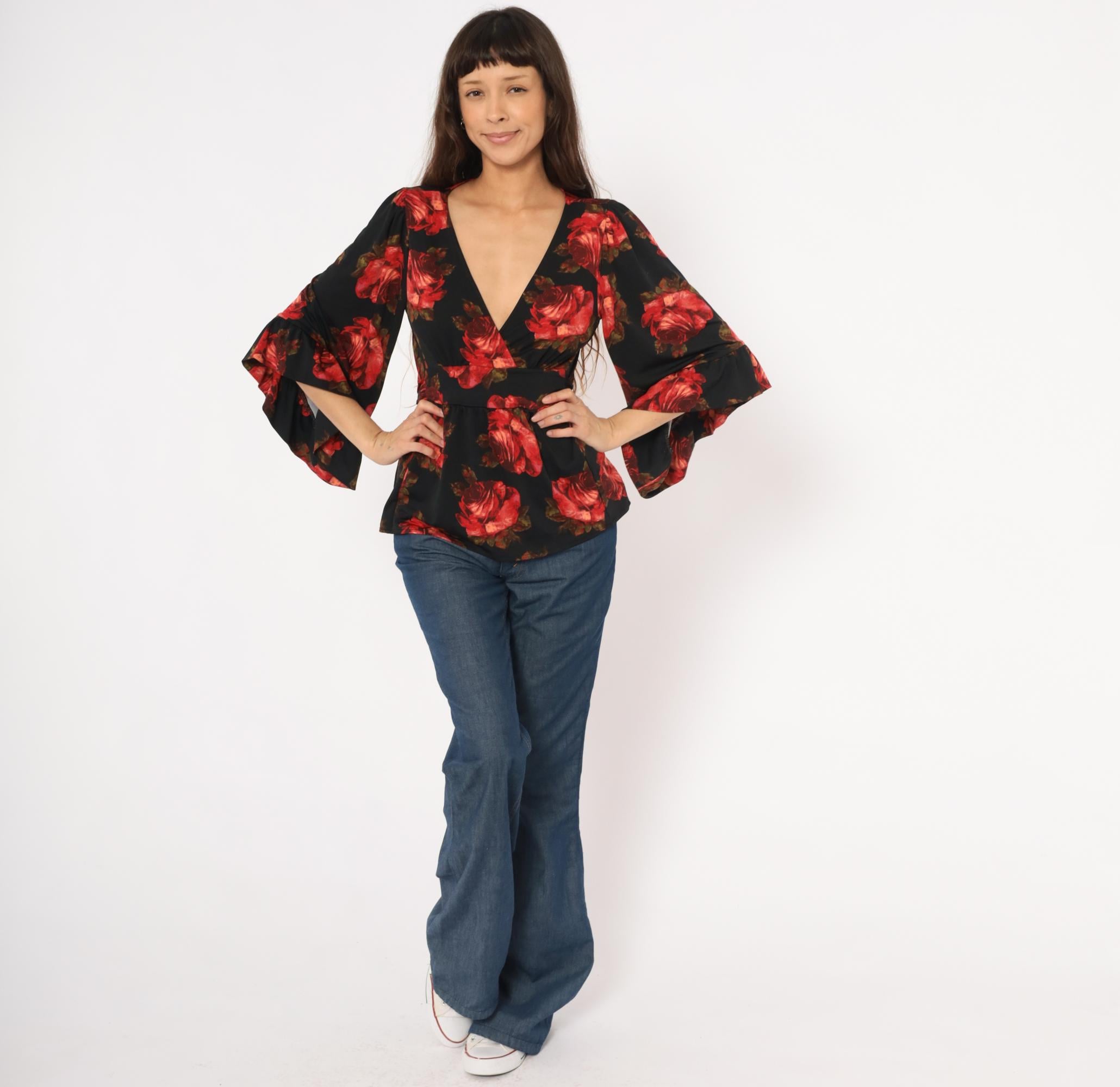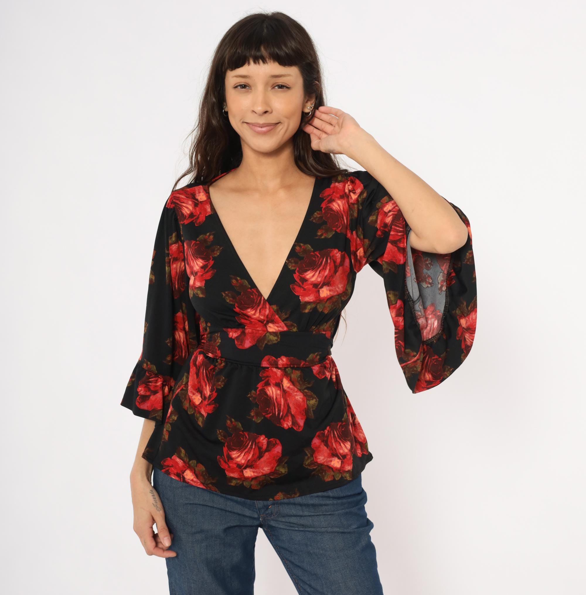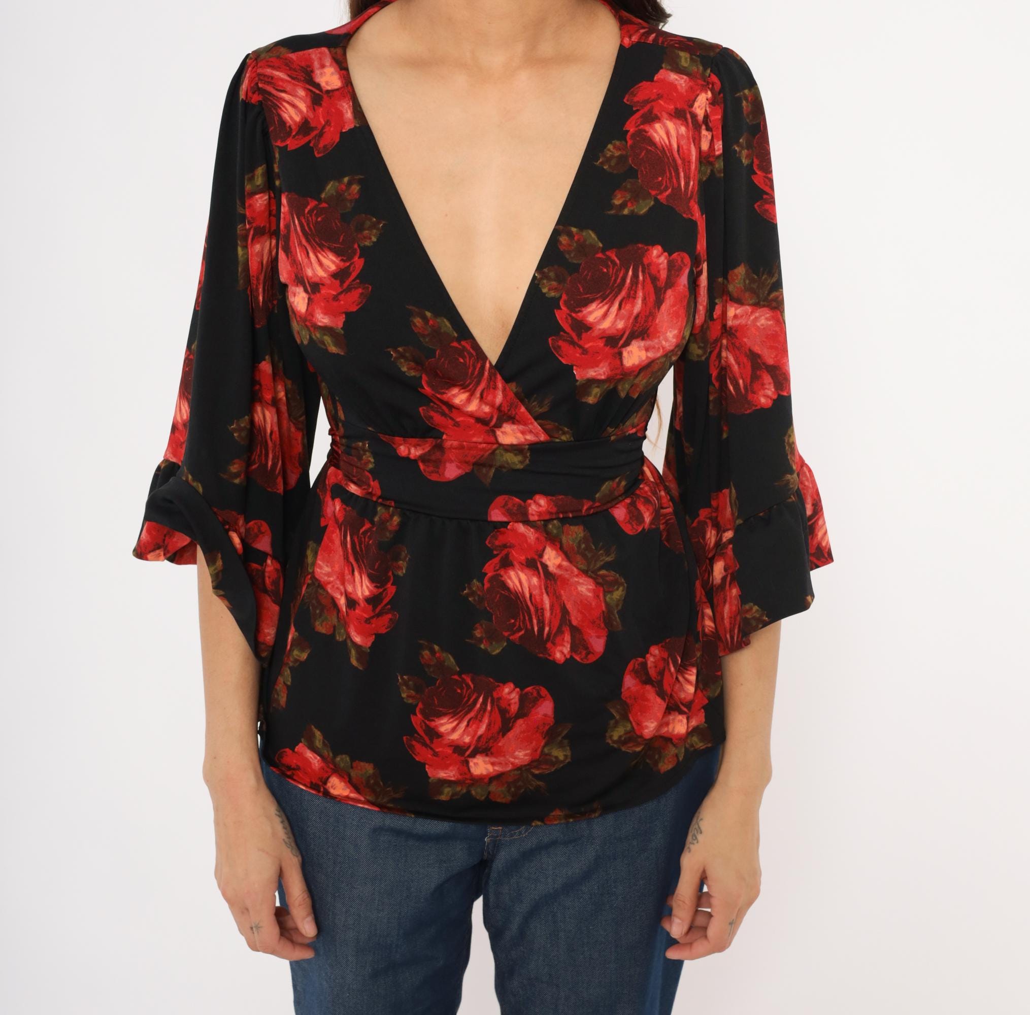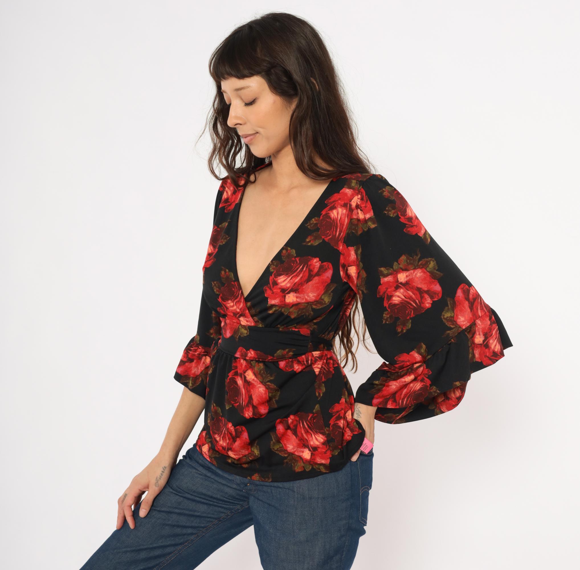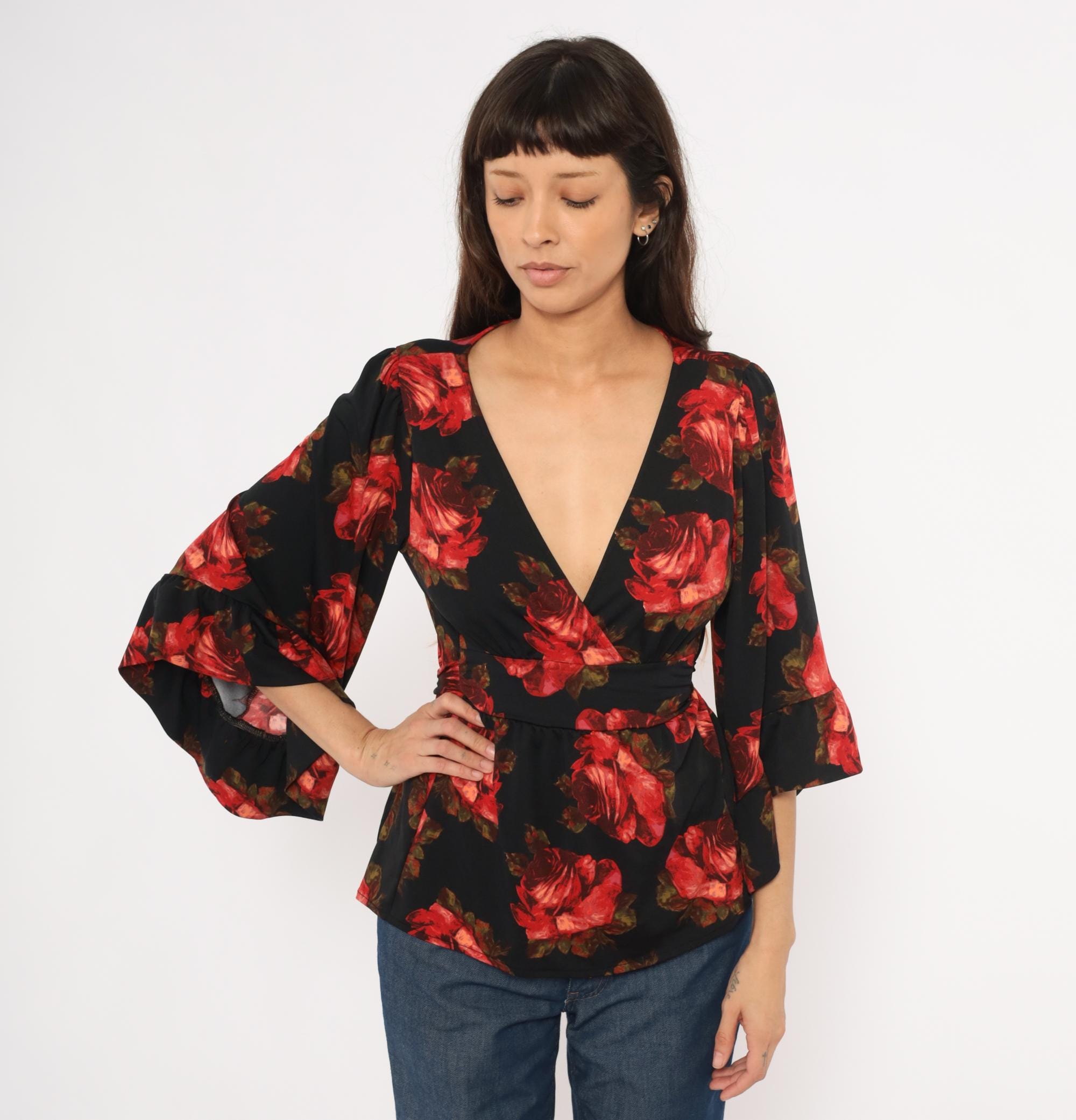 2000s Betsey Johnson wrap top in black with large red and crimson rose print throughout, accented by olive green leaves. Deep V neckline with surplice crossover bodice and cinched waist with long tie closure at the back. Three-quarter length bell sleeves with wide flared cuffs, and a peplum-style hem that sits at the hip.