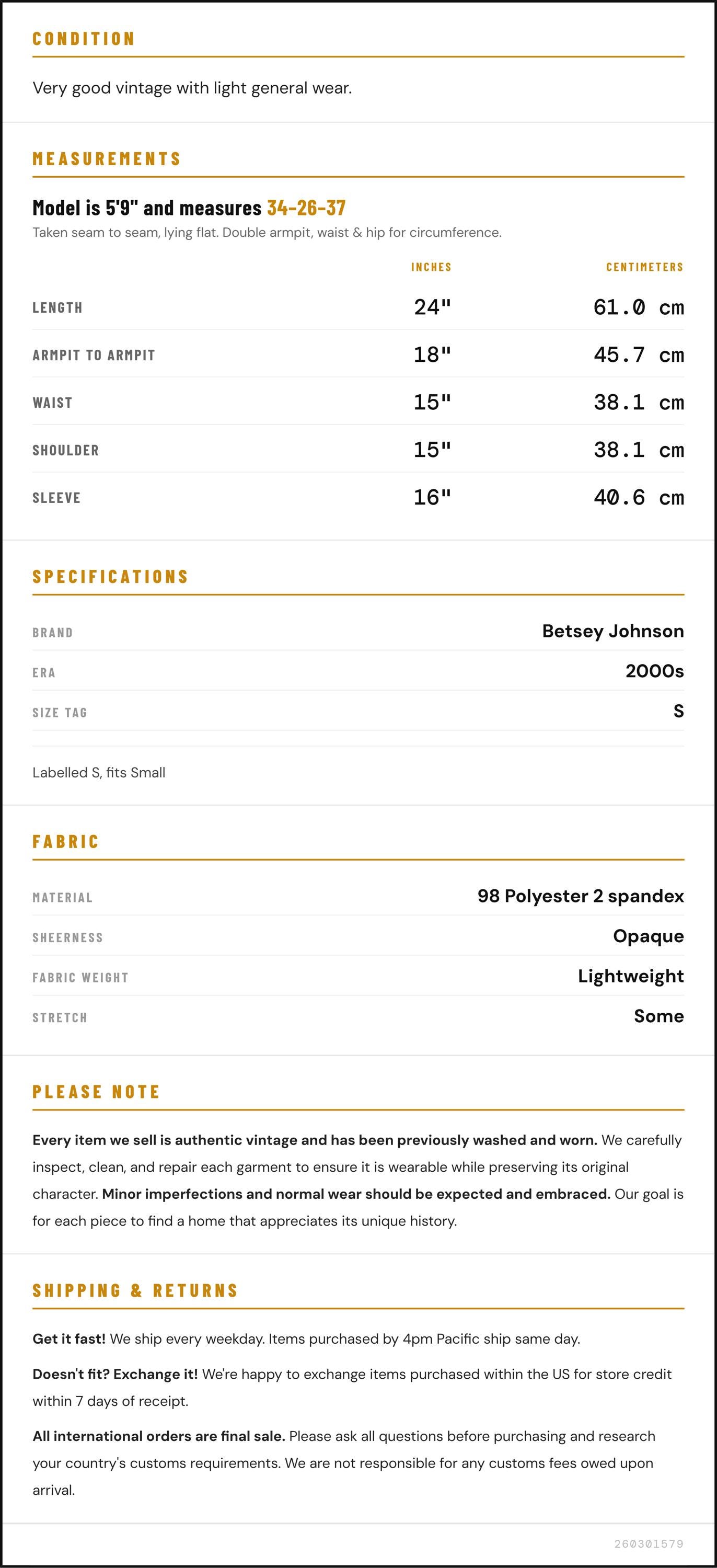 Measurements are taken laying flat and should be doubled where applicable. The "best fits" size is just an estimate, and vintage sizing can vary from modern sizing. Please use measurements to ensure proper fit. The best thing to do is measure a similar item of your own, and compare. When an item has stretch, we will list the unstretched dimensions with the stretched measurement afterwards.
