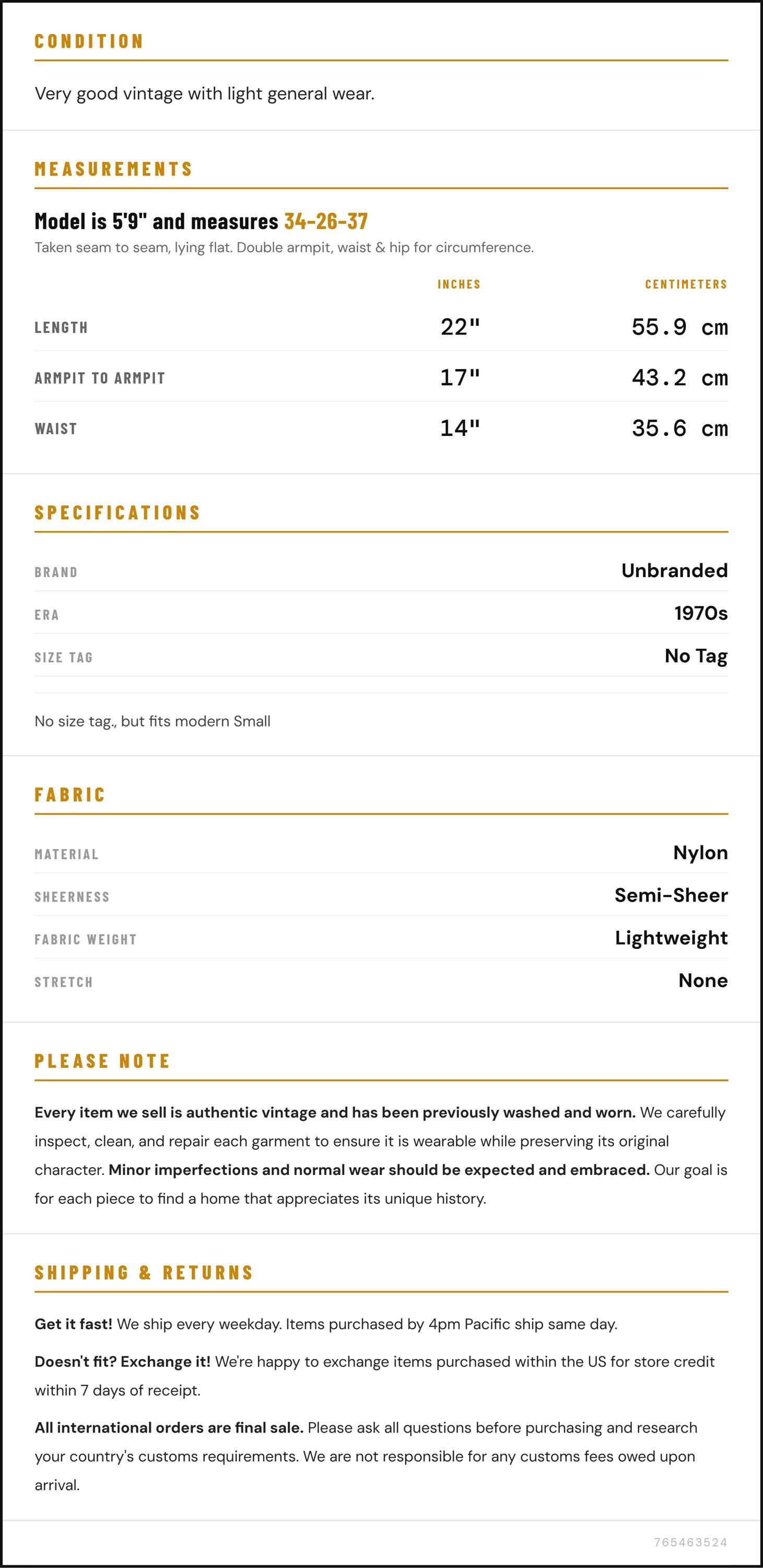 Measurements are taken laying flat and should be doubled where applicable. The "best fits" size is just an estimate, and vintage sizing can vary from modern sizing. Please use measurements to ensure proper fit. The best thing to do is measure a similar item of your own, and compare. When an item has stretch, we will list the unstretched dimensions with the stretched measurement afterwards.