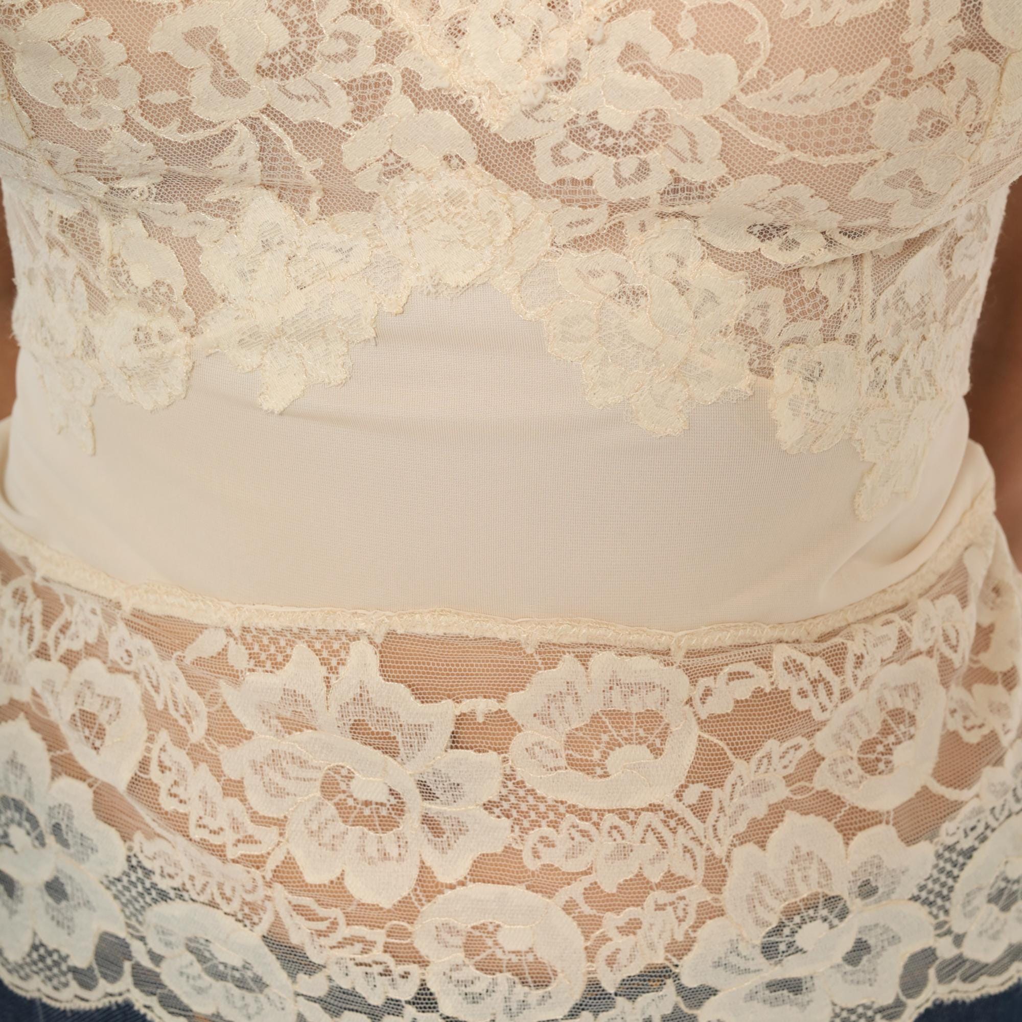 70s cream lace camisole with a sweetheart neckline and adjustable satin straps. Floral lace overlay across the bust and lower hem with a solid opaque panel at the midsection. Scalloped edges along the neckline and hemline, pullover closure, and semi-sheer construction throughout the back and hip section.
