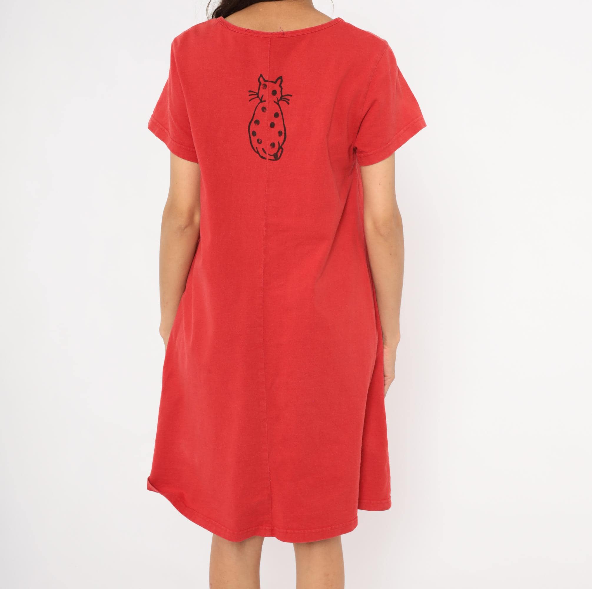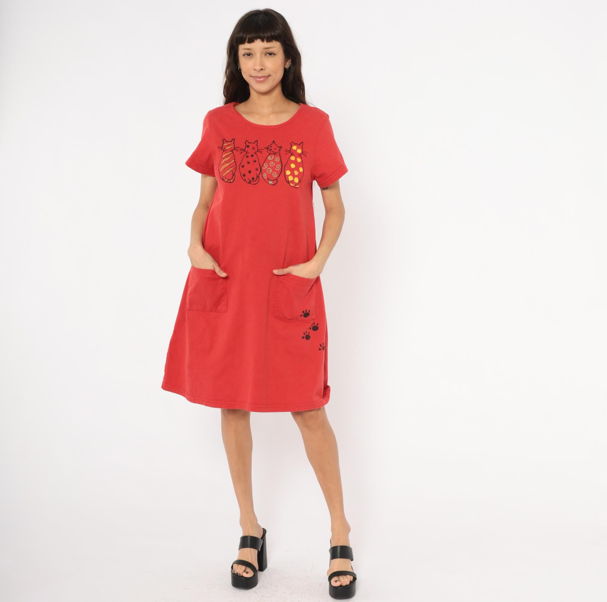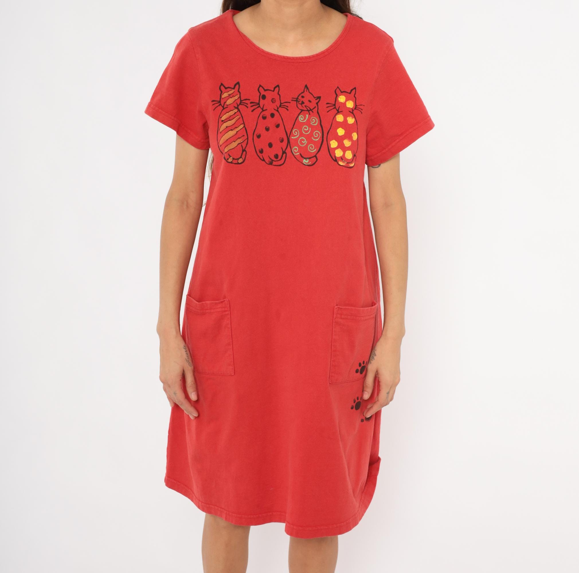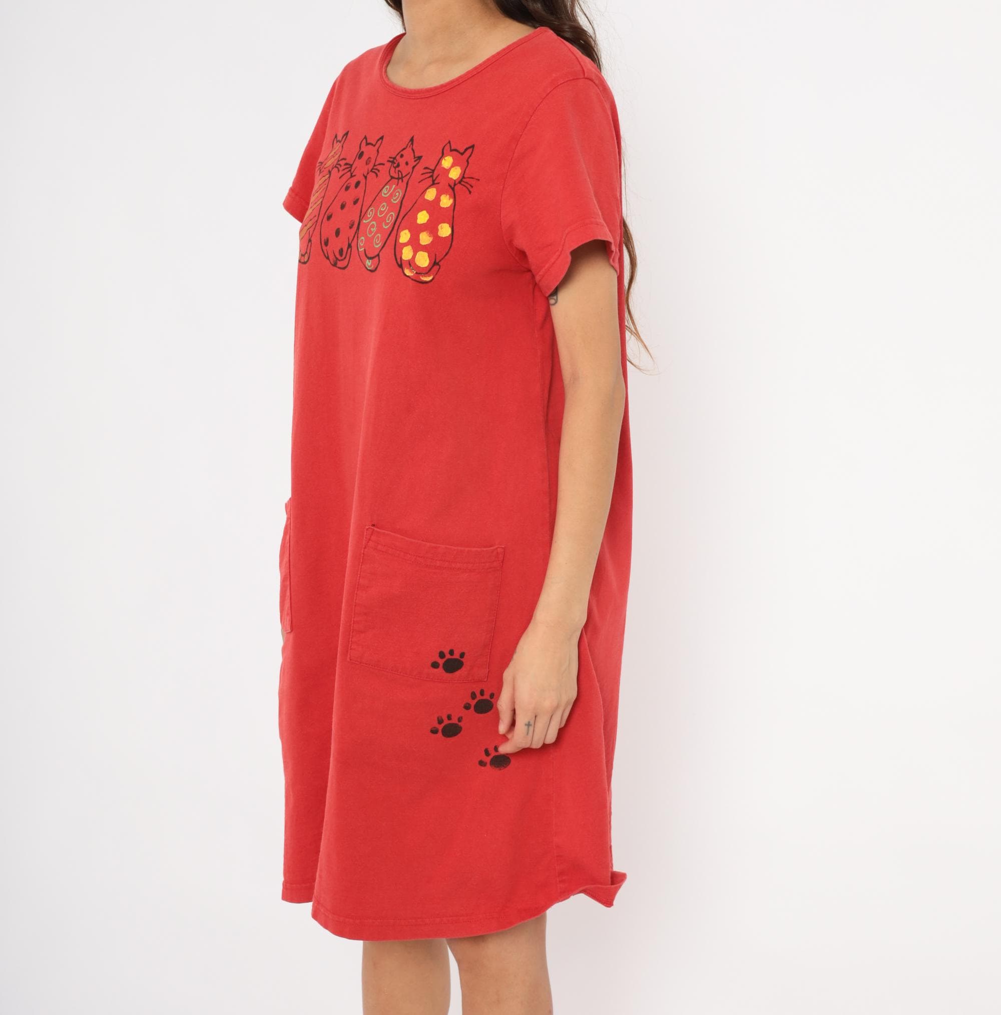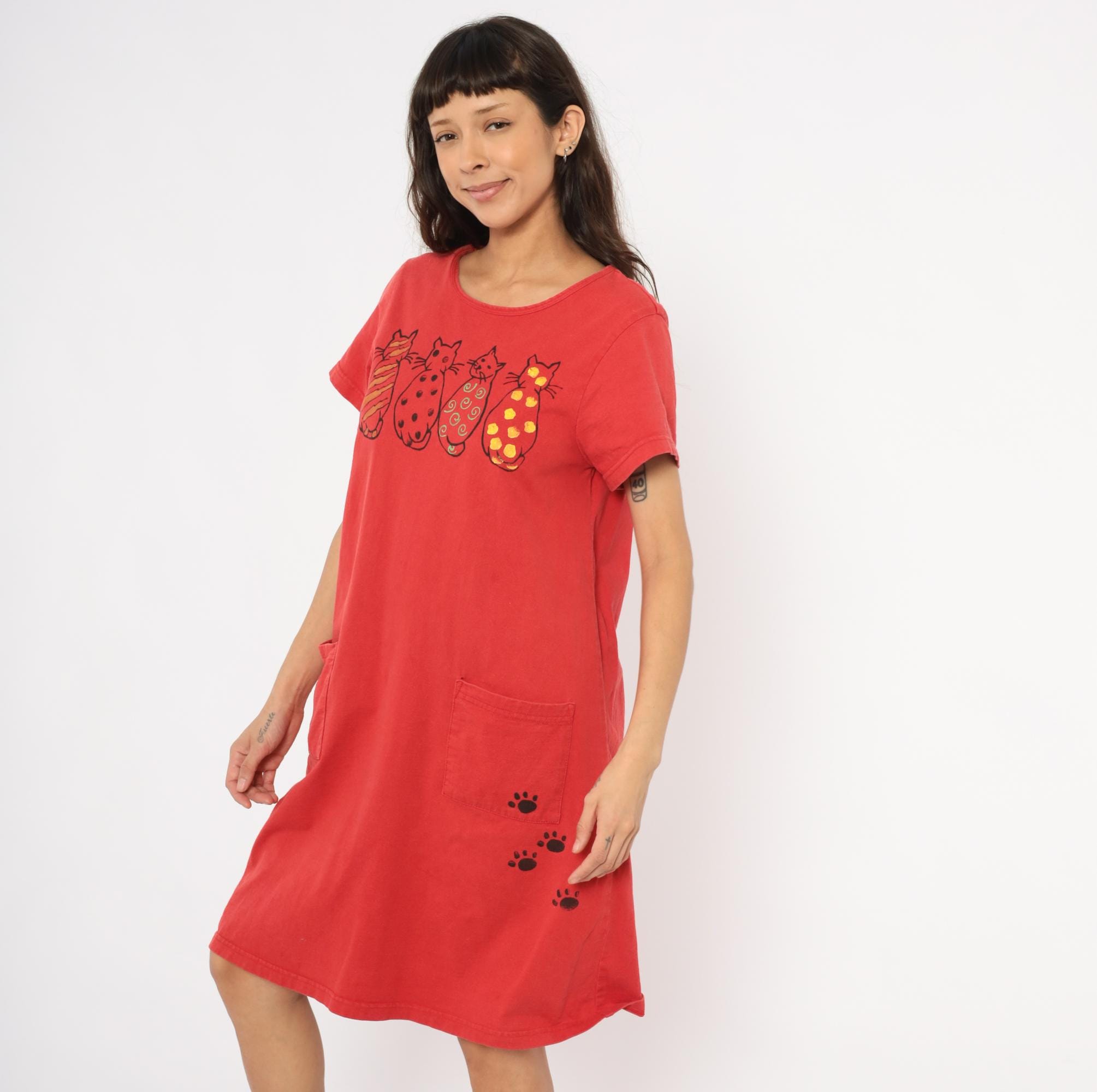 90s red cotton blend t-shirt dress with four hand-drawn style cats printed across the chest, each with a different pattern including stripes, polka dots, swirls, and spots in gold, green, and black. Relaxed A-line silhouette with scoop neckline, short sleeves, and two front patch pockets at the hip.