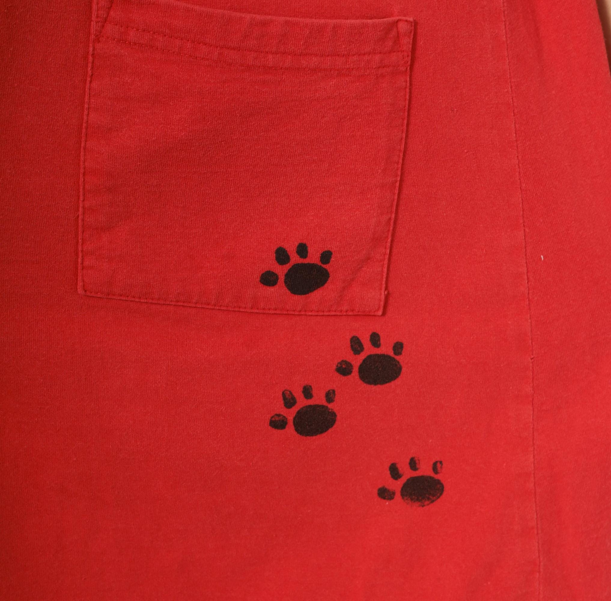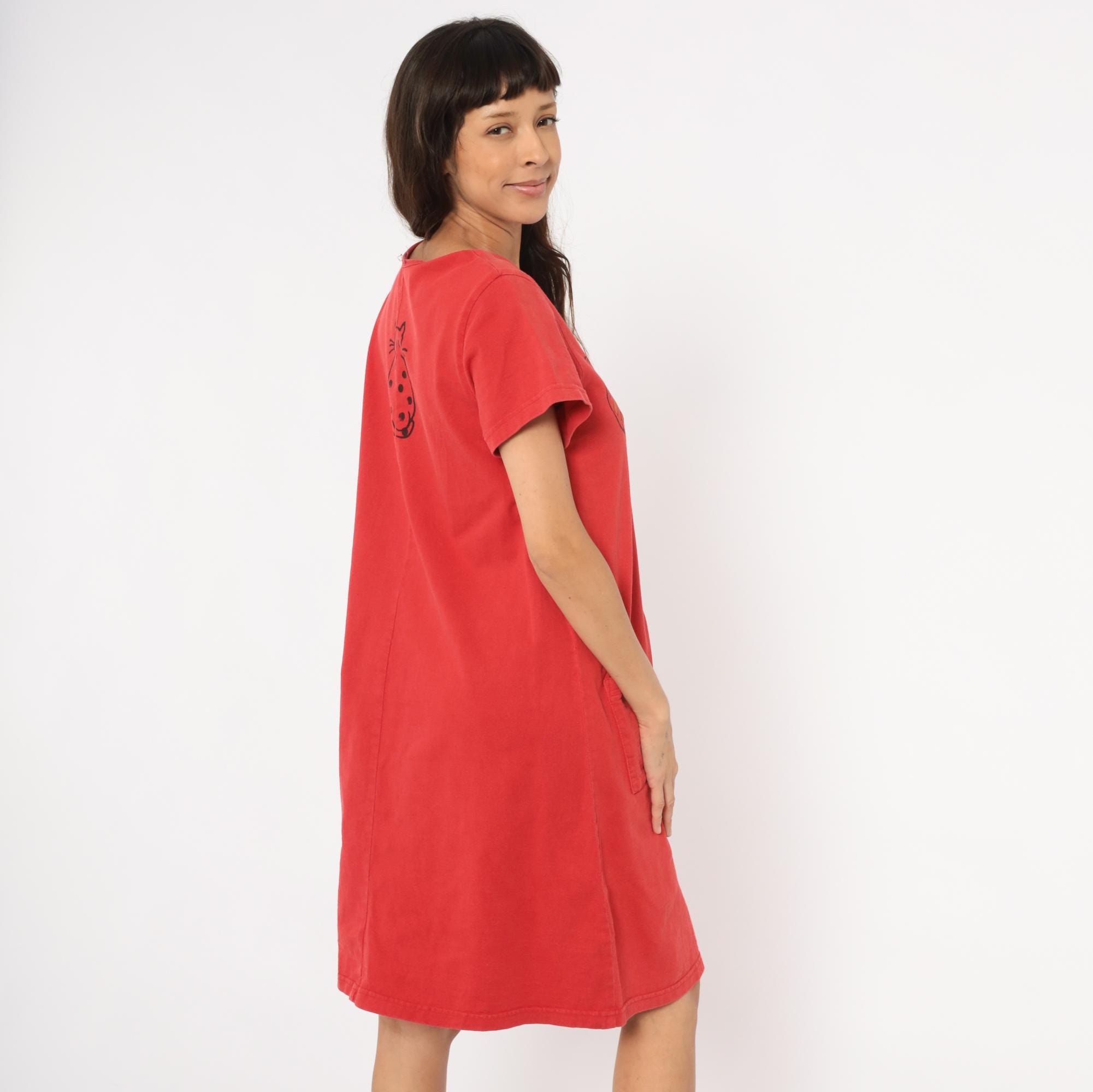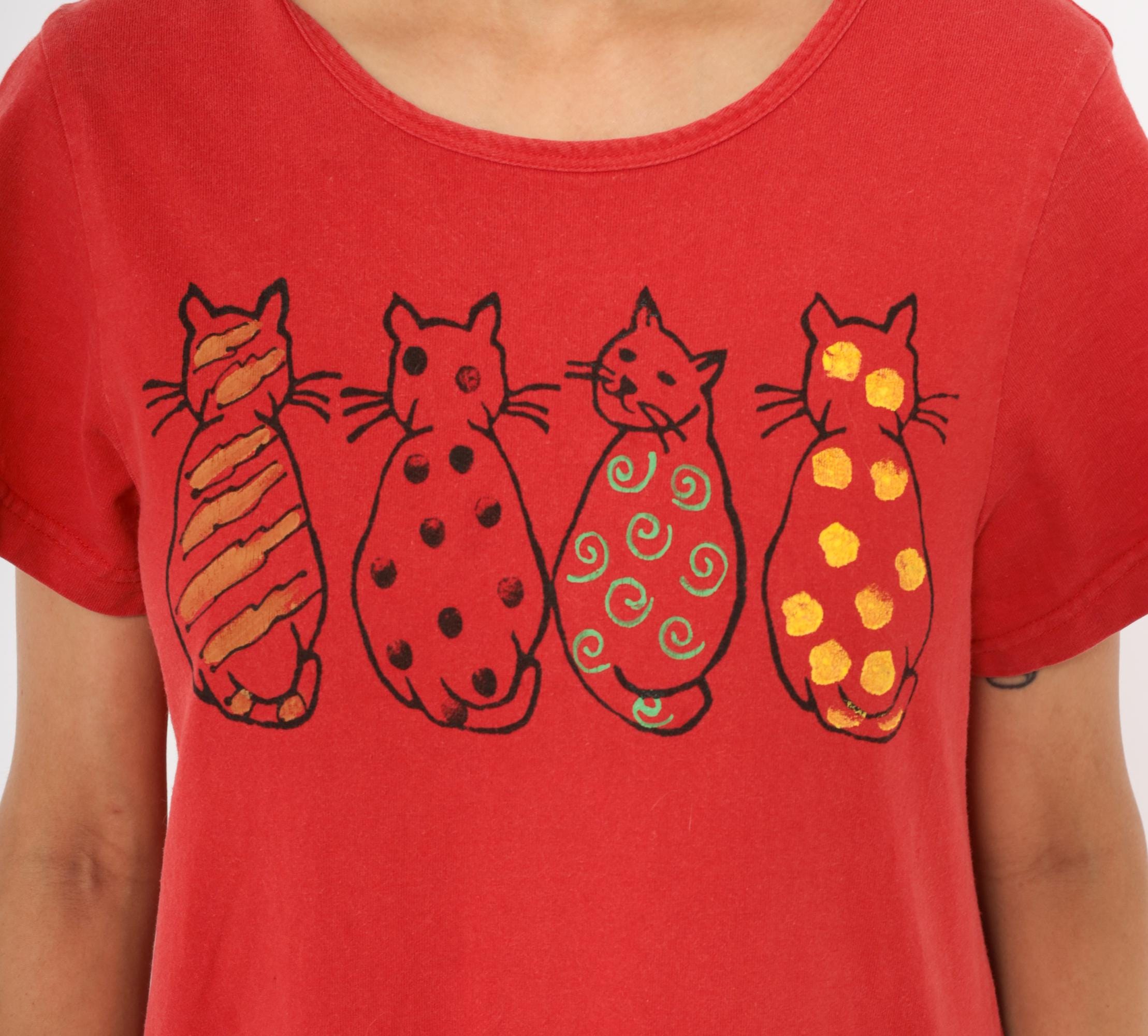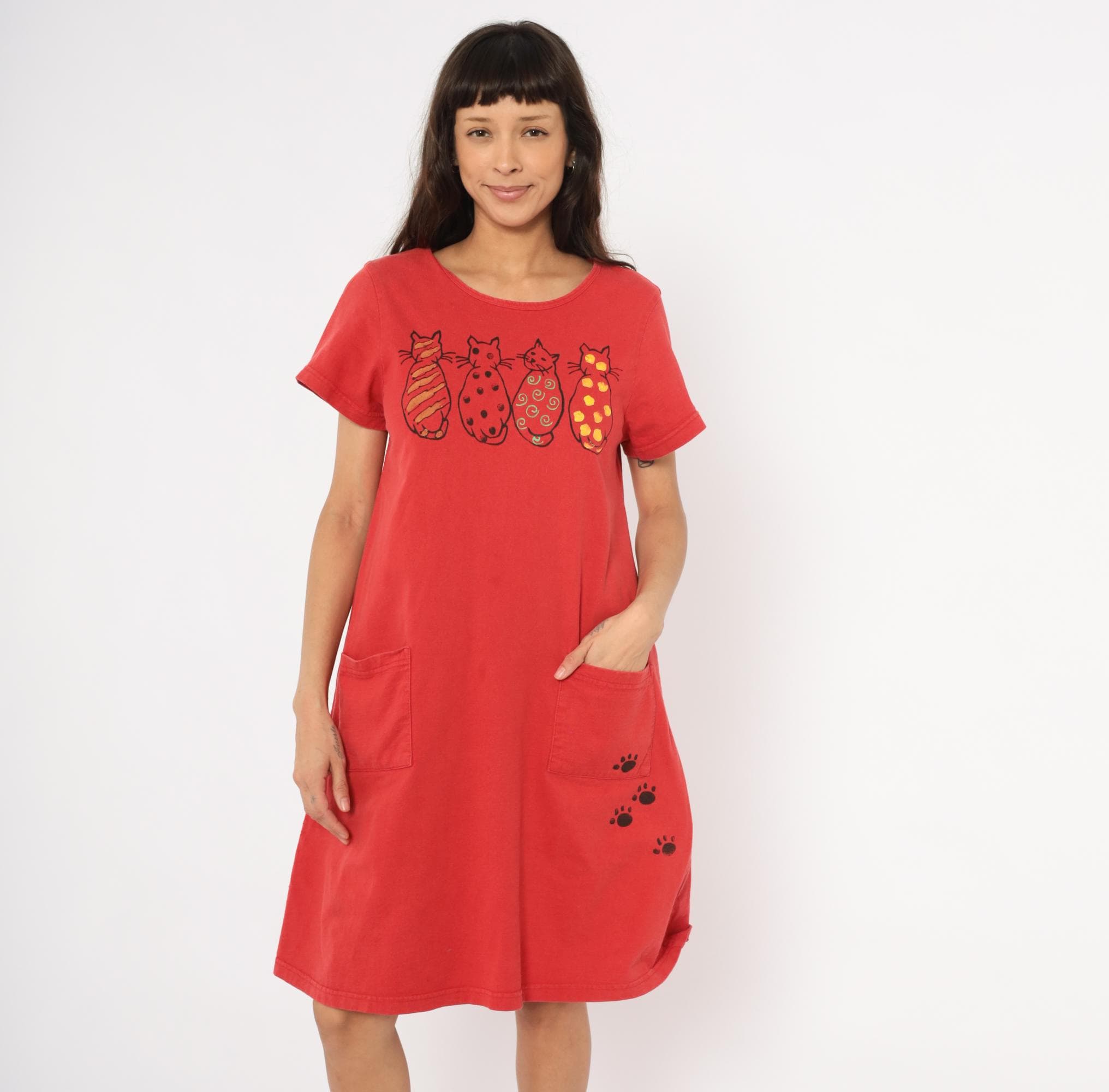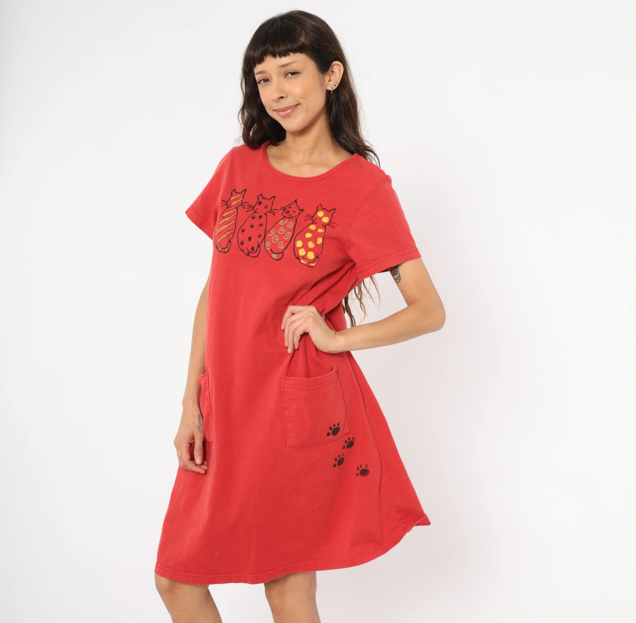 90s red cotton blend t-shirt dress with four hand-drawn style cats printed across the chest, each with a different pattern including stripes, polka dots, swirls, and spots in gold, green, and black. Relaxed A-line silhouette with scoop neckline, short sleeves, and two front patch pockets at the hip.